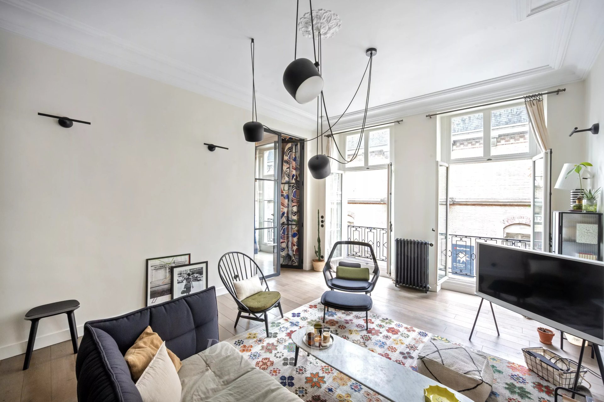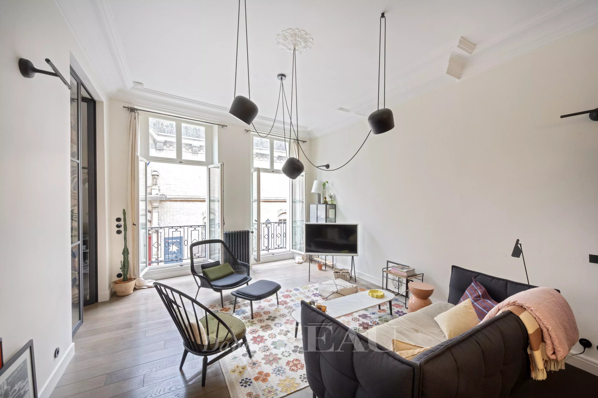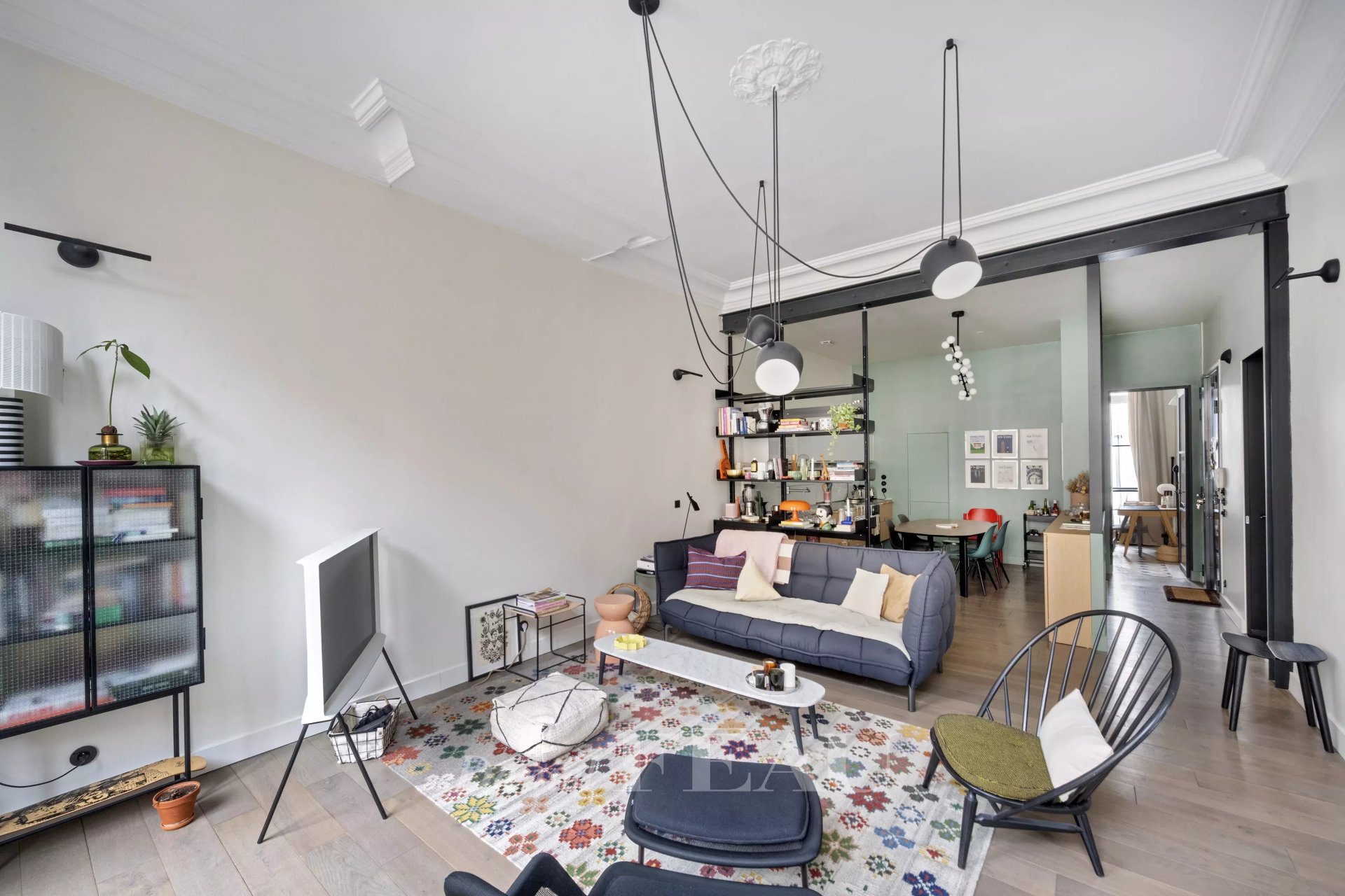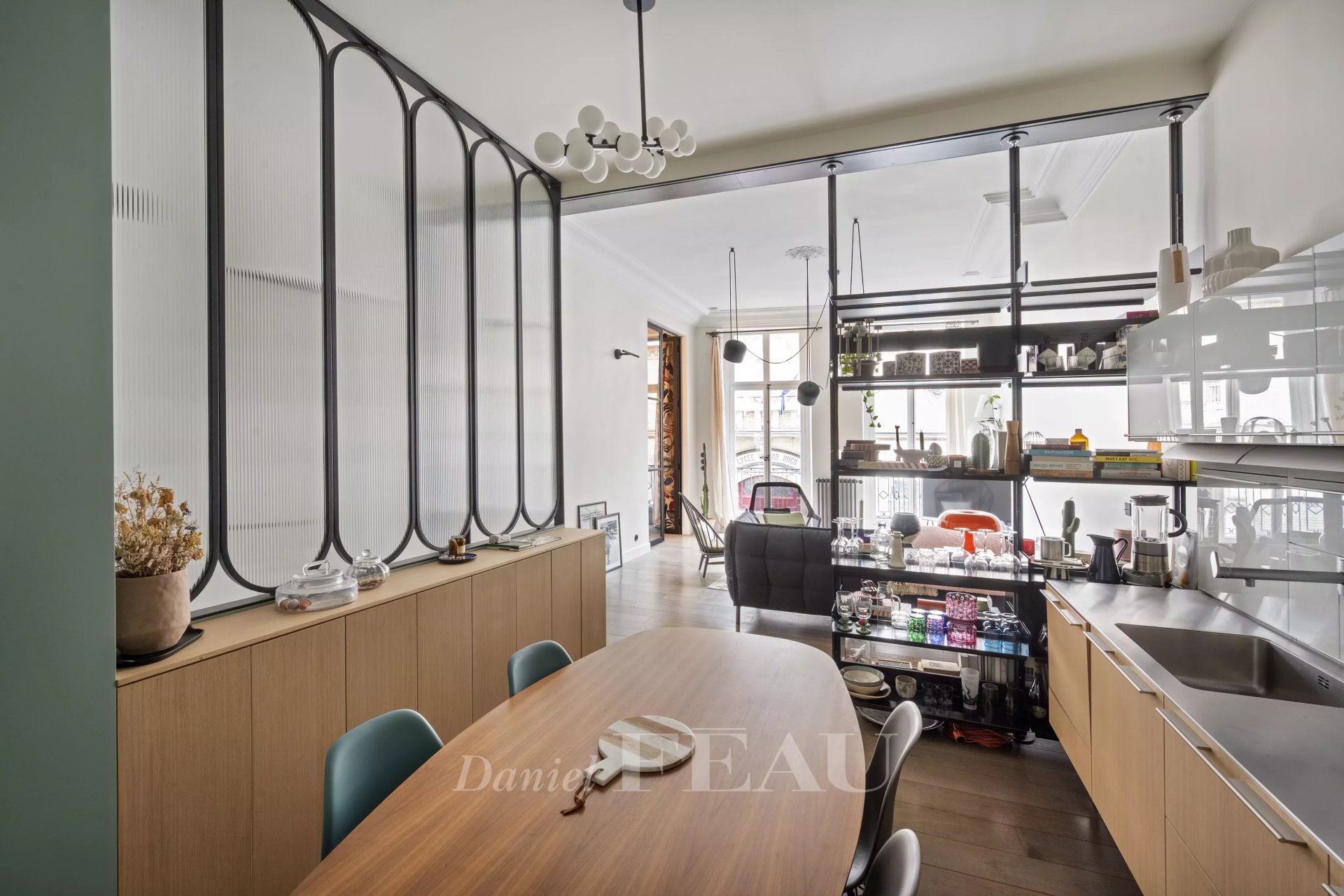 L'appartement bénéficie de 3,60 m de hauteur sous plafond : un séjour aux lignes claires, une cuisine ouverte prolongée d'un espace repas.