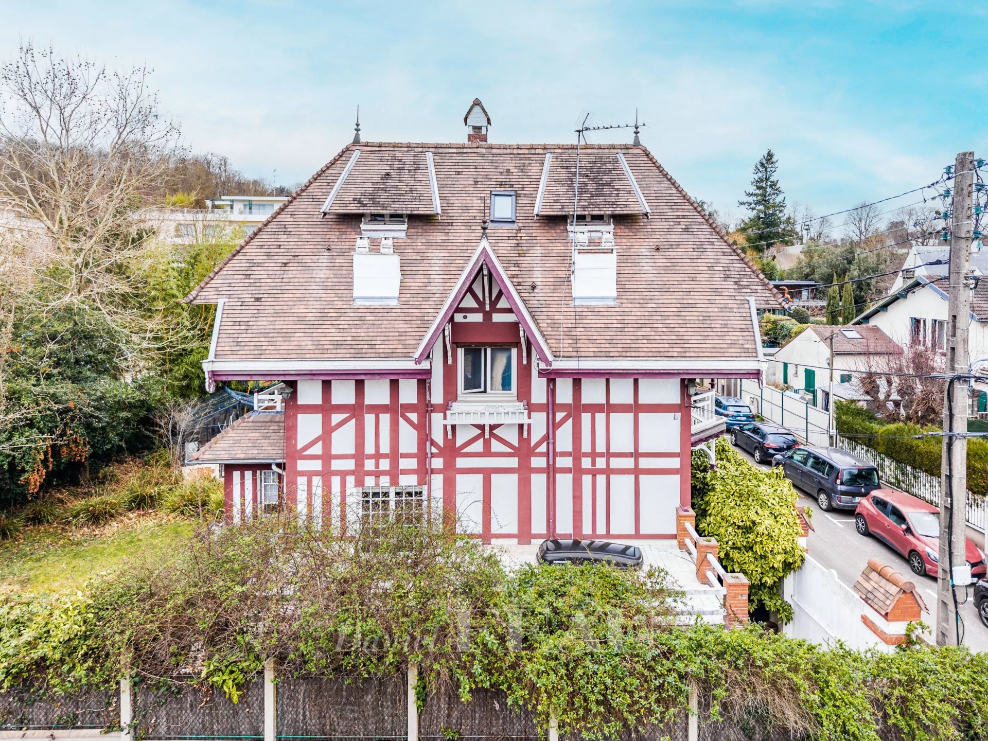 Just a stone's throw from Claude Monet School, in the heart of Bougival's residential and leafy neighborhood, you're sure to fall in love with this elegant, characterful half-timbered home dating from 1929, which combines old-world charm with modern comfort. Offering approximately 185m² of living space across four levels, it sits on a 445 m² lot featuring a well-maintained landscaped garden, nestled away from prying eyes in a lush green setting that ensures peace and privacy. On the ground floor, a bright double reception area opens onto a terrace, featuring a dining room, a living room with a fireplace, and a kitchen providing direct access to the garden—a fluid and spacious living area, ideal for entertaining. On the first floor, two beautiful bedrooms, one of which features a walk-in shower and a balcony, the other a private terrace. Separate restroom. In the attic, two additional bedrooms with built-in storage under the sloping ceiling and a powder room. In the basement, a fully finished level comprising an office, a bedroom with garden access, a shower room with a sauna, and a laundry/utility area.
