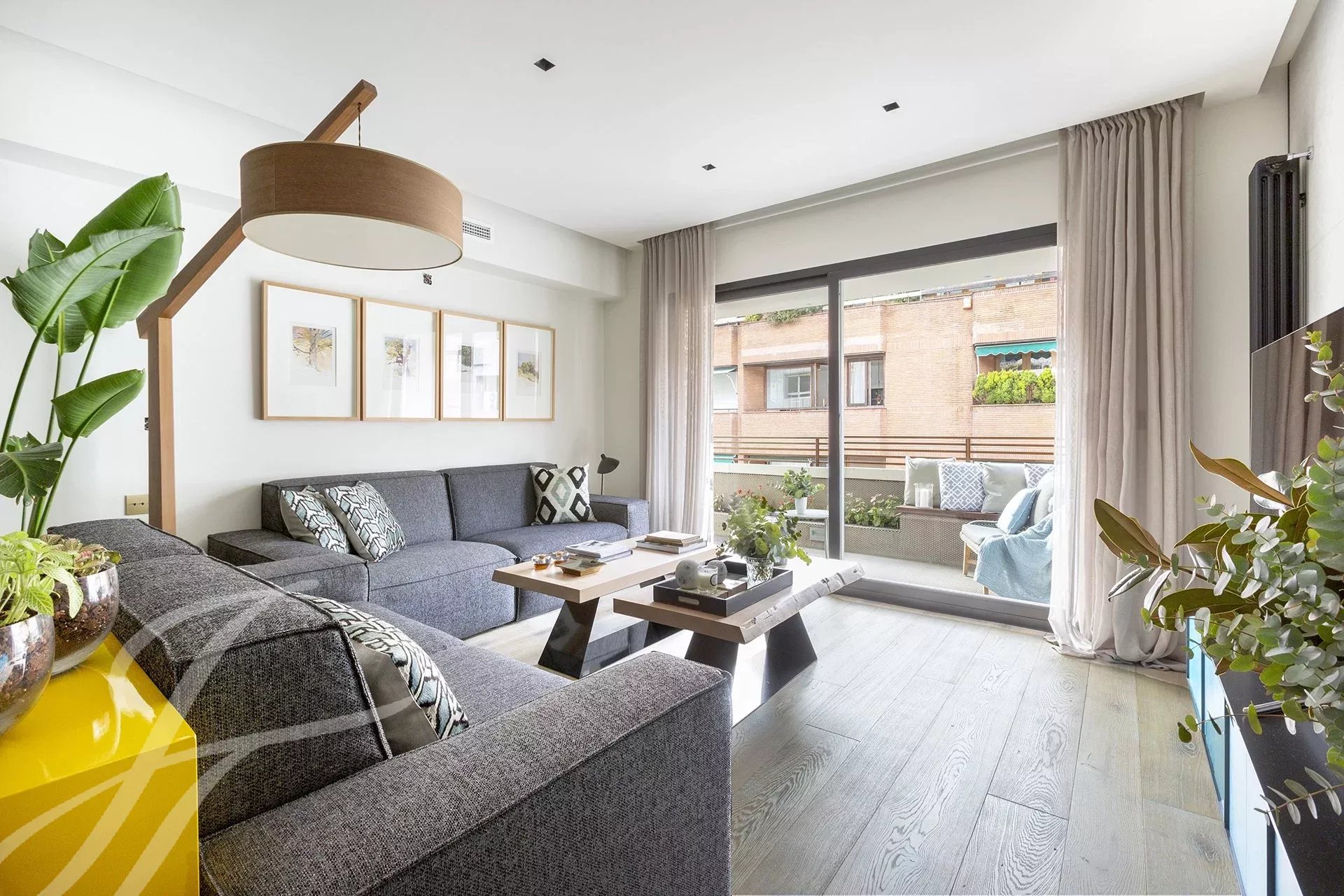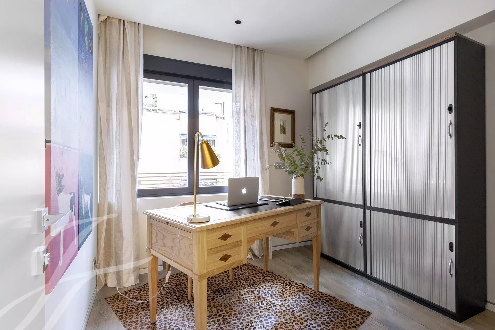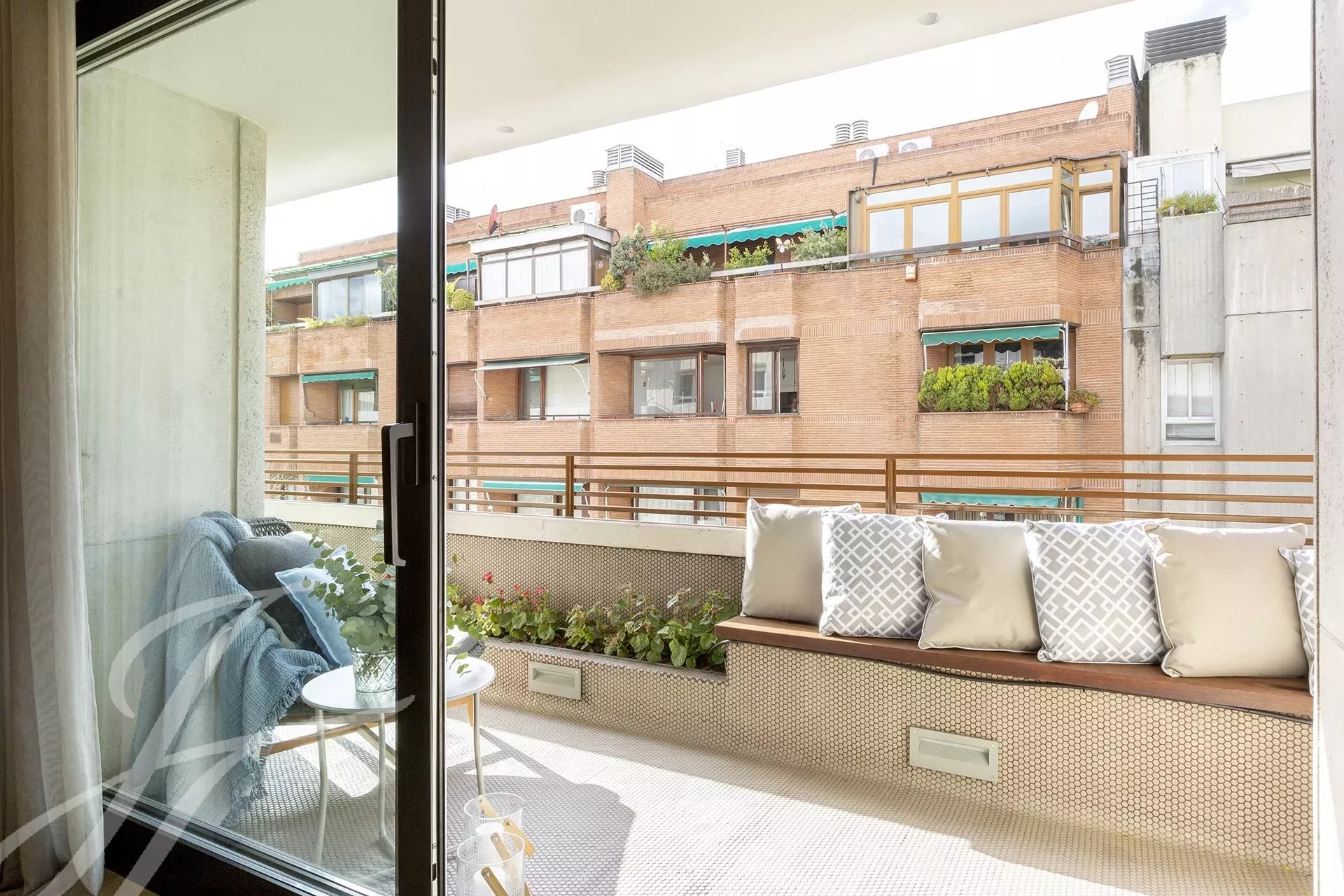 Beautiful apartment recently renovated with exquisite taste and modern style by the architecture studio Amodal where every detail has been taken care of with meticulous attention. It is necessary to emphasize the excellent project of illumination that, together with the noble materials and the well chosen furniture, provides a contemporary and cosy atmosphere.Located on a fifth floor, this property enjoys a magnificent natural light thanks to its large windows and its terrace overlooking the street.It has a large master bedroom with a street window, walk-in closet and a beautiful large bathroom with separate bathtub and shower. Another bedroom with two folding beds and a large study table. It also has a bedroom with built-in wardrobes and another one for guests that could be used as an office, playroom, etc.. These bedrooms share a beautifully designed bathroom.Next to the kitchen, fully equipped with high quality appliances, we find a maid bedroom with its own bathroom and independent entrance door.The large living/dining room can be separated by metal sliding doors and has access to the terrace facing west.The apartment has ducted air conditioning, radiator heating (with individual meters) and concierge service.Located in Monte Esquinza Street, in the heart of the Almagro neighbourhood, this is an exceptional flat for your family to enjoy the best location in Madrid with all the amenities.For rent FURNISHED