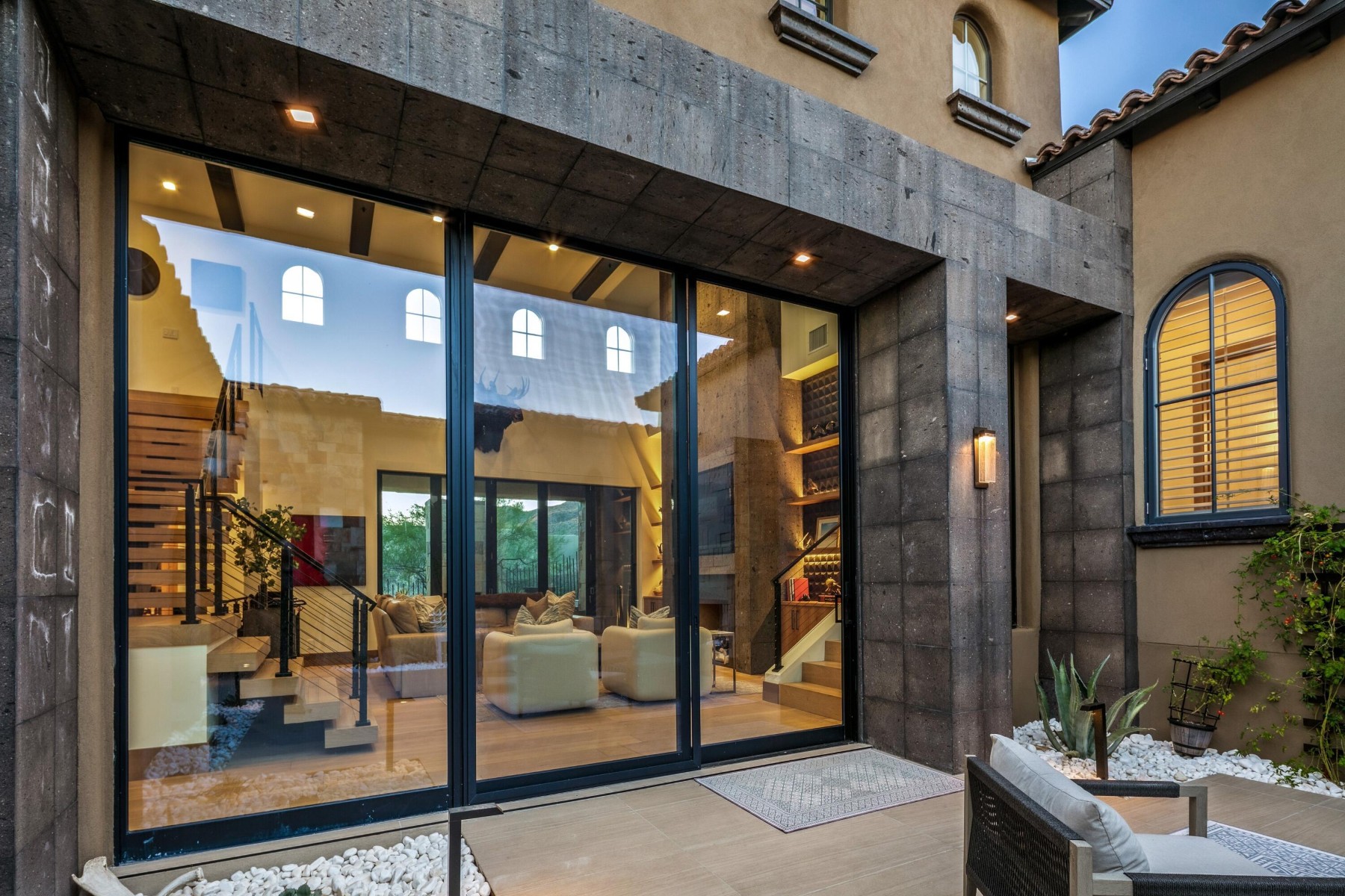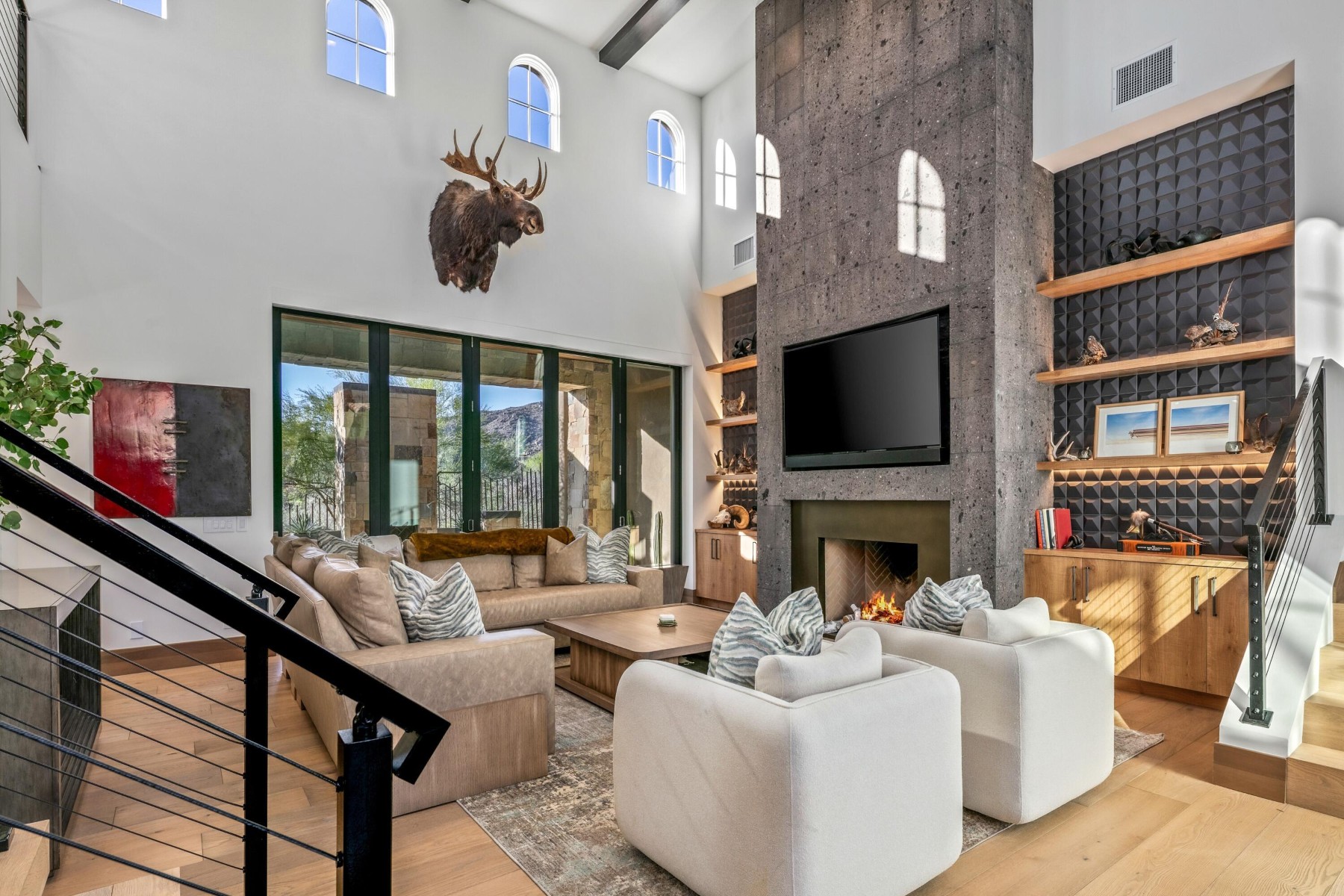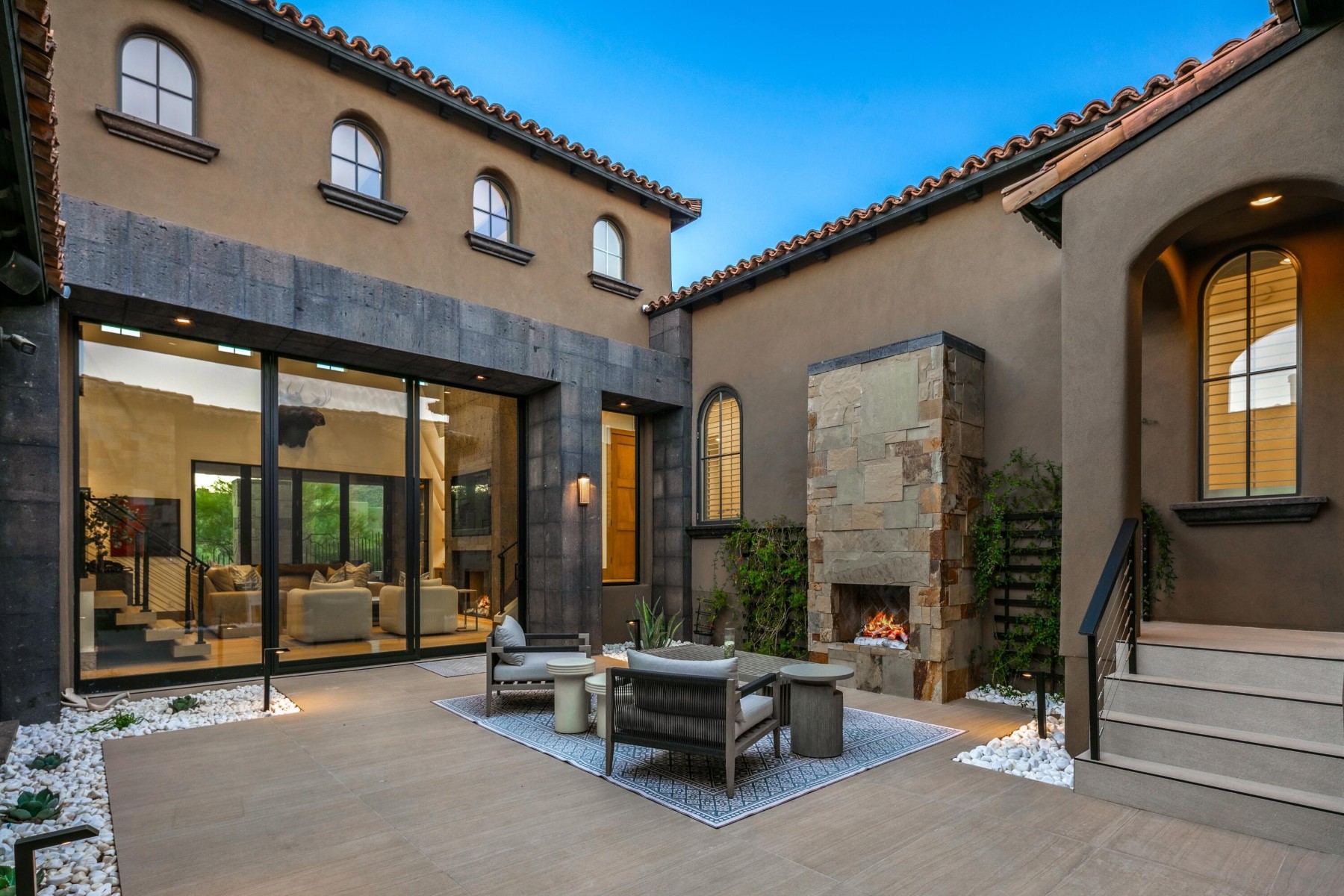 Golf Membership Available- Sophisticated yet casual WOW factor describes this perfectly positioned home along a premier hillside lot in the coveted Apache Peak village of Desert Mountain. This fully reimagined architectural showpiece captures jaw-dropping, unobstructed ''see forever'' views with exceptional privacy and cutting-edge design. A striking blend of stucco, stacked stone, and layered rooflines creates a bold first impression, while the inviting front courtyard--anchored by a statement fireplace--sets a warm, intimate tone. Inside, walls of glass frame panoramic vistas from every angle, flooding the home with natural light and creating a seamless indoor-outdoor connection. The great room impresses with soaring ceilings, clerestory windows, dramatic black beams, and a floor-to-ceiling Cantera stone fireplace. Designed for effortless entertaining, the home features a sophisticated dining space, full wet bar, temperature-controlled wine room, and a showpiece chef's kitchen centered around an oversized slab stone island. A sculptural floating staircase leads to an upper-level loft with game space and full bar lounge, wrapped in glass and capturing spectacular mountain silhouettes, and sparkling city lights. The adjacent view outside deck with firepit offers a front-row seat to Arizona's most breathtaking sunsets. The primary suite is a serene retreat with its own fireplace, spa-inspired bath with steam shower and soaking tub, and a versatile bonus space ideal for a fitness studio or private lounge. Four beautifully appointed guest ensuites provide elevated comfort and privacy. Throughout the home, 10" wide-plank wood flooring, statement stonework, custom cabinetry, and curated designer finishes create a refined yet modern aesthetic. Outdoors, a true resort setting awaits--complete with a beach-entry pool, elevated spa, outdoor kitchen, fireplace, and multiple gathering spaces designed for unforgettable entertaining. Three-car garage spaces complete the offering. Ideally located minutes from the back gate for quick access to Scottsdale and Sky Harbor, this residence also unlocks Desert Mountain's world-class lifestyle, with golf, dining, fitness, and miles of scenic trails bordering the Tonto National Forest. A rare and compelling opportunity where bold architecture, elevated design, and sweeping desert beauty come together--this is desert living at its absolute finest.