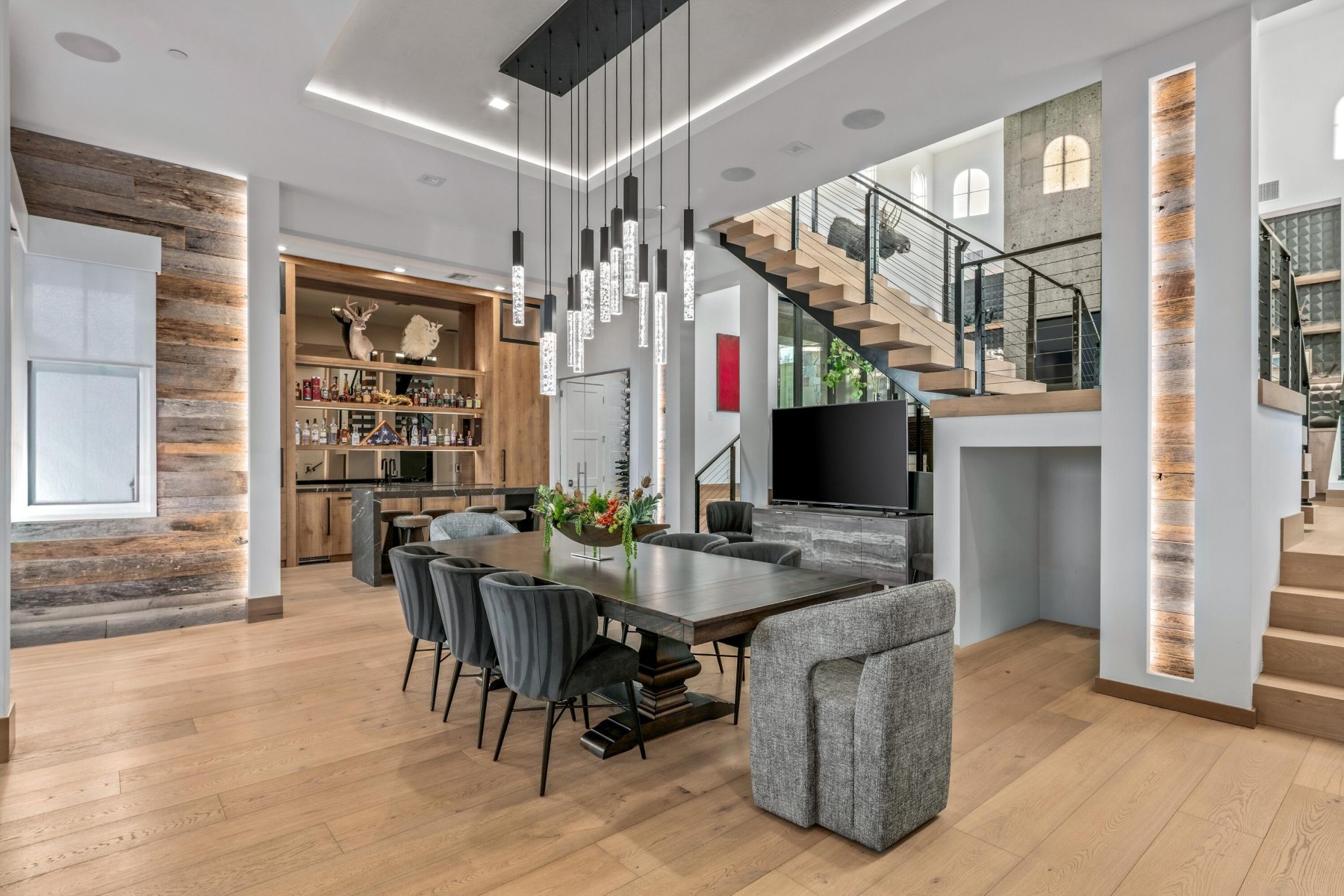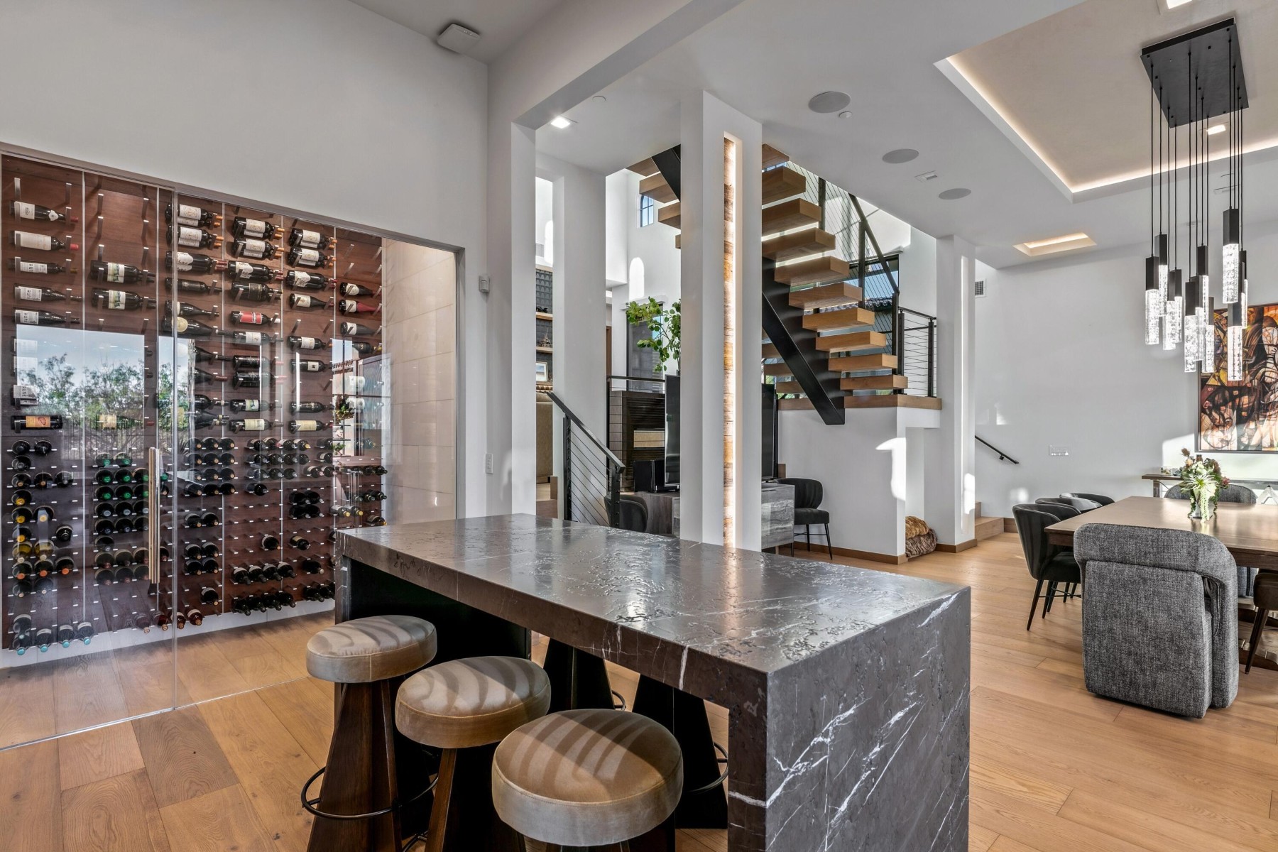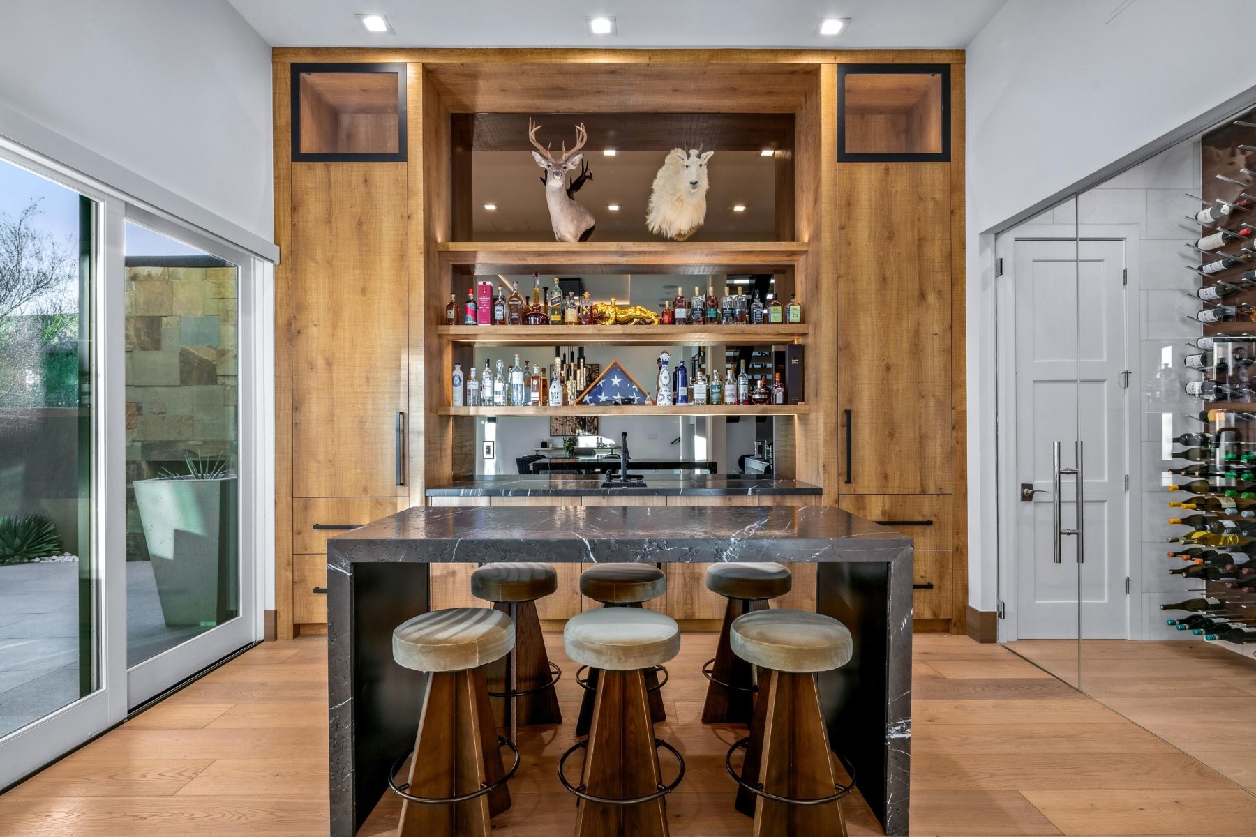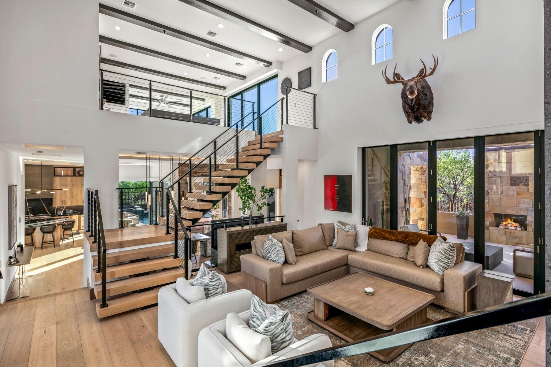 Golf Membership Available- Sophisticated yet casual WOW factor describes this perfectly positioned home along a premier hillside lot in the coveted Apache Peak village of Desert Mountain. This fully reimagined architectural showpiece captures jaw-dropping, unobstructed ''see forever'' views with exceptional privacy and cutting-edge design. A striking blend of stucco, stacked stone, and layered rooflines creates a bold first impression, while the inviting front courtyard--anchored by a statement fireplace--sets a warm, intimate tone. Inside, walls of glass frame panoramic vistas from every angle, flooding the home with natural light and creating a seamless indoor-outdoor connection. The great room impresses with soaring ceilings, clerestory windows, dramatic black beams, and a floor-to-ceiling Cantera stone fireplace. Designed for effortless entertaining, the home features a sophisticated dining space, full wet bar, temperature-controlled wine room, and a showpiece chef's kitchen centered around an oversized slab stone island. A sculptural floating staircase leads to an upper-level loft with game space and full bar lounge, wrapped in glass and capturing spectacular mountain silhouettes, and sparkling city lights. The adjacent view outside deck with firepit offers a front-row seat to Arizona's most breathtaking sunsets. The primary suite is a serene retreat with its own fireplace, spa-inspired bath with steam shower and soaking tub, and a versatile bonus space ideal for a fitness studio or private lounge. Four beautifully appointed guest ensuites provide elevated comfort and privacy. Throughout the home, 10" wide-plank wood flooring, statement stonework, custom cabinetry, and curated designer finishes create a refined yet modern aesthetic. Outdoors, a true resort setting awaits--complete with a beach-entry pool, elevated spa, outdoor kitchen, fireplace, and multiple gathering spaces designed for unforgettable entertaining. Three-car garage spaces complete the offering. Ideally located minutes from the back gate for quick access to Scottsdale and Sky Harbor, this residence also unlocks Desert Mountain's world-class lifestyle, with golf, dining, fitness, and miles of scenic trails bordering the Tonto National Forest. A rare and compelling opportunity where bold architecture, elevated design, and sweeping desert beauty come together--this is desert living at its absolute finest.