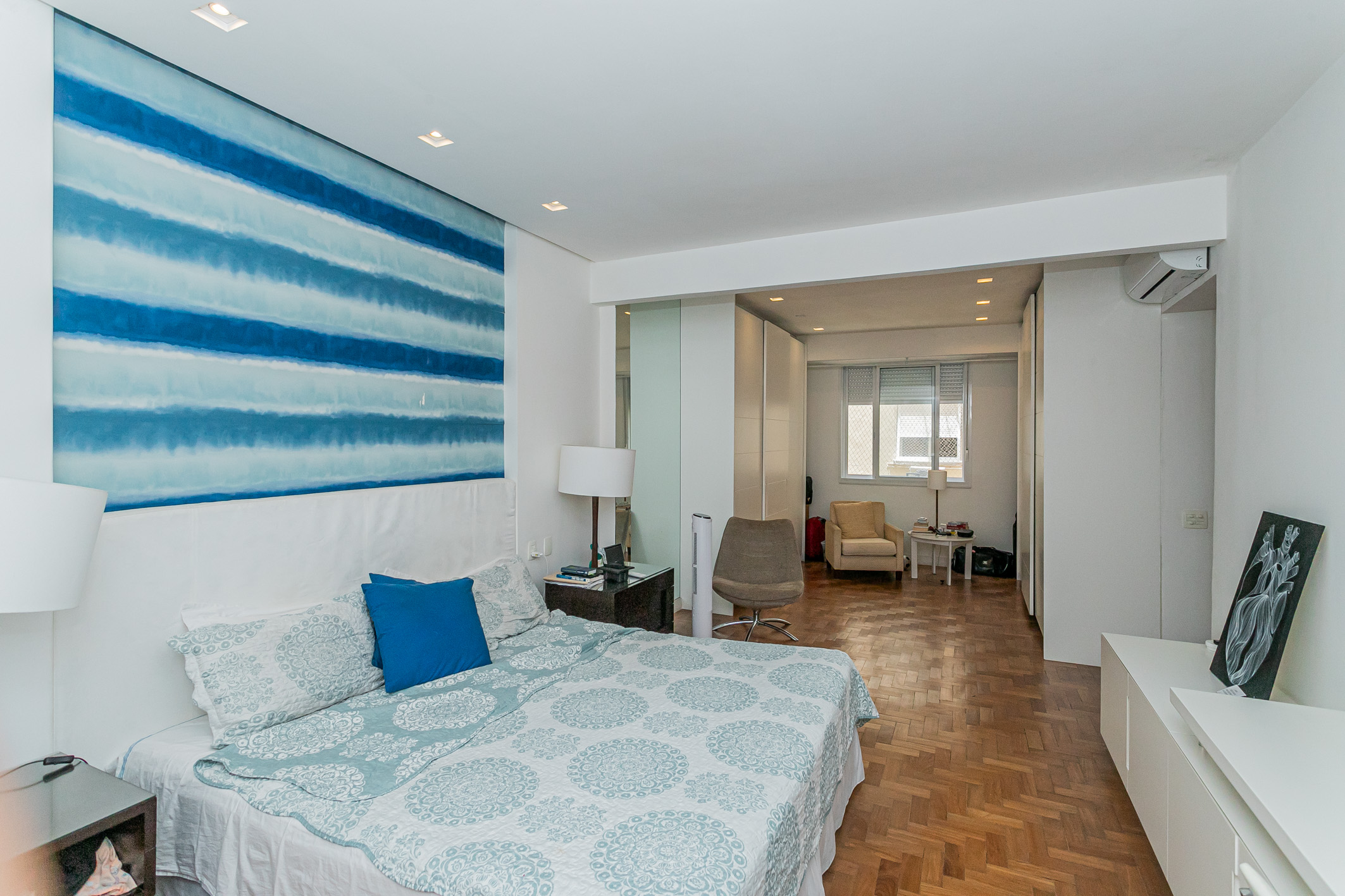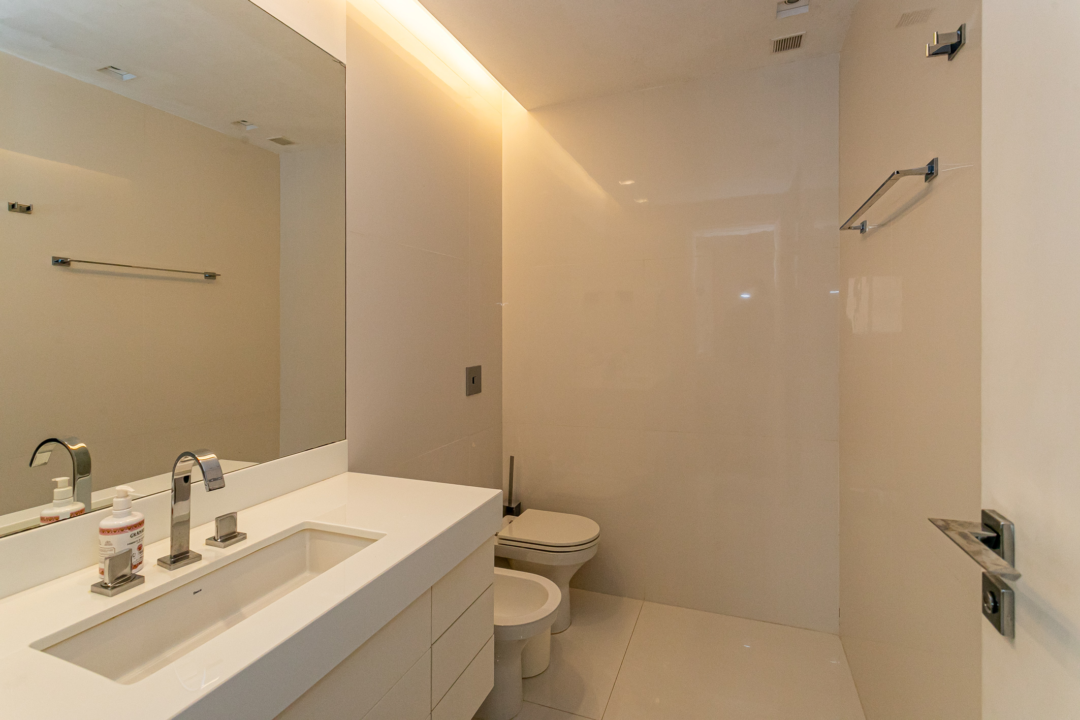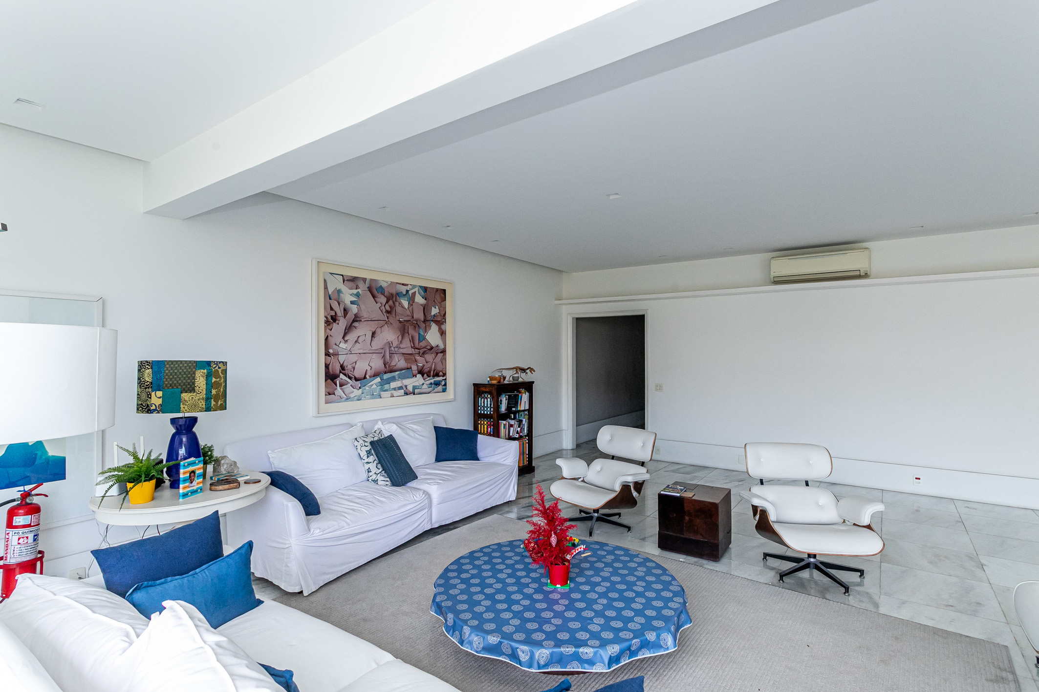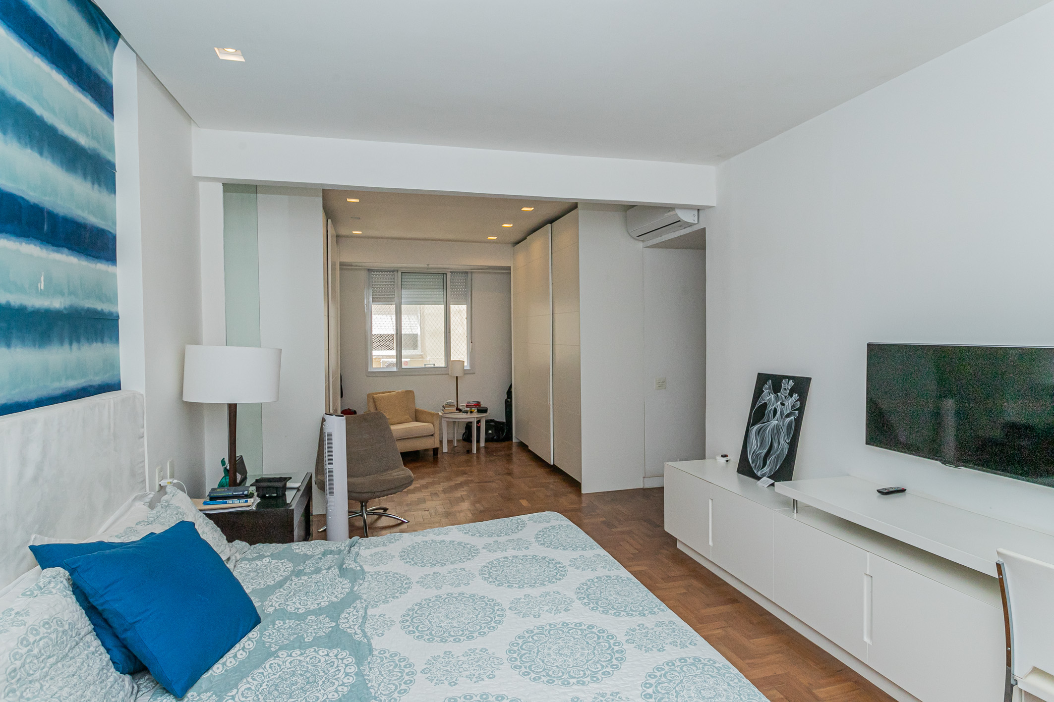 This renovated apartment offers approximately 3,111 sq. ft of well-distributed interiors and a lateral view of the ocean, ideally located near the Fasano Hotel. The living area is generous, arranged into three distinct environments and complemented by a powder room. The private quarters include four bedrooms, three of which are suites, in addition to a full bathroom. Marble flooring defines the social areas, while wood flooring extends through the private quarters. The kitchen includes a breakfast area and connects to the service area, which also features a service bathroom. All rooms are equipped with split air conditioning, including the kitchen. The property includes one deeded parking space, and the building offers 24-hour concierge service.