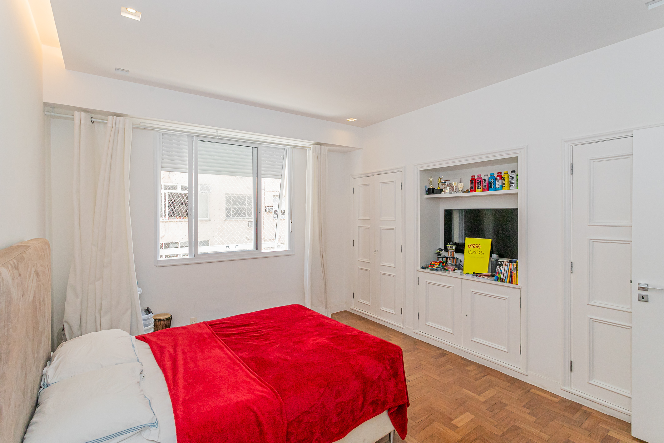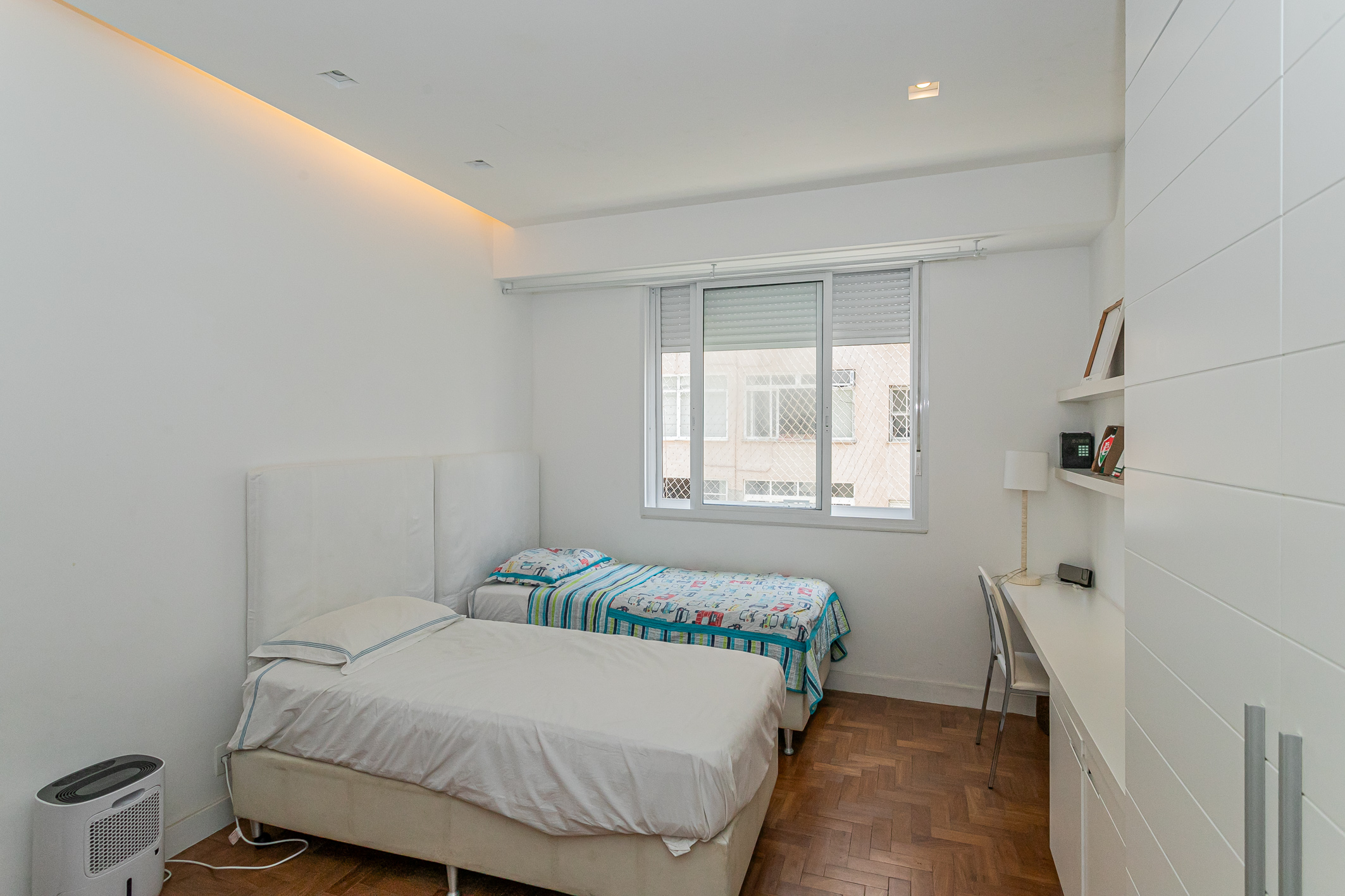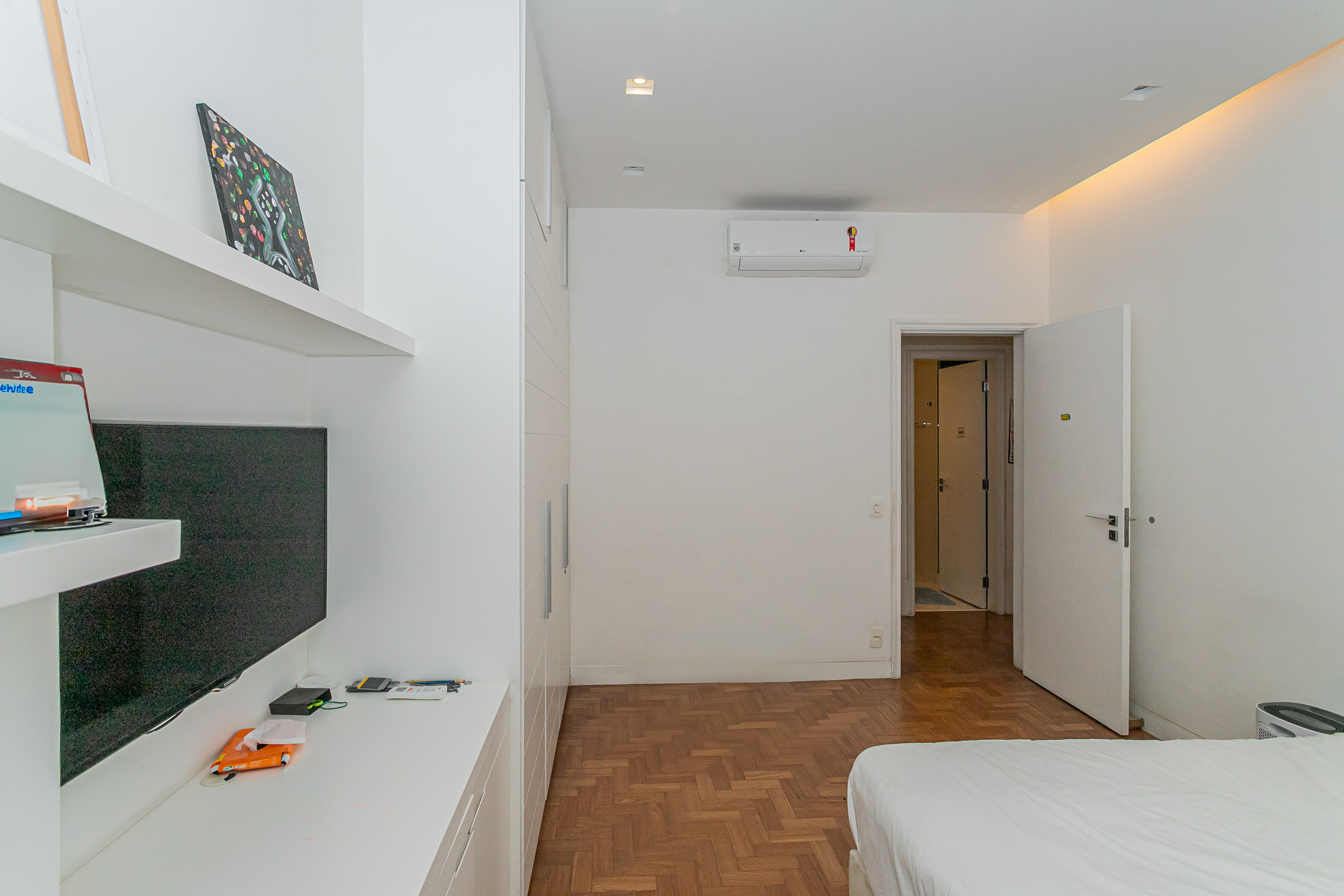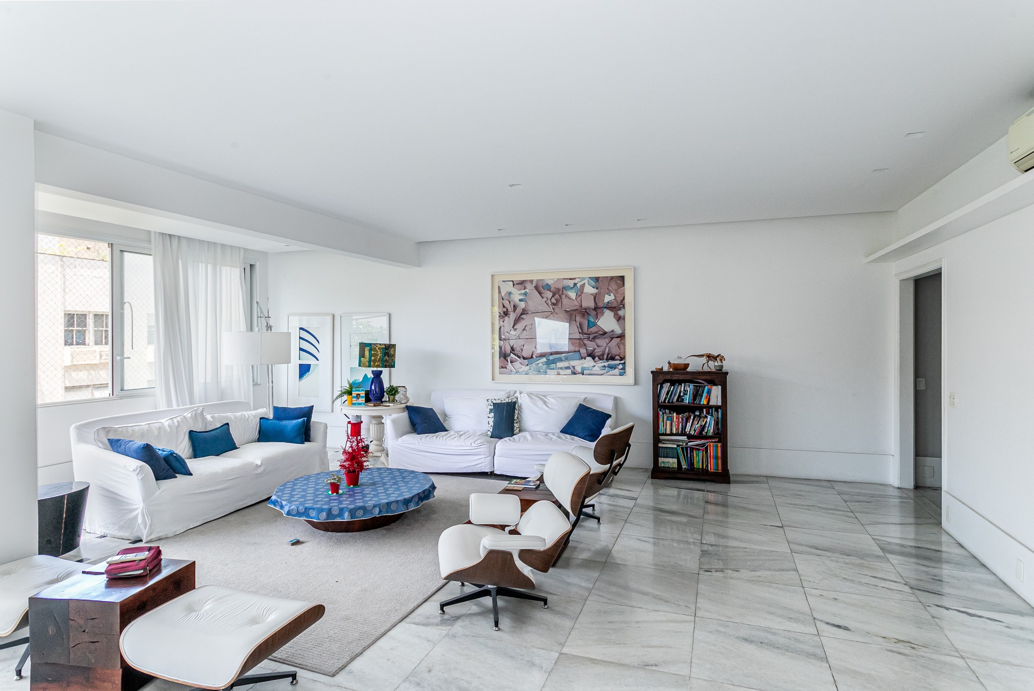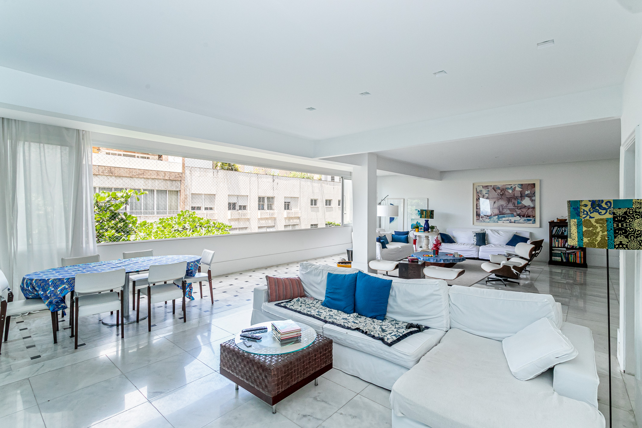 This renovated apartment offers approximately 3,111 sq. ft of well-distributed interiors and a lateral view of the ocean, ideally located near the Fasano Hotel. The living area is generous, arranged into three distinct environments and complemented by a powder room. The private quarters include four bedrooms, three of which are suites, in addition to a full bathroom. Marble flooring defines the social areas, while wood flooring extends through the private quarters. The kitchen includes a breakfast area and connects to the service area, which also features a service bathroom. All rooms are equipped with split air conditioning, including the kitchen. The property includes one deeded parking space, and the building offers 24-hour concierge service.
