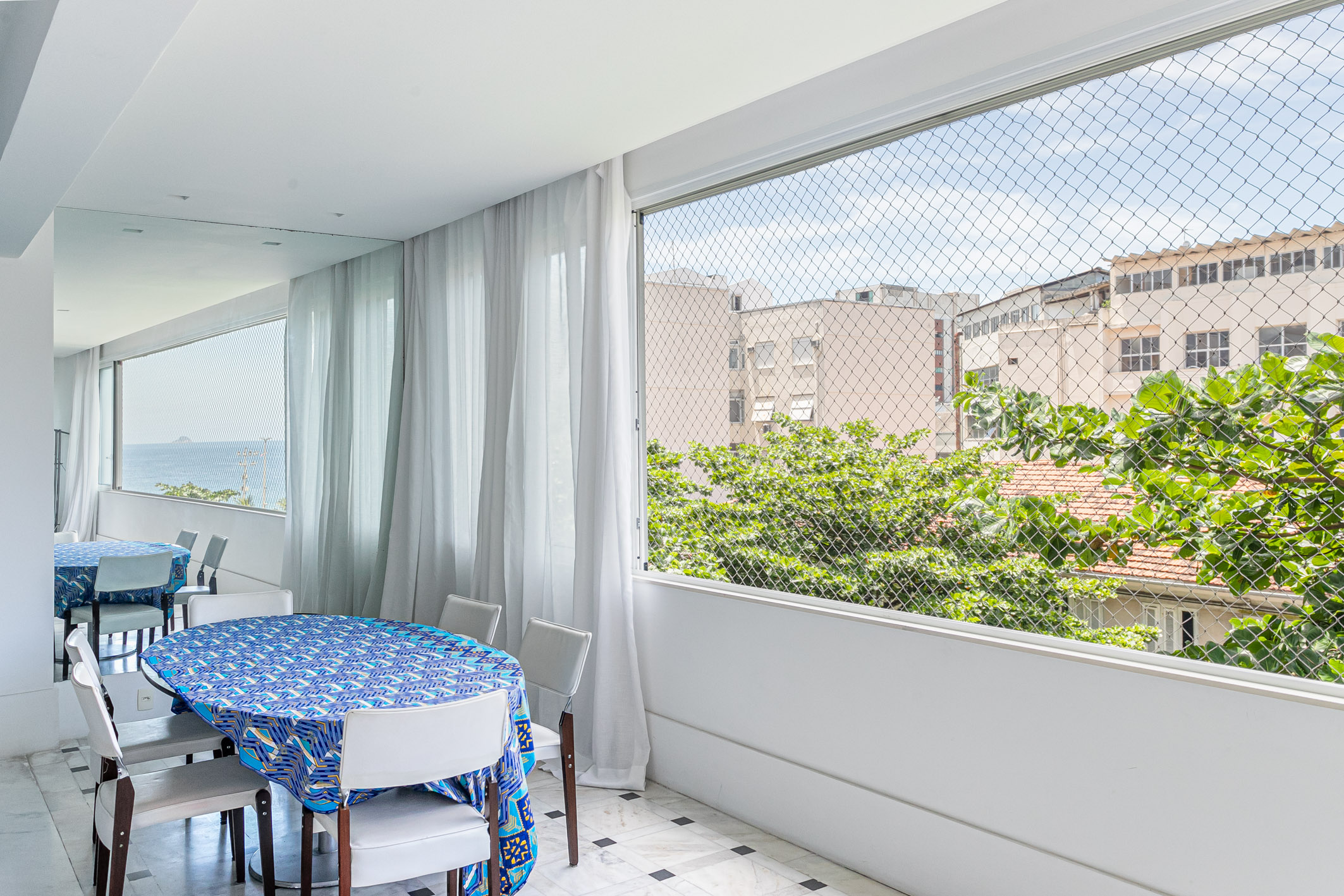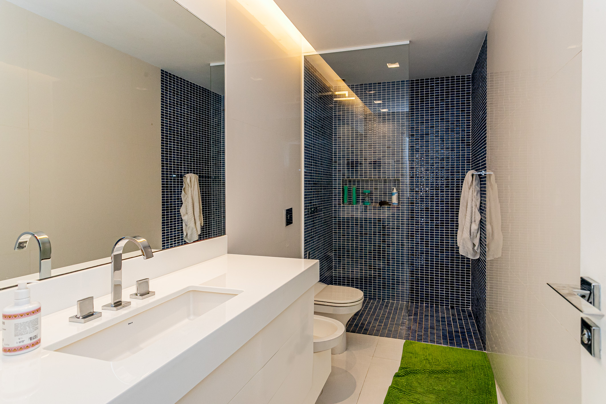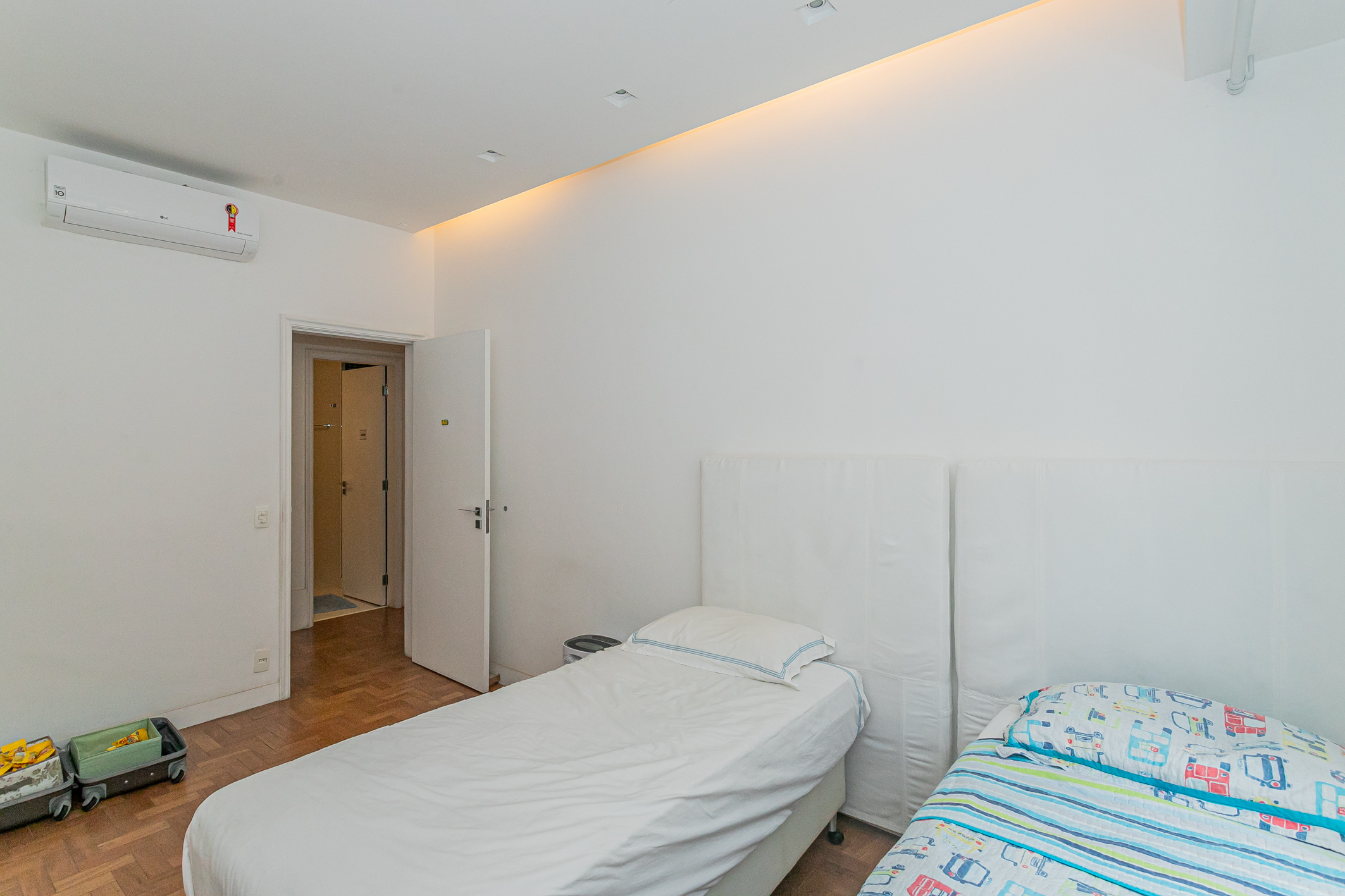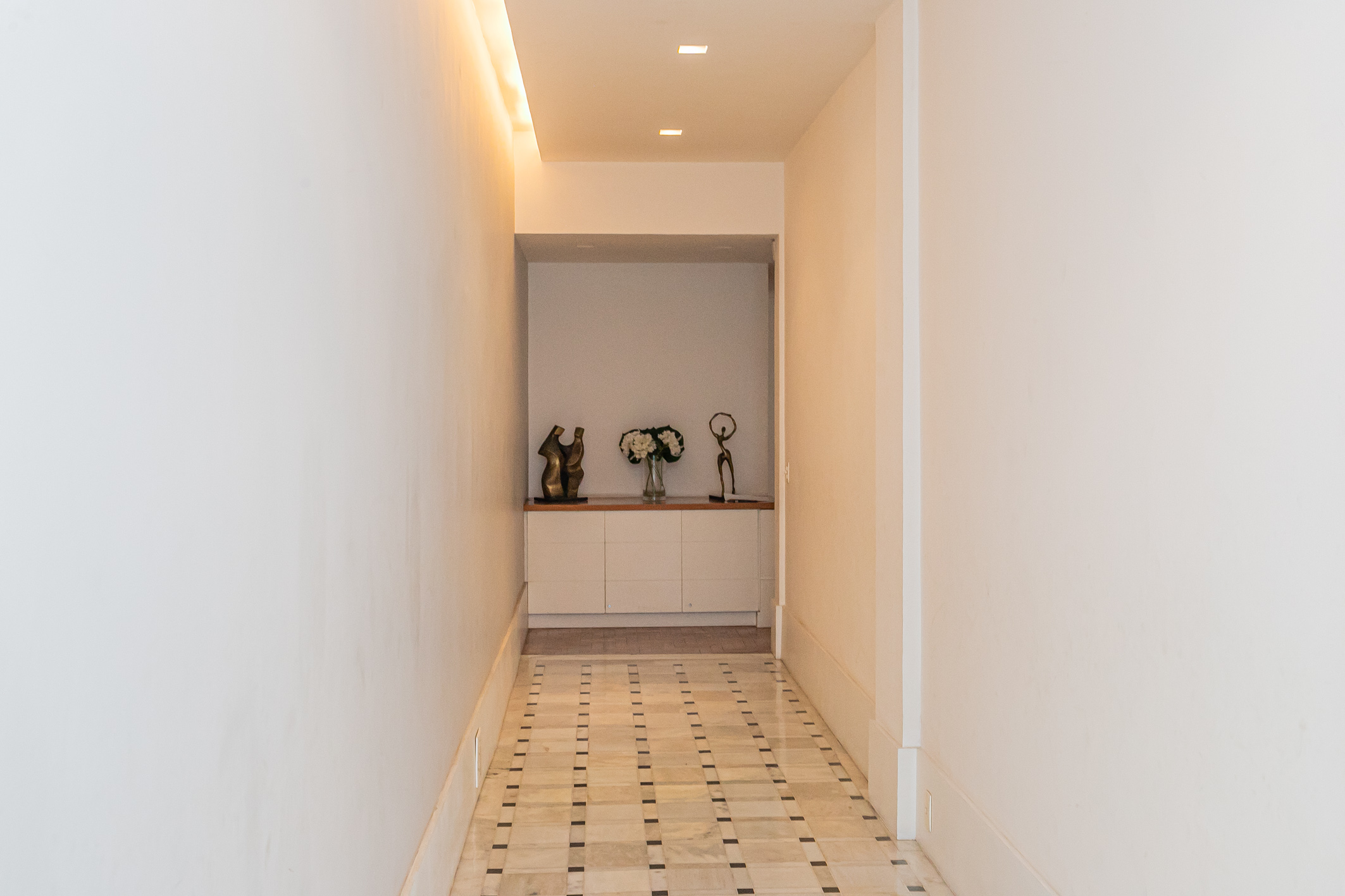 This renovated apartment offers approximately 3,111 sq. ft of well-distributed interiors and a lateral view of the ocean, ideally located near the Fasano Hotel. The living area is generous, arranged into three distinct environments and complemented by a powder room. The private quarters include four bedrooms, three of which are suites, in addition to a full bathroom. Marble flooring defines the social areas, while wood flooring extends through the private quarters. The kitchen includes a breakfast area and connects to the service area, which also features a service bathroom. All rooms are equipped with split air conditioning, including the kitchen. The property includes one deeded parking space, and the building offers 24-hour concierge service.
