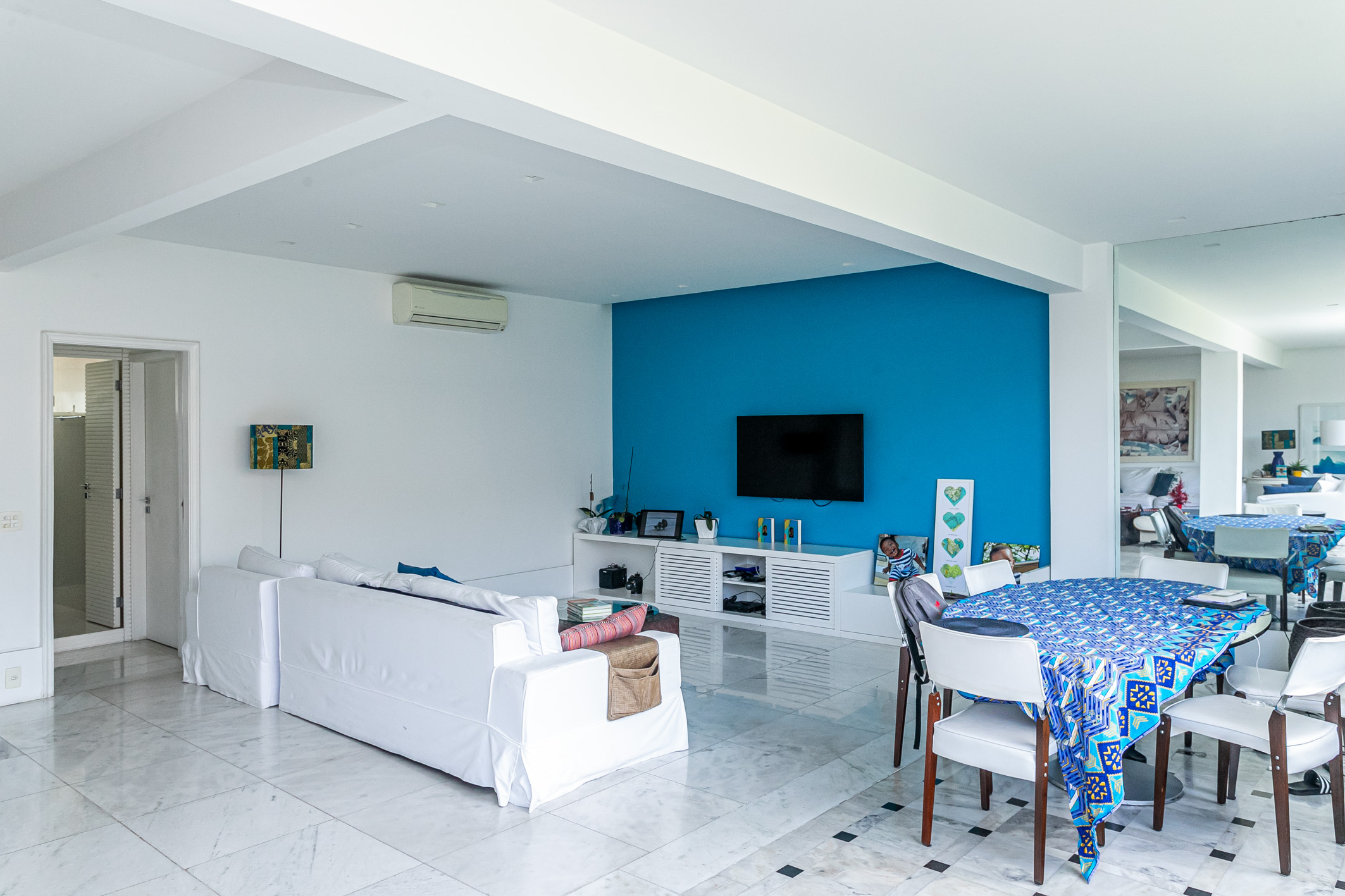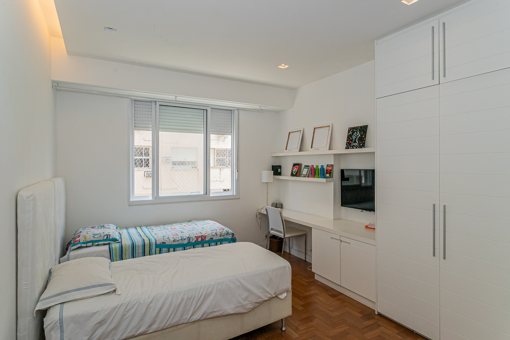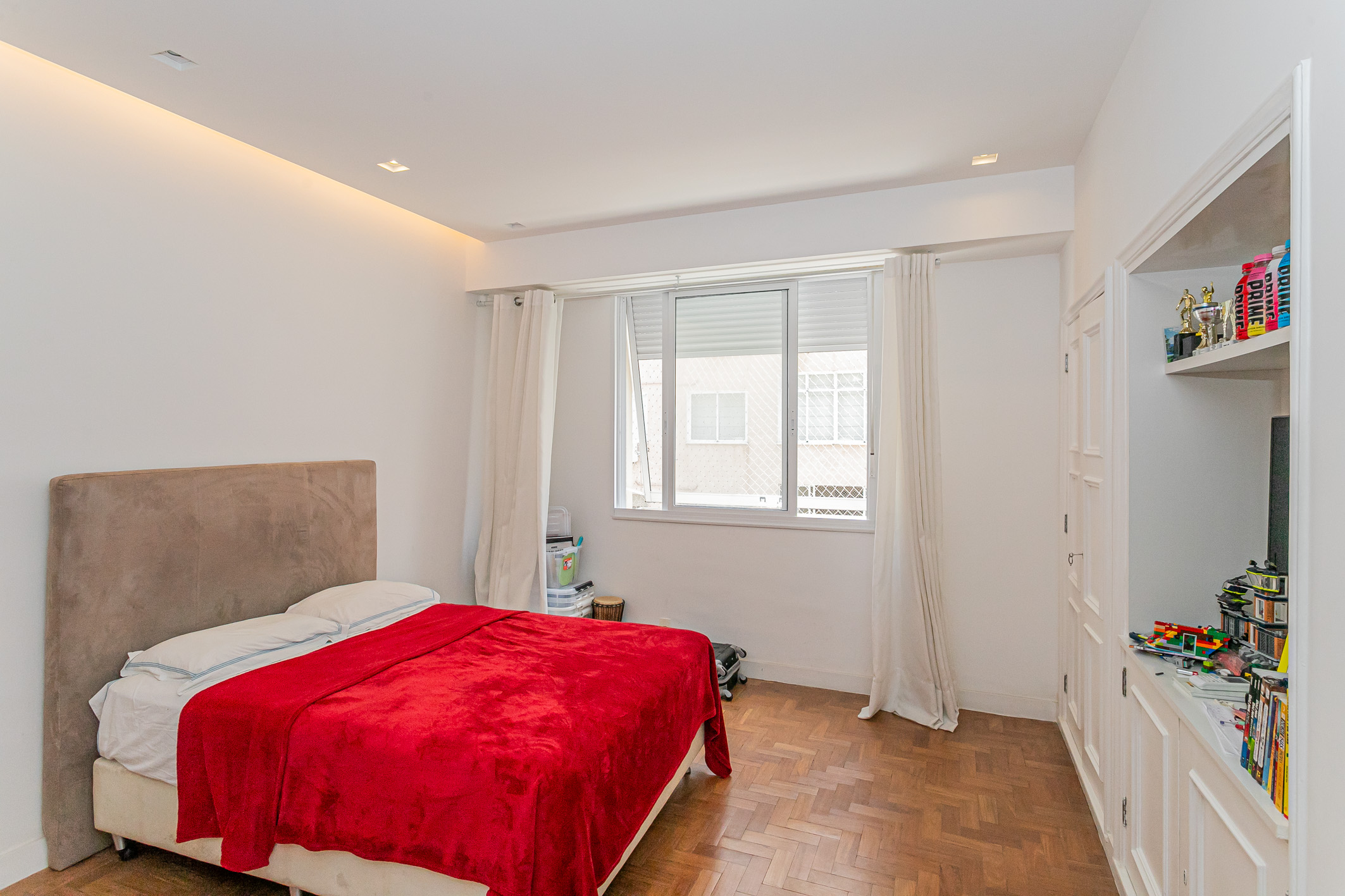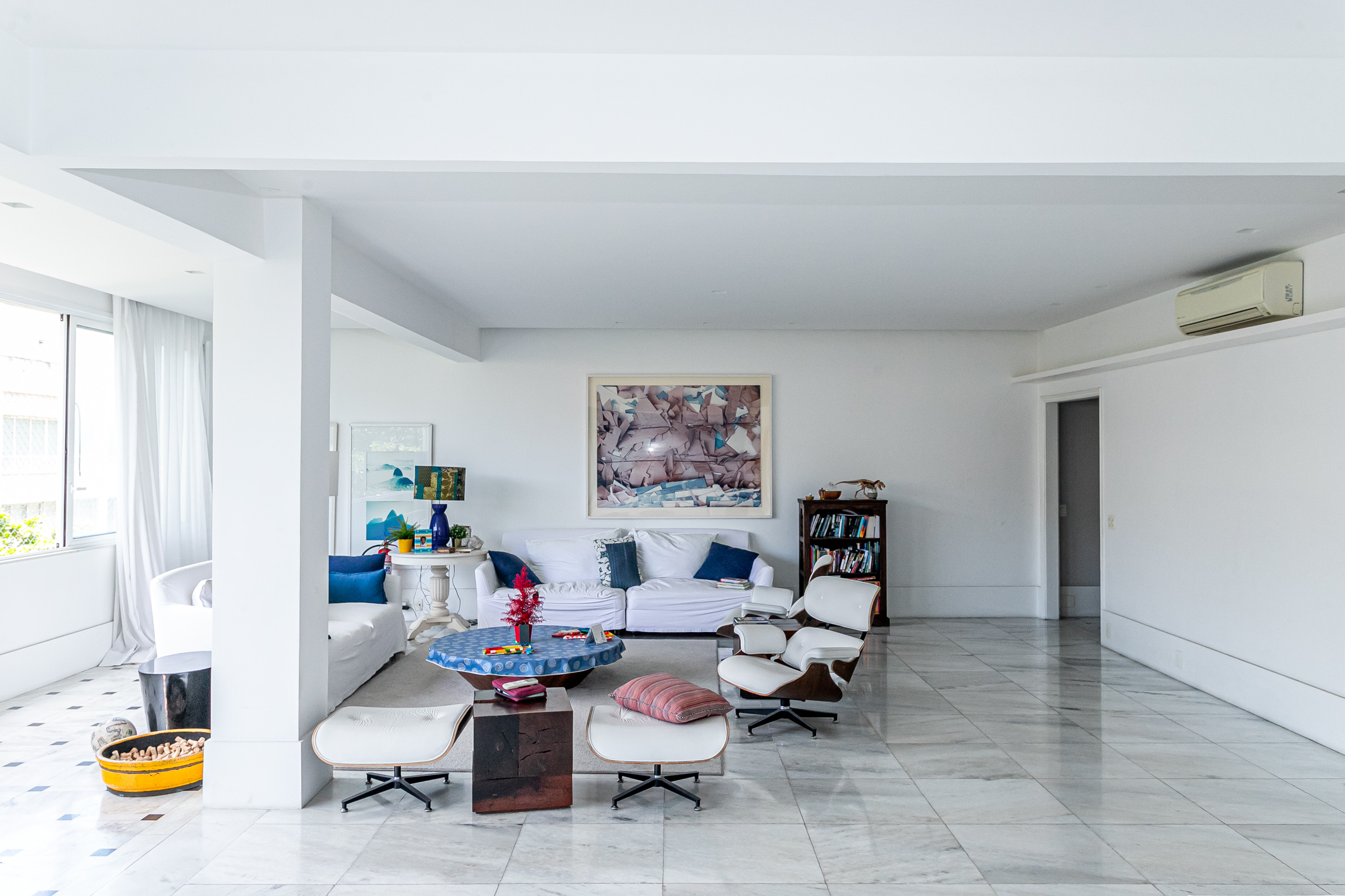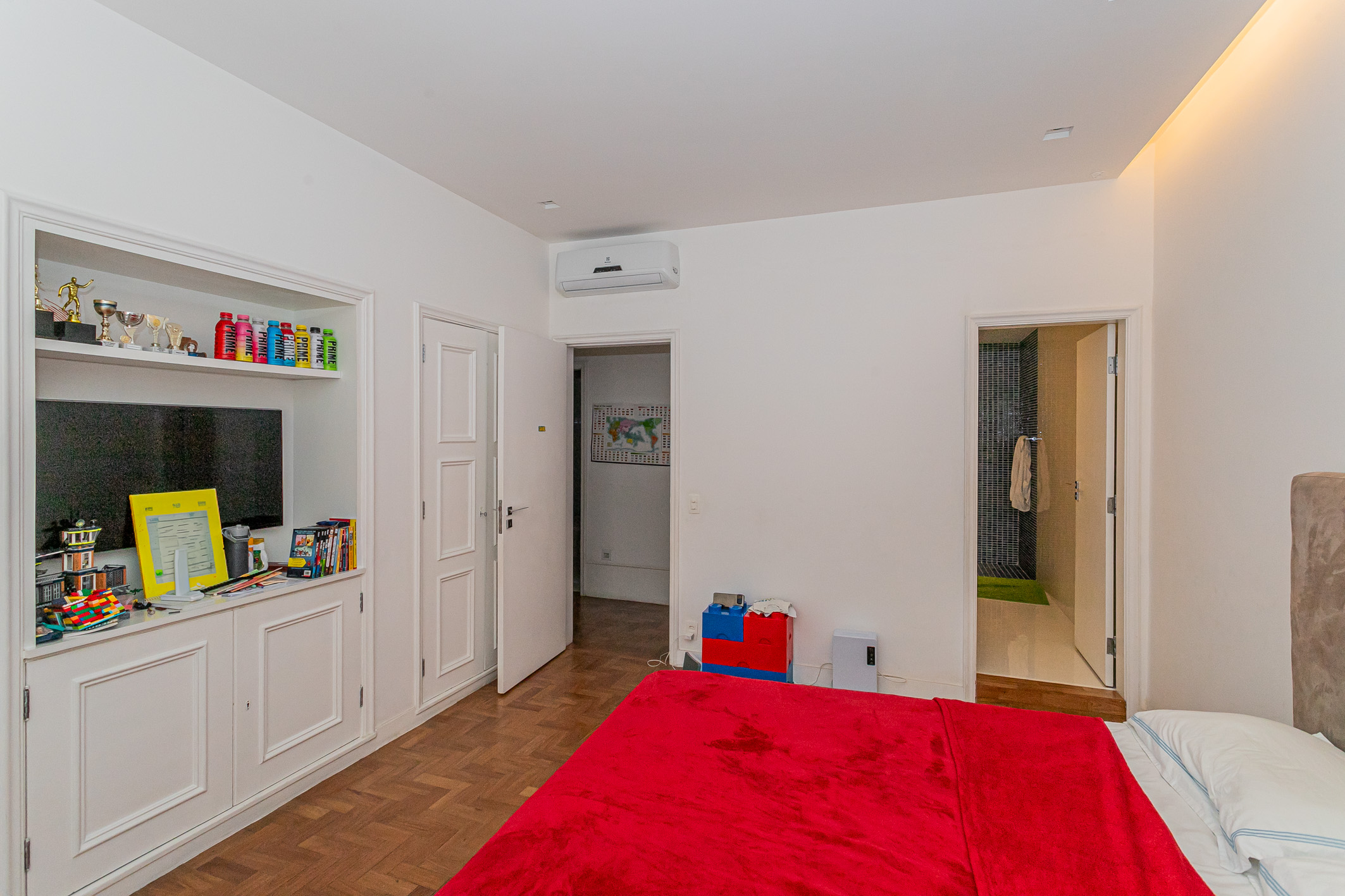 This renovated apartment offers approximately 3,111 sq. ft of well-distributed interiors and a lateral view of the ocean, ideally located near the Fasano Hotel. The living area is generous, arranged into three distinct environments and complemented by a powder room. The private quarters include four bedrooms, three of which are suites, in addition to a full bathroom. Marble flooring defines the social areas, while wood flooring extends through the private quarters. The kitchen includes a breakfast area and connects to the service area, which also features a service bathroom. All rooms are equipped with split air conditioning, including the kitchen. The property includes one deeded parking space, and the building offers 24-hour concierge service.