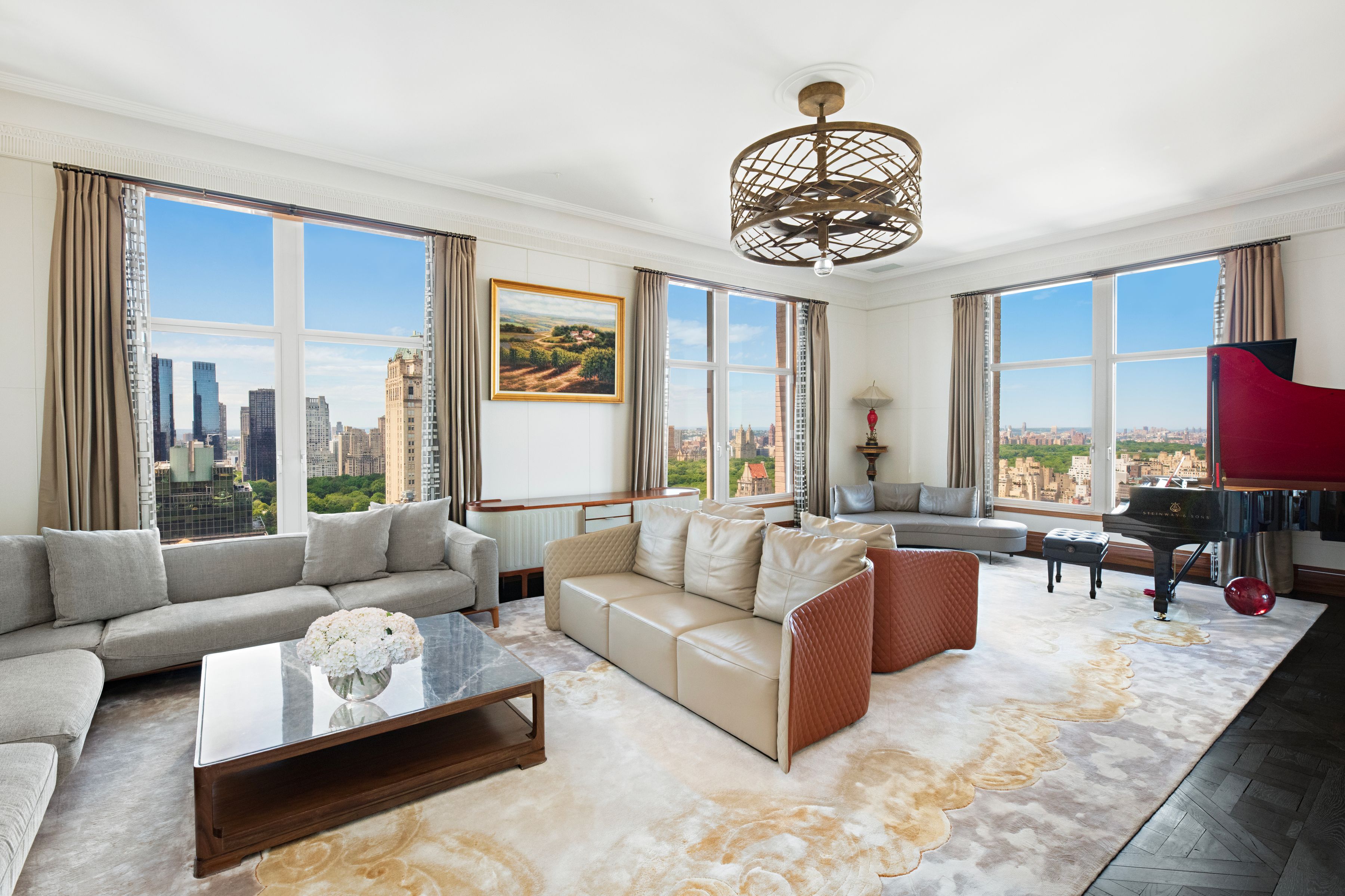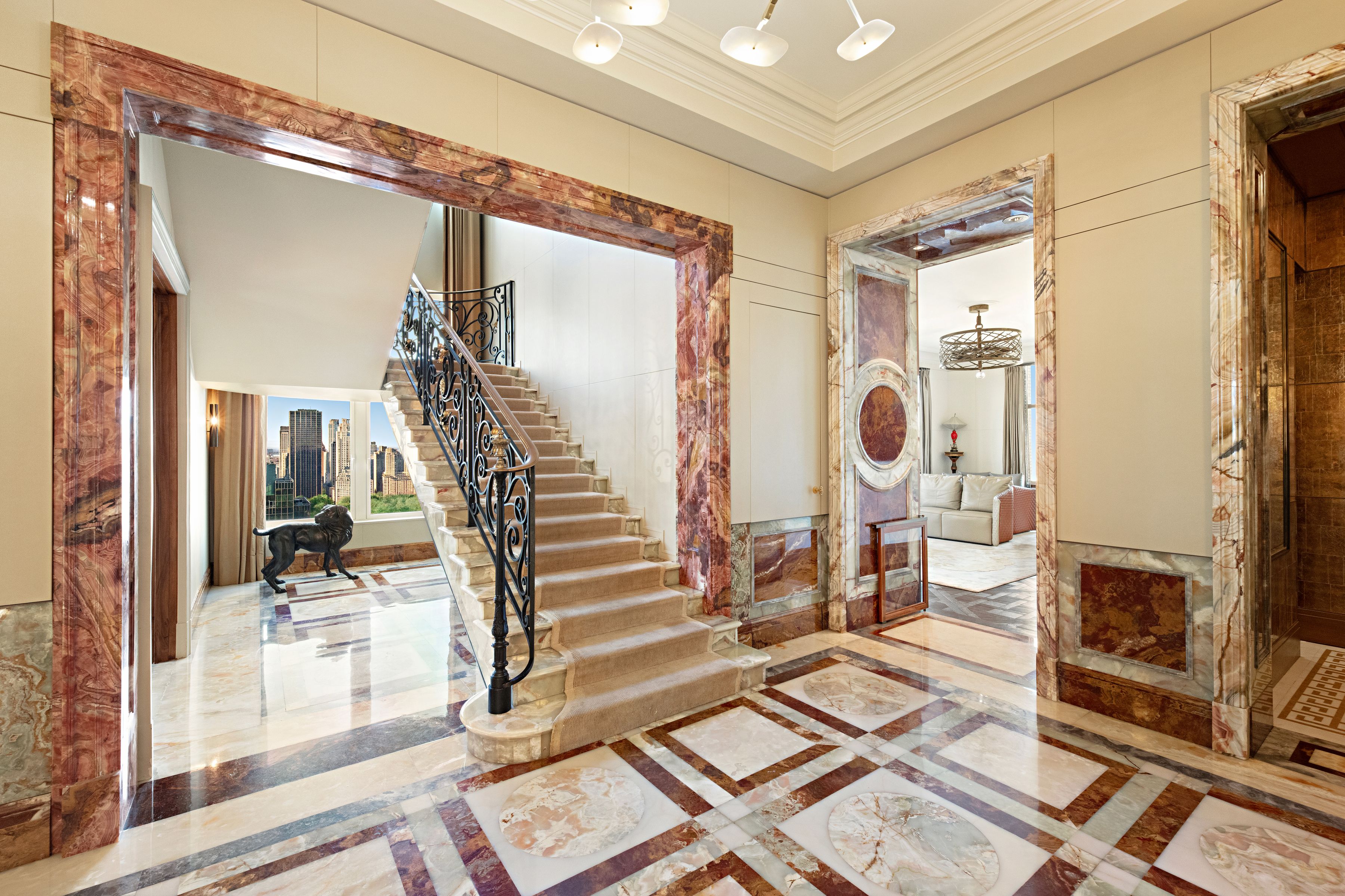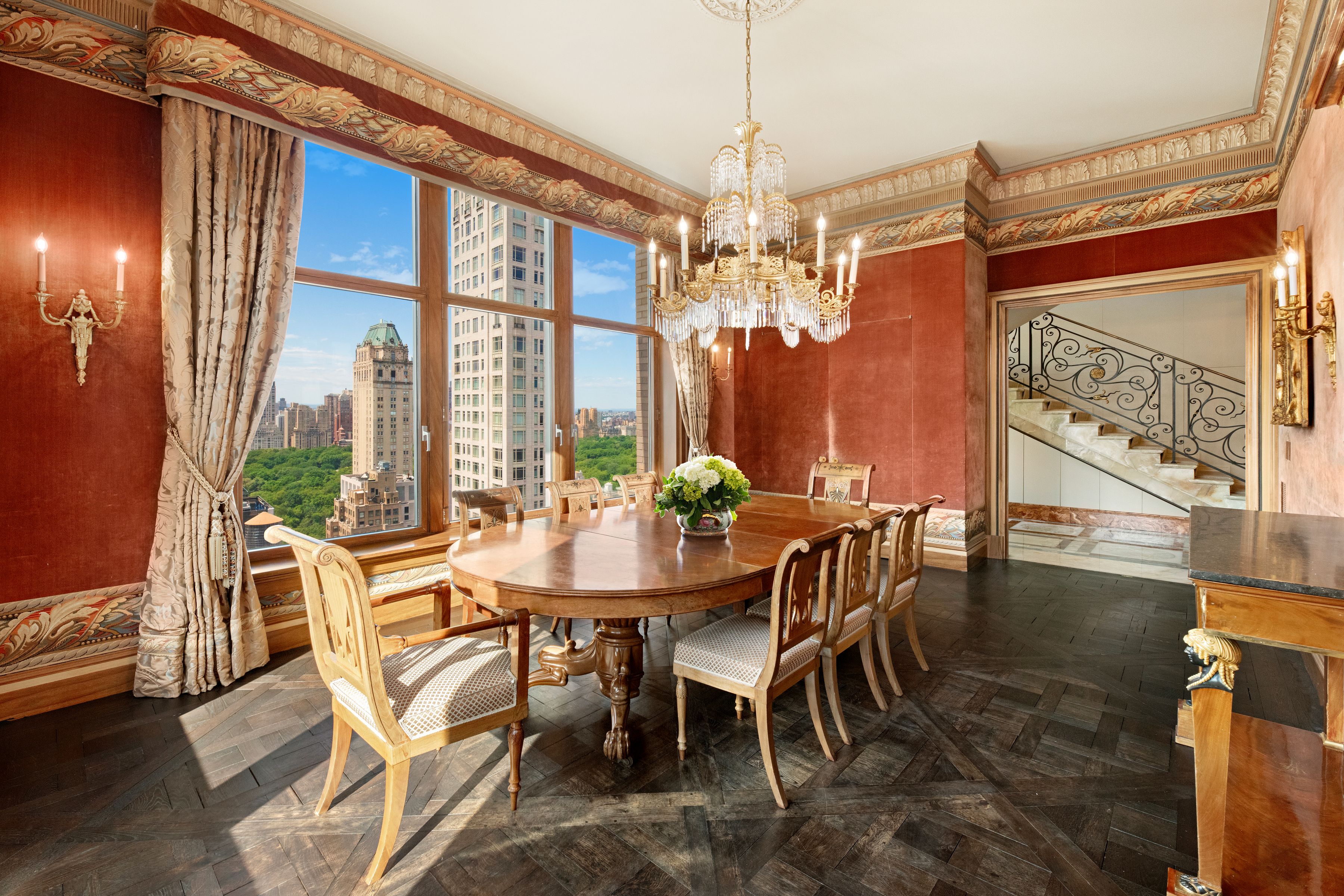 Perched far above the cityscape on the 36th and 37th Floors, this very impressive and sophisticated duplex residence at 515 Park Avenue boasts phenomenal 360-degree City and Central Park views from multiple oversized picture windows. Grand, sun flooded rooms of immense scale and proportion present multiple corner exposures and lend themselves perfectly to major entertaining as well as extremely elegant living. Spanning two fully floors and more than 5,000 SF, this sprawling five-bedroom residence was expertly conceived by AD100 Designer Juan Pablo Molyneux. This master designer’s exquisite finishes and custom details, such as parquet de Versailles hardwood floors, marble and onyx floors, and Guerin hardware, are in evidence throughout and convey a quiet elegance that complements the extraordinary views, immense scale, and wonderfully tall, 11’5” ceilings. The floor plan is expansive and versatile. From a private elevator landing, the impressive marble Gallery, anchored by a sweeping custom designed onyx staircase, features dazzling views of the Manhattan skyline and Central Park. The Gallery opens to two gorgeous entertainment rooms: the vast corner Living Room with skyliner views north and west over the Park features a 19th century French scagliola fireplace; and the stately corner Dining Room with views west and south. From the Living Room, the handsome corner Library has endless views north and a mesmerizing view east, towards the bridges and East River. All three rooms feature gorgeous parquet de Versailles floors. Beyond, a gloriously sunny Kitchen with custom cabinetry and a panoply of top-of-the-line stainless steel appliances is vast and offers ample space for casual dining. Eastern and southern exposures ensure that this room is sun-flooded throughout the day. From the Gallery, a stylish onyx Powder Room and a very ample coat closet are conveniently accessible. Above, private quarters include a massive corner Primary Bedroom Suite comprised of an expansive Bedroom supported by a vast Dressing Room and a luxuriously appointed onyx Bathroom with double sinks and a separate tub and steam shower. Three additional bedrooms, each with its own ensuite onyx or marble Bathroom and very ample closets. All of these well-scaled and eminently comfortable rooms share delightfully endless views of all of Manhattan, and beyond. This unique and extraordinary aerie is the embodiment of refined elegance and sophistication. Mesmerizing views from every room are complemented by grand scale, elegant proportion, and a truly glamorous and luxurious design underpinned by modern conveniences such as Crestron lighting and sound systems, as well as multiply-zoned central heating and air conditioning. Inspired by the grandeur and scale of the great prewar apartment buildings on Park and Fifth Avenues, 515 Park Avenue is a 43-story limestone tower realized by Zeckendorf Development in 2000. An ideally located and coveted address, this full-service, white-glove condominium offers its residents impeccable service as well as extensive amenities, such a dining room with a catering kitchen, a fully-equipped fitness center, temperature-controlled wine cellar storage facilities, valet service, and 24-hour security concierge service.