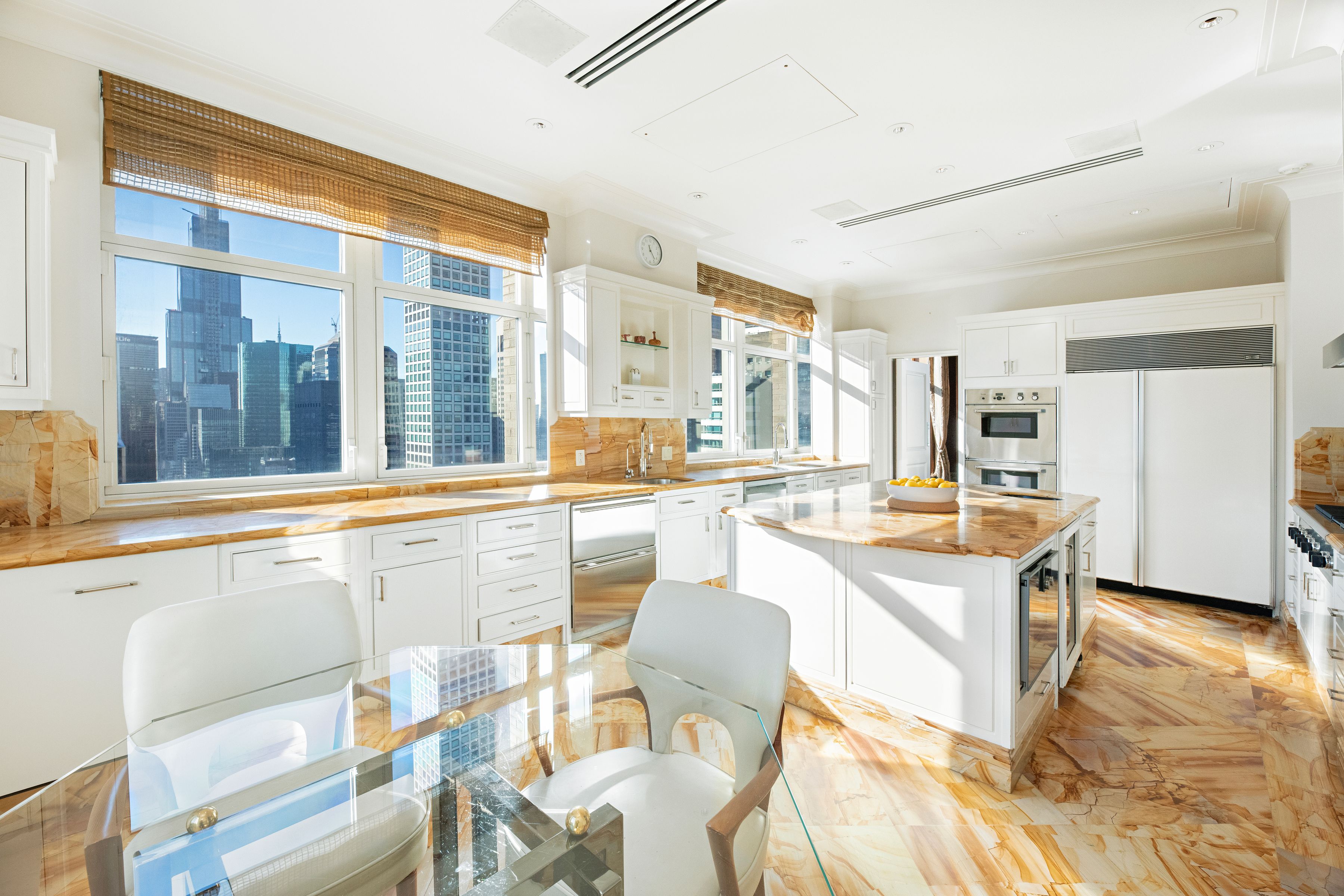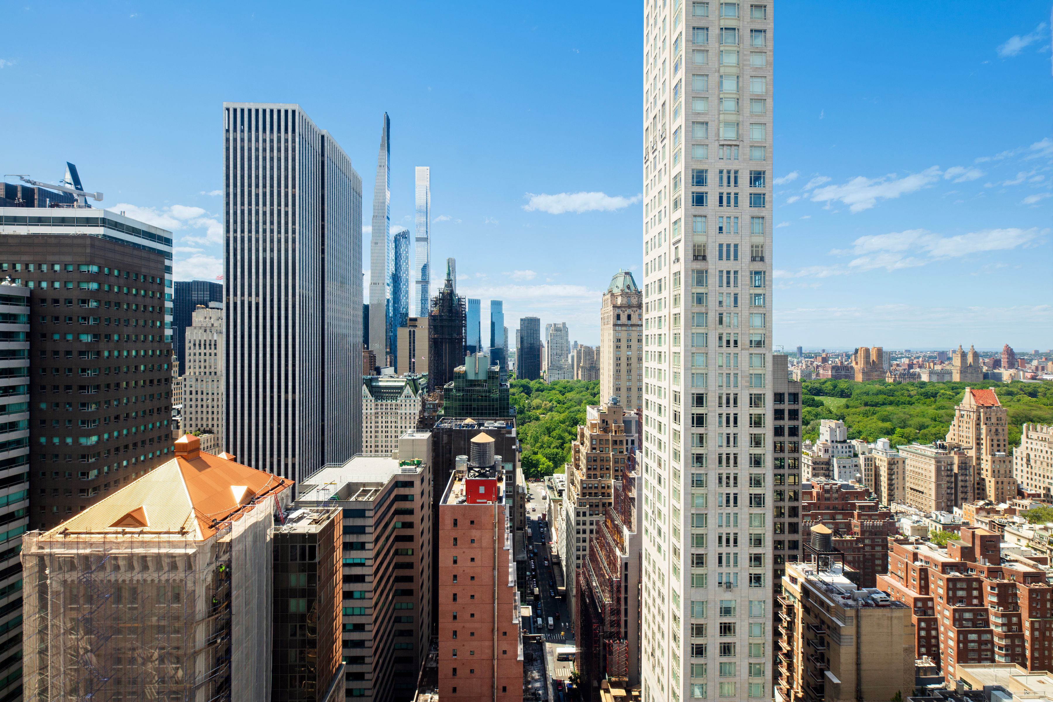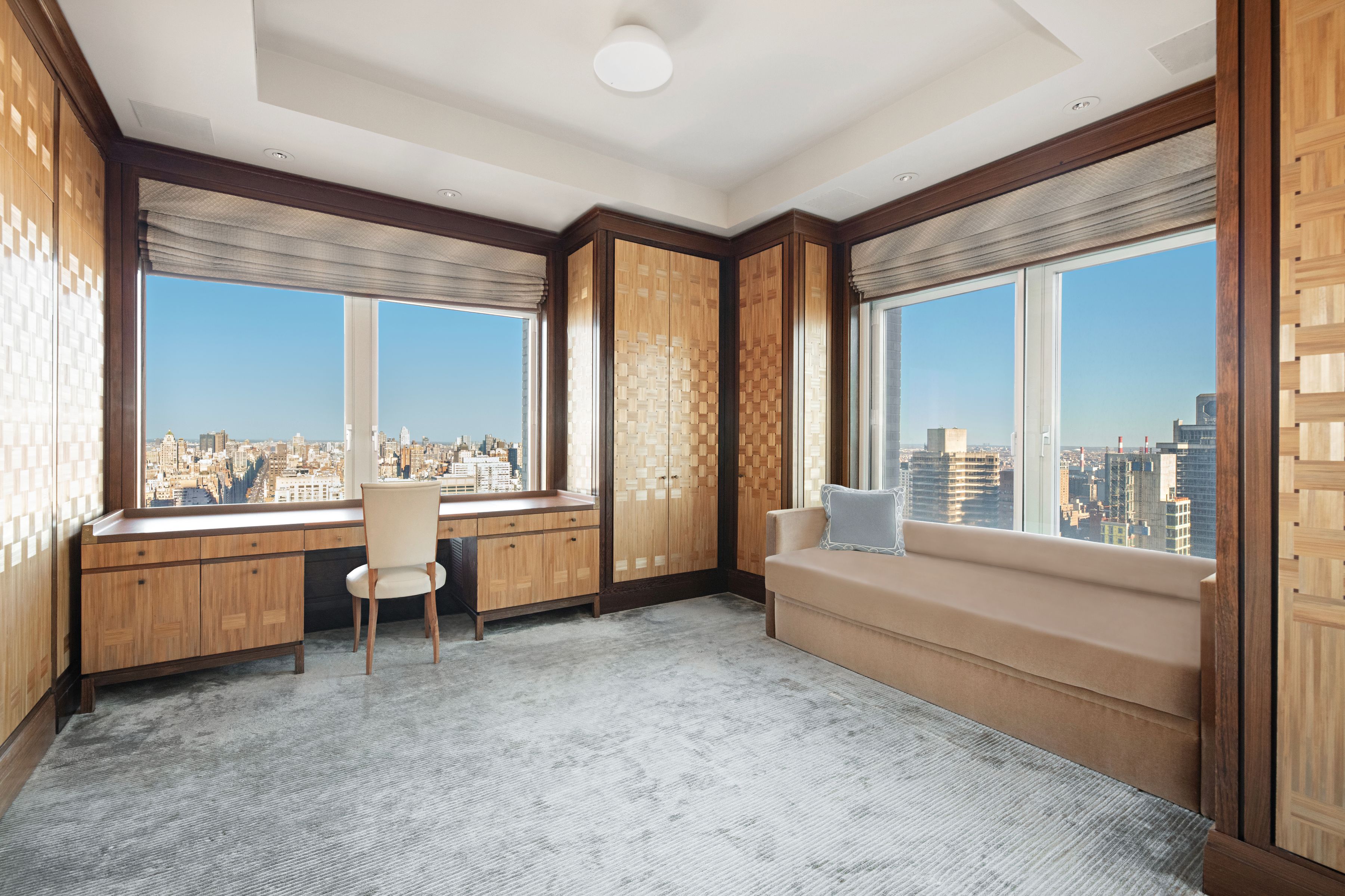 Perched far above the cityscape on the 36th and 37th Floors, this very impressive and sophisticated duplex residence at 515 Park Avenue boasts phenomenal 360-degree City and Central Park views from multiple oversized picture windows. Grand, sun flooded rooms of immense scale and proportion present multiple corner exposures and lend themselves perfectly to major entertaining as well as extremely elegant living. Spanning two fully floors and more than 5,000 SF, this sprawling five-bedroom residence was expertly conceived by AD100 Designer Juan Pablo Molyneux. This master designer’s exquisite finishes and custom details, such as parquet de Versailles hardwood floors, marble and onyx floors, and Guerin hardware, are in evidence throughout and convey a quiet elegance that complements the extraordinary views, immense scale, and wonderfully tall, 11’5” ceilings. The floor plan is expansive and versatile. From a private elevator landing, the impressive marble Gallery, anchored by a sweeping custom designed onyx staircase, features dazzling views of the Manhattan skyline and Central Park. The Gallery opens to two gorgeous entertainment rooms: the vast corner Living Room with skyliner views north and west over the Park features a 19th century French scagliola fireplace; and the stately corner Dining Room with views west and south. From the Living Room, the handsome corner Library has endless views north and a mesmerizing view east, towards the bridges and East River. All three rooms feature gorgeous parquet de Versailles floors. Beyond, a gloriously sunny Kitchen with custom cabinetry and a panoply of top-of-the-line stainless steel appliances is vast and offers ample space for casual dining. Eastern and southern exposures ensure that this room is sun-flooded throughout the day. From the Gallery, a stylish onyx Powder Room and a very ample coat closet are conveniently accessible. Above, private quarters include a massive corner Primary Bedroom Suite comprised of an expansive Bedroom supported by a vast Dressing Room and a luxuriously appointed onyx Bathroom with double sinks and a separate tub and steam shower. Three additional bedrooms, each with its own ensuite onyx or marble Bathroom and very ample closets. All of these well-scaled and eminently comfortable rooms share delightfully endless views of all of Manhattan, and beyond. This unique and extraordinary aerie is the embodiment of refined elegance and sophistication. Mesmerizing views from every room are complemented by grand scale, elegant proportion, and a truly glamorous and luxurious design underpinned by modern conveniences such as Crestron lighting and sound systems, as well as multiply-zoned central heating and air conditioning. Inspired by the grandeur and scale of the great prewar apartment buildings on Park and Fifth Avenues, 515 Park Avenue is a 43-story limestone tower realized by Zeckendorf Development in 2000. An ideally located and coveted address, this full-service, white-glove condominium offers its residents impeccable service as well as extensive amenities, such a dining room with a catering kitchen, a fully-equipped fitness center, temperature-controlled wine cellar storage facilities, valet service, and 24-hour security concierge service.