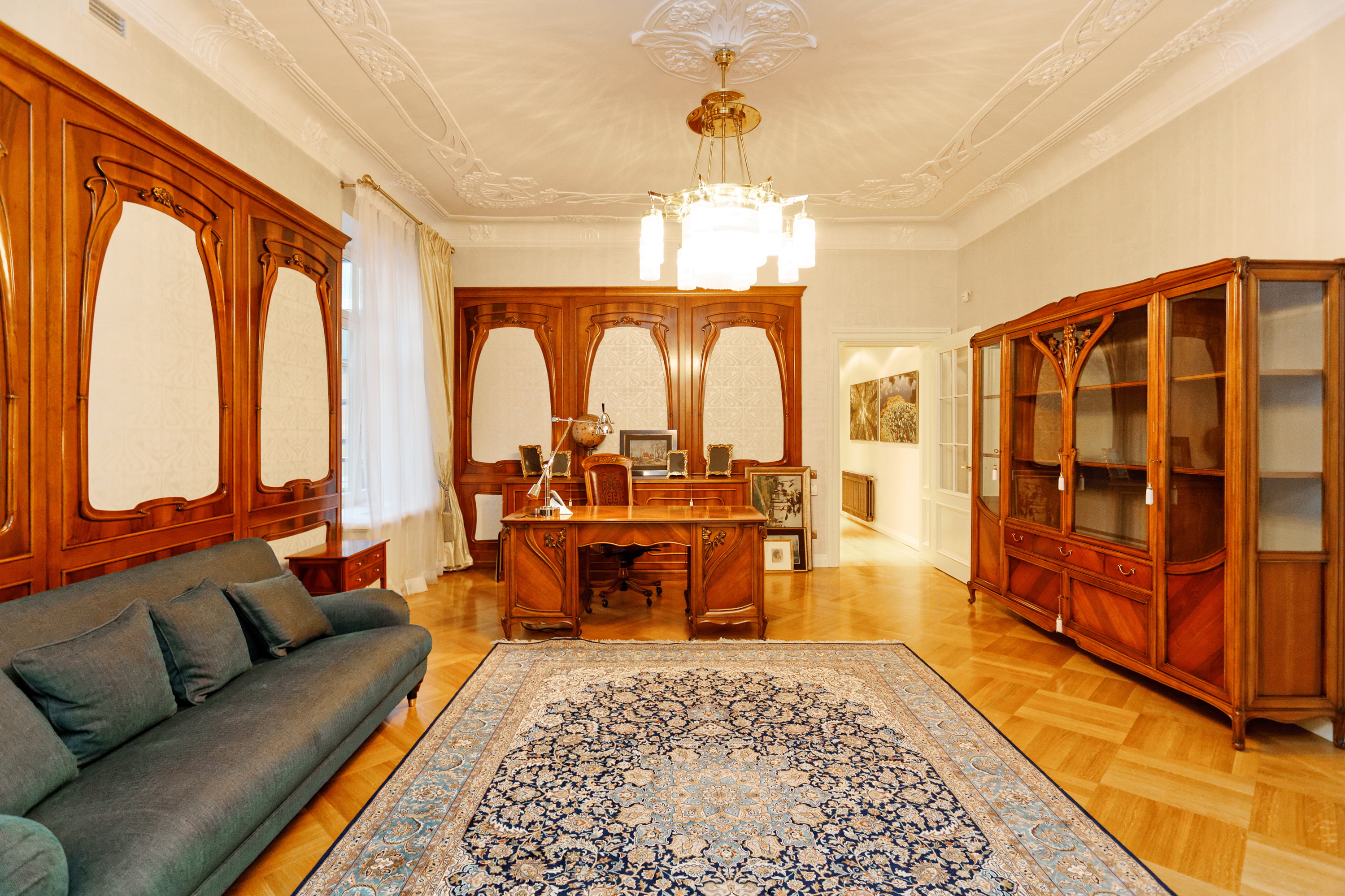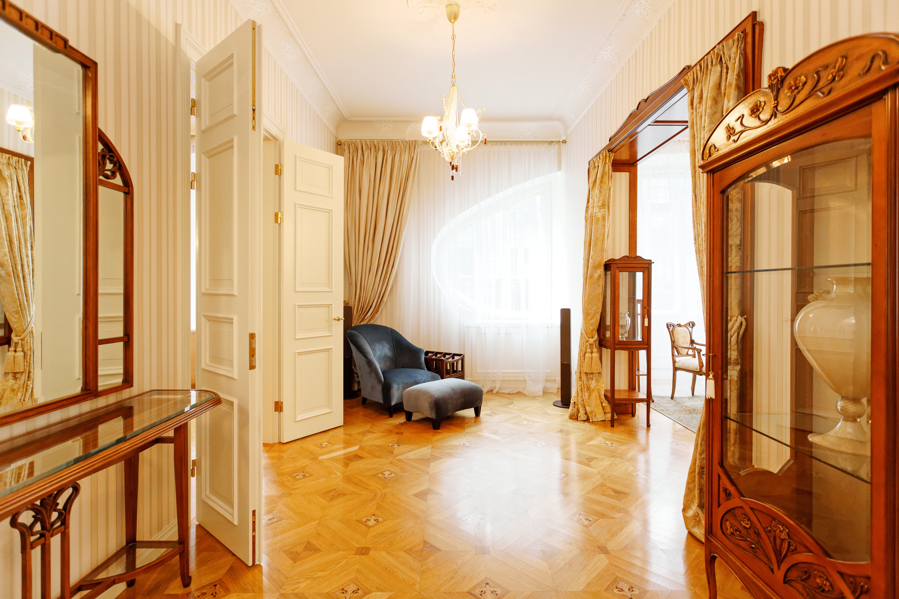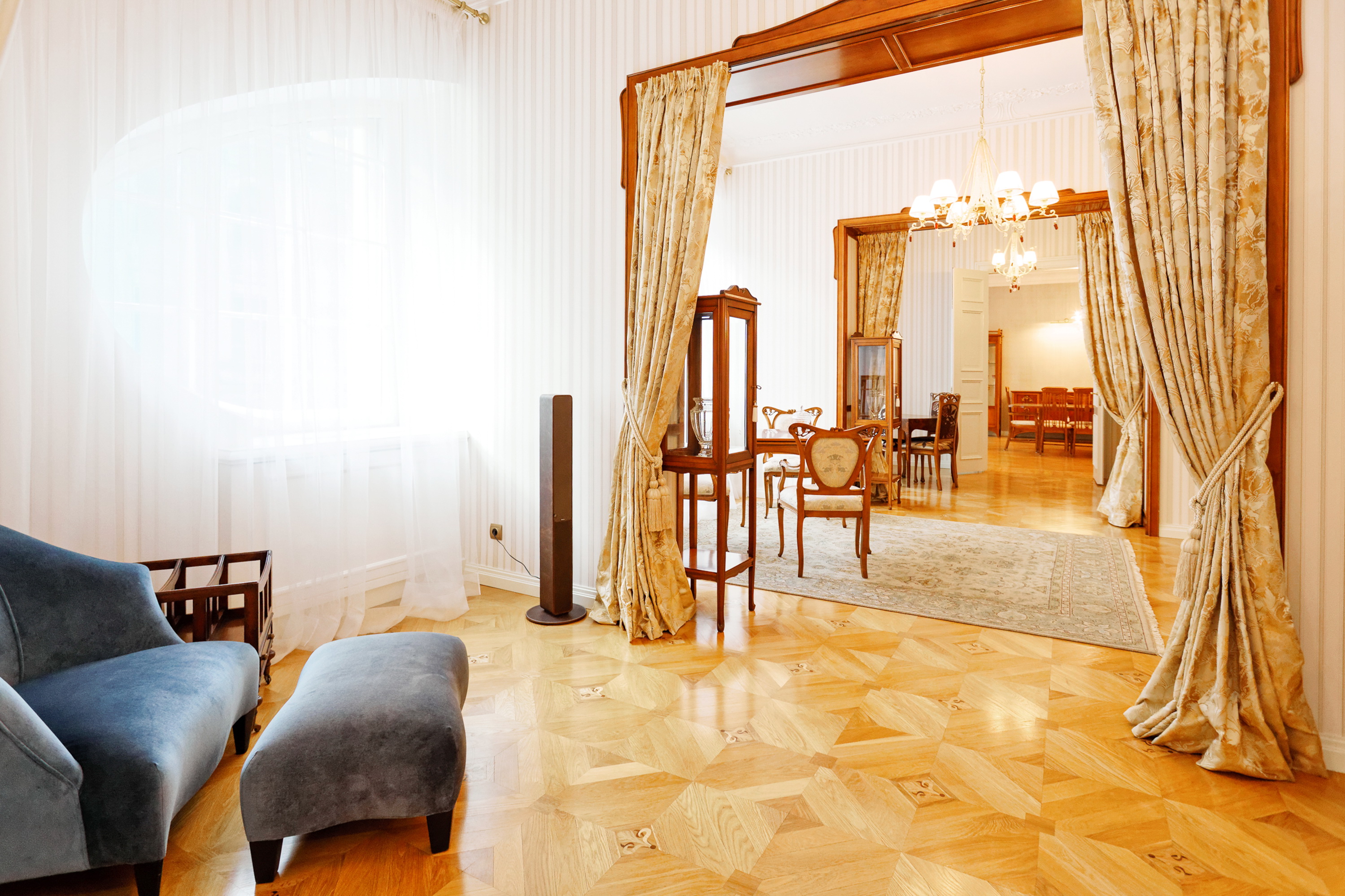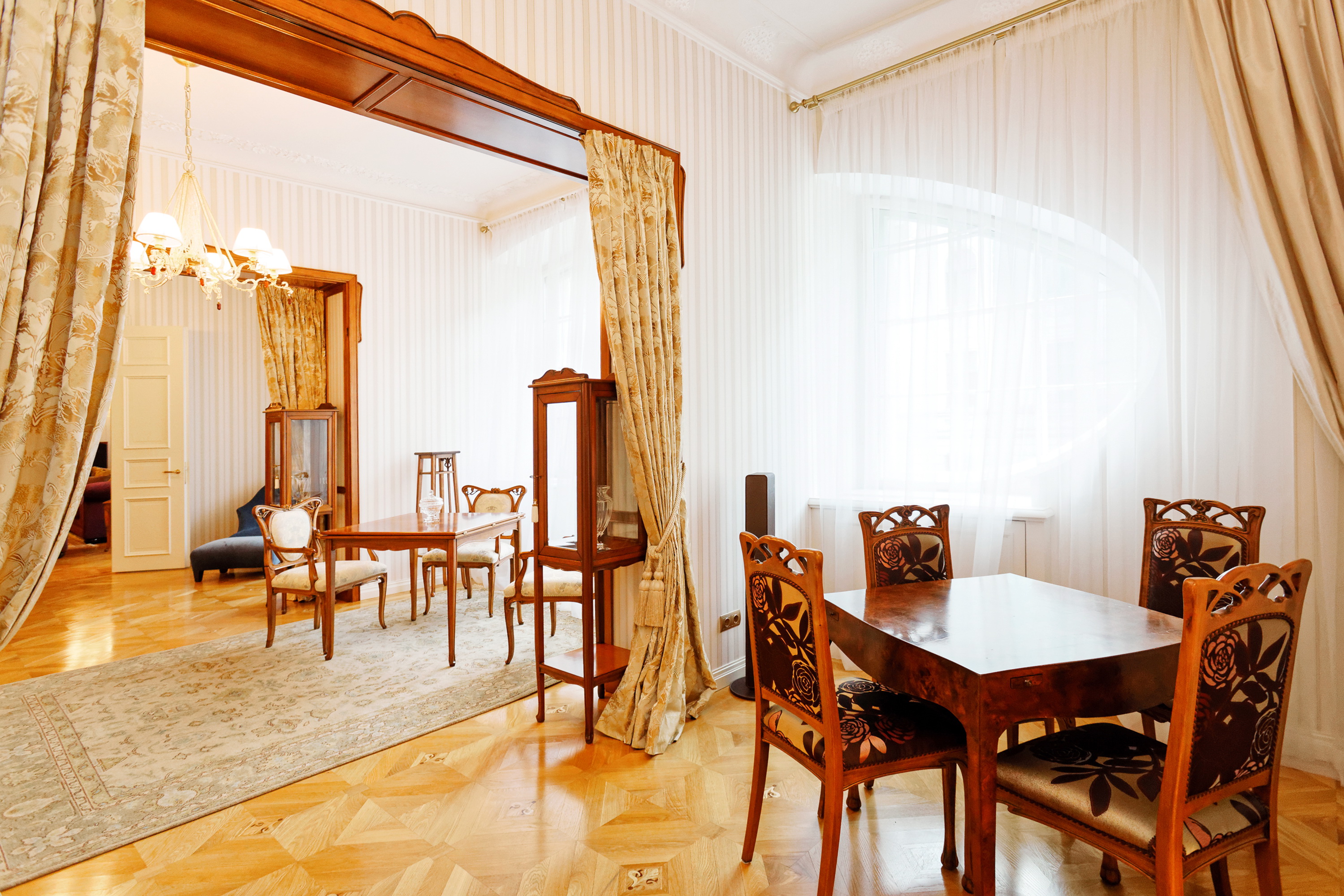 We offer to purchase a spacious and fully furnished apartment at Alberta Street in the house of a famous architect Michael Eisenstein, the house is completely renovated, special attention was paid to restoring the original interior elements. Apartment is located on third floor; the elevator is available. Apartment has spacious representative premises – a large living room, a dining room, a saloon, also a kitchen area, five bedrooms, four bathrooms, two additional guest WC and utility premises. This is an truly unique offer in the sophisticated house!