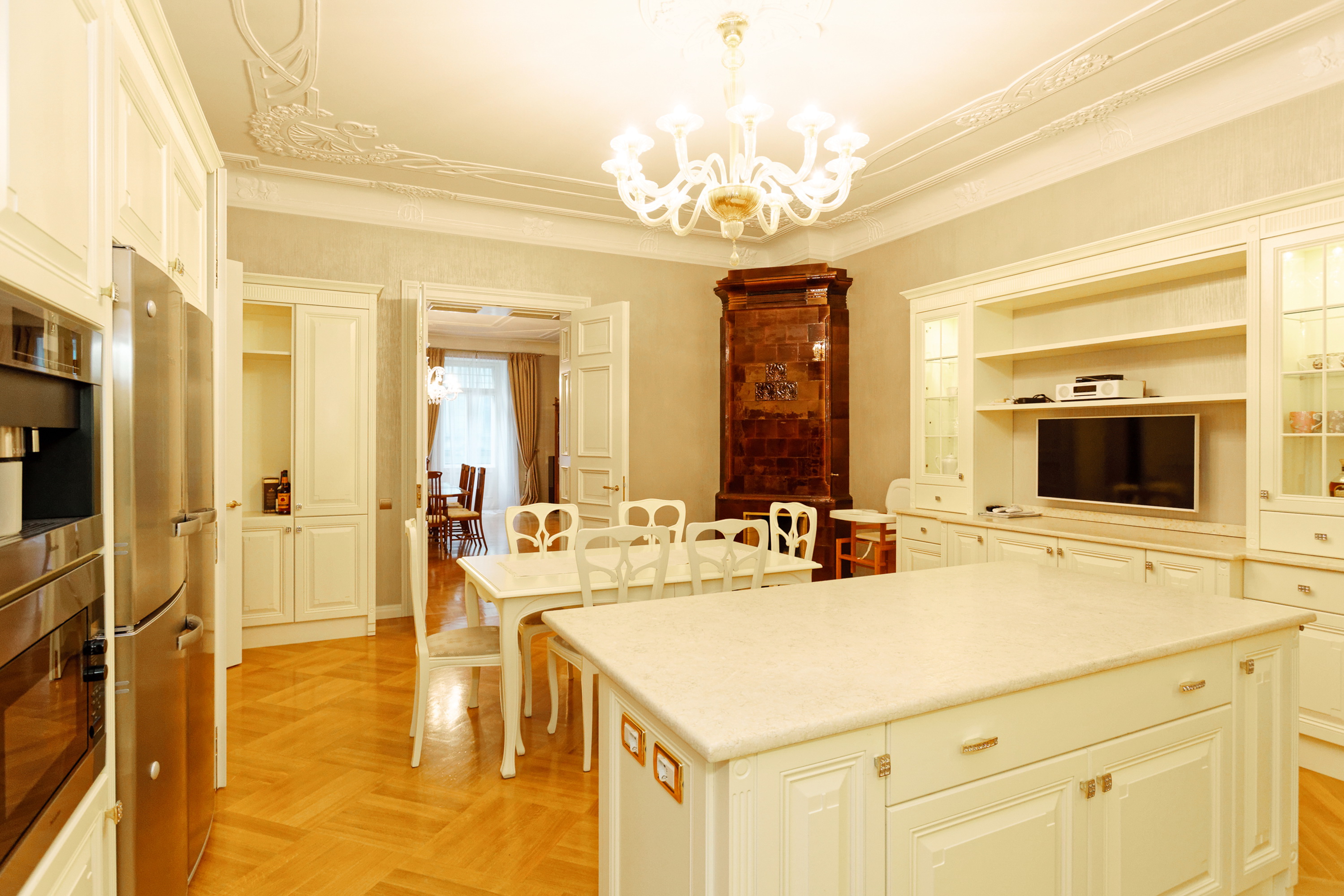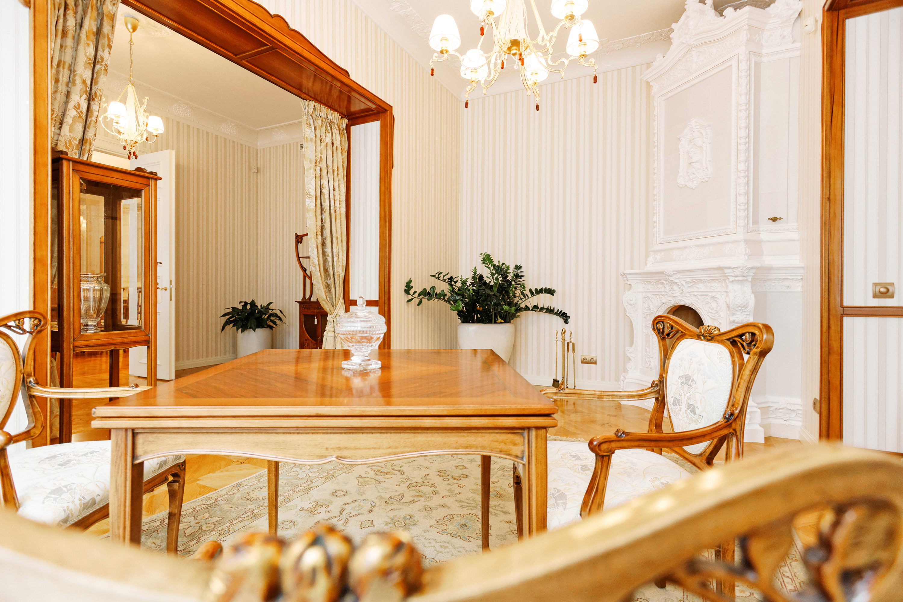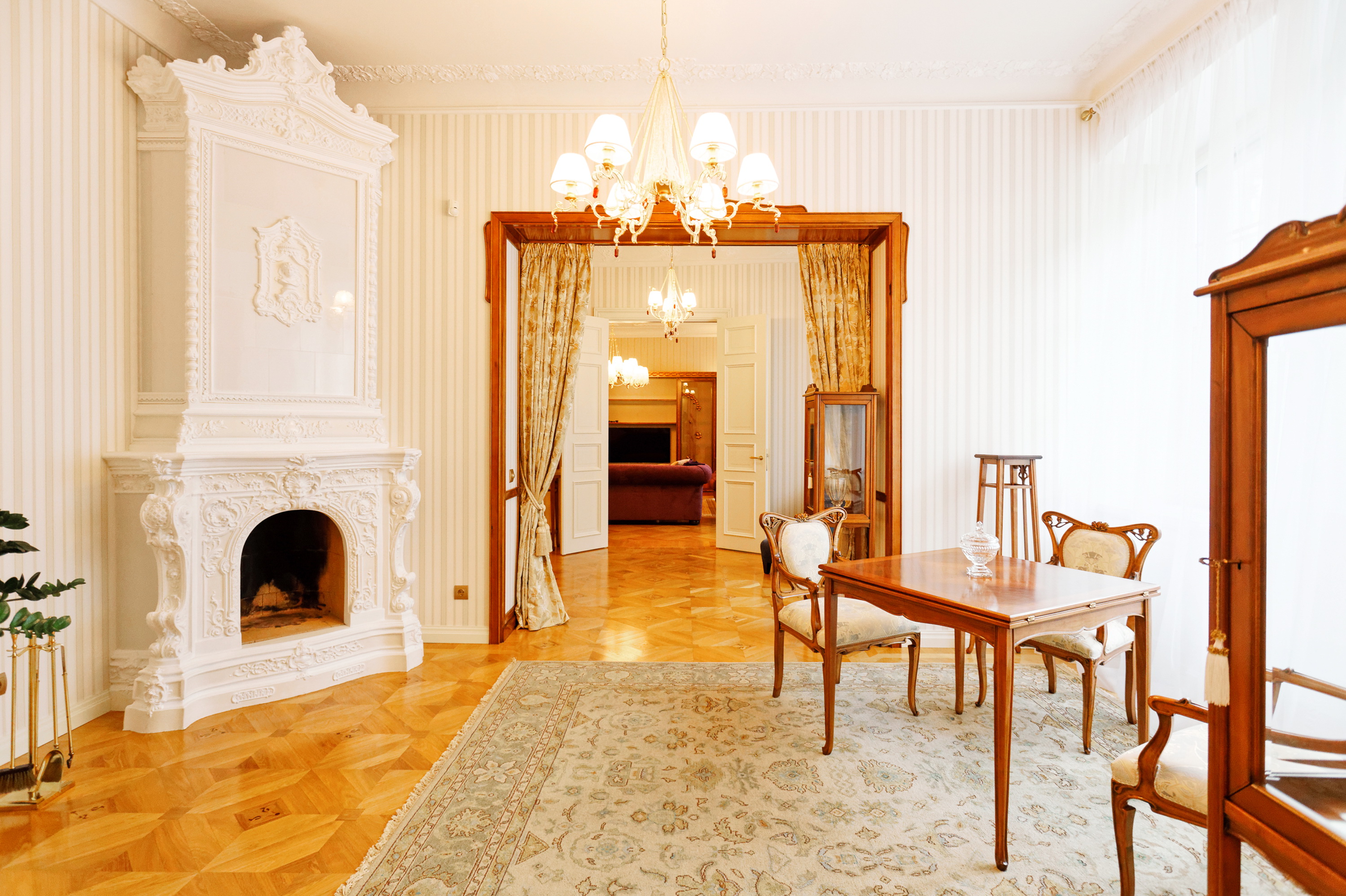 We offer to purchase a spacious and fully furnished apartment at Alberta Street in the house of a famous architect Michael Eisenstein, the house is completely renovated, special attention was paid to restoring the original interior elements. Apartment is located on third floor; the elevator is available. Apartment has spacious representative premises – a large living room, a dining room, a saloon, also a kitchen area, five bedrooms, four bathrooms, two additional guest WC and utility premises. This is an truly unique offer in the sophisticated house!