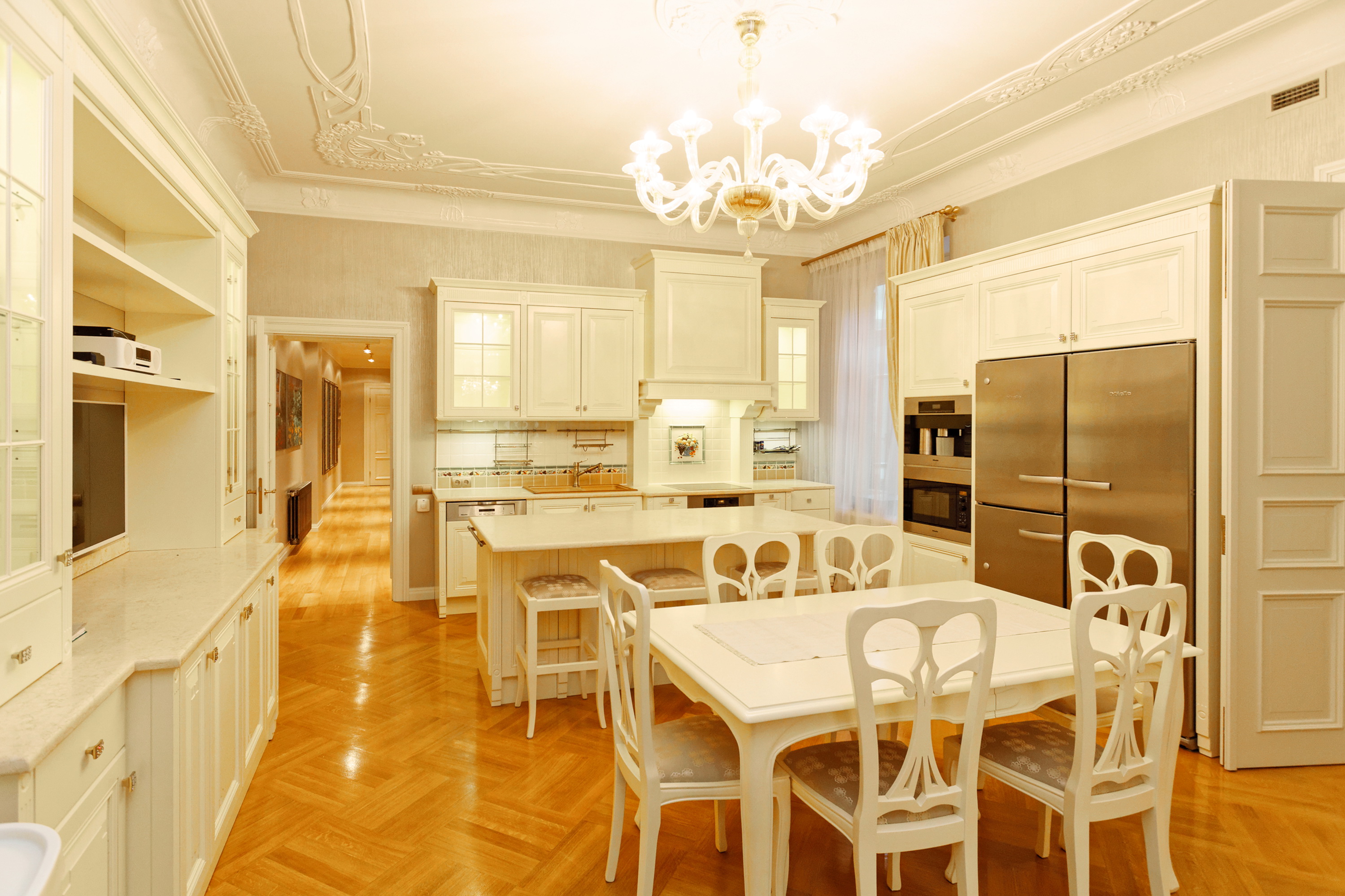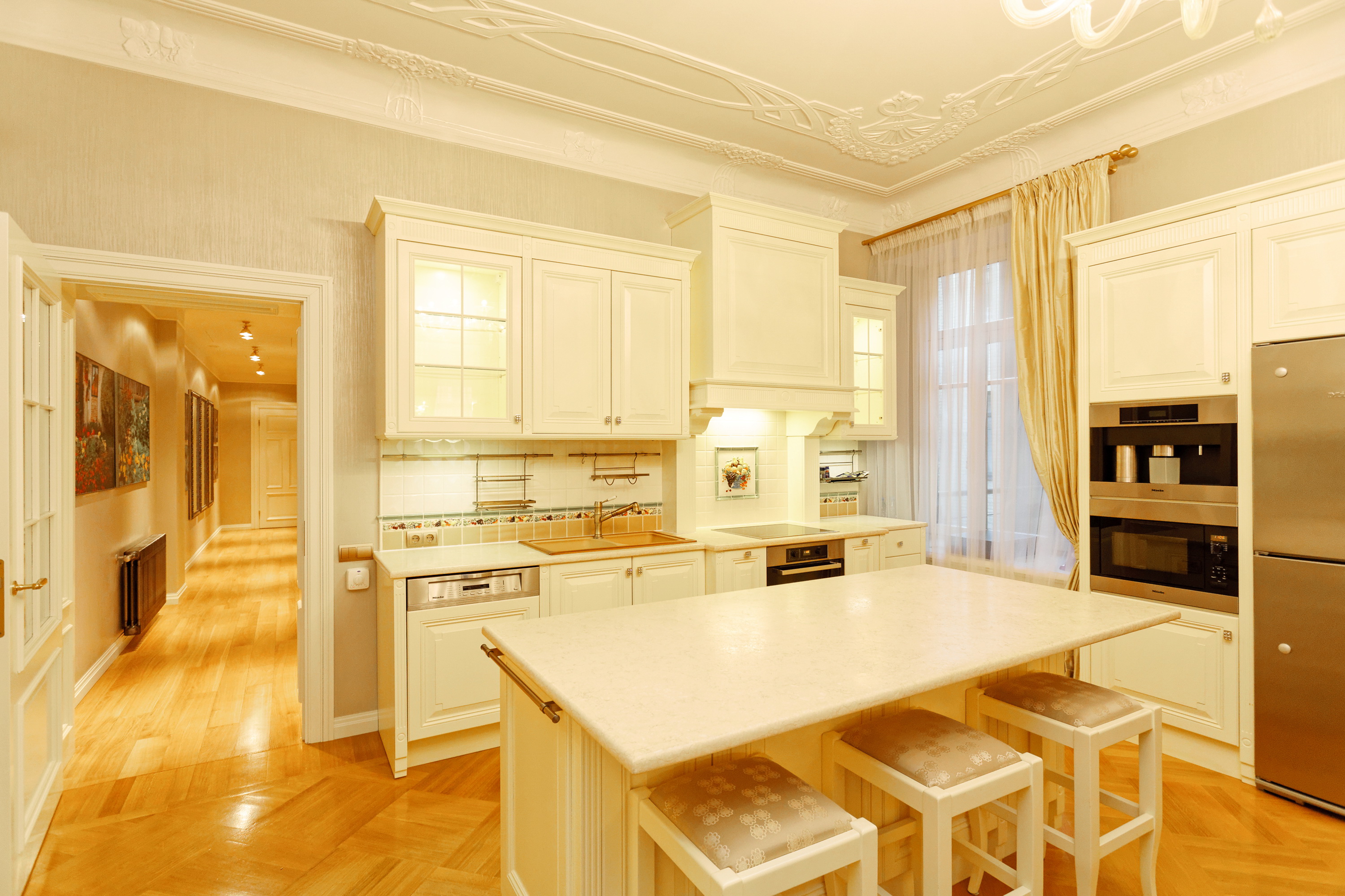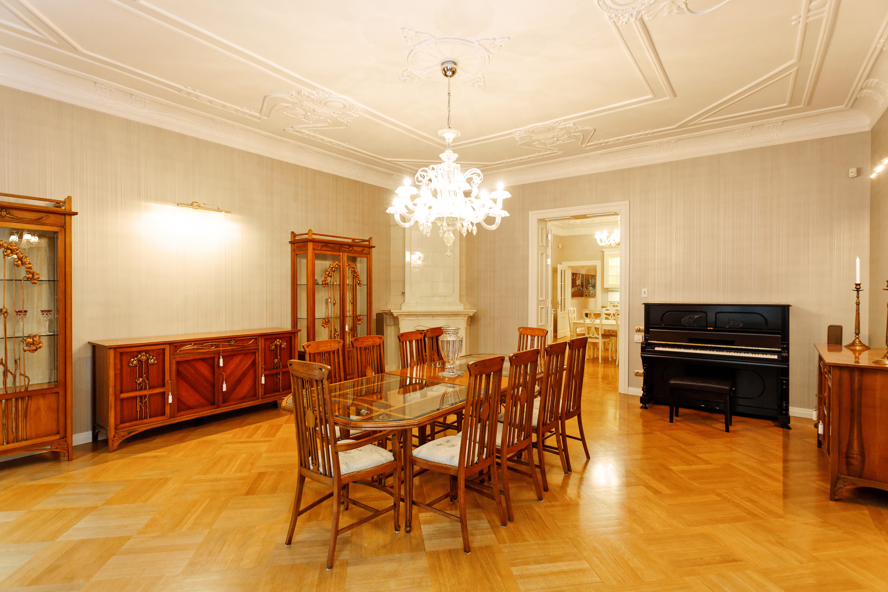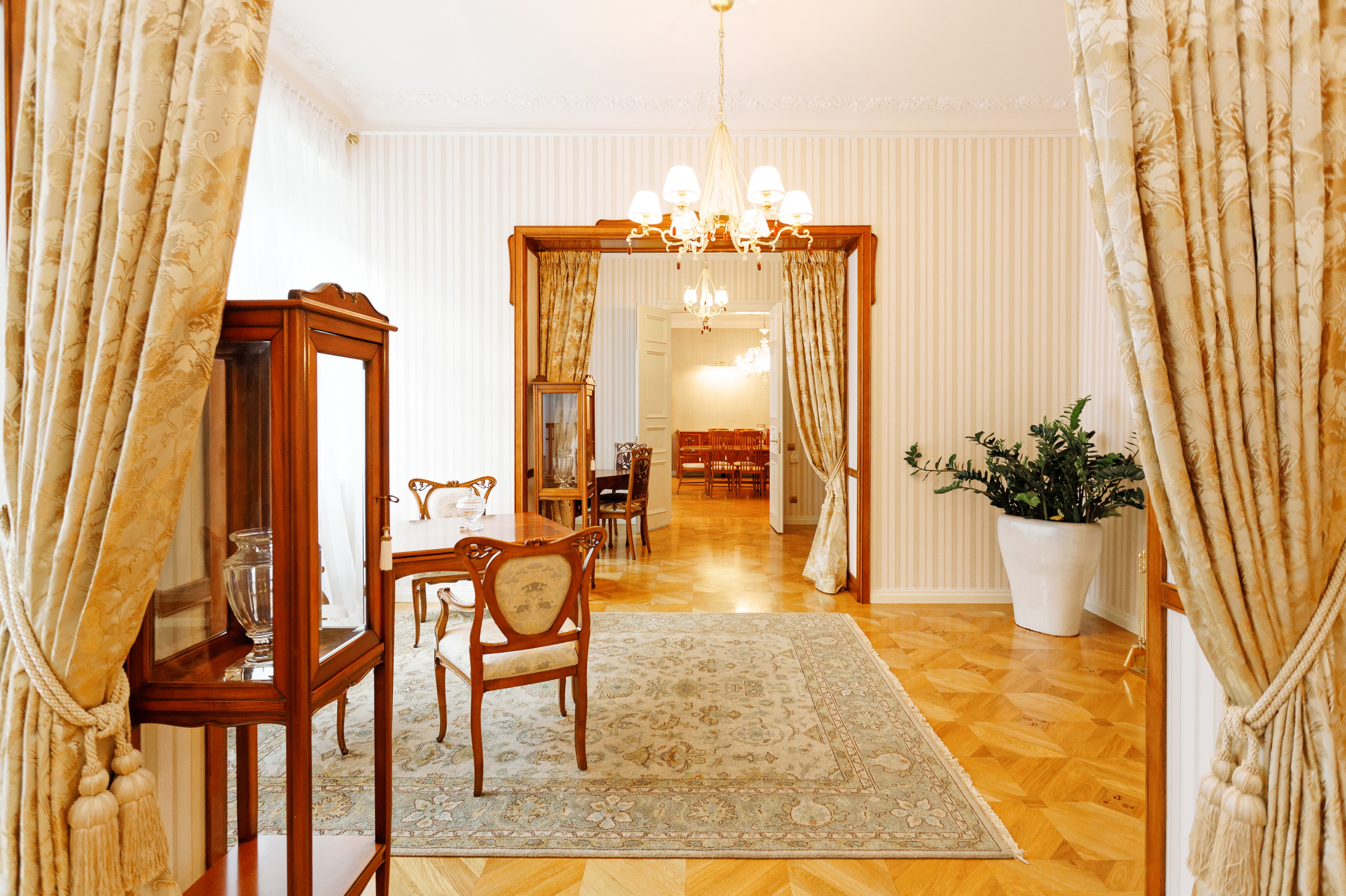 We offer to purchase a spacious and fully furnished apartment at Alberta Street in the house of a famous architect Michael Eisenstein, the house is completely renovated, special attention was paid to restoring the original interior elements. Apartment is located on third floor; the elevator is available. Apartment has spacious representative premises – a large living room, a dining room, a saloon, also a kitchen area, five bedrooms, four bathrooms, two additional guest WC and utility premises. This is an truly unique offer in the sophisticated house!