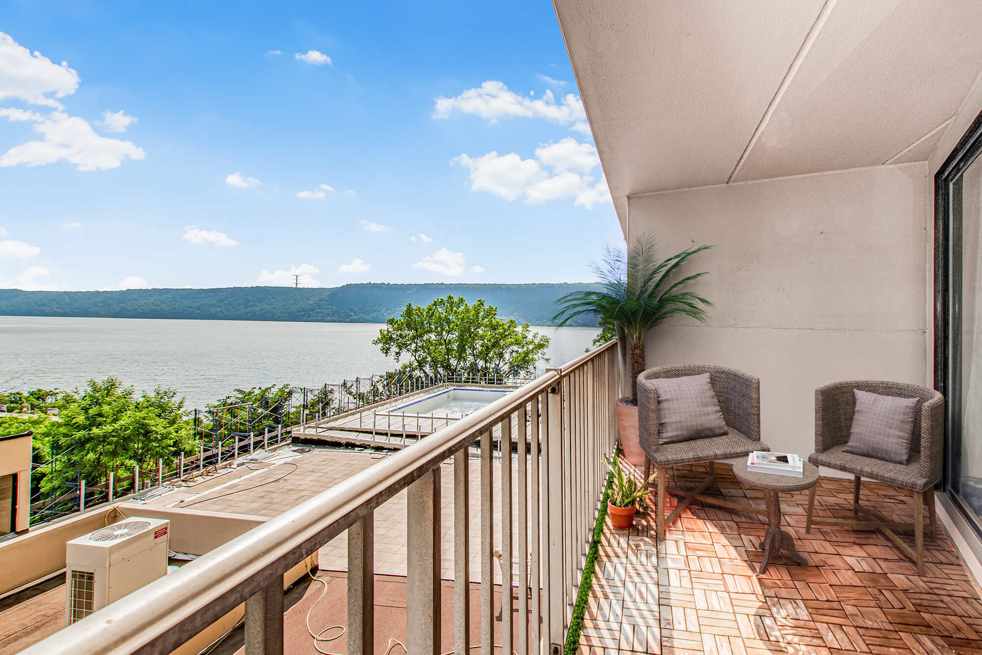 Sunlit waterfront studio rental with a private balcony showcasing Hudson River views, the NYC skyline, and the iconic George Washington Bridge. Enjoy beautiful natural light and sweeping views right from your own outdoor space.
