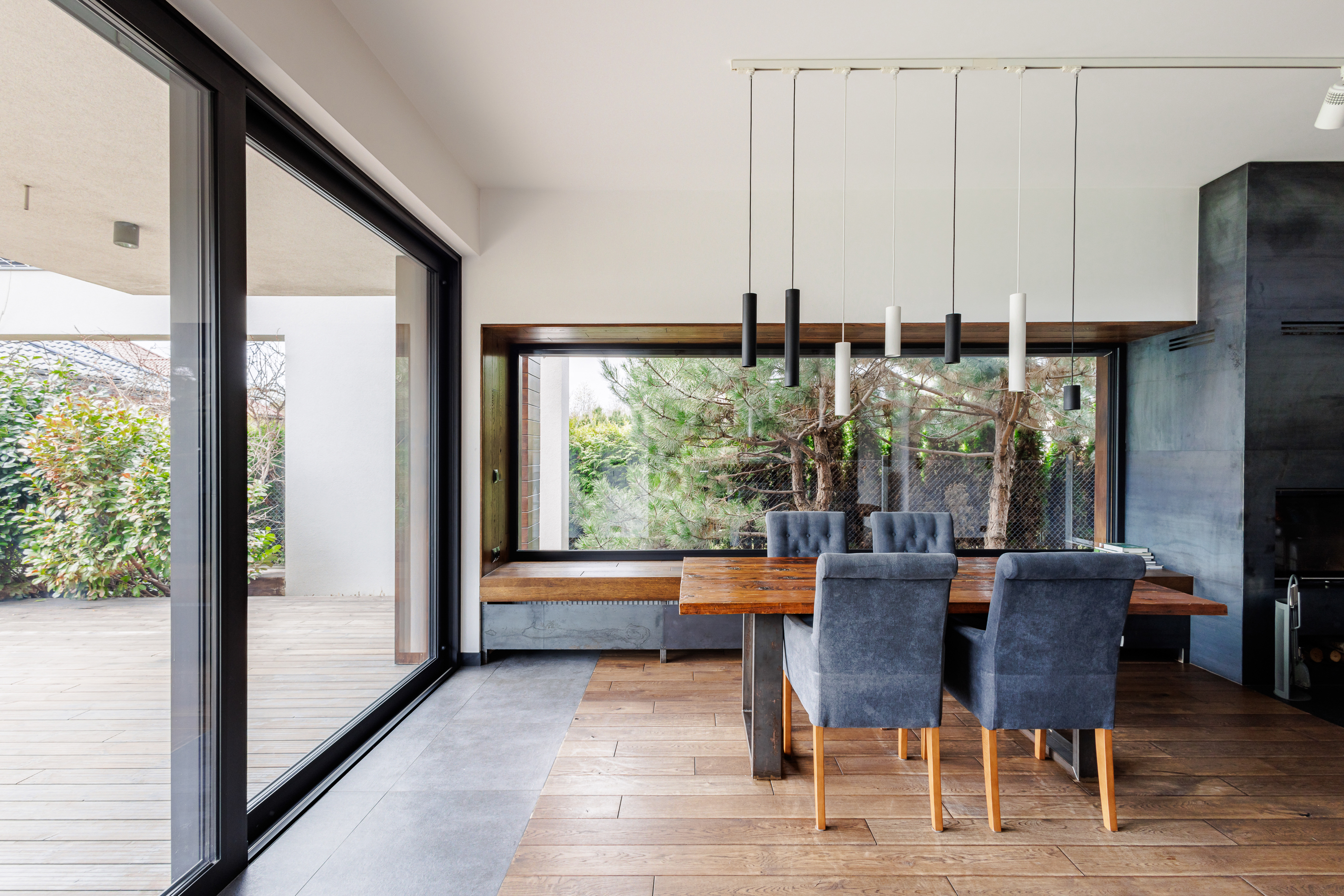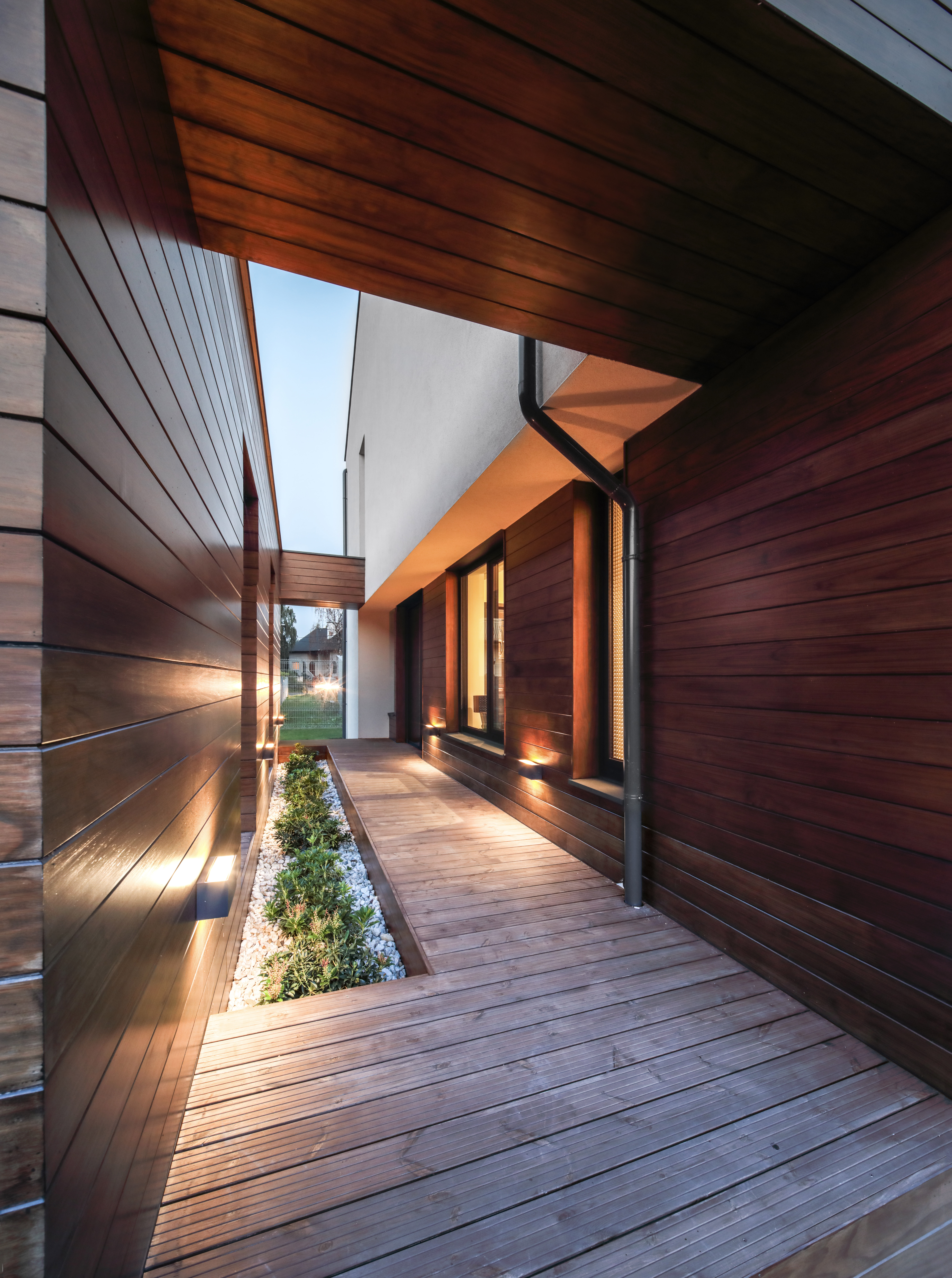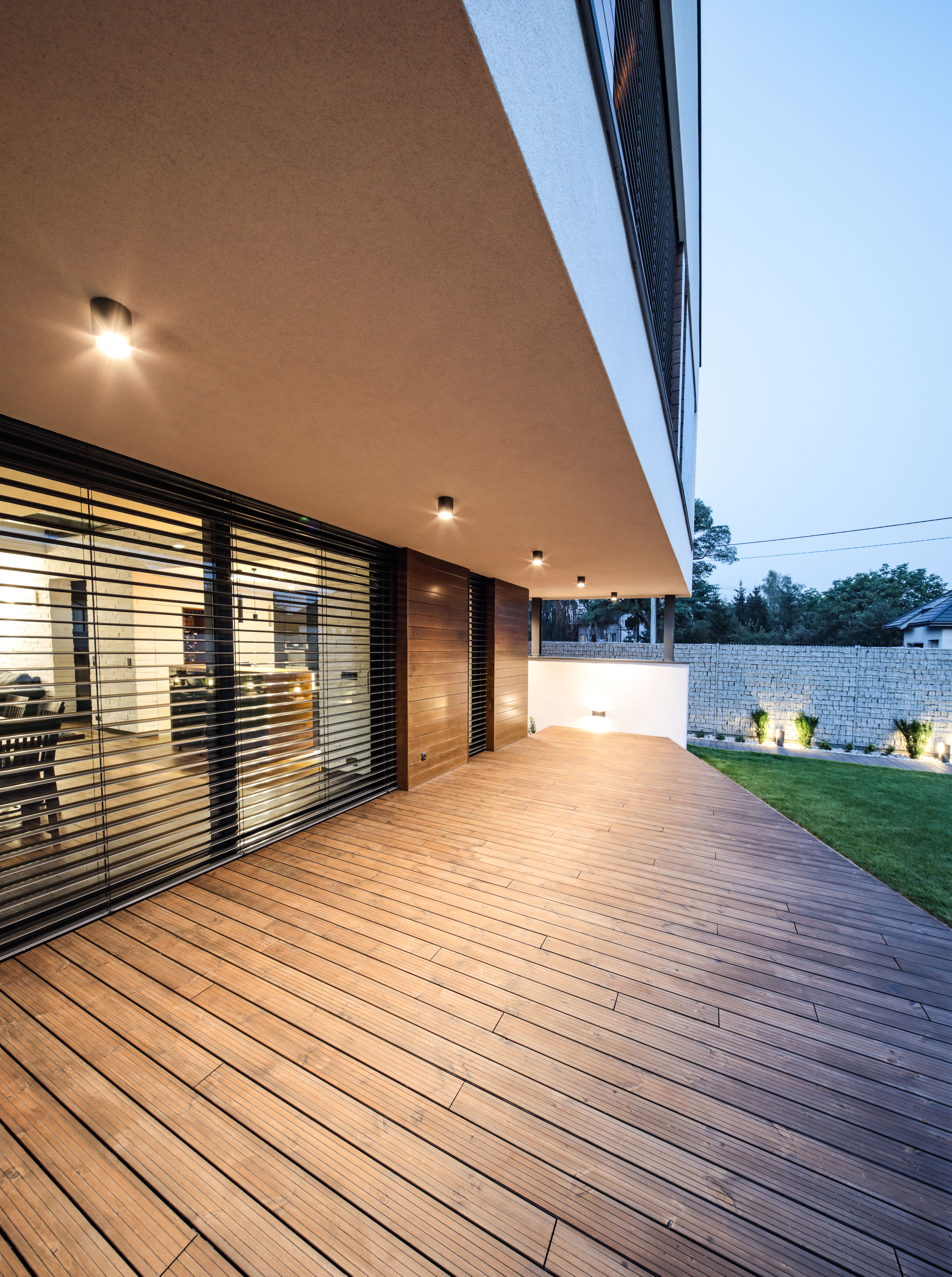 • Extensive glazing combined with roller shutters and protective walls – allows light without sacrificing privacy.