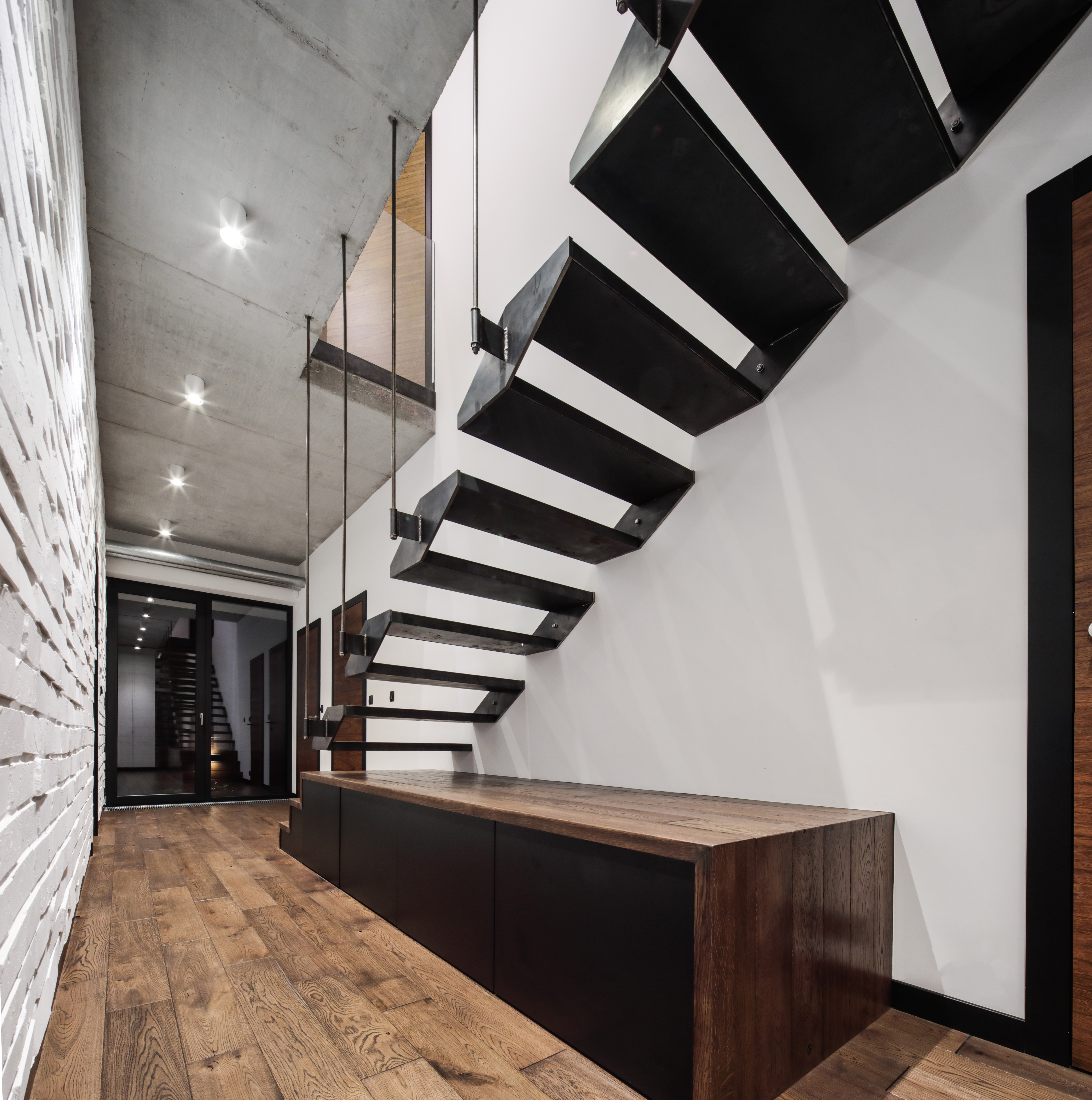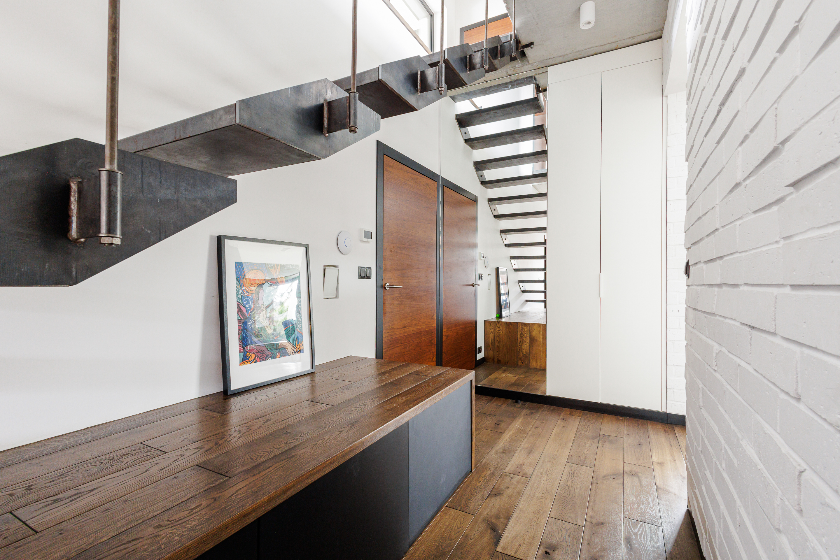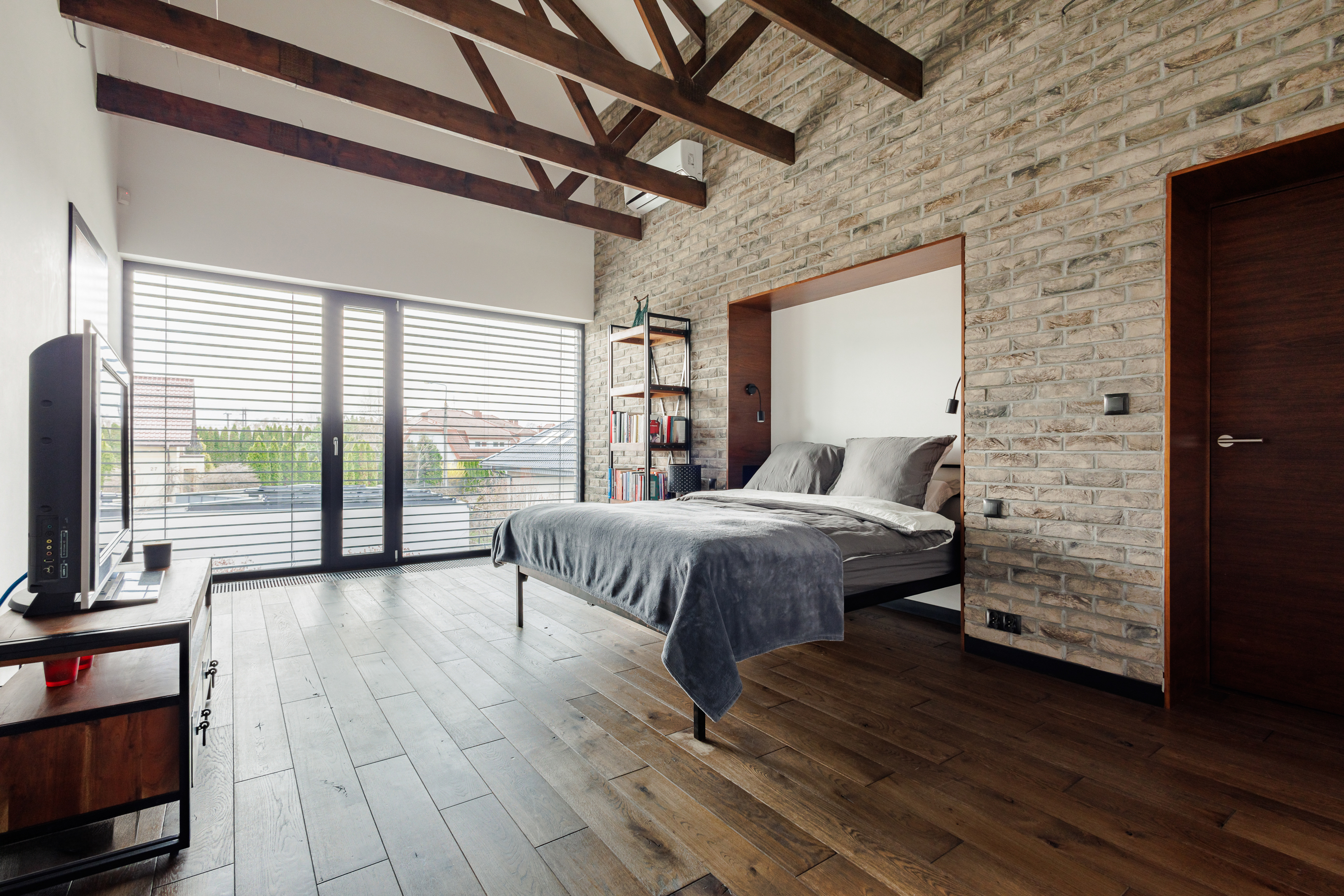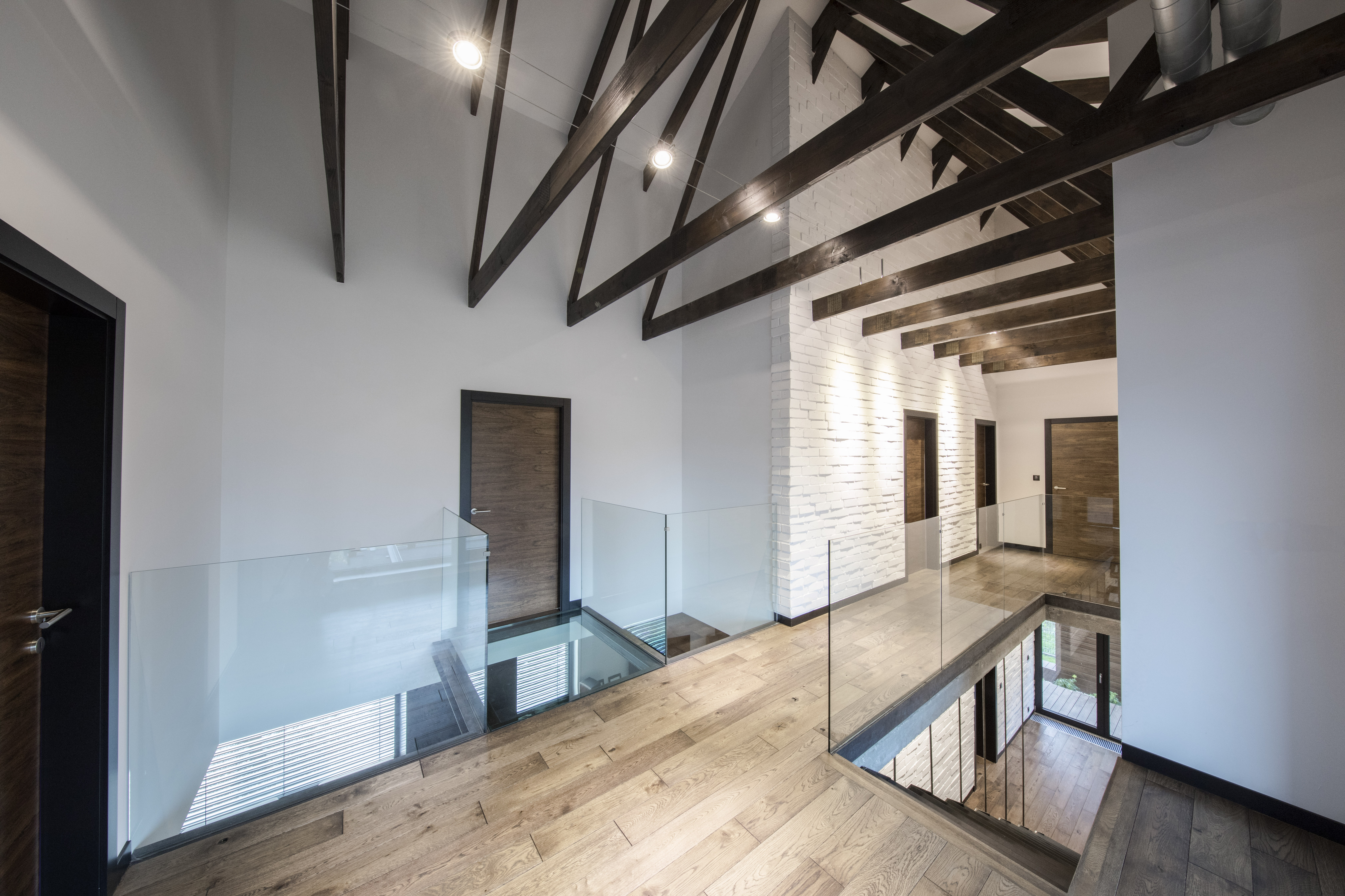 • Premium interiors – a glass bridge, steel elements, exposed roof trusses, white brick, and dark wood.
