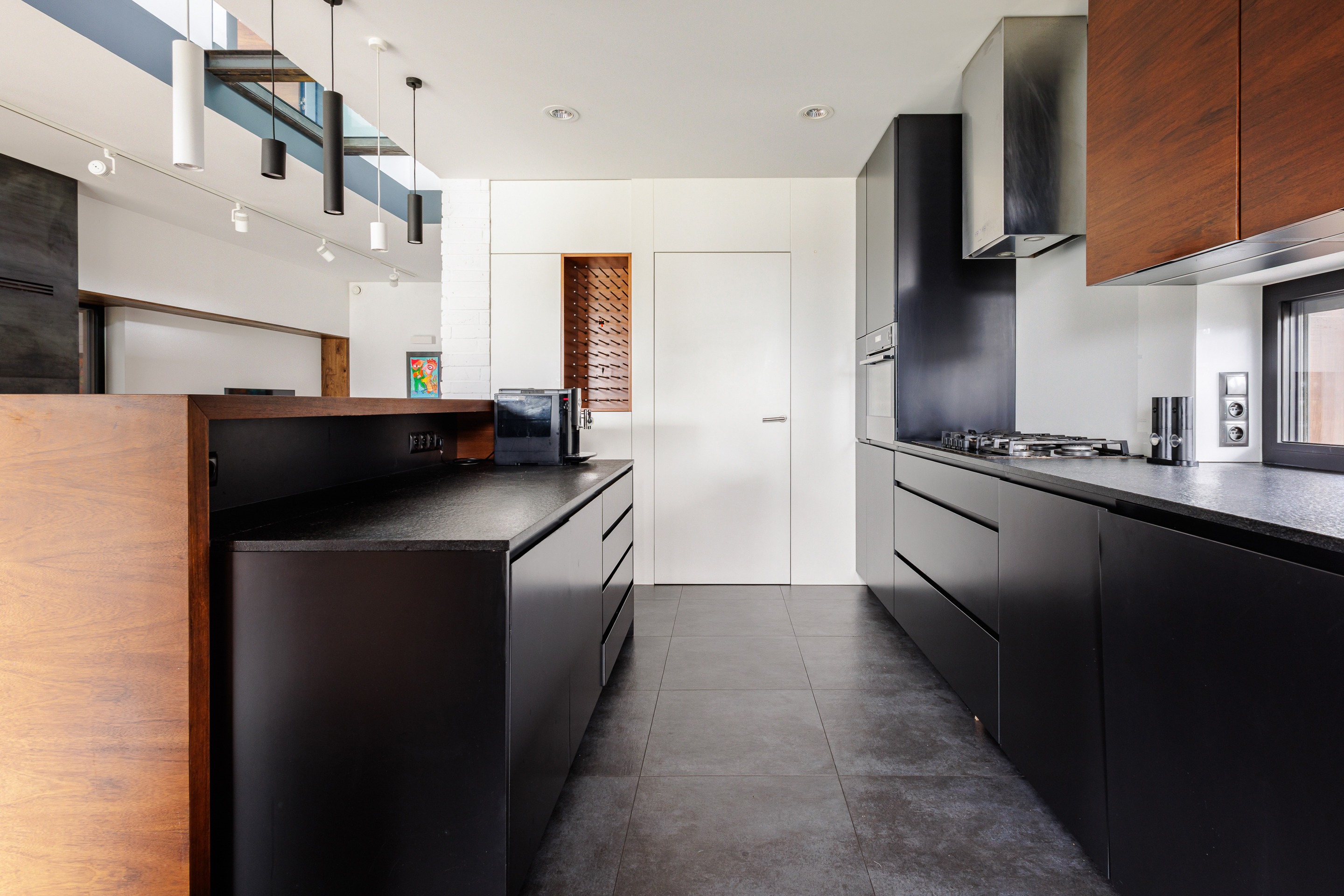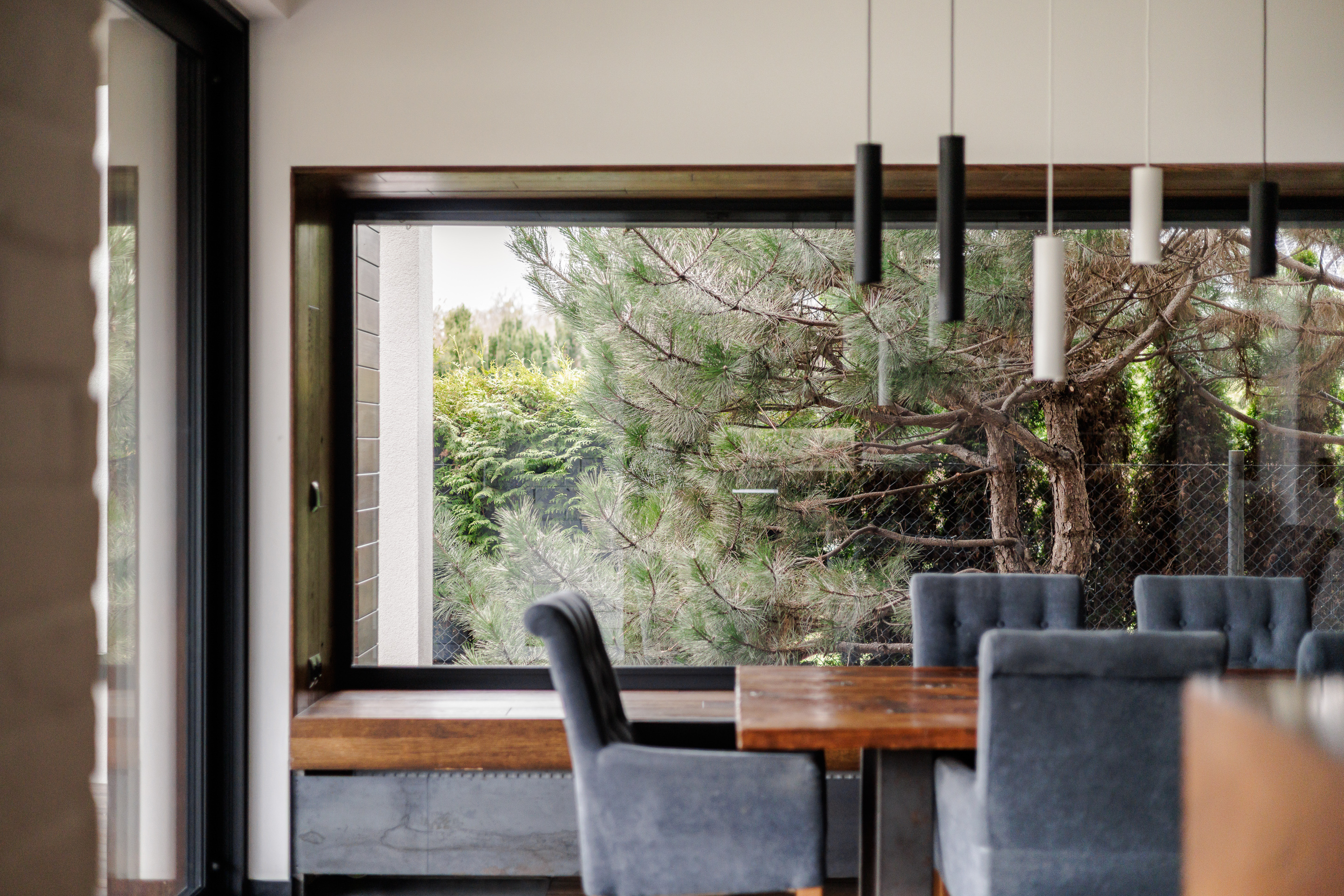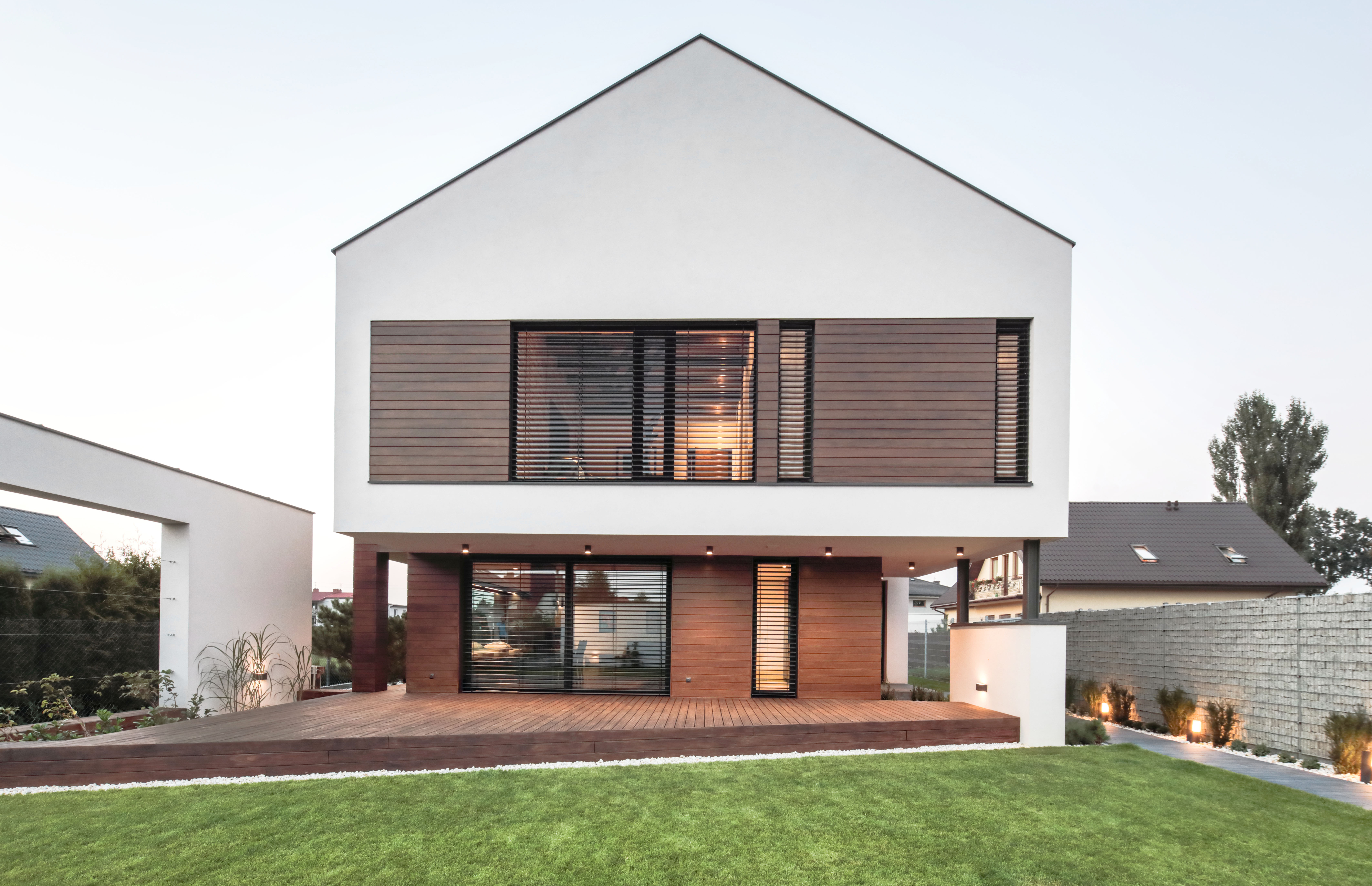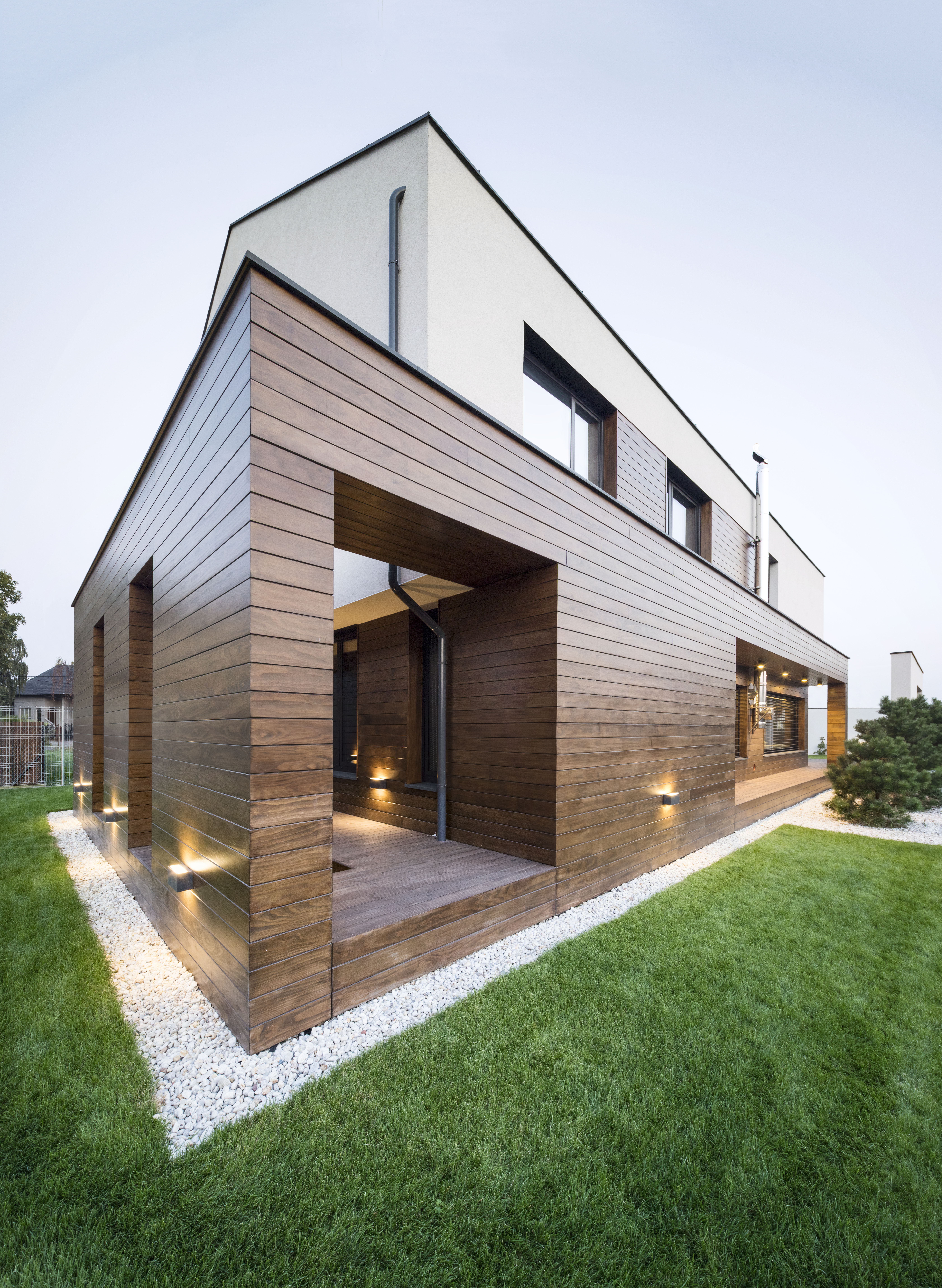 This single-family home, designed by Beczak/Beczak Architekci, is topped with a classic, gable roof covered with flat ceramic tiles. The traditional form is broken up by the use of interesting contrasts. Smooth white plaster is combined with grooved, dark wood siding. The overall look is complemented by anthracite window frames and an anthracite roof. The interiors also feature a contrasting design, combining dark wood with white brick. Another important feature is the exposed roof truss, which makes the interior feel significantly more spacious.