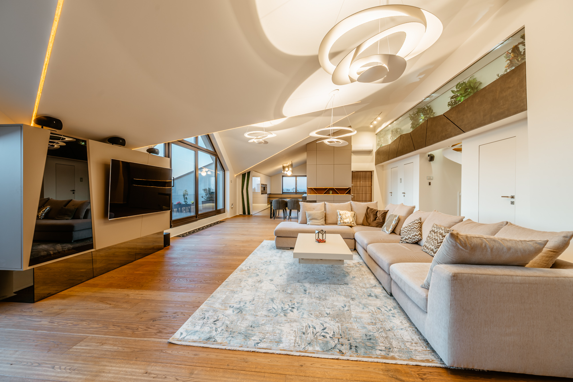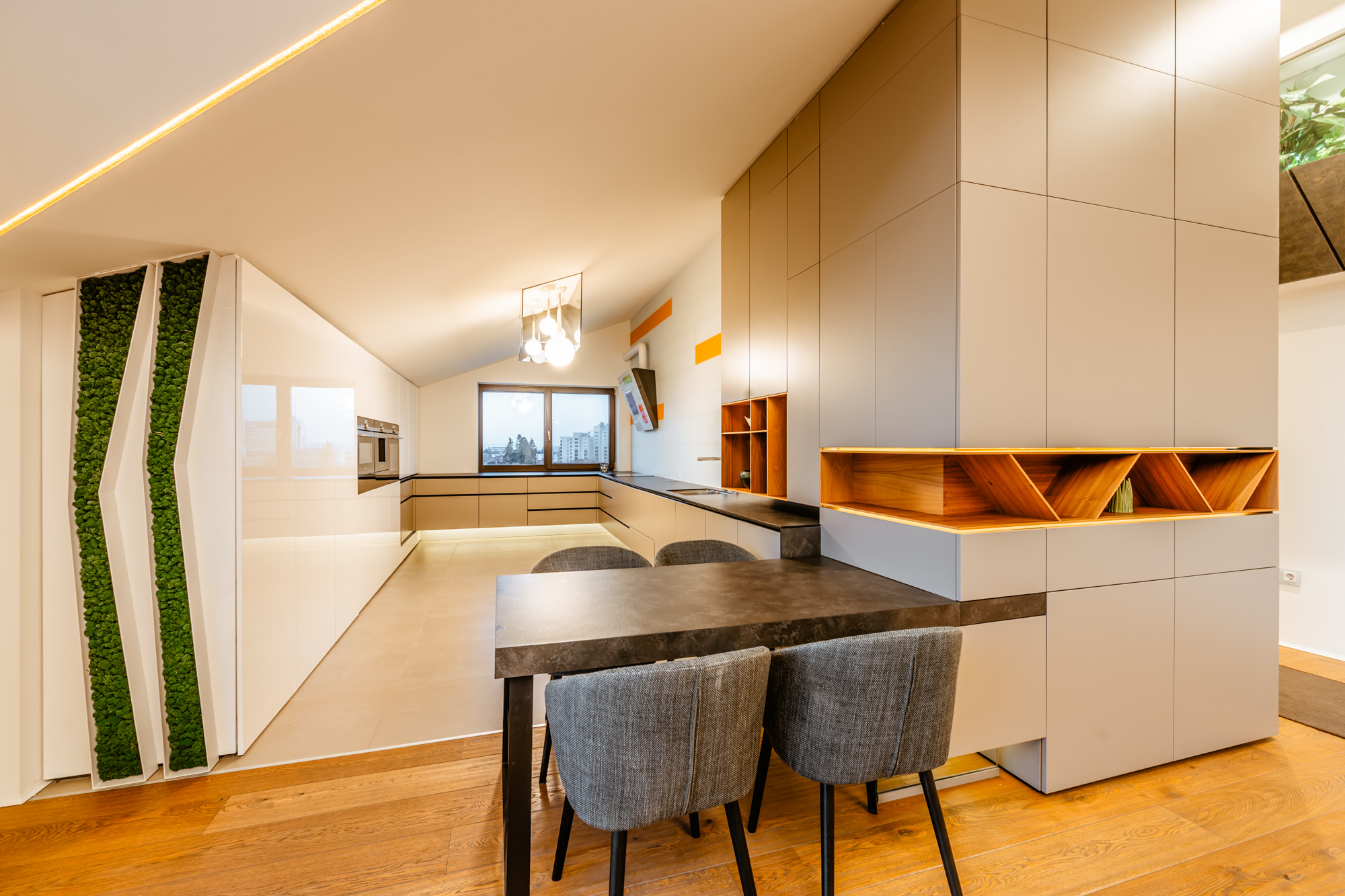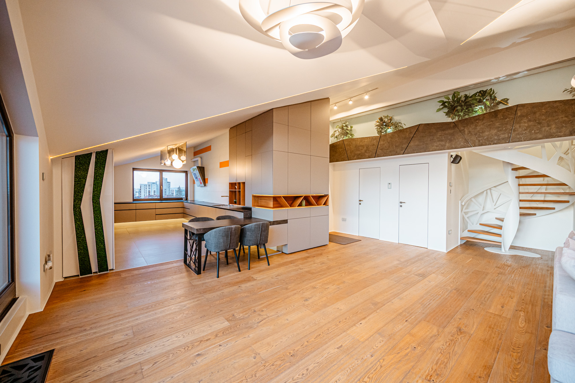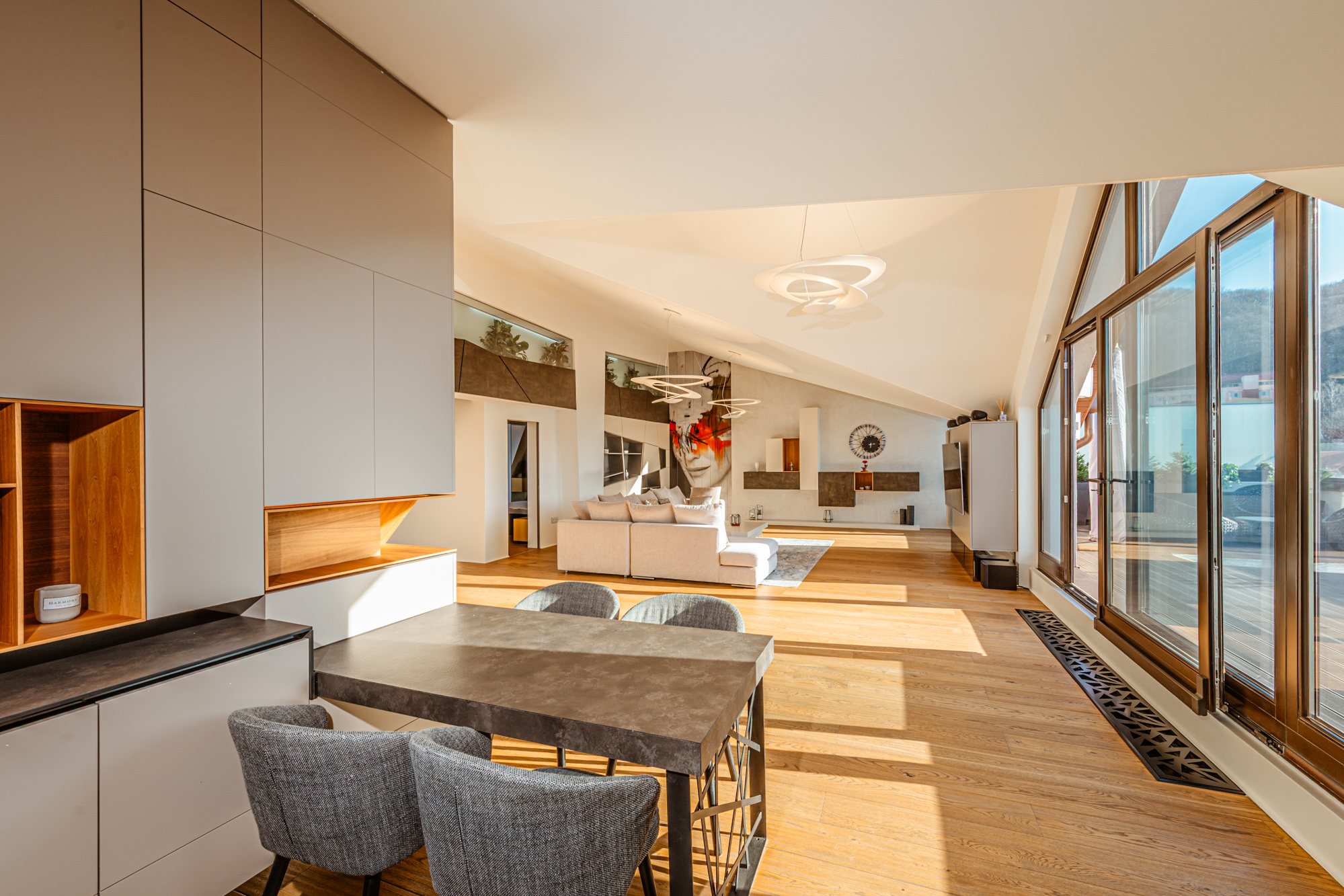 The living area is anchored by a spectacular, generously proportioned lounge, defined by impressive ceiling heights, dynamic volumes, and expansive glazing that draws the city indoors while framing panoramic views over Brașov. Natural light shapes every corner of the space, highlighting warm materials and the bold, contemporary lines of the ceiling design. The kitchen, fully integrated and minimalist, is designed for both functionality and aesthetics, flowing naturally into the dining and social areas while reinforcing the modern character of the entire residence.