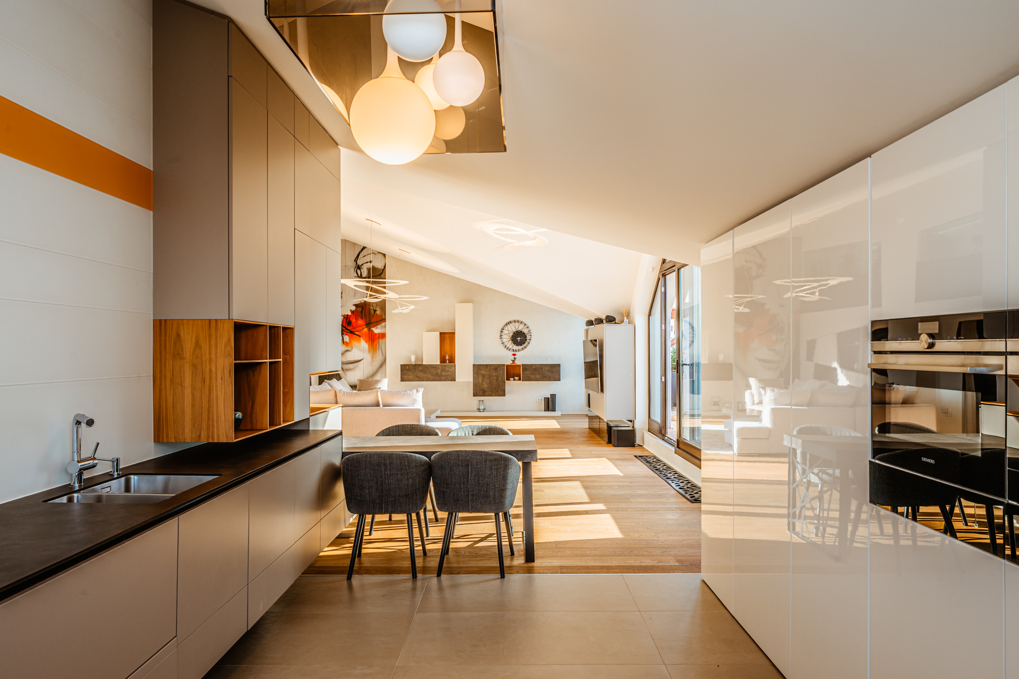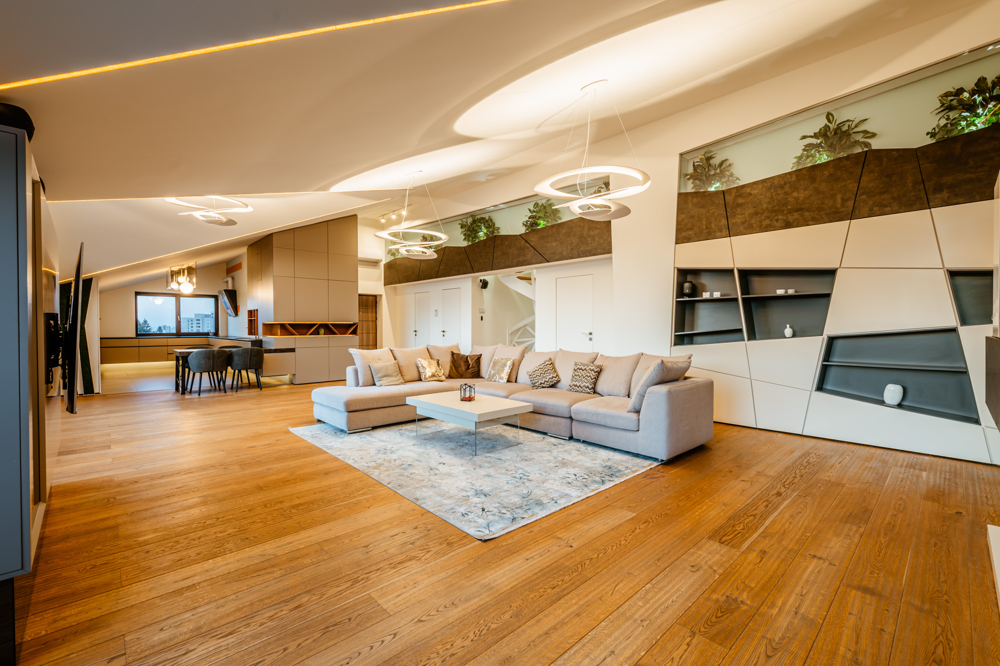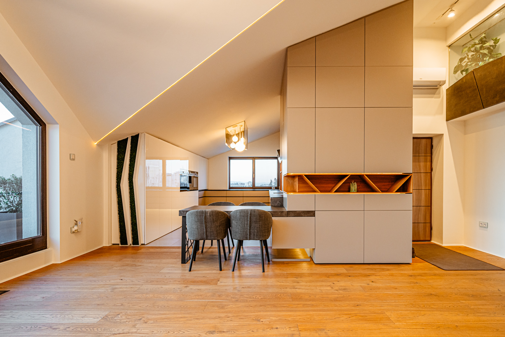 The living area is anchored by a spectacular, generously proportioned lounge, defined by impressive ceiling heights, dynamic volumes, and expansive glazing that draws the city indoors while framing panoramic views over Brașov. Natural light shapes every corner of the space, highlighting warm materials and the bold, contemporary lines of the ceiling design. The kitchen, fully integrated and minimalist, is designed for both functionality and aesthetics, flowing naturally into the dining and social areas while reinforcing the modern character of the entire residence.