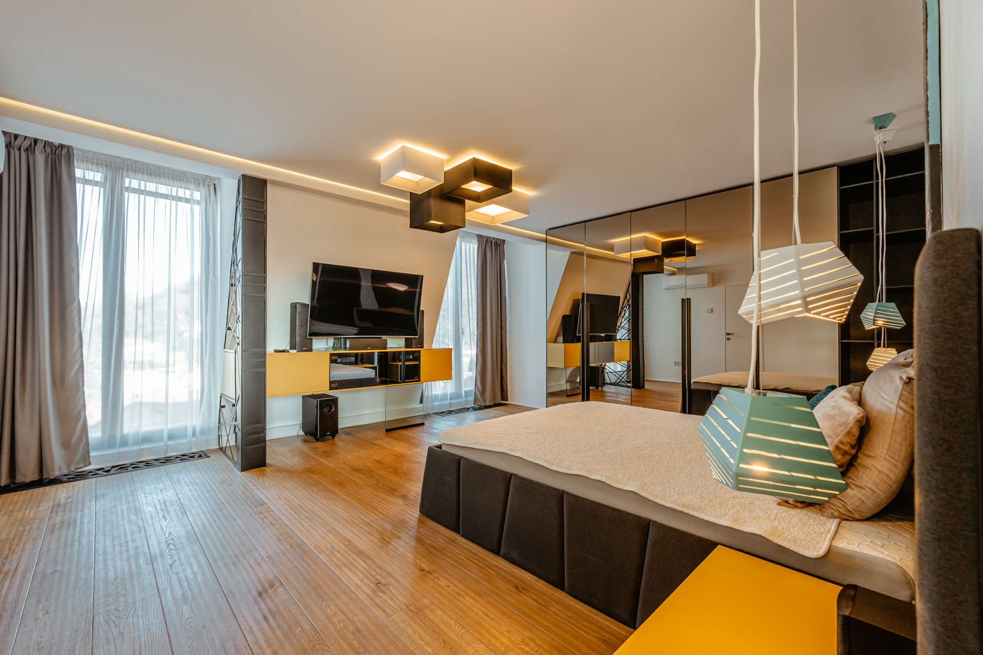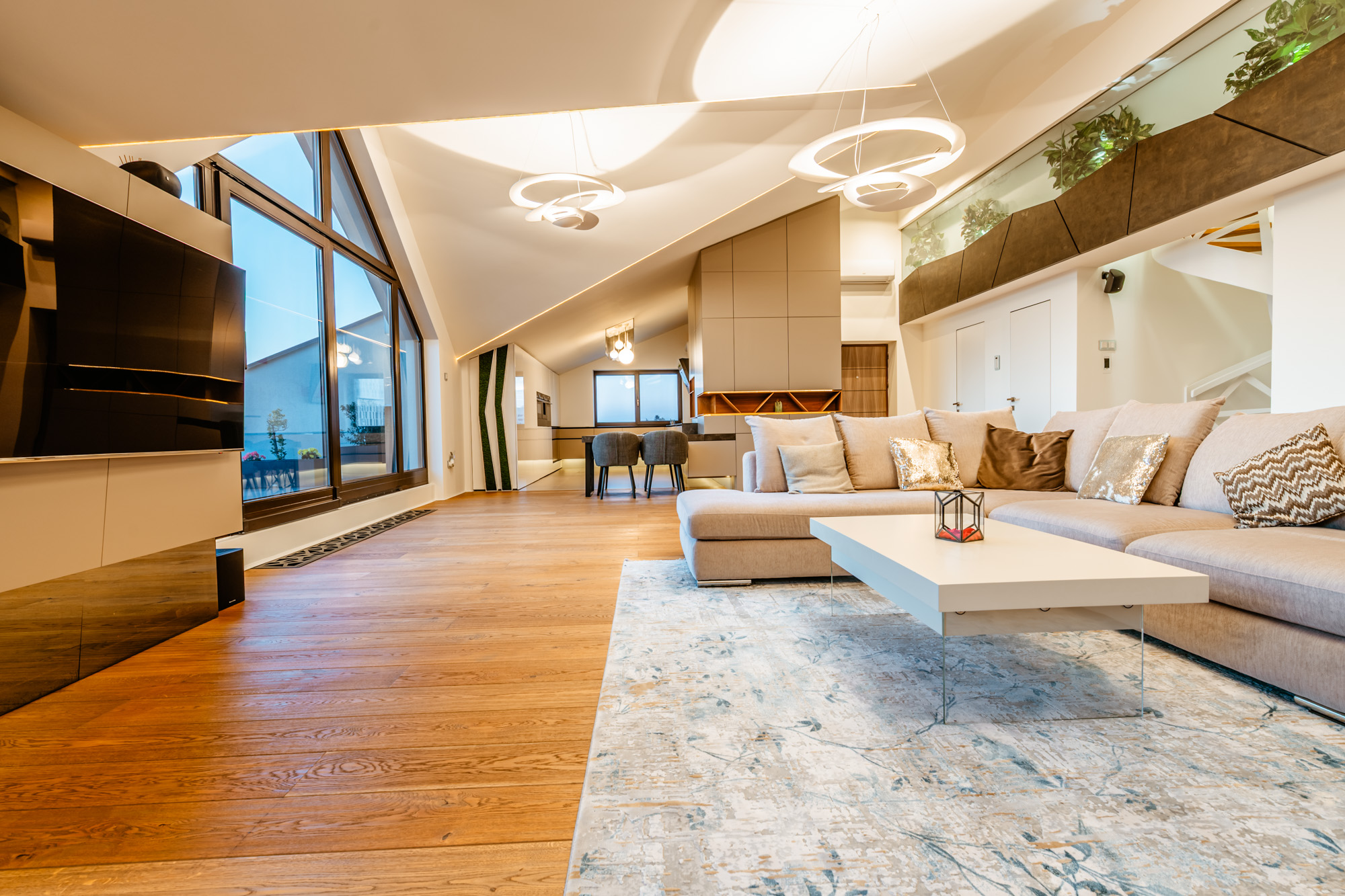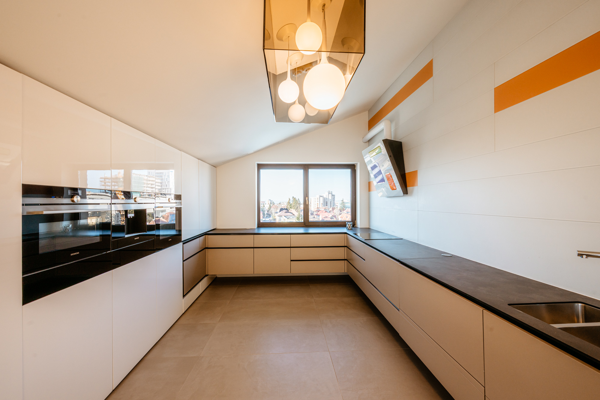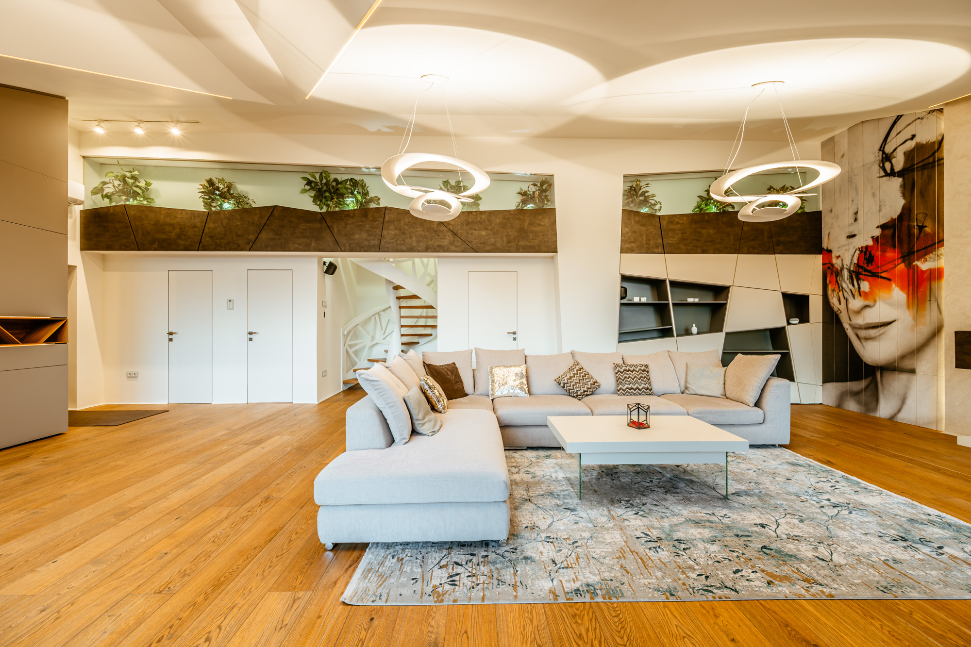 The living area is anchored by a spectacular, generously proportioned lounge, defined by impressive ceiling heights, dynamic volumes, and expansive glazing that draws the city indoors while framing panoramic views over Brașov. Natural light shapes every corner of the space, highlighting warm materials and the bold, contemporary lines of the ceiling design. The kitchen, fully integrated and minimalist, is designed for both functionality and aesthetics, flowing naturally into the dining and social areas while reinforcing the modern character of the entire residence.