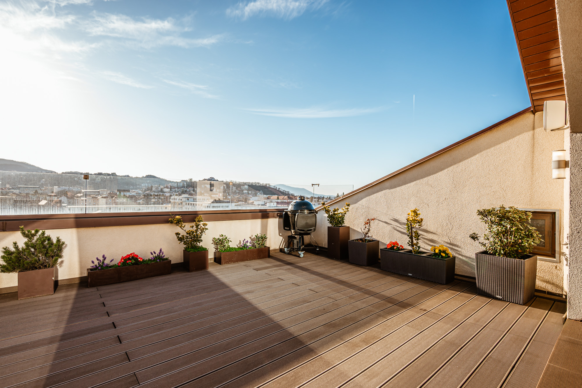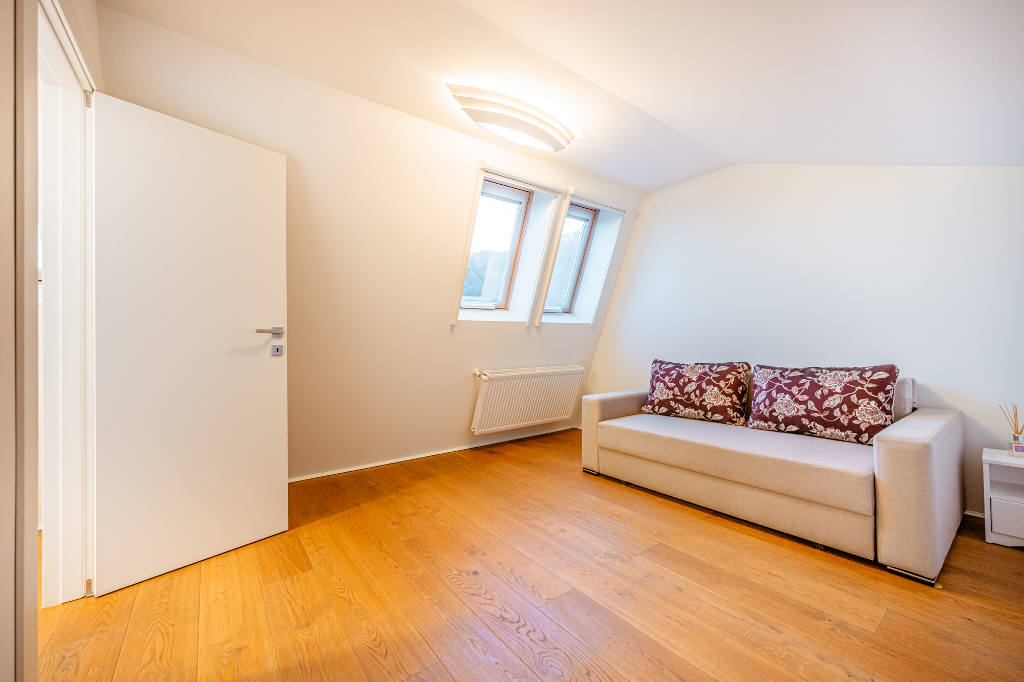 The expansive terrace becomes a natural extension of the interior—an exceptional setting for relaxation, entertaining, or memorable evenings, offering open views over the city and Mount Tâmpa, experienced in an almost tangible proximity. The upper level completes the property with a second bedroom and a bathroom, ideal for guests, children, or a more secluded workspace.