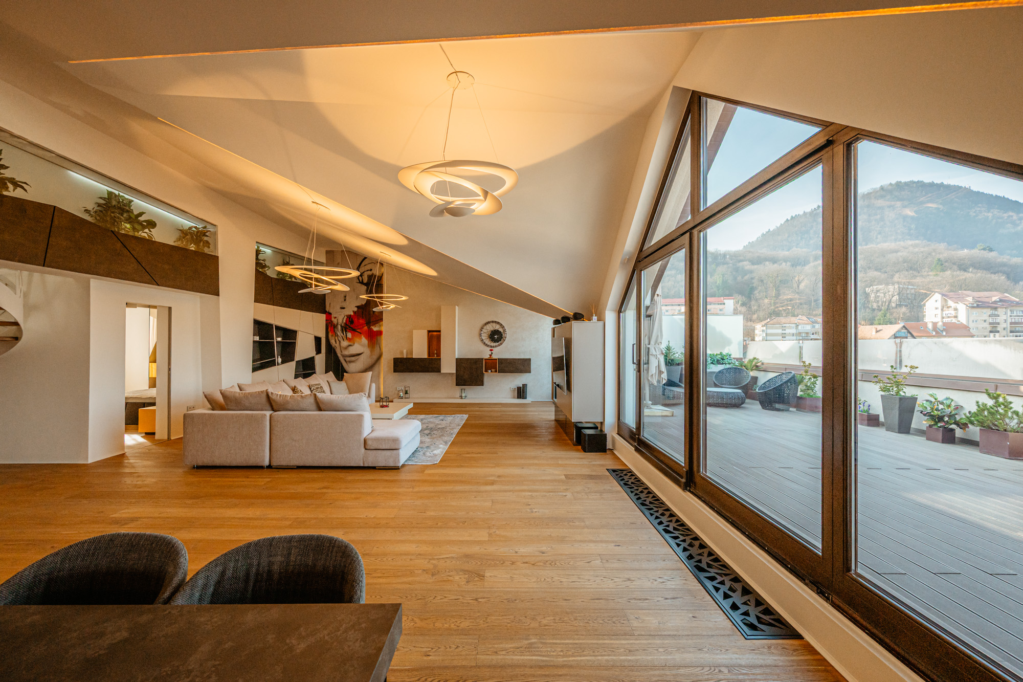 Positioned in a privileged setting at the foot of Mount Tâmpa, yet just minutes from the historic center, this remarkable penthouse in the heart of Brașov redefines the standards of premium urban living.