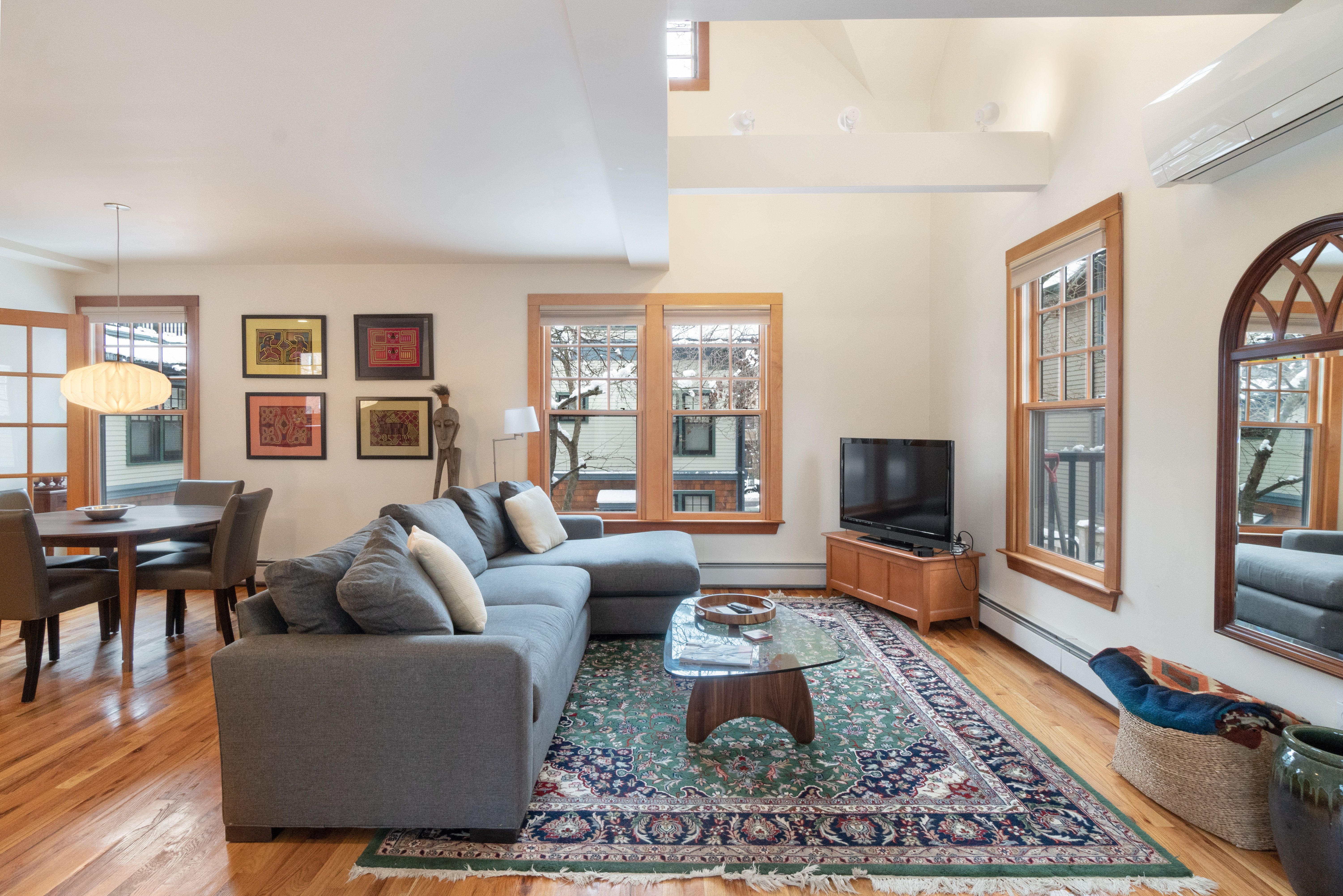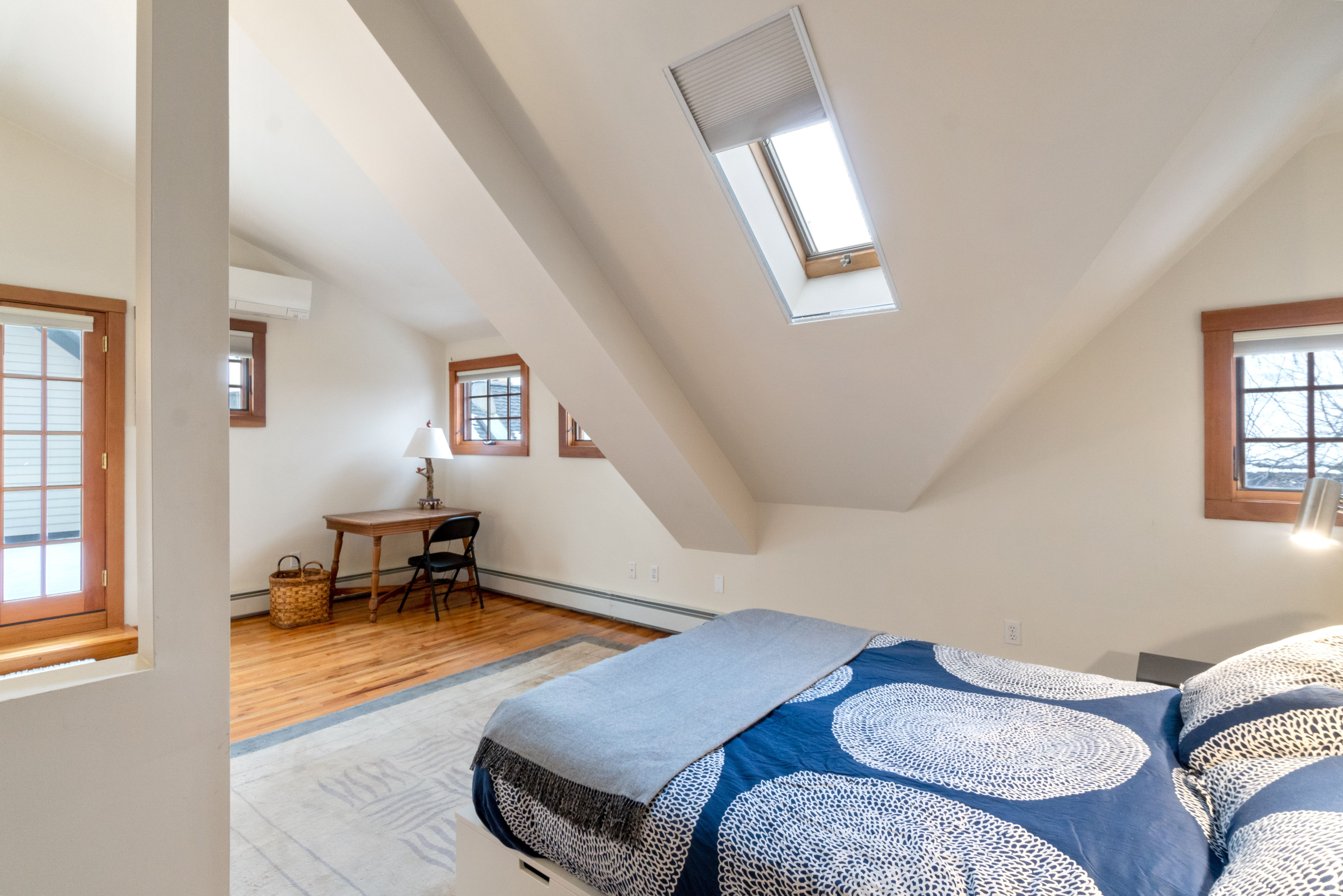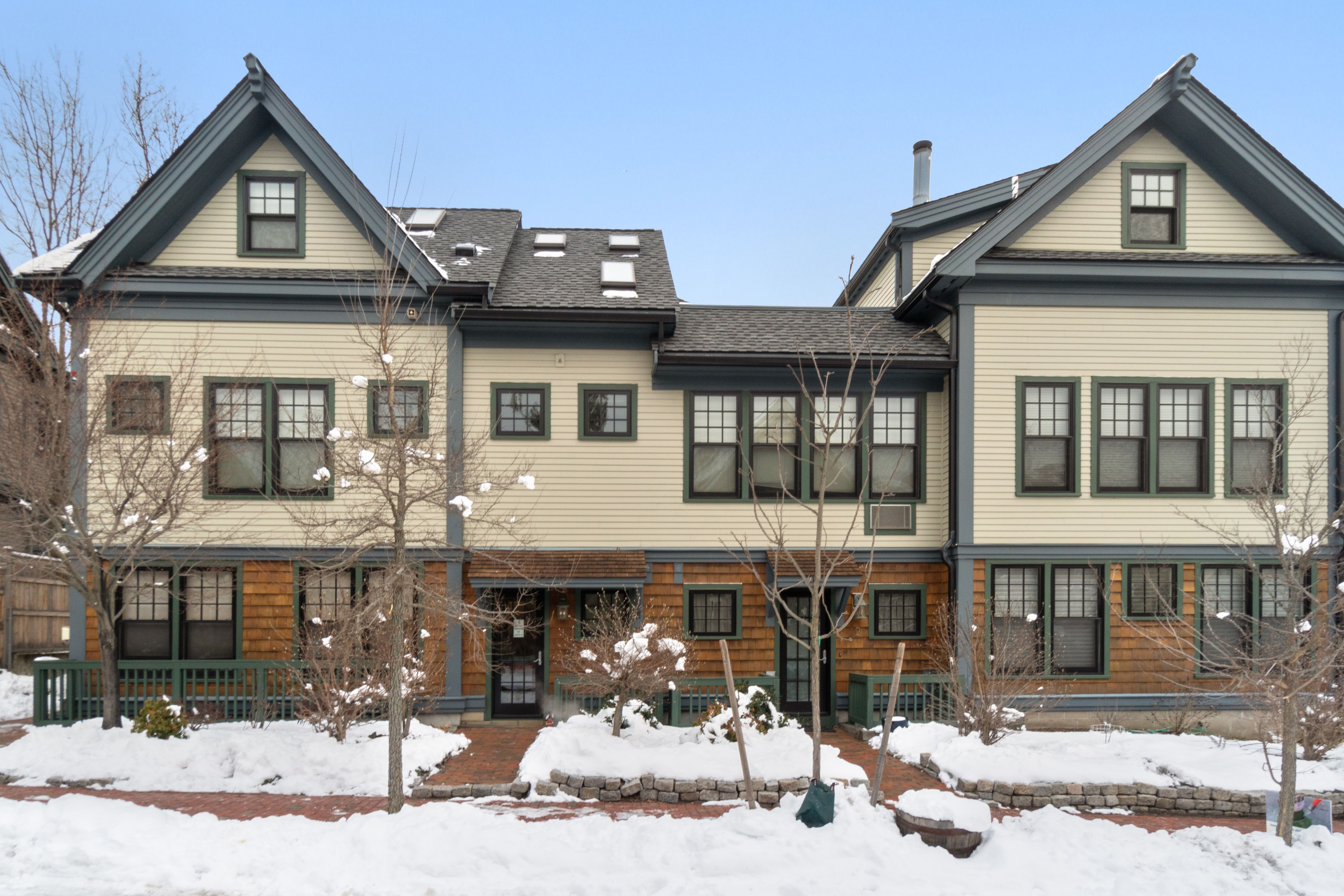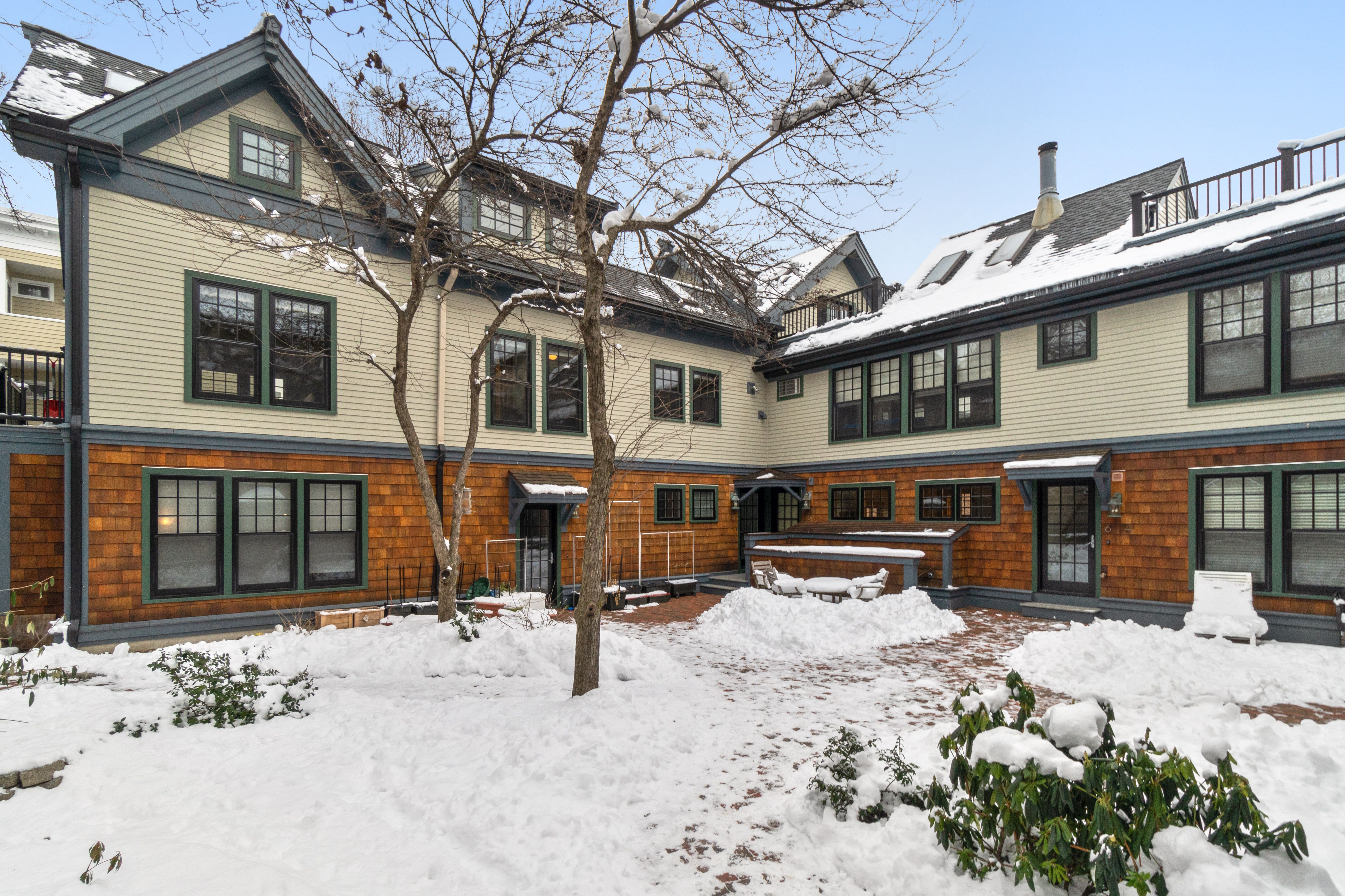 Hidden from plain sight. Set on a sleepy side street in Avon Hill, this handsome David Aposhian top-floor duplex is tucked away, surrounded by a leafy shared courtyard. Open and airy, it favors light, warmth, and quiet - filled with honey-toned hardwood, wood-trimmed windows, and cozy corners. The living room anchors it all: a wood-burning fireplace with green marble surround, soaring ceilings, and direct access to a private patio below. A renovated kitchen, bedroom and full bathroom, and a flex room with French doors - office, den, guest room - round out the main level. Upstairs, the primary suite is a genuine retreat: vaulted ceilings, skylights, a spacious walk-in closet, and a private roof deck all to itself. In-unit laundry, mini-splits and garage parking seal the deal. Blocks to Porter and Harvard Squares, with transit, shops, restaurants, and bookstores just outside your door.