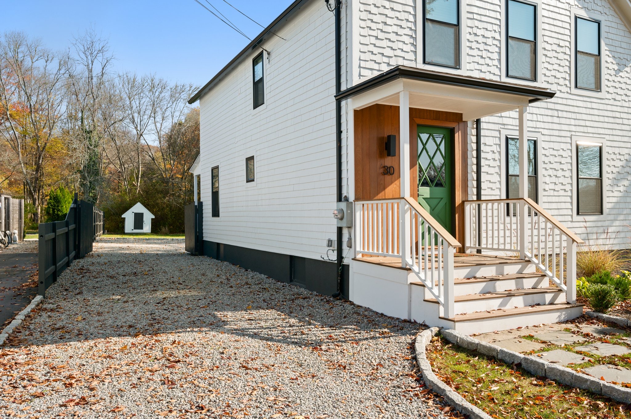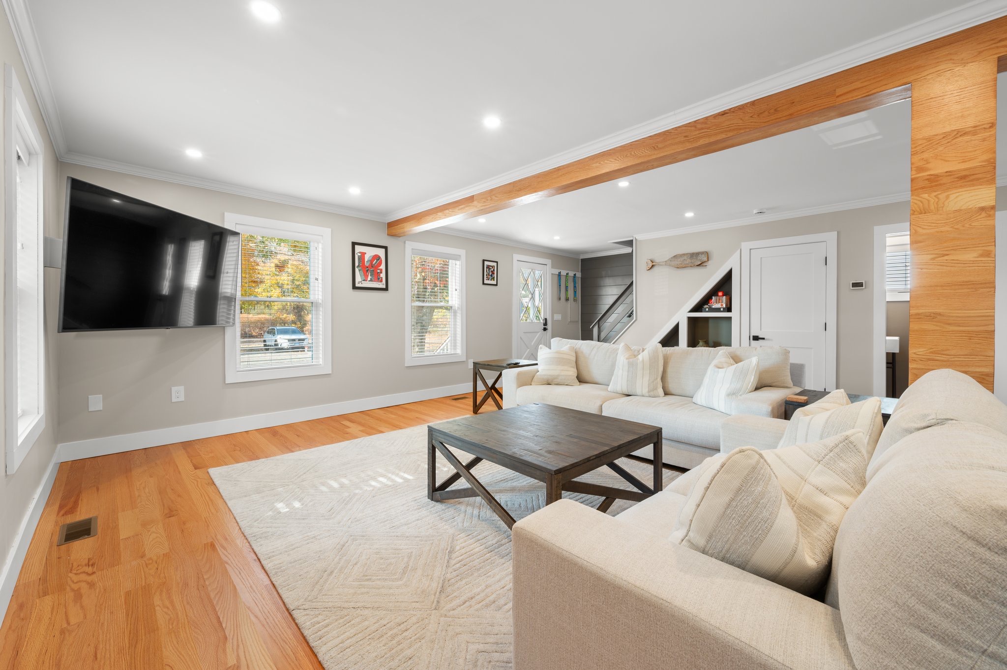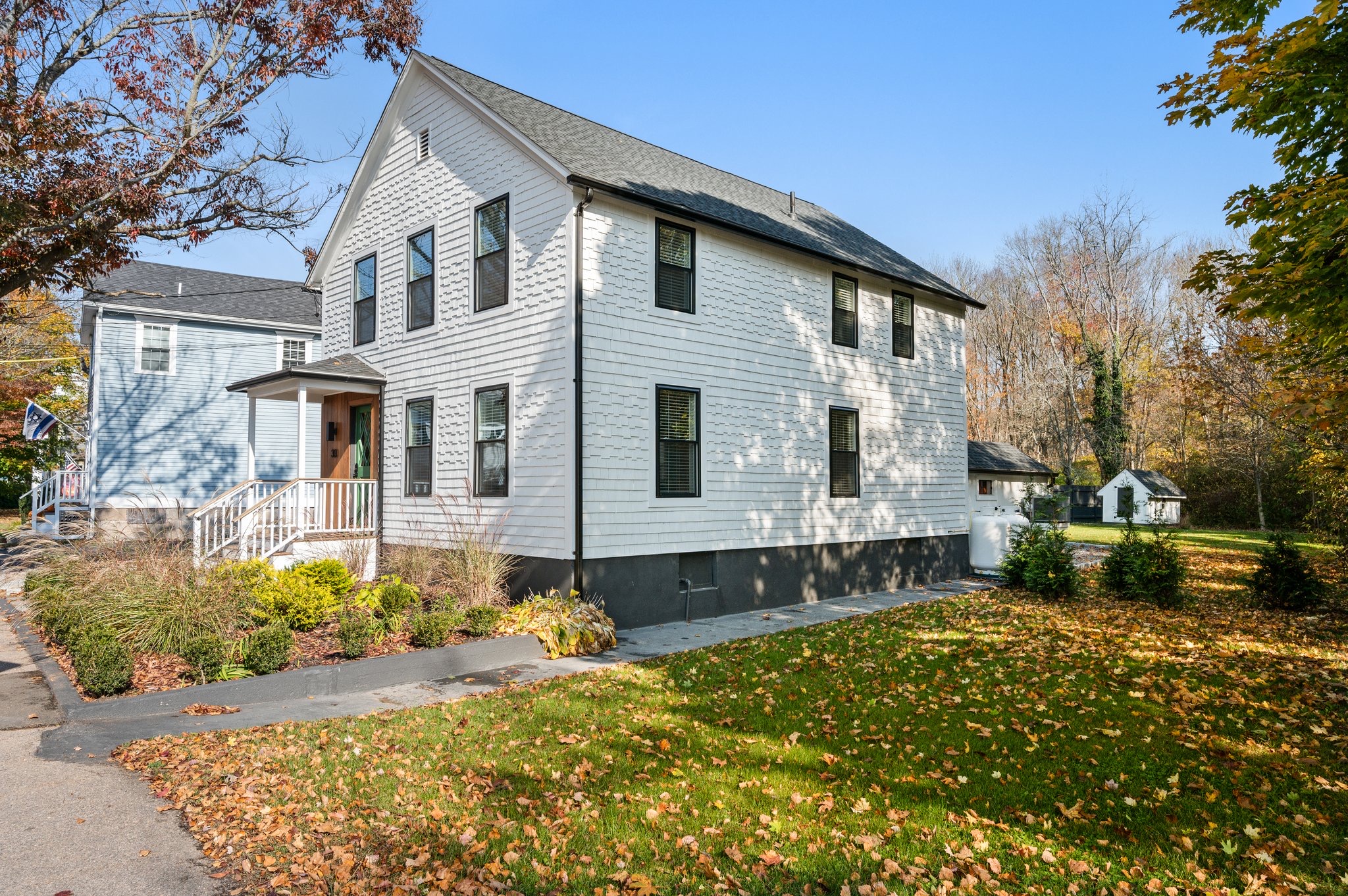 This beautifully renovated 3 bedroom, 1.5 bath home nestled in the charming community of Old Mystic has been thoughtfully updated throughout and offers a modern feel while preserving its timeless charm. Step inside to find gleaming hardwood floors throughout and a bright, inviting open layout. The large living space flows into the dining and kitchen area featuring elegant quartz countertops, tiled backsplash and white shaker cabinetry. Rear sliders lead to the private outdoor space complete with a fire pit area maximizing indoor outdoor living. On the second floor of the home you will find three bedrooms all with hardwood floors and wood wall accents. Built in laundry space and the large bathroom with custom tile floors and shower complete this upper level. New windows, roof, updated utilities and a forced hot air and central air system add to the ease of ownership. Whether you're looking for a home of your own or a short-term investment opportunity this property checks all the boxes being across the street from the water and right outside the Downtown Mystic area.