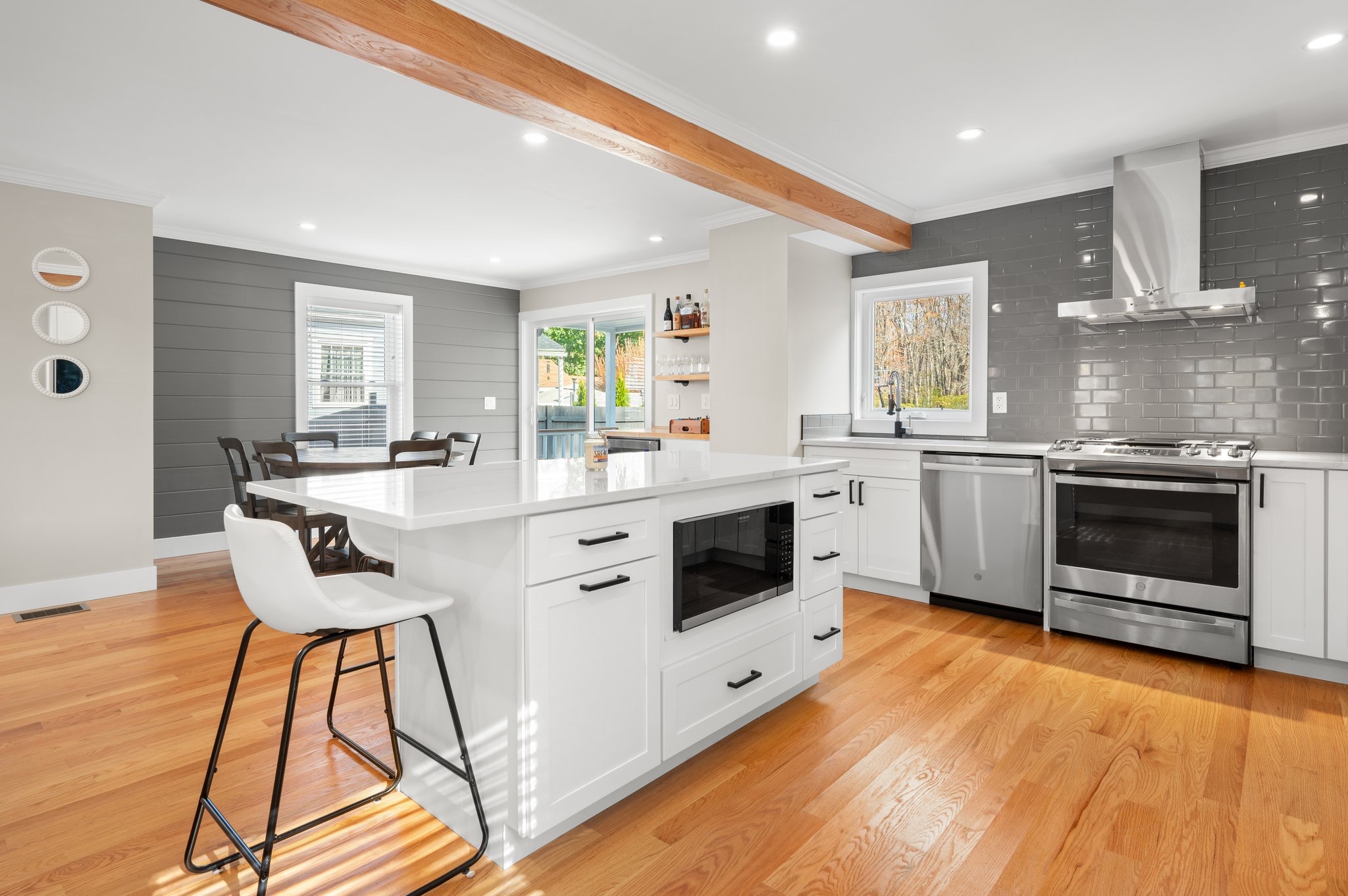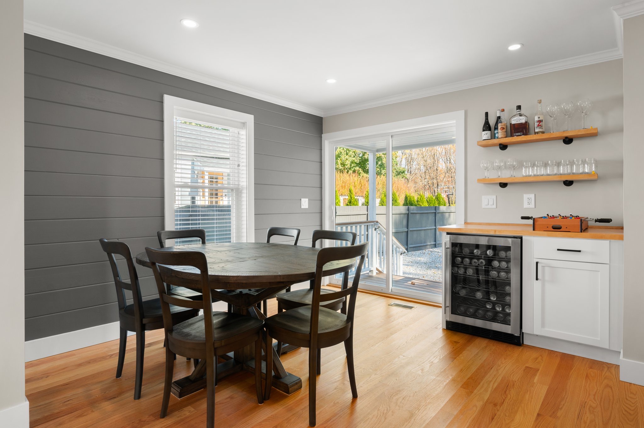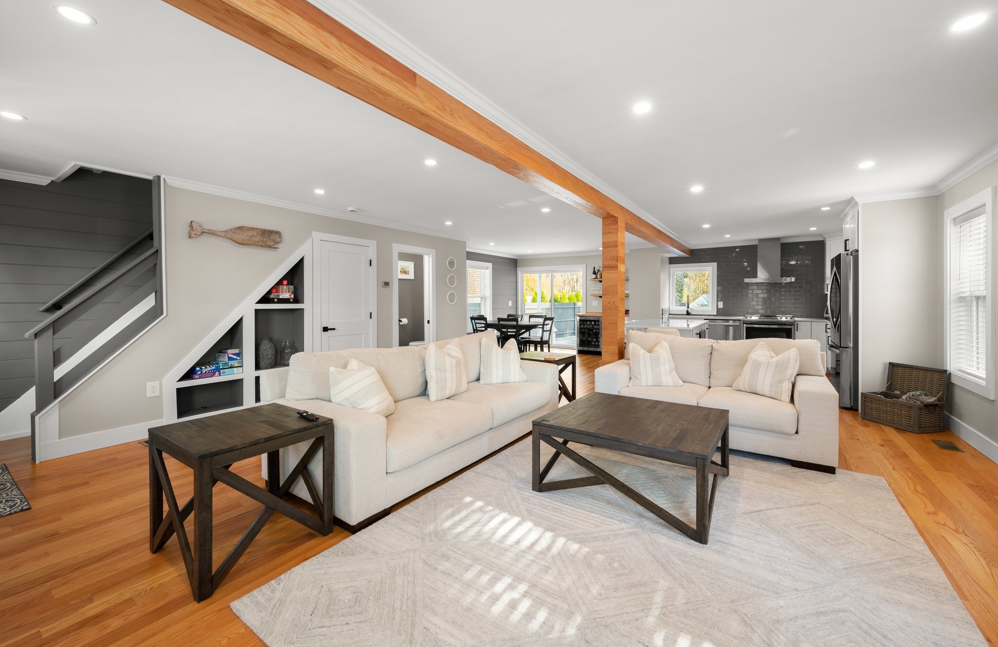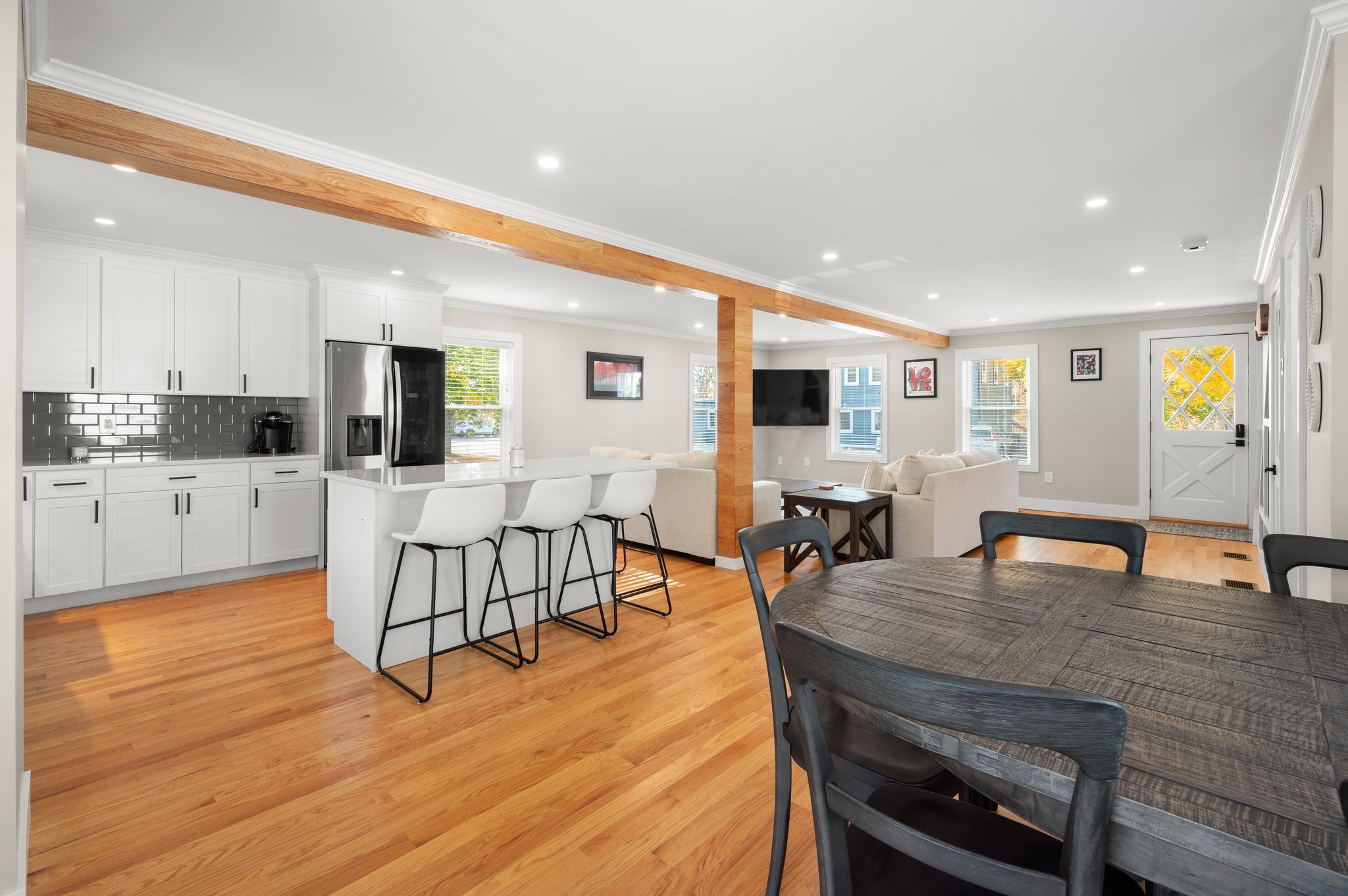 This beautifully renovated 3 bedroom, 1.5 bath home nestled in the charming community of Old Mystic has been thoughtfully updated throughout and offers a modern feel while preserving its timeless charm. Step inside to find gleaming hardwood floors throughout and a bright, inviting open layout. The large living space flows into the dining and kitchen area featuring elegant quartz countertops, tiled backsplash and white shaker cabinetry. Rear sliders lead to the private outdoor space complete with a fire pit area maximizing indoor outdoor living. On the second floor of the home you will find three bedrooms all with hardwood floors and wood wall accents. Built in laundry space and the large bathroom with custom tile floors and shower complete this upper level. New windows, roof, updated utilities and a forced hot air and central air system add to the ease of ownership. Whether you're looking for a home of your own or a short-term investment opportunity this property checks all the boxes being across the street from the water and right outside the Downtown Mystic area.