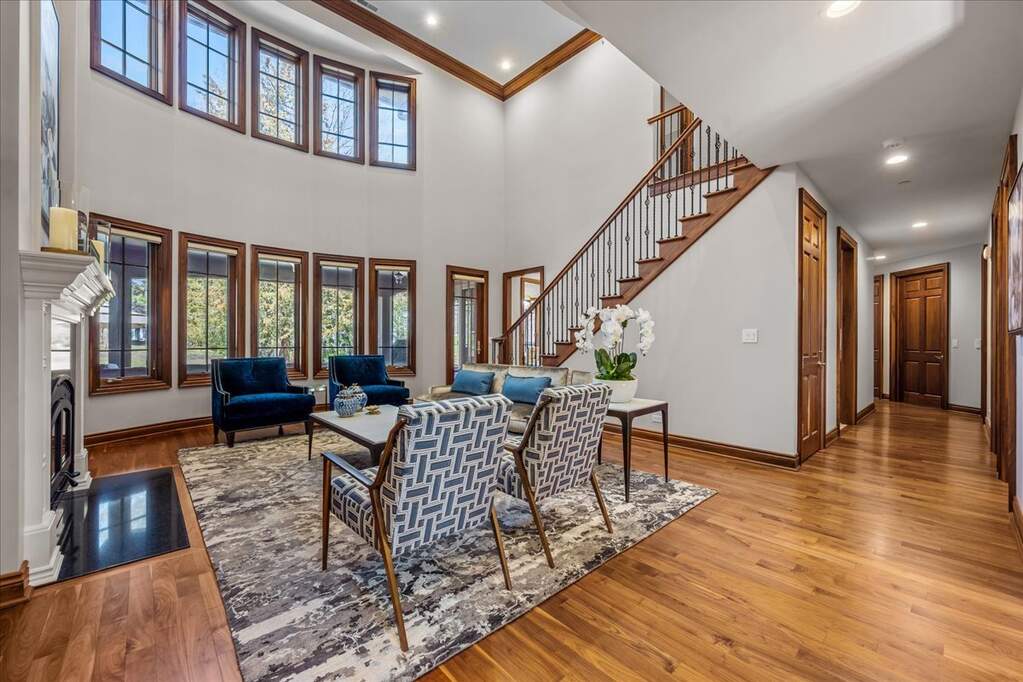 Stunning newer construction home in an unbeatable in-town location, just seconds from shops, dining, and everything you need. This beautifully designed residence features a sought-after first-floor primary suite complete with its own cozy fireplace. Exceptional curb appeal shines with a welcoming covered front porch finished in bluestone and limestone, leading into a dramatic two-story foyer. Inside, you'll find exquisite custom millwork, rich hardwood flooring, and abundant natural light from the home's ideal south-facing exposure. A private library/office offers the perfect space for working from home or relaxing with a book. The thoughtfully designed floor plan is ideal for both everyday living and entertaining, with a formal dining room that flows seamlessly into the inviting living room with fireplace, and a wet bar/butler's pantry for effortless hosting. The chef's kitchen is a true showstopper, featuring professional-grade appliances including a Wolf range/oven, oversized Sub-Zero refrigerator, stunning solid walnut cabinetry, and a spacious walk-in pantry. The adjoining breakfast area opens to a covered bluestone patio overlooking the beautifully landscaped yard with fire pit, play area, and plenty of room for outdoor entertaining. A convenient first-floor laundry room completes the main level. Upstairs, you'll find generously sized bedrooms, including one with an en-suite bath and ample closets. Two additional bedrooms are connected by a Jack-and-Jill bath, along with a recently finished bonus room accessed by a private staircase-ideal as a guest suite, in-law arrangement, or flex space. The finished lower level offers exceptional additional living space, including a large recreation area, exercise room or fifth bedroom, a full bath with steam shower, and a wine cellar. Additional highlights include radiant heat throughout the basement and garage, Marvin windows and an oversized three-car garage. Meticulously maintained and thoughtfully updated, this exceptional home truly has it all.