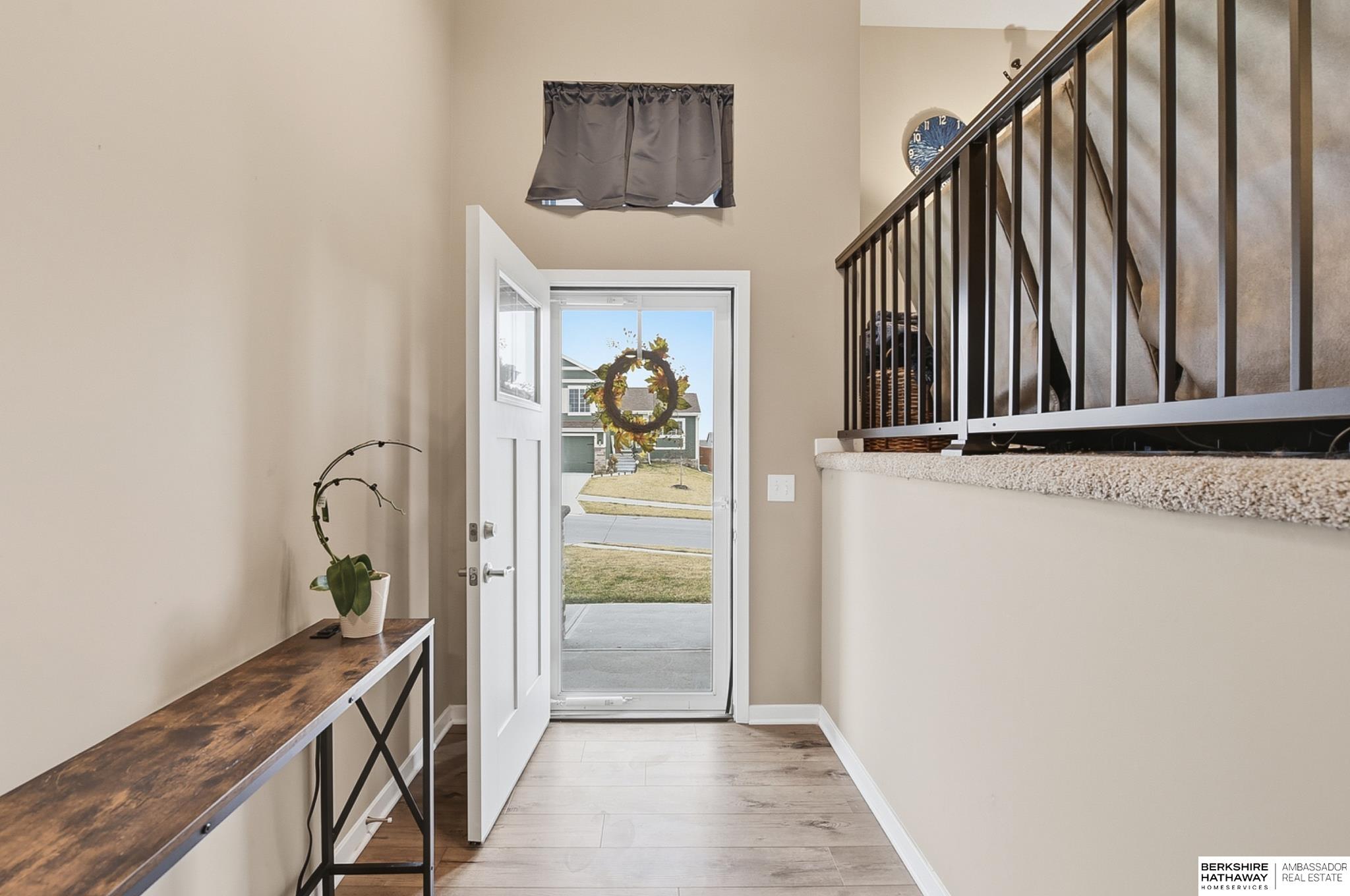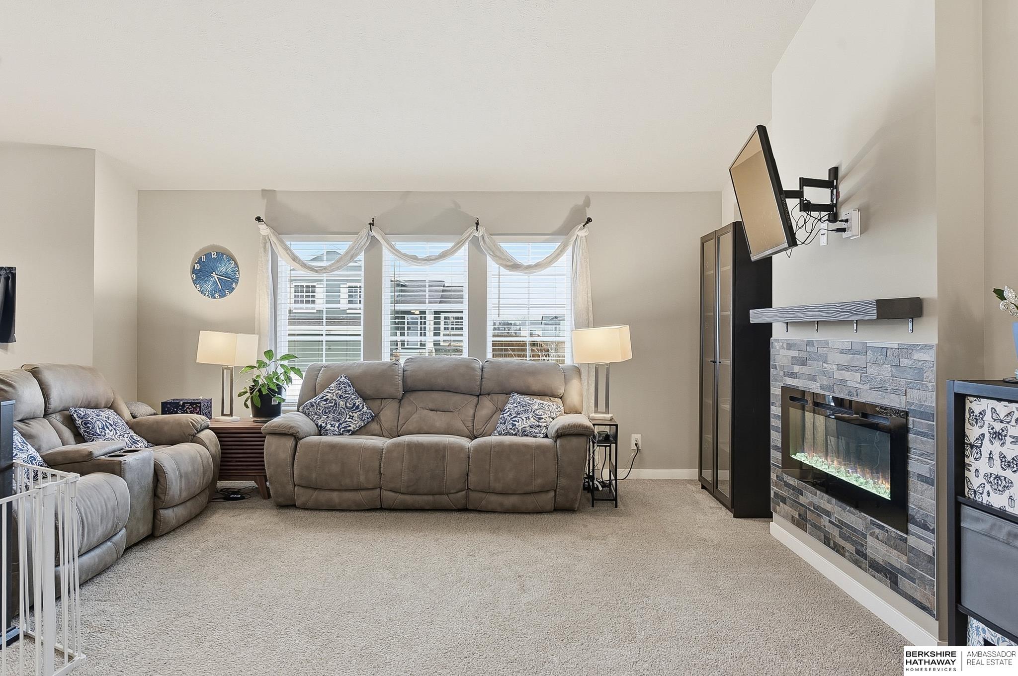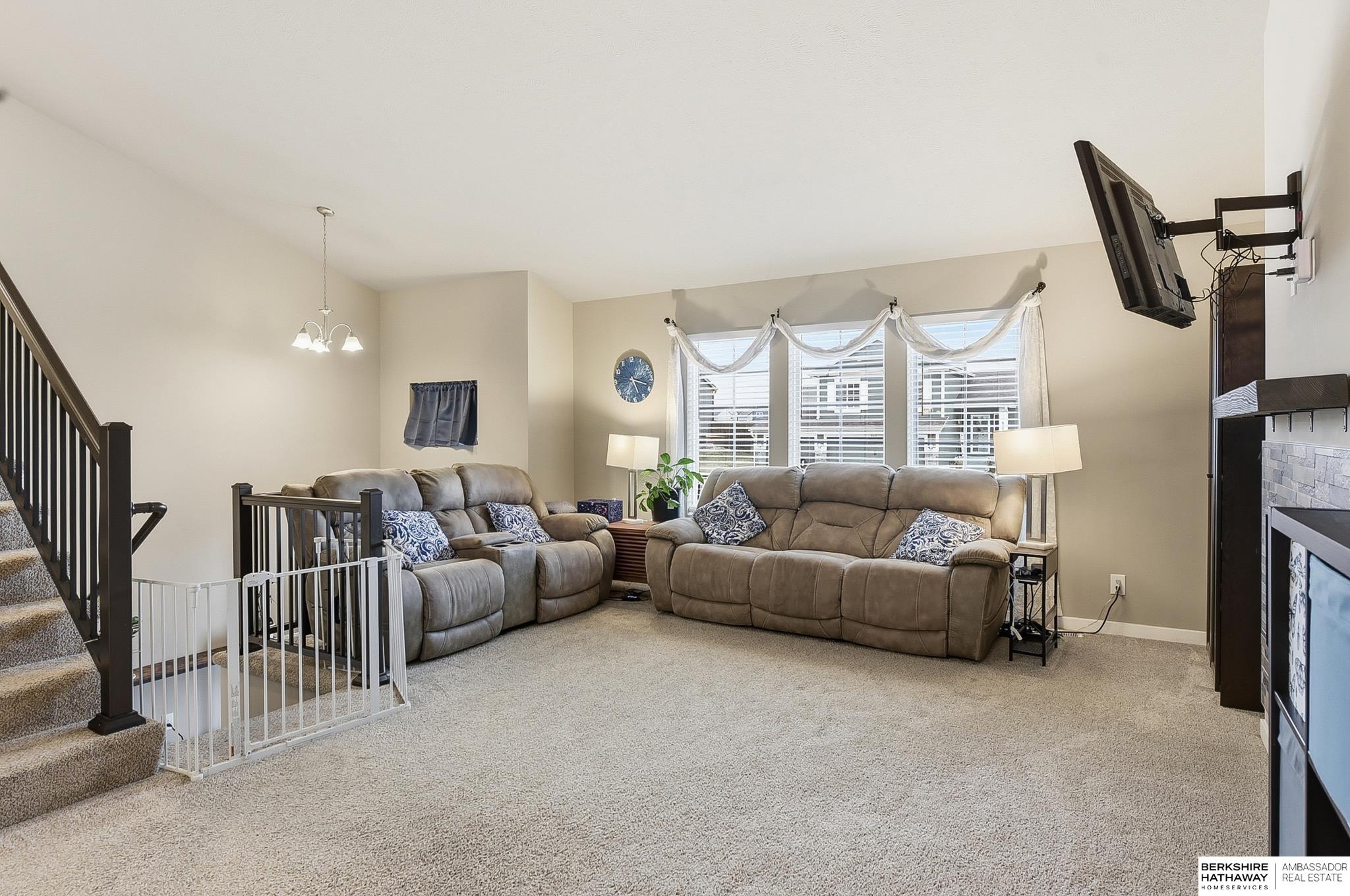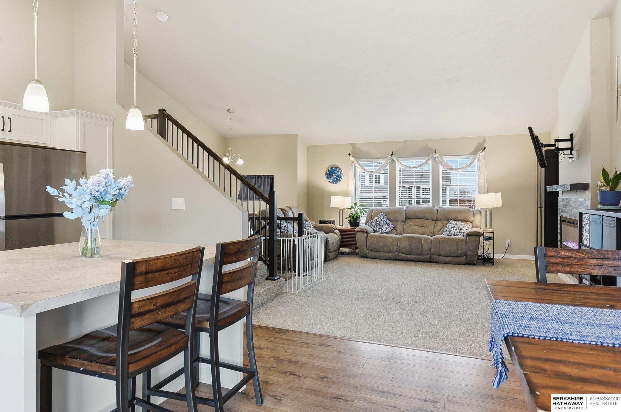 Popular Austin floorplan in Hyda Hills 2 featuring a desirable 3-car garage! This well-designed multilevel home offers a spacious, open main floor with a welcoming living room and cozy fireplace. The large eat-in kitchen includes sliding glass doors that lead to a deck overlooking the flat, generously sized backyard - perfect for outdoor enjoyment. Upstairs, you'll find an oversized primary suite with vaulted ceilings, a walk-in closet, and a private bath complete with double sinks and a shower. Convenient second-floor laundry adds everyday ease. The finished lower level provides excellent additional living space, ideal for entertaining, relaxing, or hosting guests. Located close to schools, parks, walking trails, and Offutt Air Force Base - this home combines comfort, space, and a fantastic location!