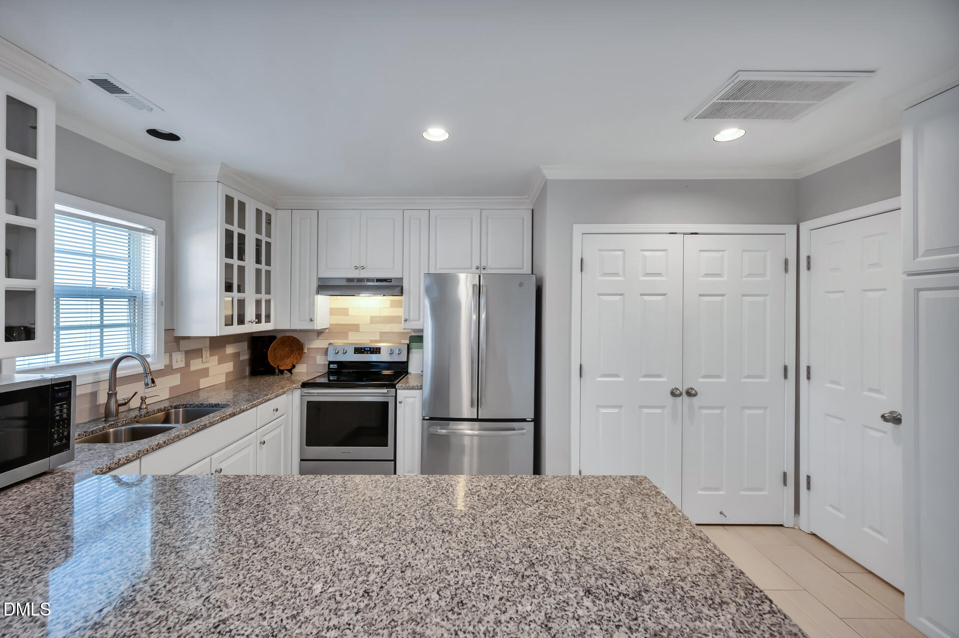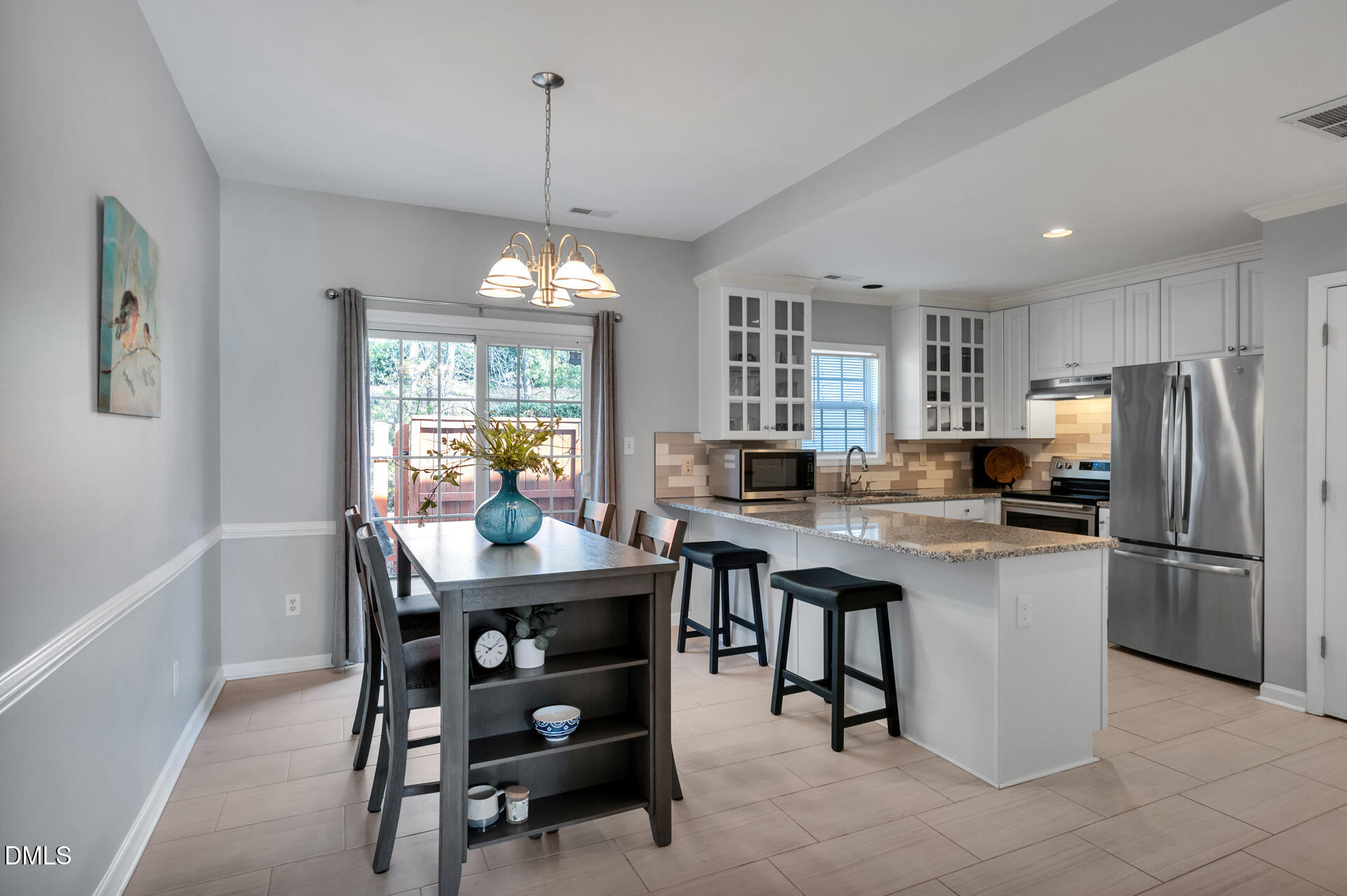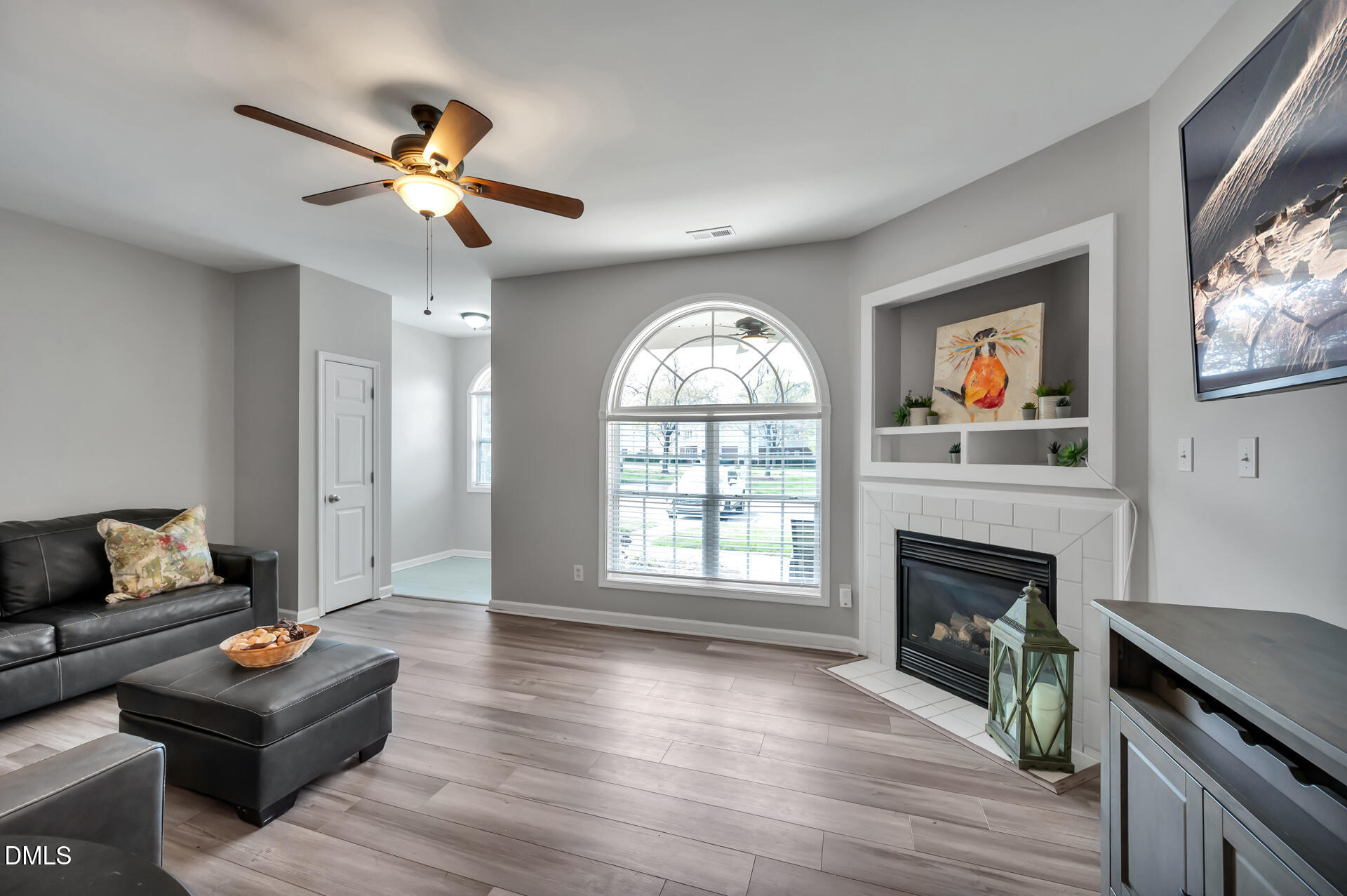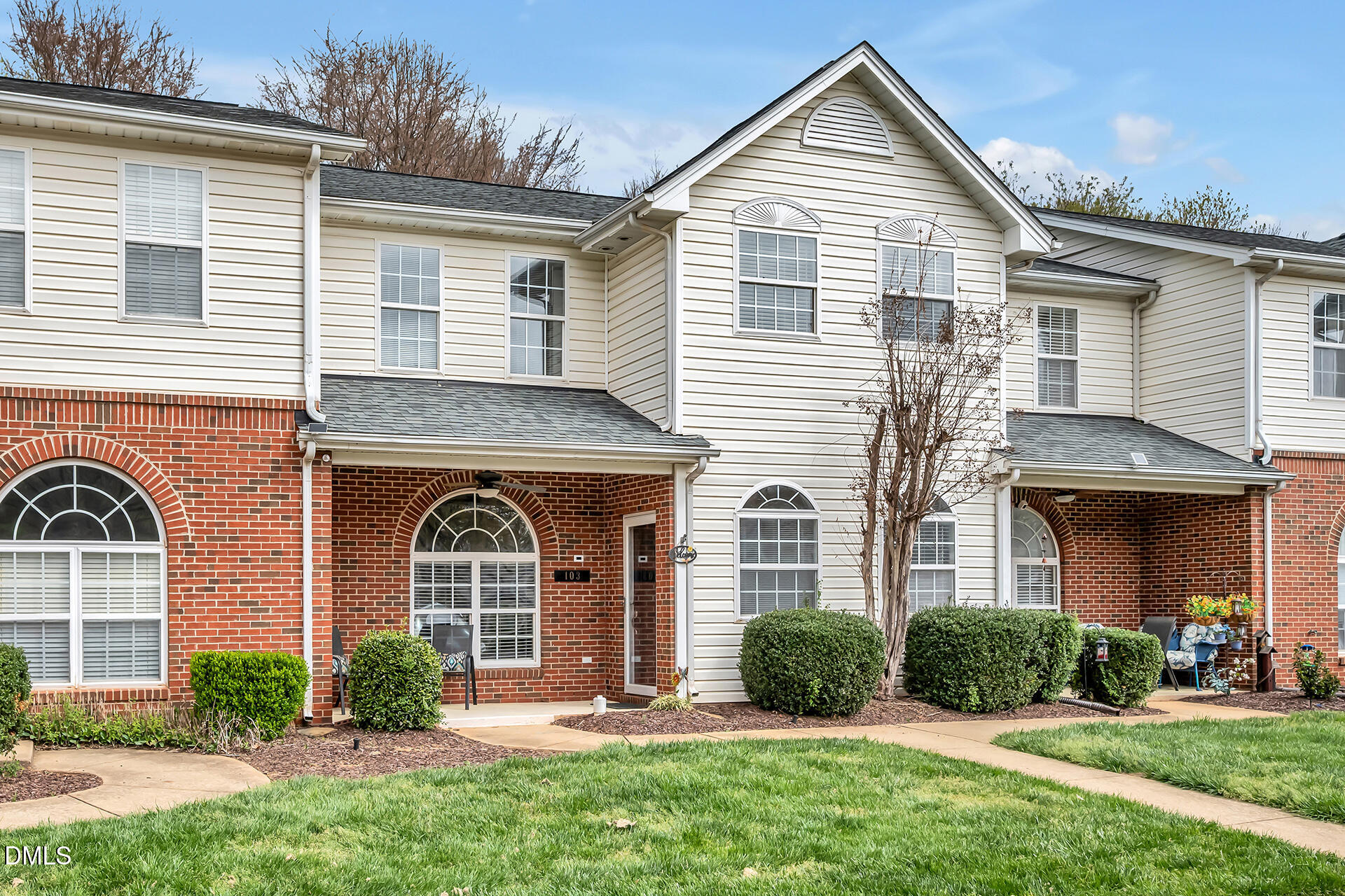 Move-in ready condo in Breezewood! Tucked away near the desirable Bedford subdivision, this 2Sty unit provides ease of access to all of North Raleigh's luxuries and the comfort and insulation of treelined streets and walkability in a pool community. Deep covered front porch is ready for your rocking chair! Tiled Foyer entry and hall closet off Family Room with sunny palladian window is flanked with gas fireplace... Eat-in Dining Room with chandelier overlooks the cantilevered granite countertop in Kitchen with stainless appliances, white cabinets and tile backsplash. Half Bath and Laundry for ease of use. 2 PRIMARY SUITES UP is the perfect roommate situation! Private, fenced patio and storage space. This unit is the ONE... Newer HVAC, LVP flooring, dishwasher, and stove... Roof is 2024! Washer, dryer and refrigerator conveys... All you have to do is M-O-V-E-!