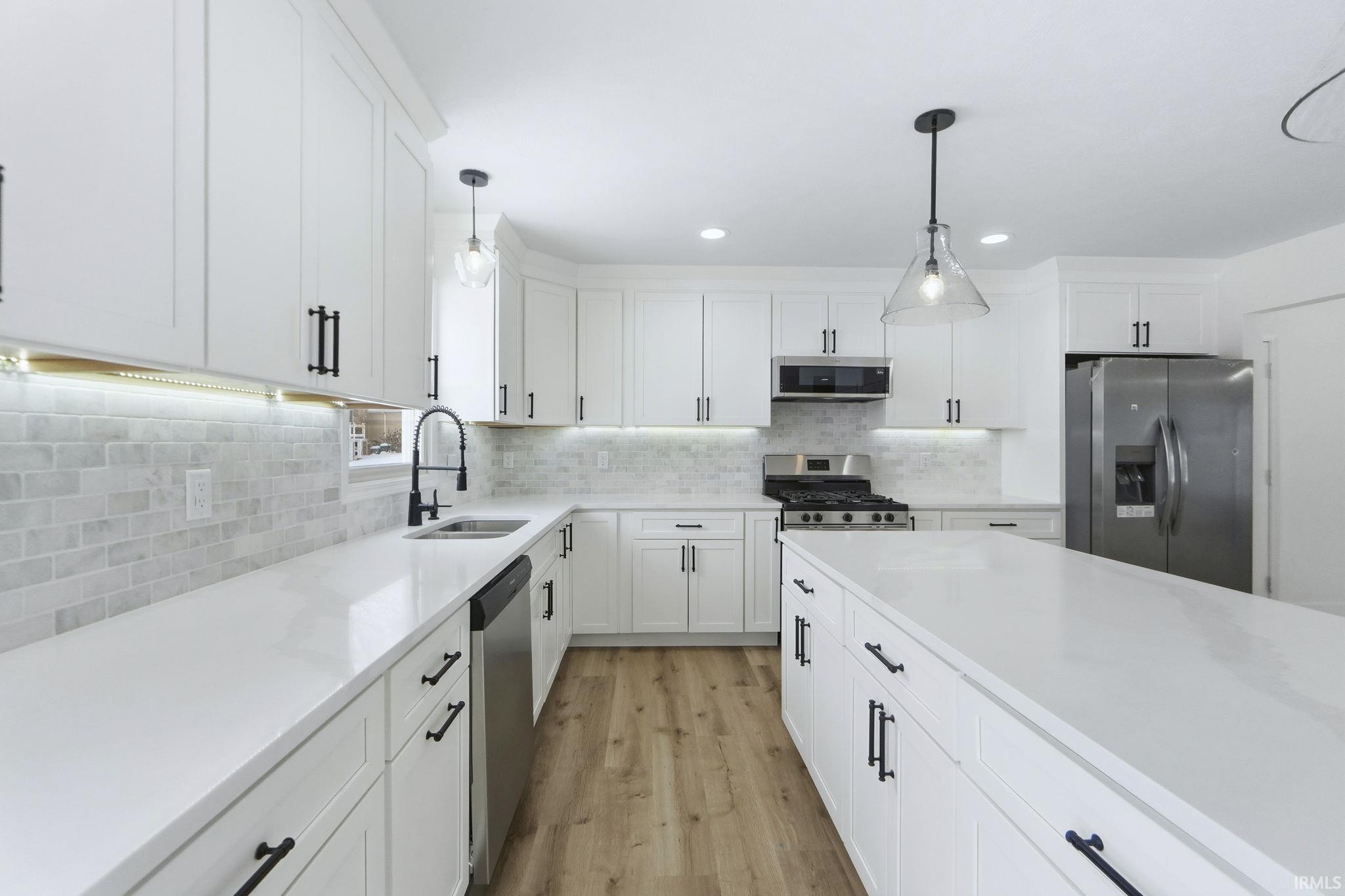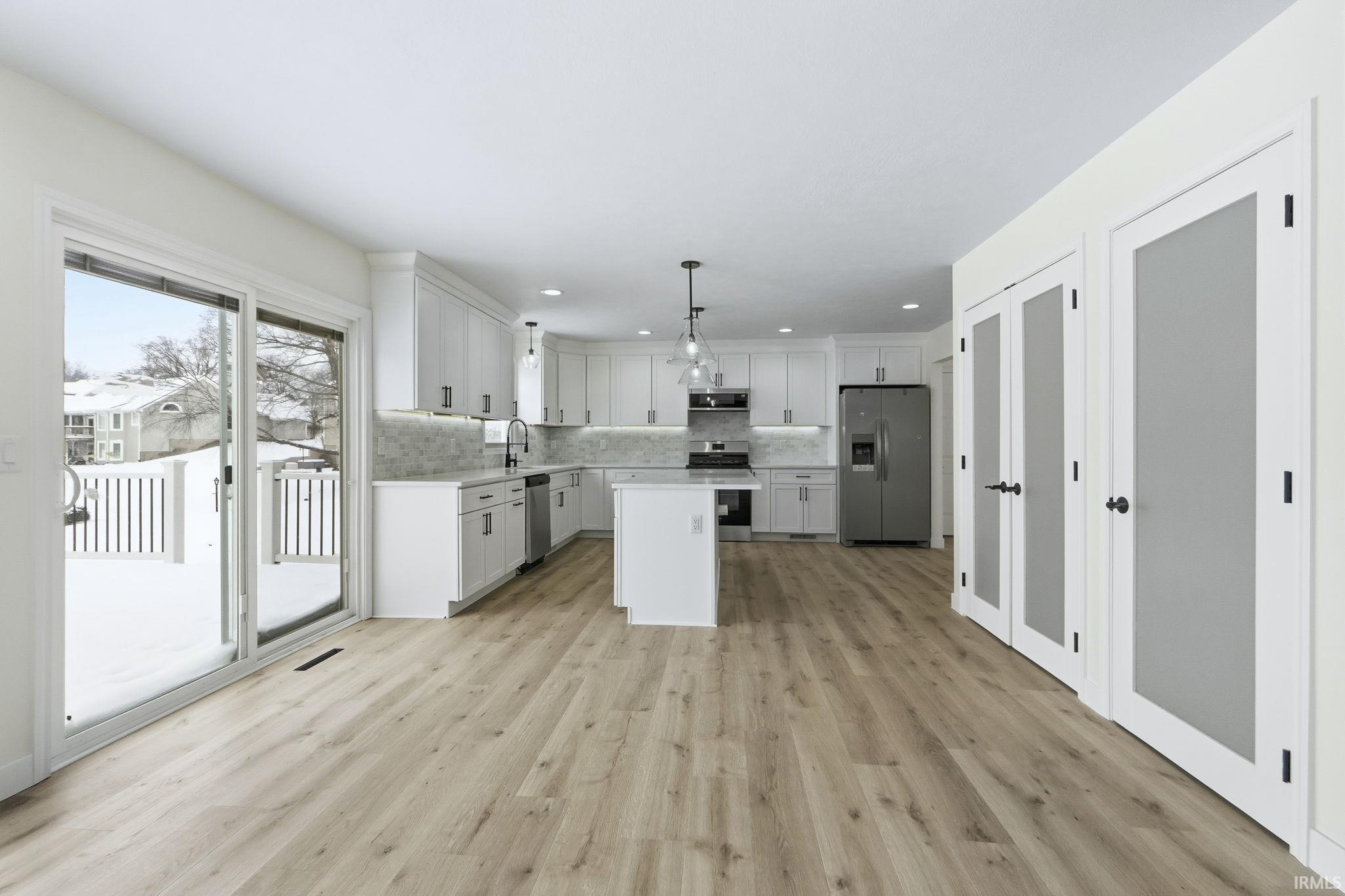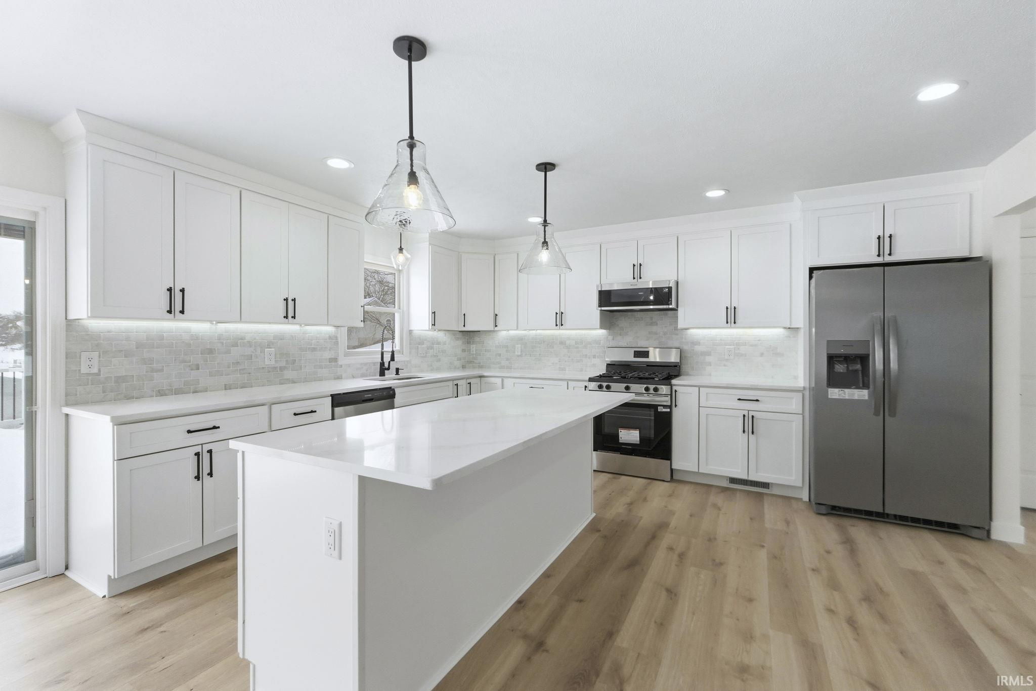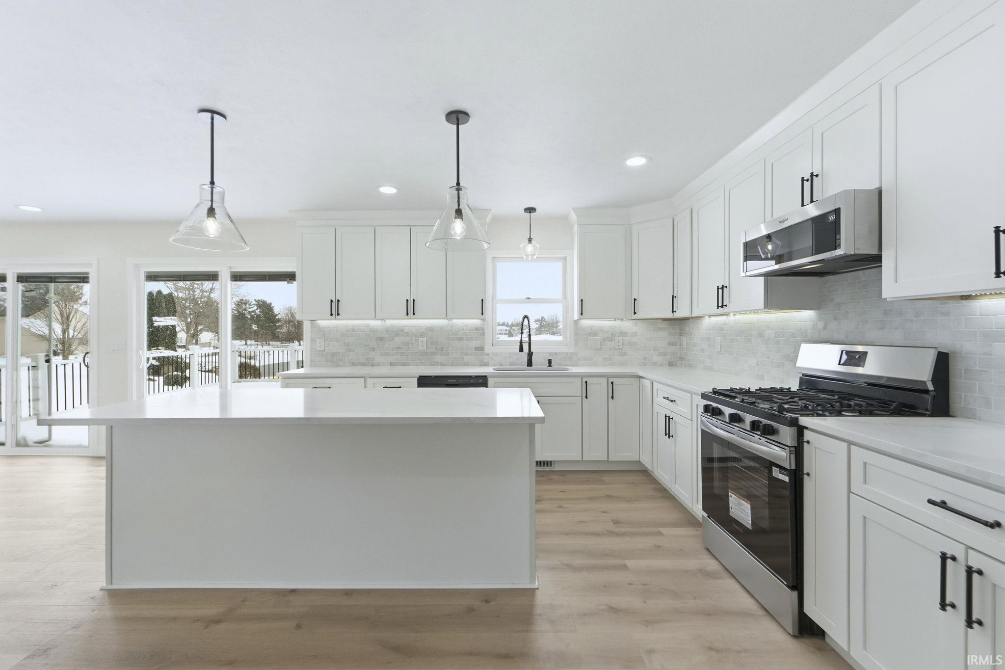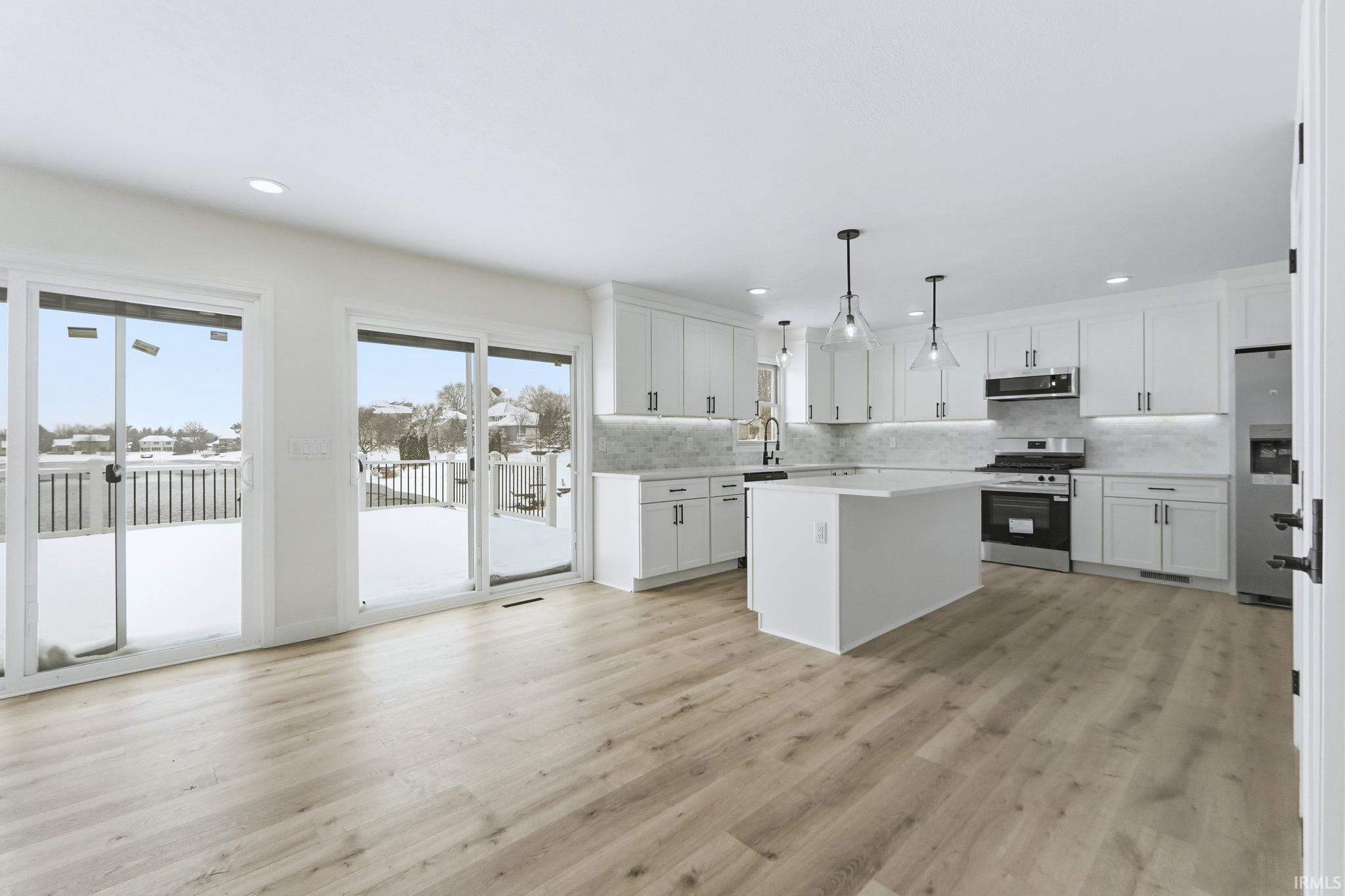 Waterfront renovated two story home with new kitchen cabinets, granite tops, stainless steel appliances, light fixtures, can lights, flooring, blinds, paint, bathrooms, exterior paint, roof, retaining wall, landscaping, deck and so much more, please see feature list with more updates.
