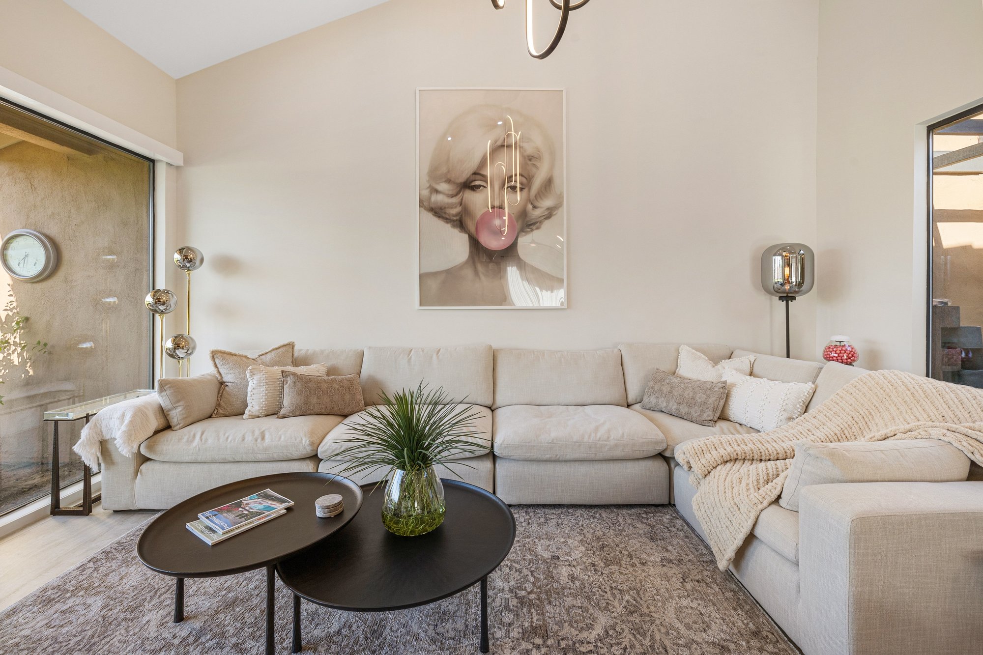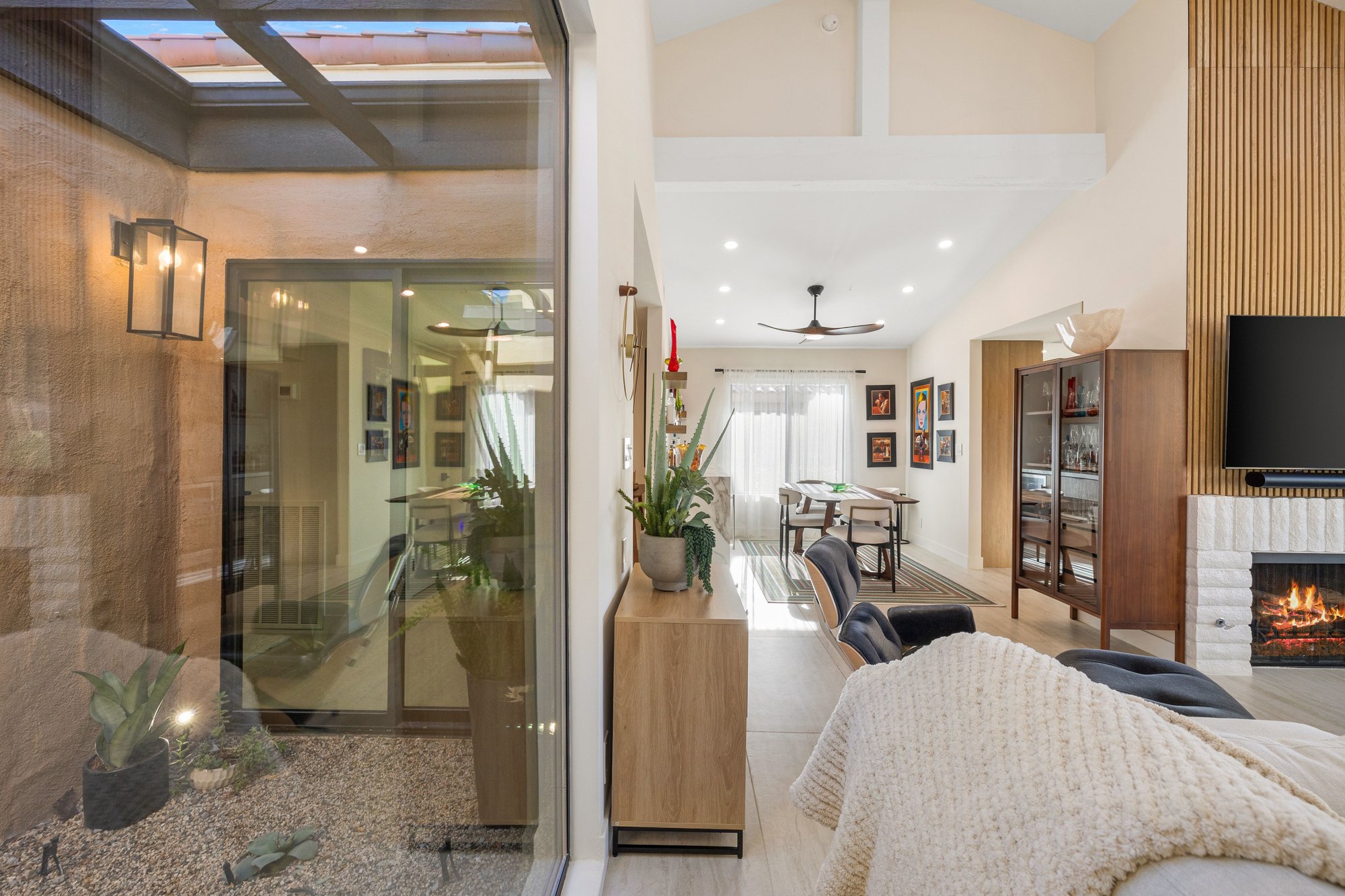 windows and sliders are complemented by custom motorized shades, while the vaulted living room