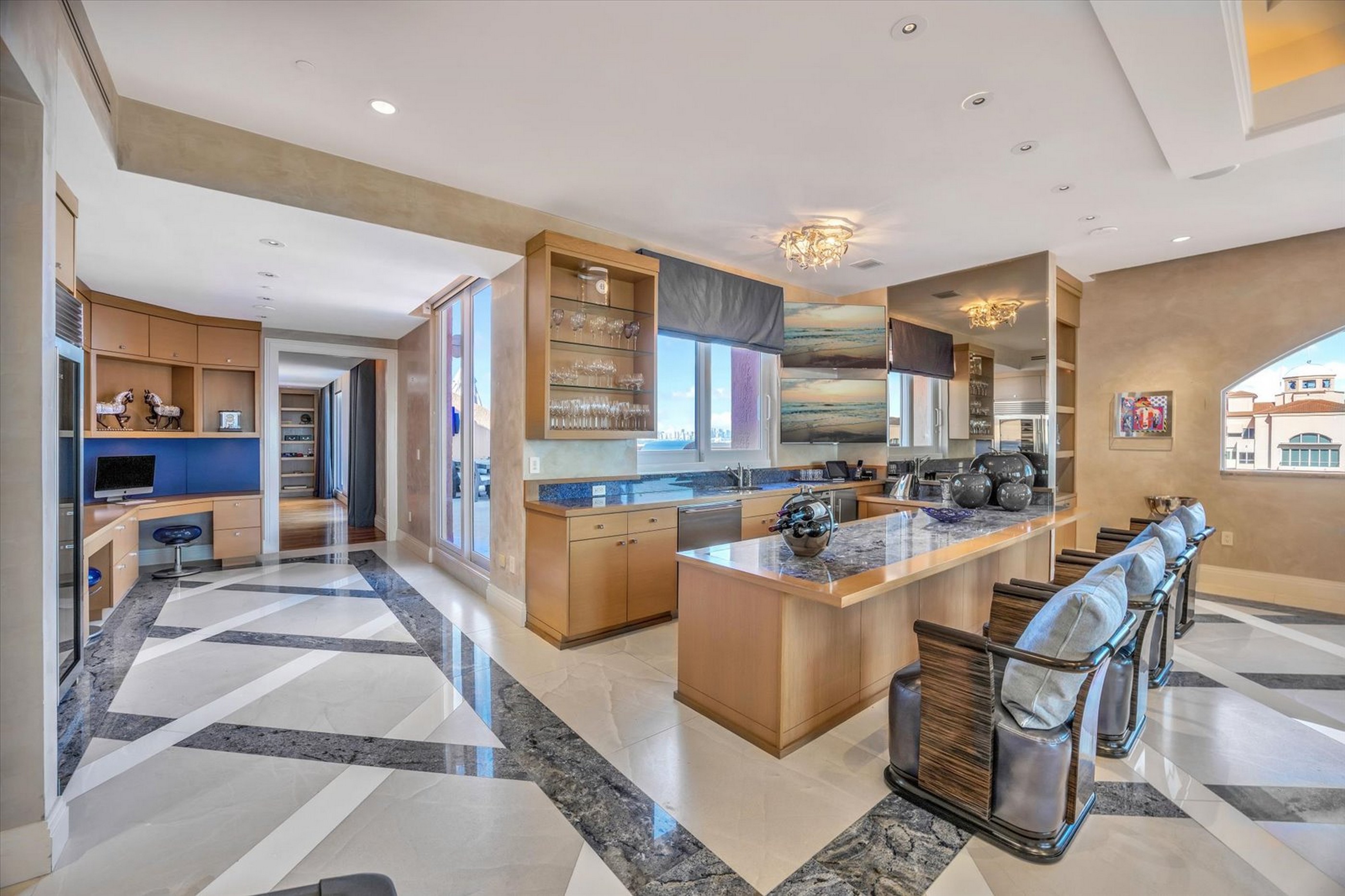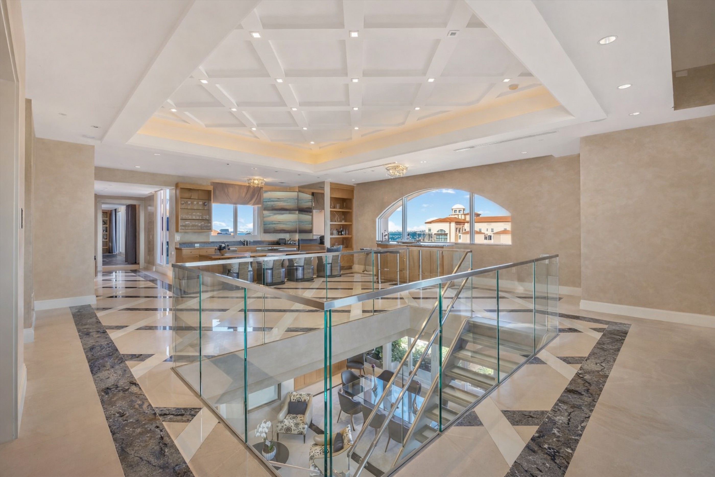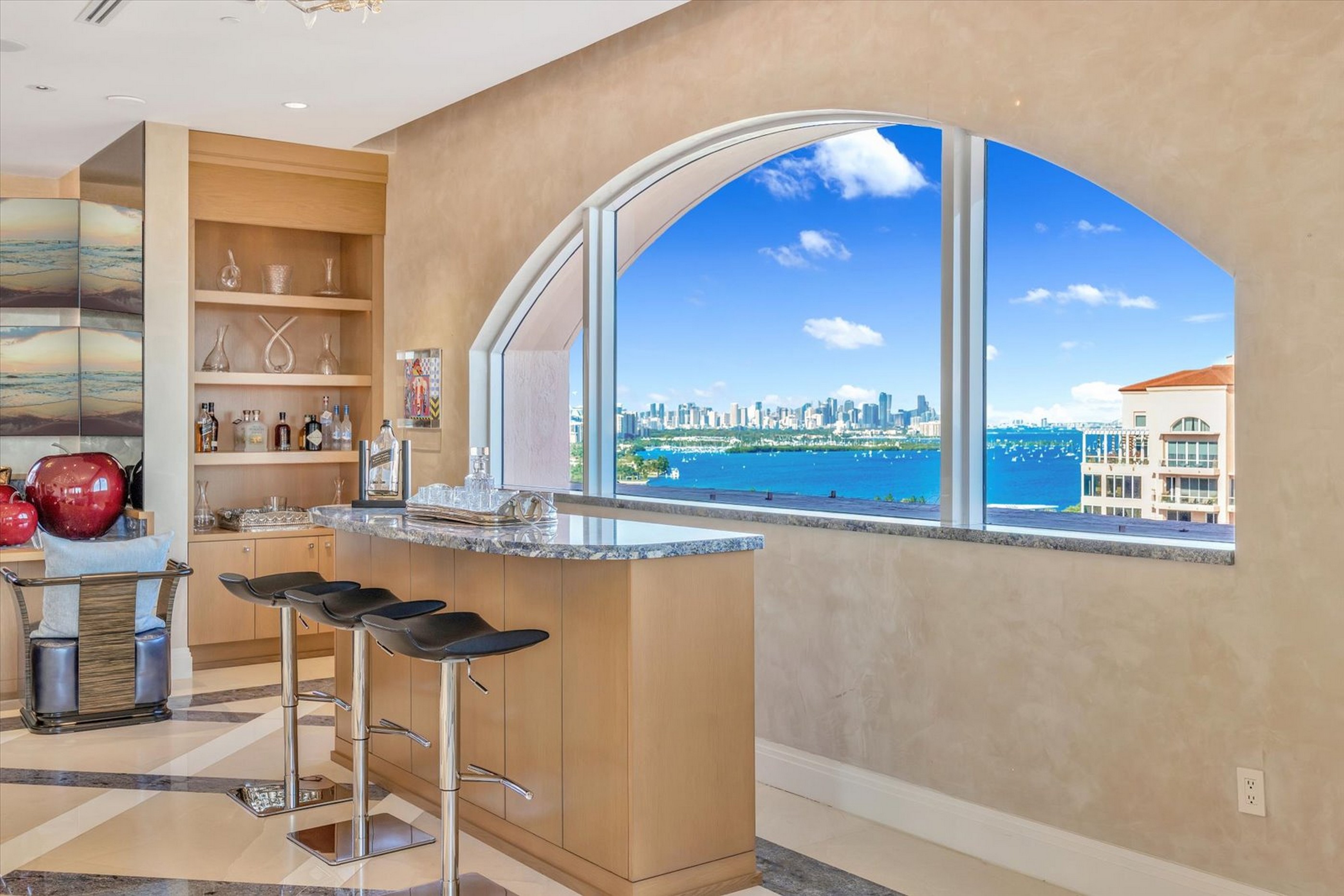 Rare two-story Tower Suite penthouse at The Gables Club offering breathtaking panoramic views of Biscayne Bay & the Miami skyline. Featuring 6 beds, 6.5 baths, & over 10,500 SF of interior space plus 2,600+ SF of expansive terraces, this exceptional residence showcases a private elevator entry, dramatic 30-foot ceilings, formal dining room, gourmet kitchen with butler’s pantry & secondary kitchen, as well as a loft-style entertainment level complete with bars, media room, and two private offices. The primary suite is a private retreat featuring dual bathrooms & oversized walk-in closets, complemented by five additional en-suite bedrooms. Finishes include limestone flooring, Venetian plaster walls, custom built-ins, and striking Chihuly-style ceiling artwork. A Crestron smart home system, surround sound, & impact windows provide modern comfort & security. Multiple terraces, including one with a built-in BBQ, offer seamless indoor-outdoor living. This offering includes three assigned parking spaces, one of which is located in a private air-conditioned garage, additional storage, & an approximately 50-foot boat slip. Residents of The Gables Club enjoy an exclusive, resort-style lifestyle with access to a private marina, multiple swimming pools and spa areas, state-of-the-art fitness centers, lighted clay tennis courts, a waterfront clubhouse with dining & social spaces, 24/7 concierge, valet, & gated security, all within one of Coral Gables’ most prestigious waterfront community.