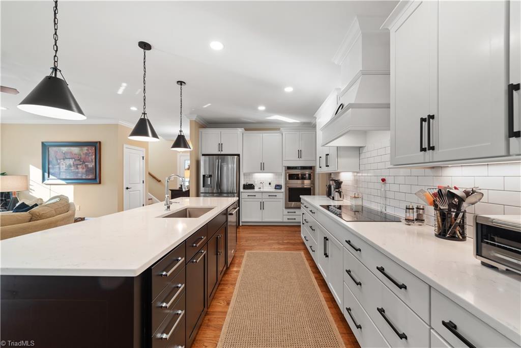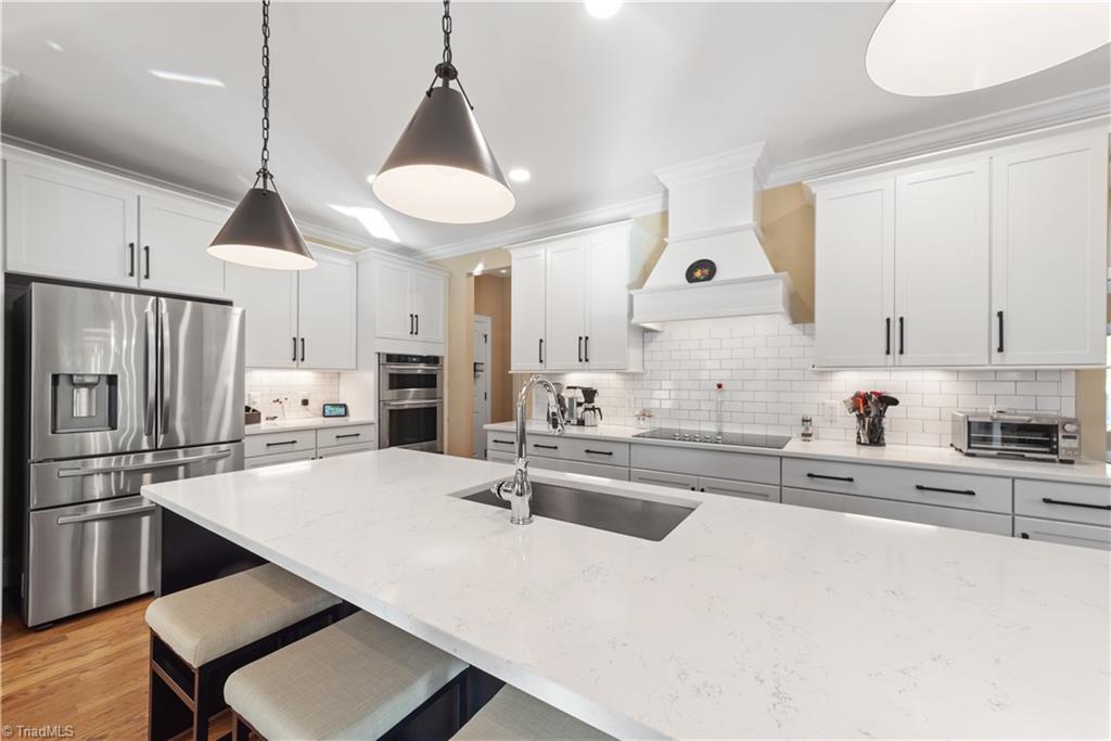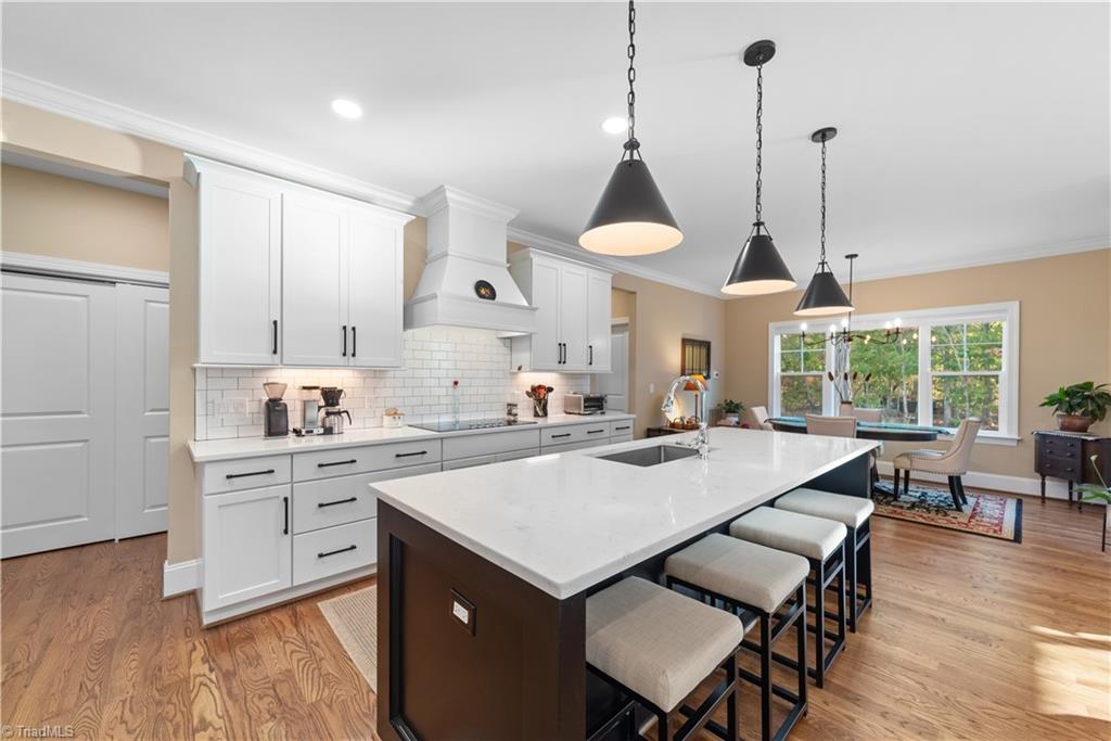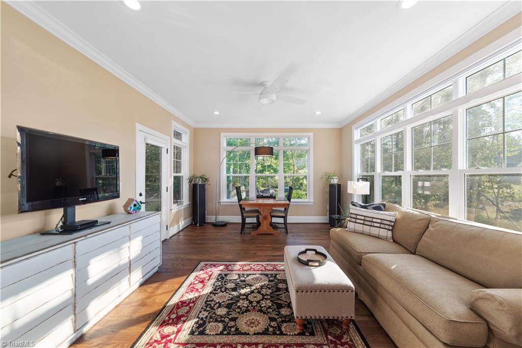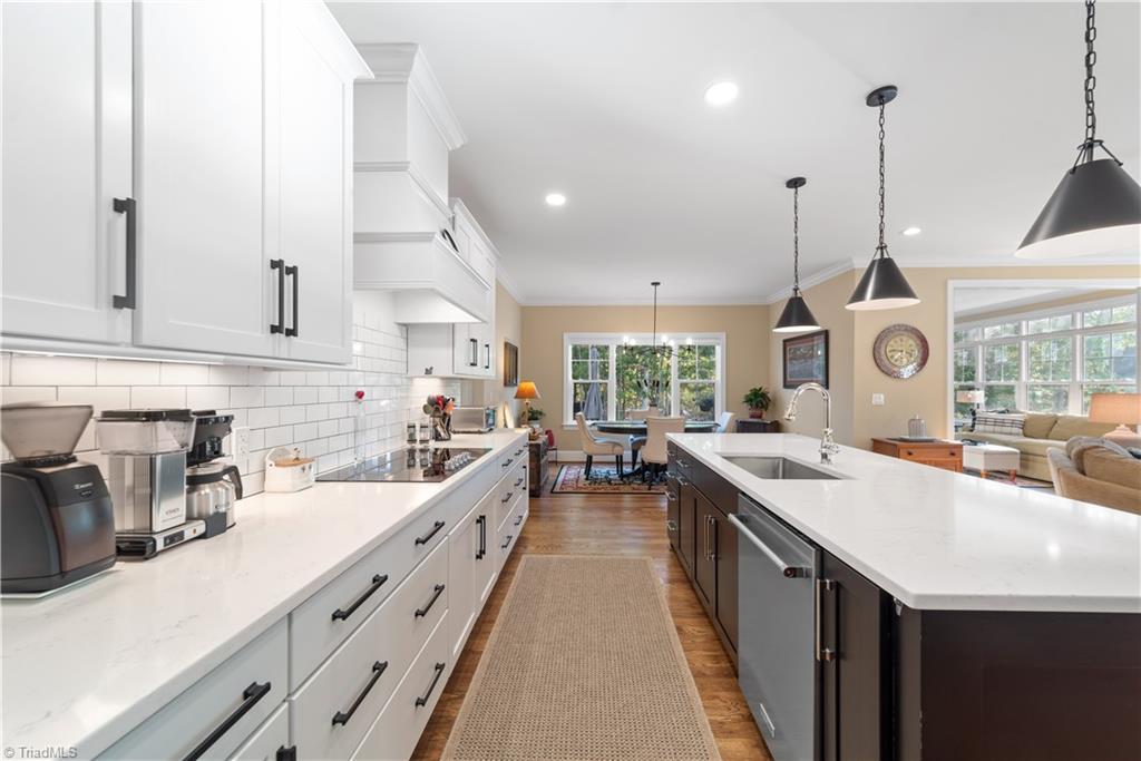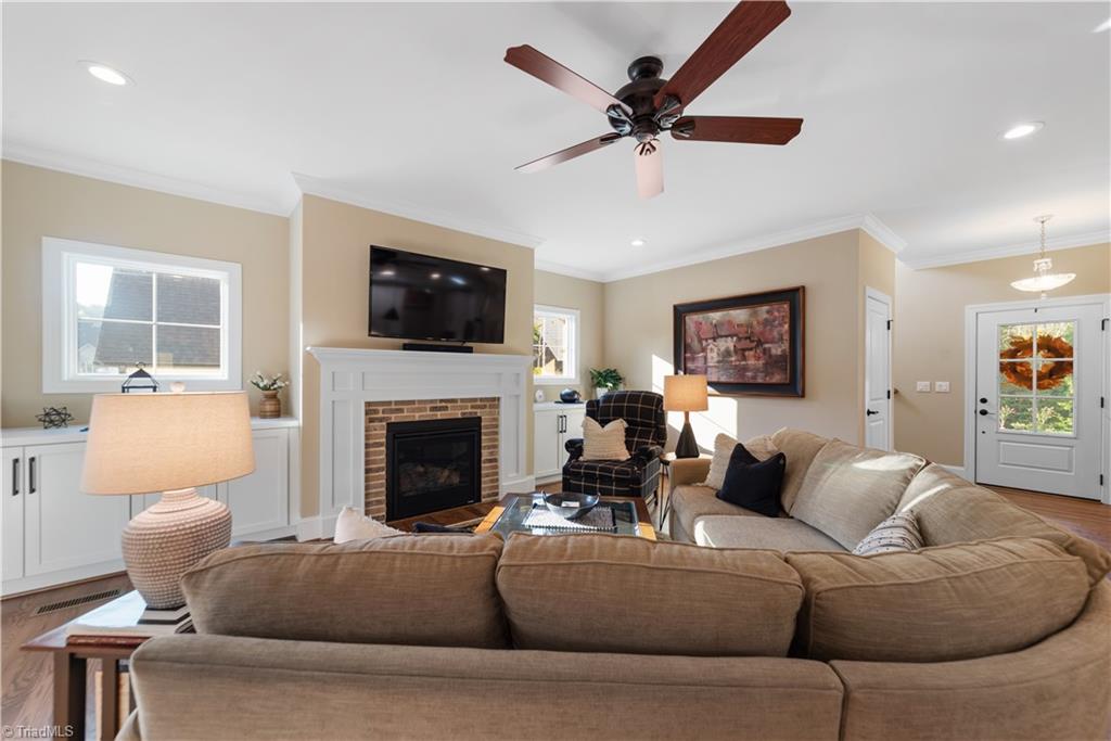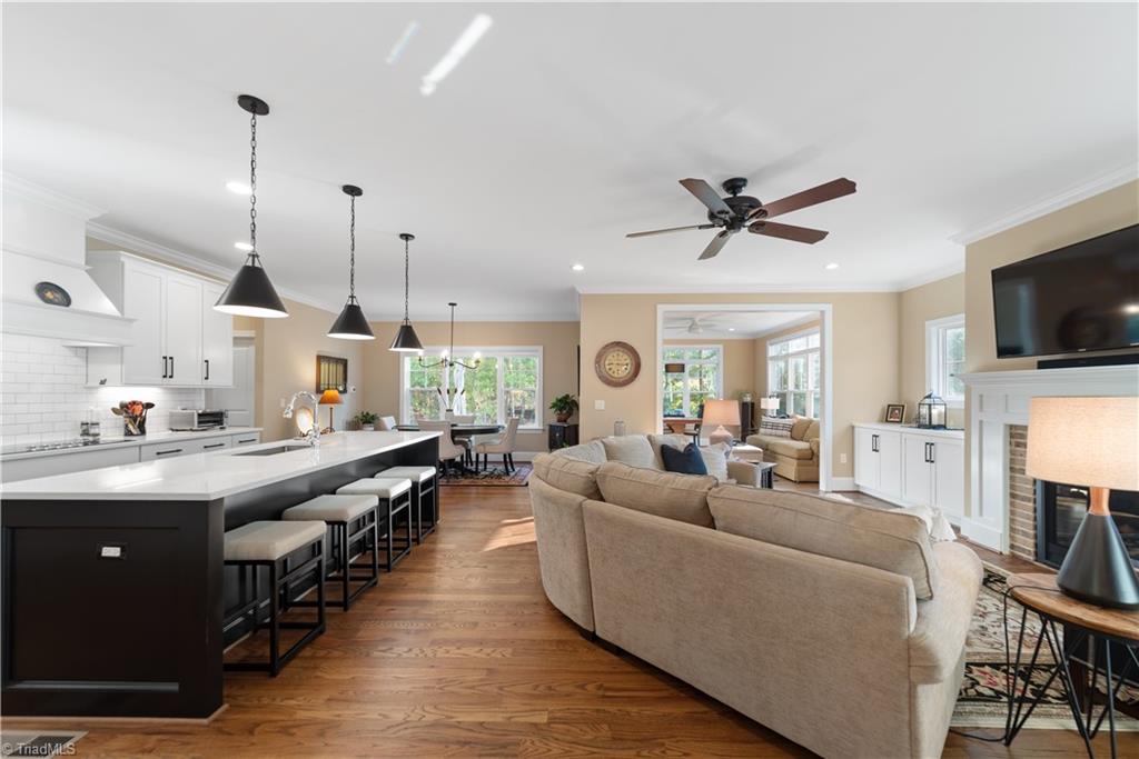 Custom built in 2022, this home feels practically brand new! Thoughtfully designed with everyday living & easy entertaining in mind, the open-concept layout offers a spacious & comfortable flow. The kitchen seamlessly connects to the living rm- featuring a cozy fireplace & built-ins which extends to the dining area and sunroom. The kitchen is a standout- large island w/quartz countertops, Kitchen Aid appliances and soft close cabinetry. The sunroom filled with natural light from lots of windows creates a bright & airy retreat. The primary suite located on the main level has a private bath w/double vanity, large walk-in tile shower and tile flooring. Hardwood flooring runs throughout the main level. Upstairs, you will find two generous sized secondary bedrooms, shared full bath, a versatile loft area and convenient attic storage. Shiloh offers a convenient location with easy access to the TRIAD, including the airport and beautiful Belews Lake.