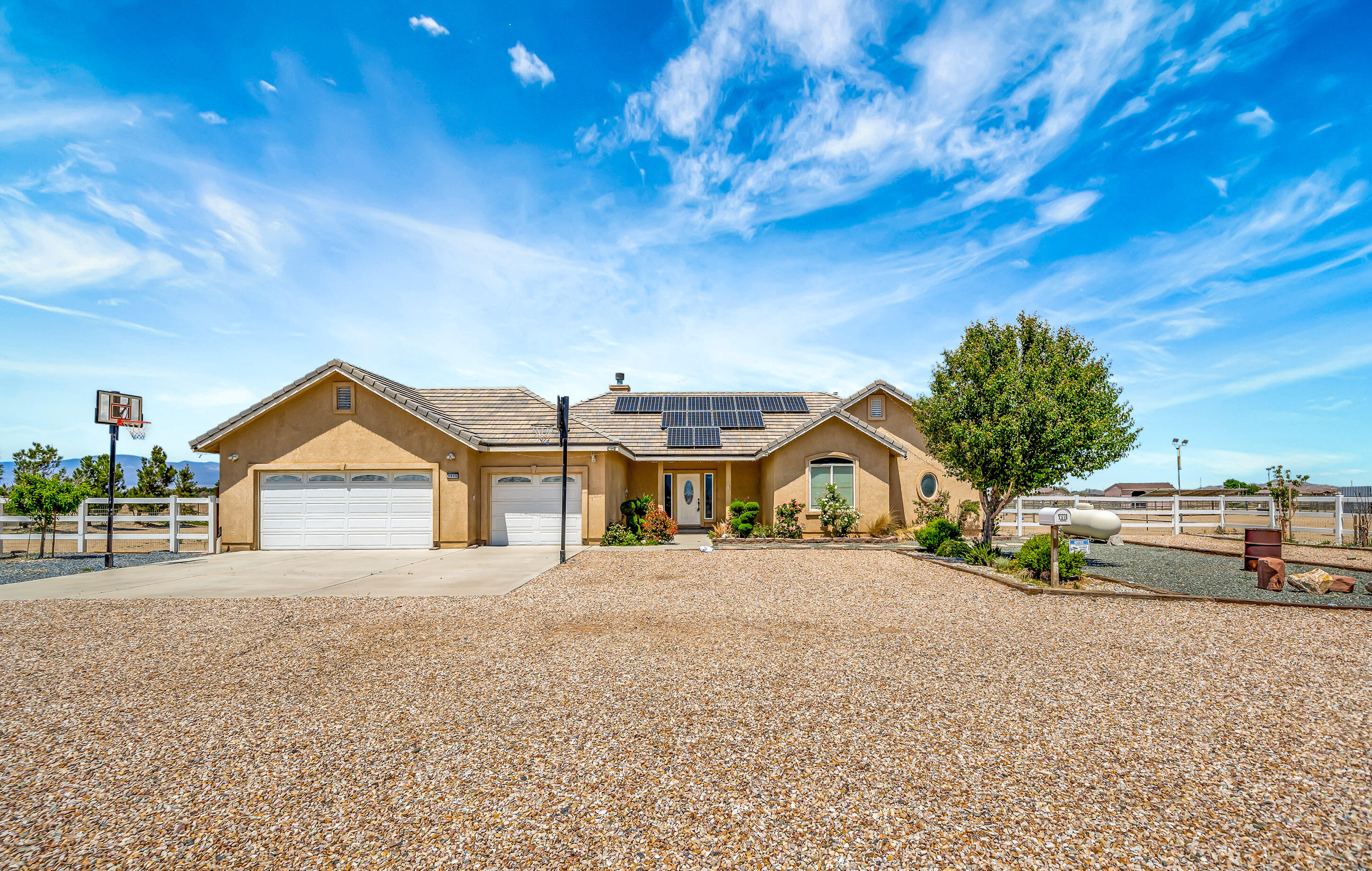 Horse Property! Paid Solar! Workshop! Stunning Horse Property on 2.53 Acres Located in a Desirable Neighborhood in West Lancaster. Move-In Ready! This Exceptional 3-Bedroom, 3-Bathroom Home Offers the Perfect Blend of Comfort, Functionality, & Outdoor Living. The Spacious Open Floor Plan Includes a Family Room with a Cozy Fireplace, a Gourmet Kitchen with Granite Countertops, Abundance of Cabinets for Storage, a Dining Area, Plus a Formal Dining Room. The Master Suite Features a Walk-In Closet, Dual Sinks, a Separate Shower, & a Soaking Tub, while the Additional Bedrooms Offer Large Closets & Ceiling Fans. A Guest Bathroom with Dual Sinks & Granite Counters, a Convenient Indoor Laundry Room with a Sink all Complemented by New Custom Tile Flooring Throughout. The Outdoor Amenities are Unmatched. Designed for Equestrian Enthusiasts, the Property Boasts a 4-Stall Barn with Turnout & Pipe Corrals, an Arena, an Additional Horse Barn, & a Separate Corrals. There's also a Detached Tack Shed & a Storage Shed. RV Owners will Appreciate the Detached Metal RV Building/Workshop with Two Roll-Up Doors, RV Access, & Hookups for Relaxation & Entertainment. Enjoy the Custom-Built Covered Gazebo, Custom Covered Patio, & a Horseshoe Setup for Entertainment. The Property is Beautifully Landscaped with Fruit Trees, Pine Trees, & Thoughtfully Placed Plants & Trees all Lovingly Added by the Seller. Additional Features Include a Spacious 3-Car Garage with Attic Storage. This Home is a Rare Opportunity to Own a Move-In-Ready, Fully Equipped Horse Property that Combines Modern Comfort with Outdoor Charm. Don't Miss Your Chance to Experience this One-of-a-Kind Property.