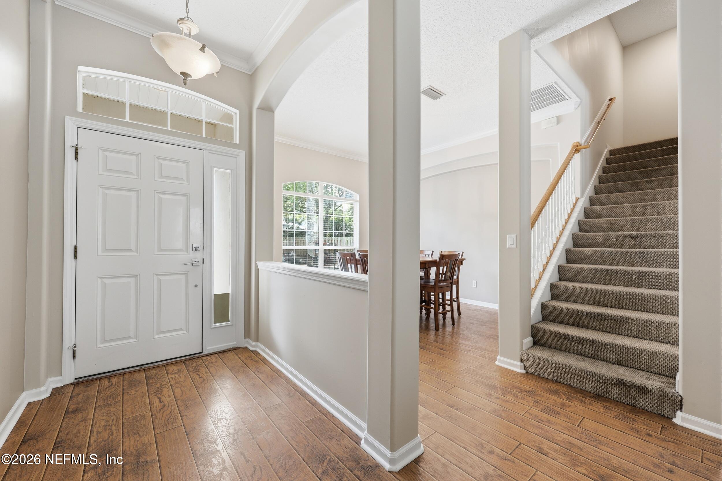 RARE FIND! PRIVATE POOL + OVER HALF AN ACRE + NO CDD FEES in Walden Chase near Nocatee - an opportunity you won't see again! Welcome to one of the most unique properties in Walden Chase, tucked away from the street and down a long private drive, where space, privacy and lifestyle come together in a way that's nearly impossible to find. The backyard is a true standout - featuring a sparkling pool and a mature oak tree with a swing - that anchors the space beautifully. It's an ideal space to create your own outdoor retreat with cafe lights, cozy seating, and unforgettable evenings under the stars. Inside, you'll find a spacious and functional layout designed for both everyday living and entertaining. Natural light fills the main living area, creating a warm and inviting atmosphere, while the generously sized bedrooms provide comfort for the whole family. Upstairs is an expansive flex suite with full bath and an oversized closet - perfect for guests, a home office or family media room