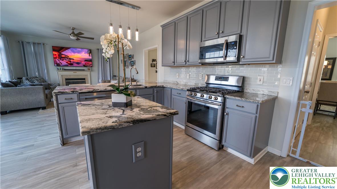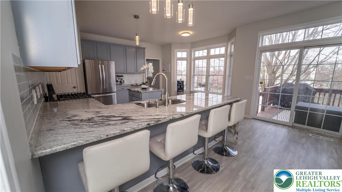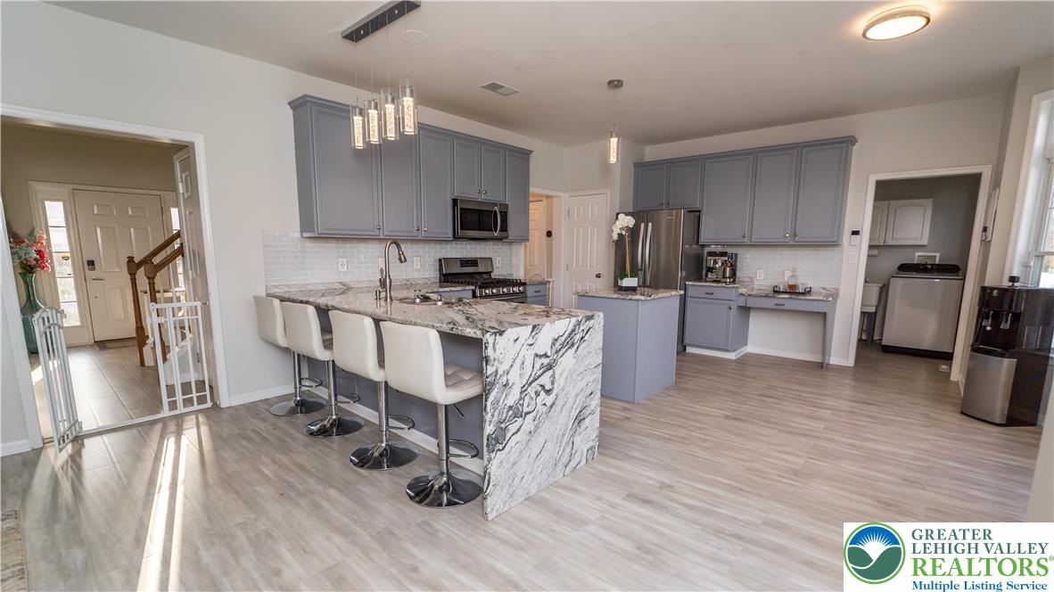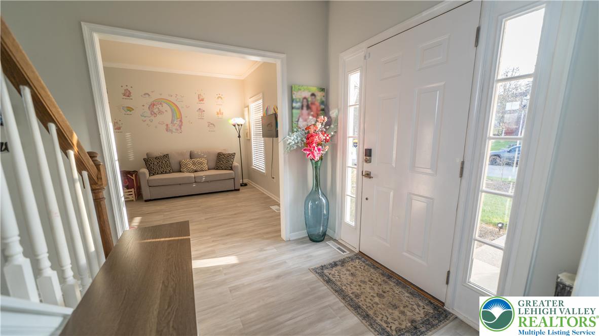 Imagine coming home to a quiet street in desirable Forks Township, where space, updates, and lifestyle come together seamlessly. This beautifully updated 4-bedroom, 2.5-bath colonial offers a layout designed for both comfortable living and effortless entertaining. The heart of the home is the updated kitchen featuring GRANITE countertops, tile backsplash, STAINLESS steel appliances, refreshed cabinetry, and a striking WATERFALL-EDGE peninsula with seating, complemented by a separate center island for additional prep space. The kitchen flows naturally into the family room, highlighted by a cozy GAS FIREPLACE insert, creating the perfect gathering space. A separate dining room and front flex room offer versatility for work-from-home needs, playroom, or additional living space. Upstairs, retreat to the spacious primary suite, complete with a walk-in closet, a spa-like bath featuring a JACUZZI jetted tub, a separate shower, and dual sinks with waterfall faucets. Three additional bedrooms provide flexibility for family, guests, or an optional office/flex space. New hardwood flooring extends throughout the entire second level, adding warmth and elegance. The unfinished DAYLIGHT BASEMENT offers approximately 1,100 square feet with triple windows and 9-foot ceilings, providing abundant natural light and flexible space already usable for recreation, storage, or future finishing. Bump-out areas maximize storage flexibility. Step outside to the fully FENCED BACKYARD with beautiful VIEWS, 6-foot vinyl privacy fencing, and a deck - perfect for entertaining, relaxing, or enjoying outdoor space. This home has been extensively updated, including NEW ROOF (2022), updated kitchen and bathrooms, new flooring throughout, fresh interior paint, updated lighting and fixtures, gas fireplace insert, security system with cameras, and more. NATURAL GAS heating and cooking add additional comfort and efficiency. Located just minutes from parks, shopping, dining, commuting routes, and approximately 13 miles of walking and biking trails, this move-in ready home offers the perfect combination of convenience, comfort, and lifestyle.