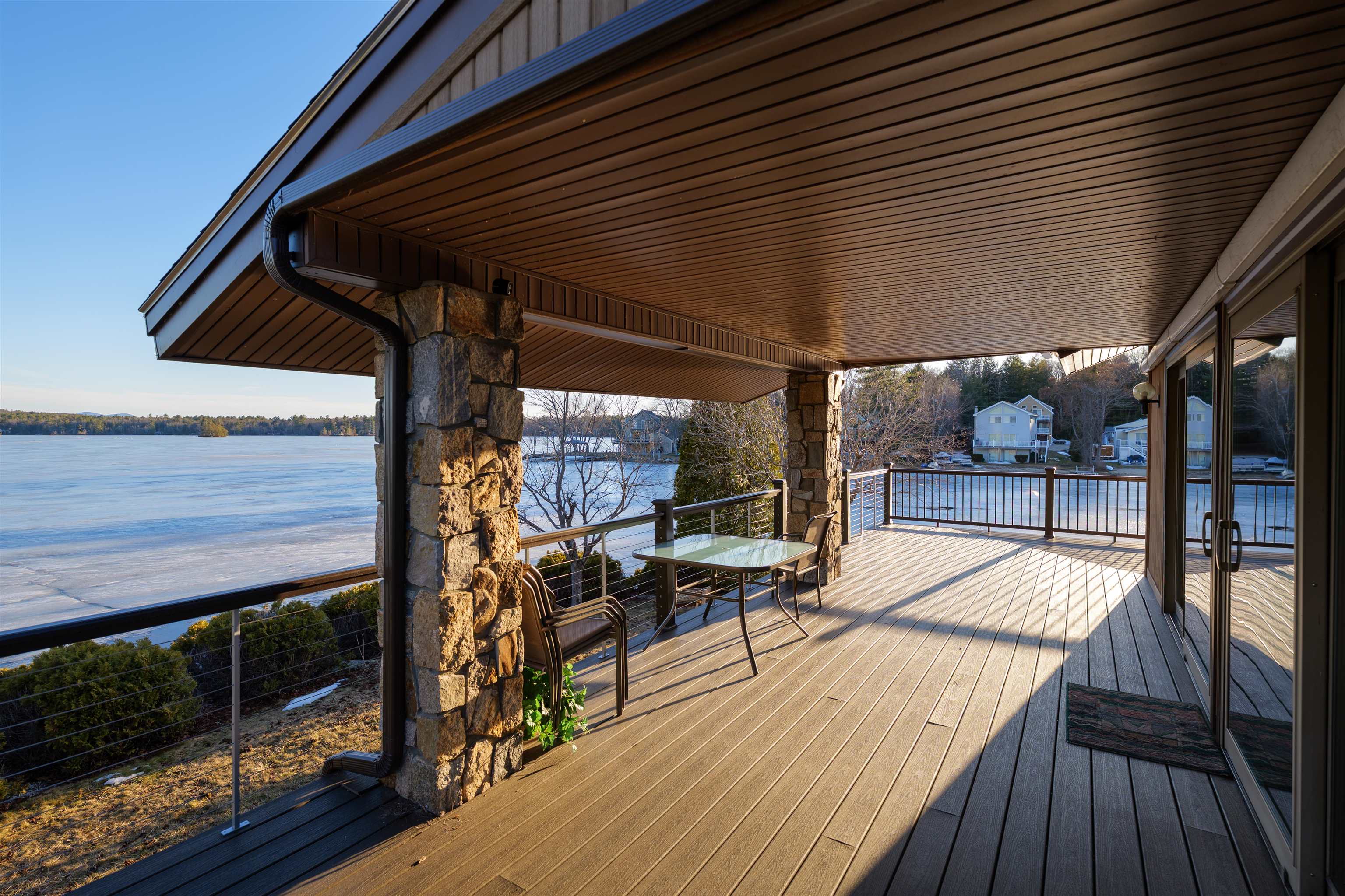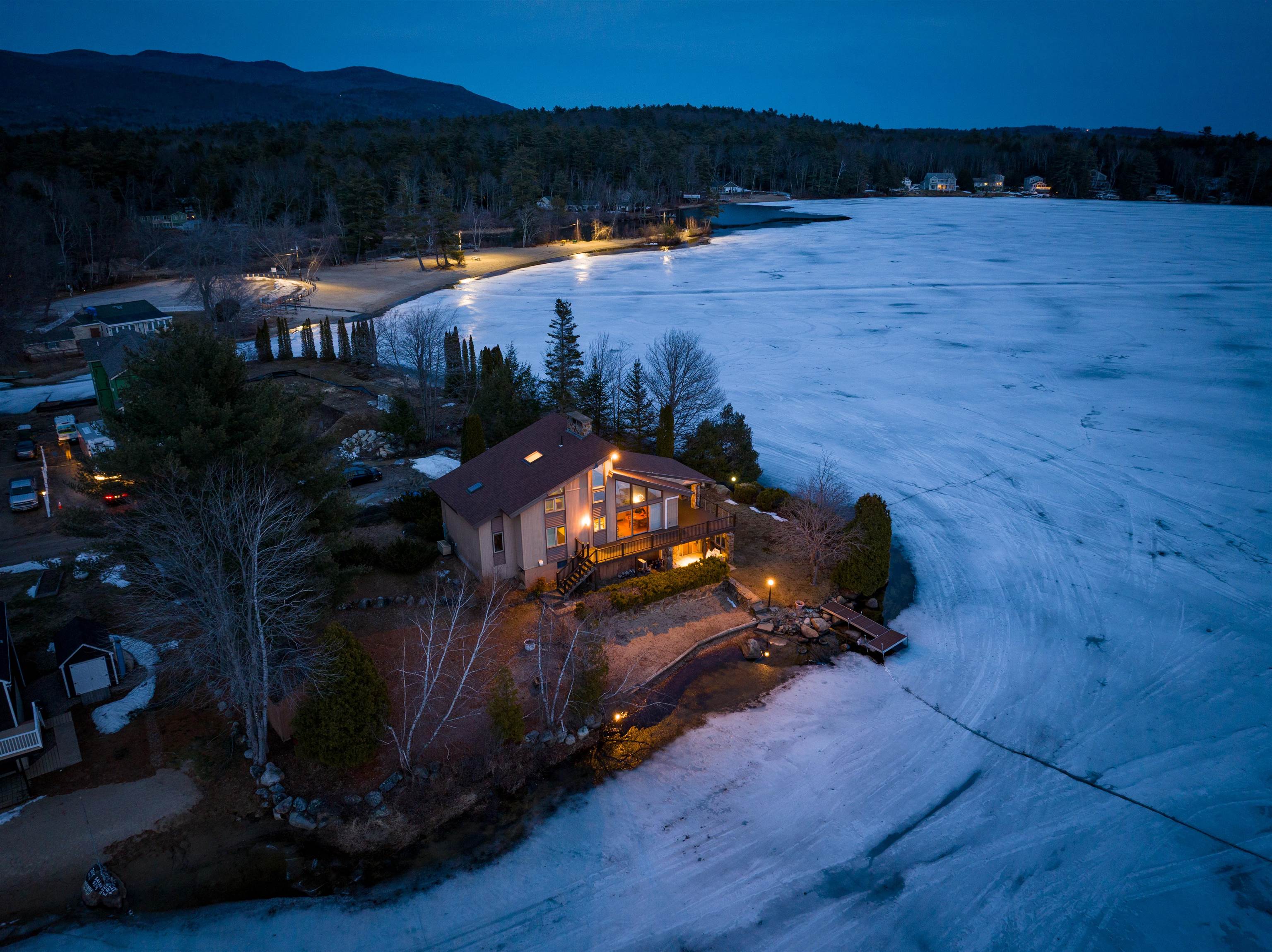 Moultonborough NH - Debut Open House - Saturday April 4 - 12:00-2:00 PM. Southwest exposure and views toward Gunstock Mountain Resort. Point location offers both sunrise and sunset views. This special setting provides all-day sun along the private sandy beach. With 220 feet of Winnipesaukee waterfront, a rare sense of privacy and light creates a distinctive connection to both home and lake. Three levels of living space with abundant glass, capturing water and mountain views from multiple vantage points around the property. The main level offers cathedral ceilings and an open-concept layout, including the living and kitchen areas, along with a primary bedroom, office, and a spacious walk-in closet for convenient single-level living.The level lot enhances usability and enjoyment of the waterfront. 2 driveways - one is gated. Dock accommodating up to a 35-foot boat historically used at the property. The entry level garden apartment has a full kitchen and could be rented as an Airbnb. 2 fireplaces. One is woodburing.In addition to your private waterfront, Balmoral has private roads, a private beach, docks, boat launch, club house and many other local activities for Balmoral Members and their Guests only. Sale is subject to a THREE-DAY Balmoral Association Right of First Refusal. Living room chandelier to be removed prior to closing. Where mornings begin with sunrise painting the sky, and evenings settle into sunset - this is a place that lives as beautifully as it looks.