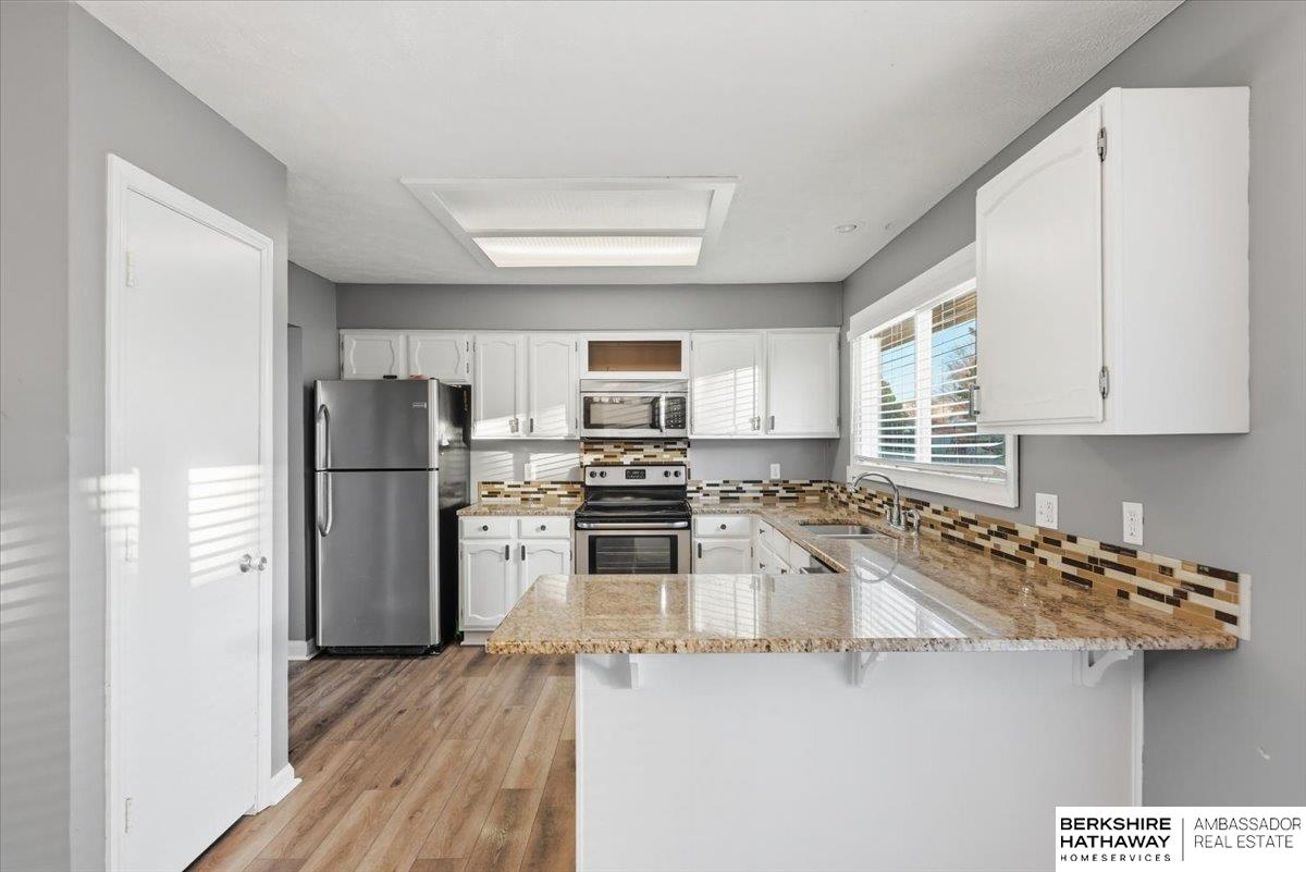 This stunning La Vista split-entry is the definition of move-in ready, featuring a massive list of high-value upgrades for ultimate peace of mind. The exterior shines with new siding and windows (2022) and a new oversized driveway (2021). Step inside to a modern, open main level with luxury vinyl plank flooring and a chef's kitchen boasting granite countertops and stainless steel appliances. The primary suite and secondary bedrooms are well-appointed, while the finished basement offers a cozy retreat with new carpet (2021). Enjoy summer nights on the new deck (2021) overlooking a professional retaining wall (2021) and a spacious fenced yard. Major systems are already handled: Roof (2017), Sump Pump (2019), and Furnace/Heat Pump (2015). Located just minutes from the vibrant new La Vista City Centre and top-rated schools. Storage shed and kids' playset included! Call me for a showing!