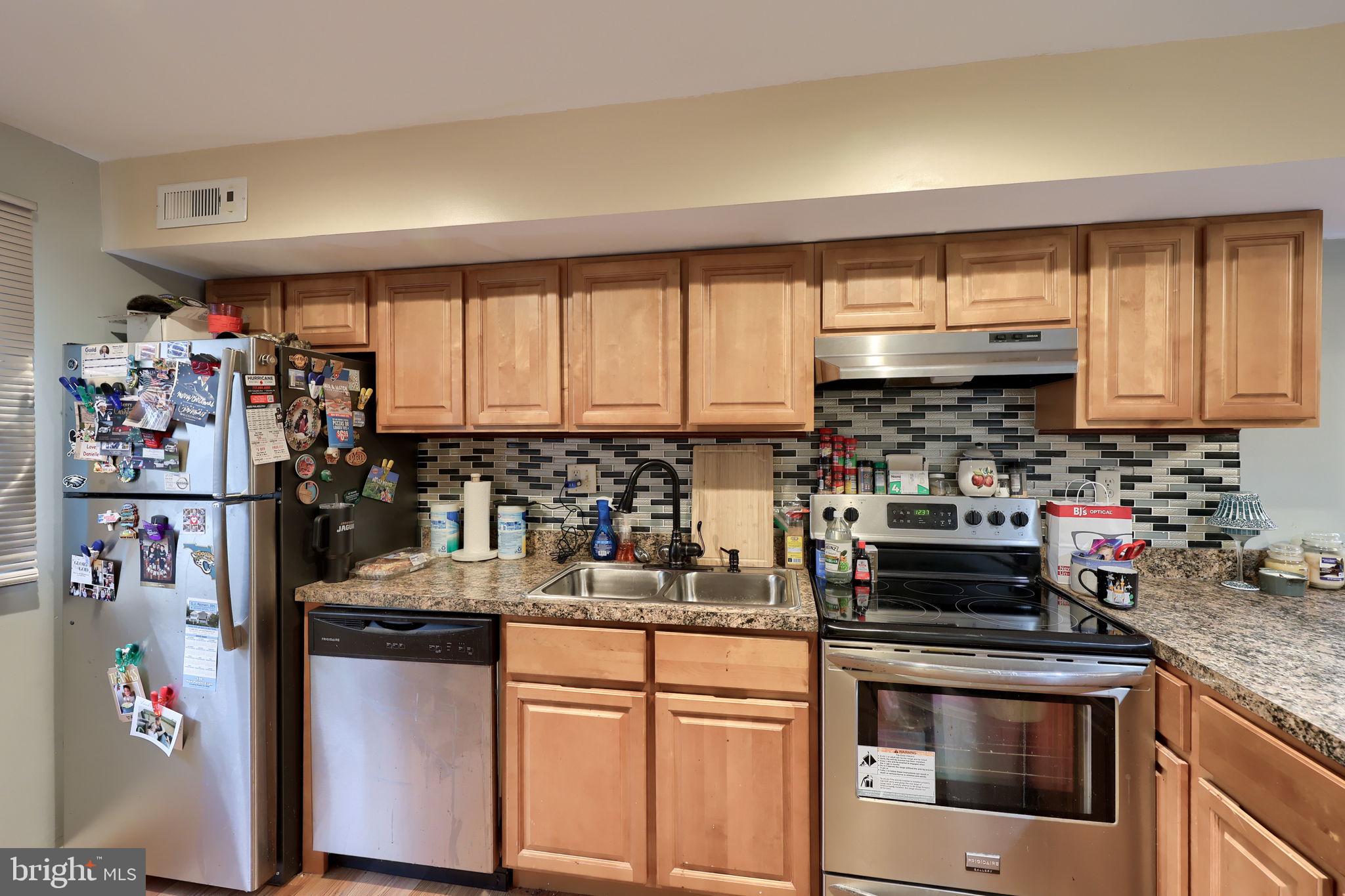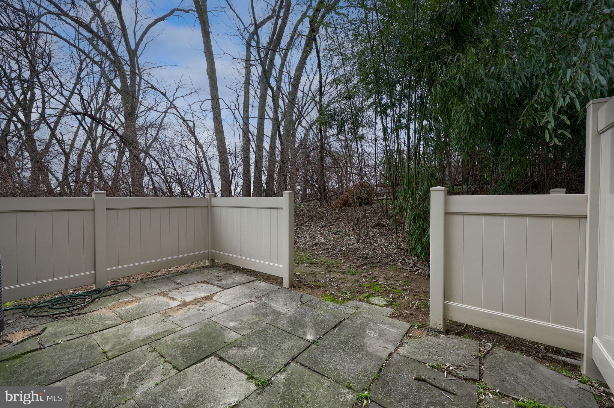 Brick end-unit home offering a bright, open floor plan and comfortable living spaces throughout. The eat-in kitchen features a breakfast bar, stylish tile backsplash, and ample cabinet and counter space. Upstairs, you'll find two spacious bedrooms and two full bathrooms, including a primary suite with an updated shower for a fresh, modern touch. A new front door adds to the home's curb appeal and overall value. Step outside to enjoy the private, fenced rear patio overlooking mature trees that provide a peaceful, natural backdrop.