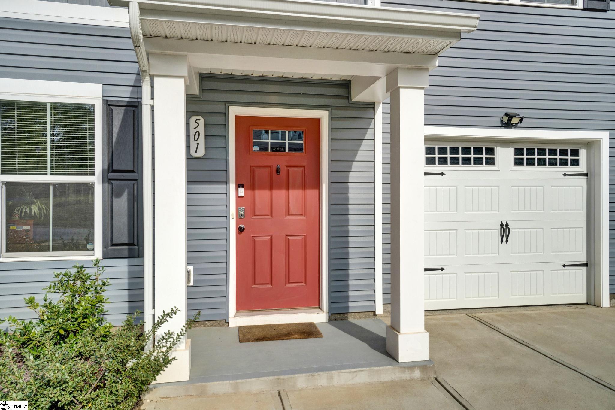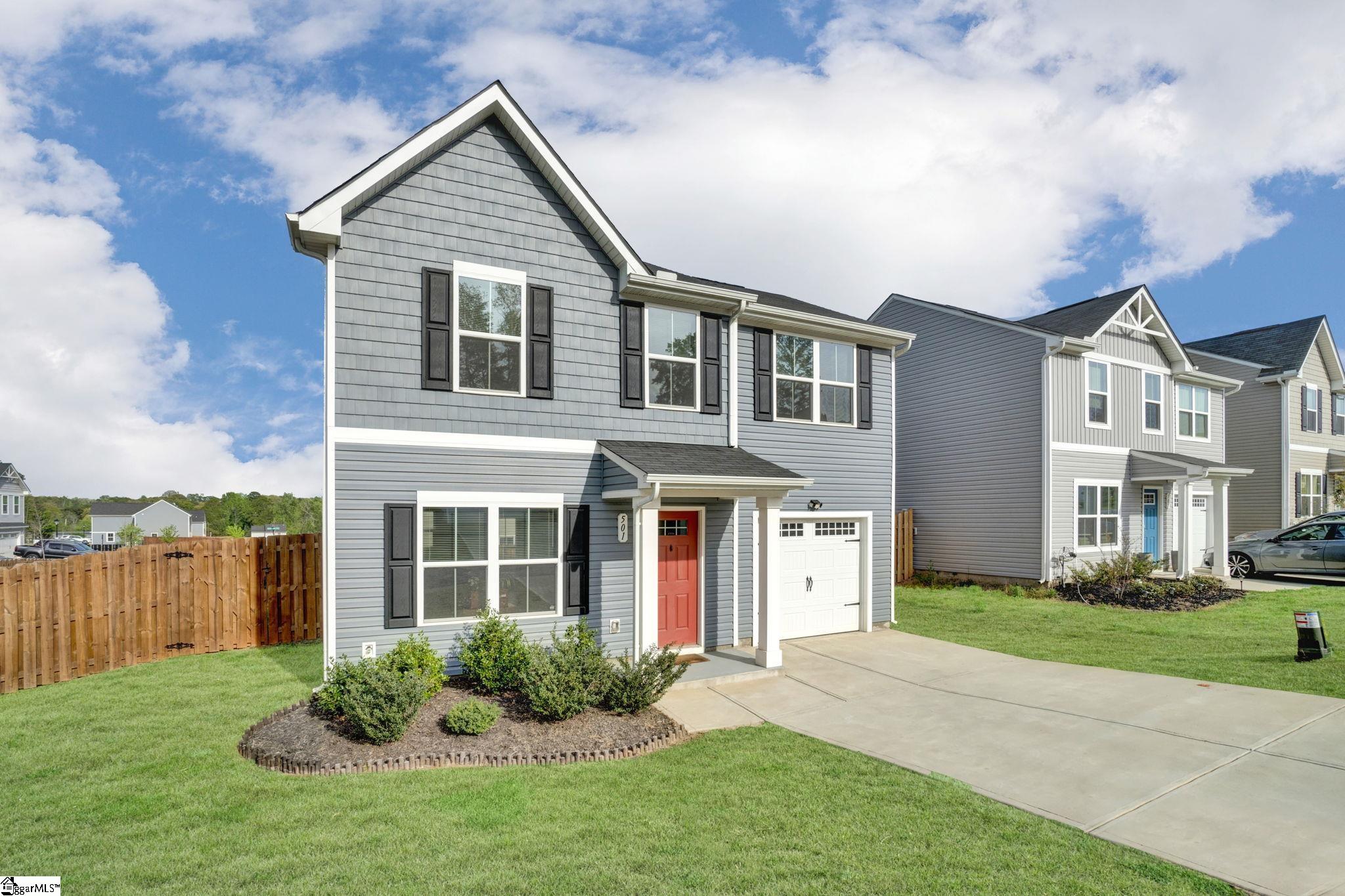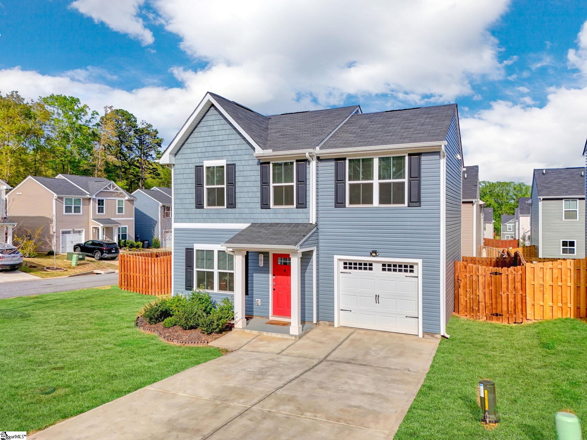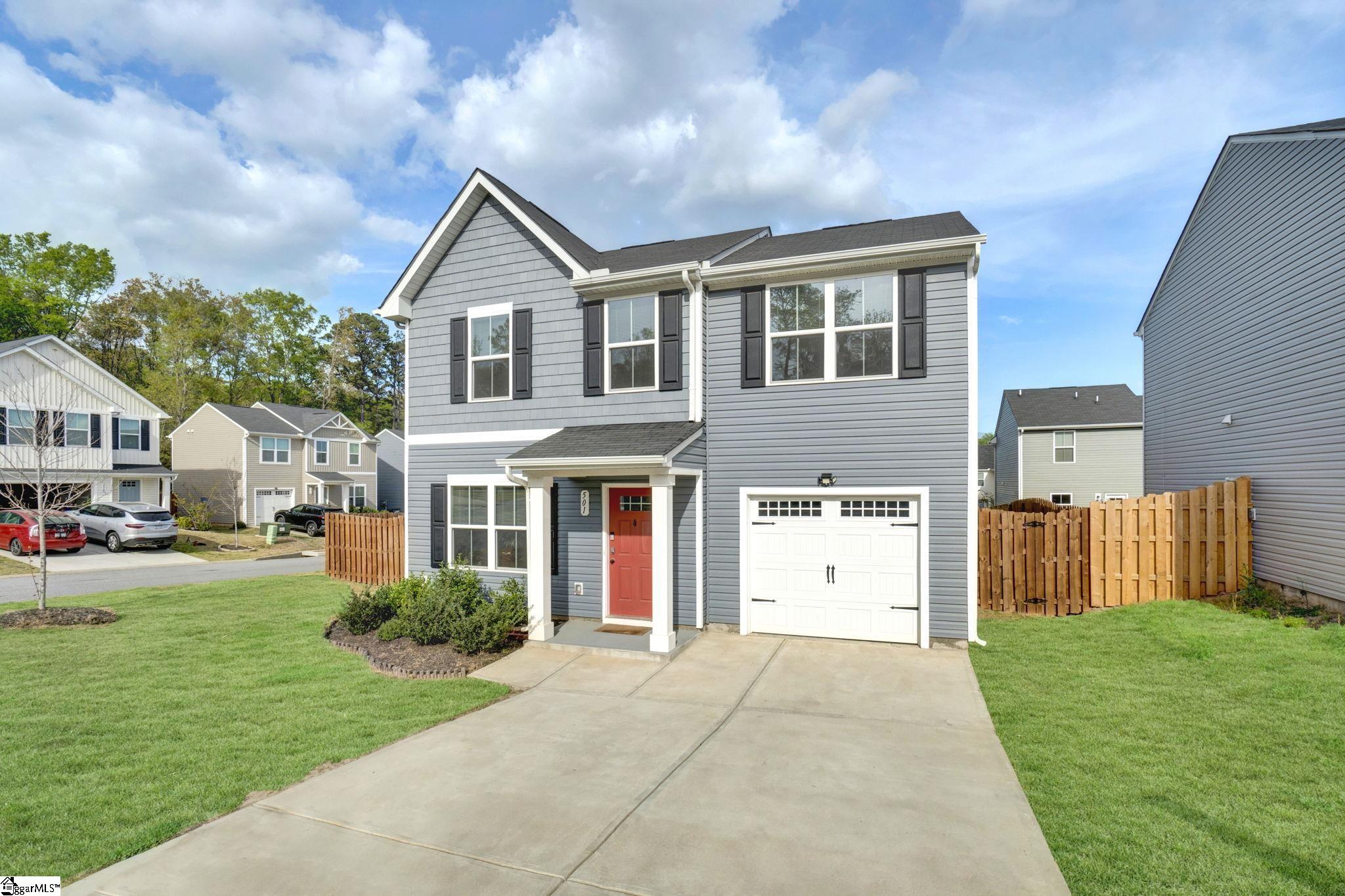 Welcome to 501 Mills Hill Way - a beautifully situated corner-lot home that offers both privacy and convenience, just minutes from beautiful downtown Greenville and the Swamp Rabbit Trail. Built in 2023, this home offers a neighborhood setting without sacrificing proximity to everything you need. Located at the end of a quiet dead-end street, this property boasts one of the largest lots in the community. Step inside through the cheerful red front door and you're welcomed by a bright, open floor plan. The living area flows seamlessly into a modern kitchen featuring stainless steel appliances, granite countertops, and a kitchen island that's perfect for casual dining. Upstairs, a sizable primary suite is filled with natural light and includes a full bathroom and walk-in closet. Two additional bedrooms share a second full bath, while the conveniently located second-floor laundry adds convenience to the floor plan. Outside, enjoy a fully fenced backyard and patio, perfect for relaxing spring evenings, gardening, or play. The one-car garage provides ample room for a full-size vehicle plus extra storage. What a charmer! 501 Mills Hill truly offers the best of comfortable living near the heart of it all. Schedule your showing today!