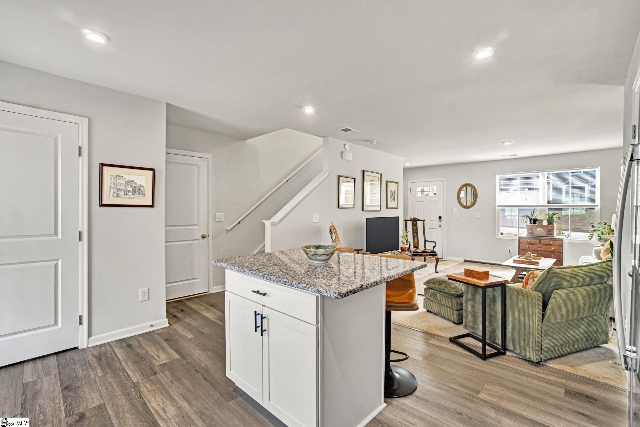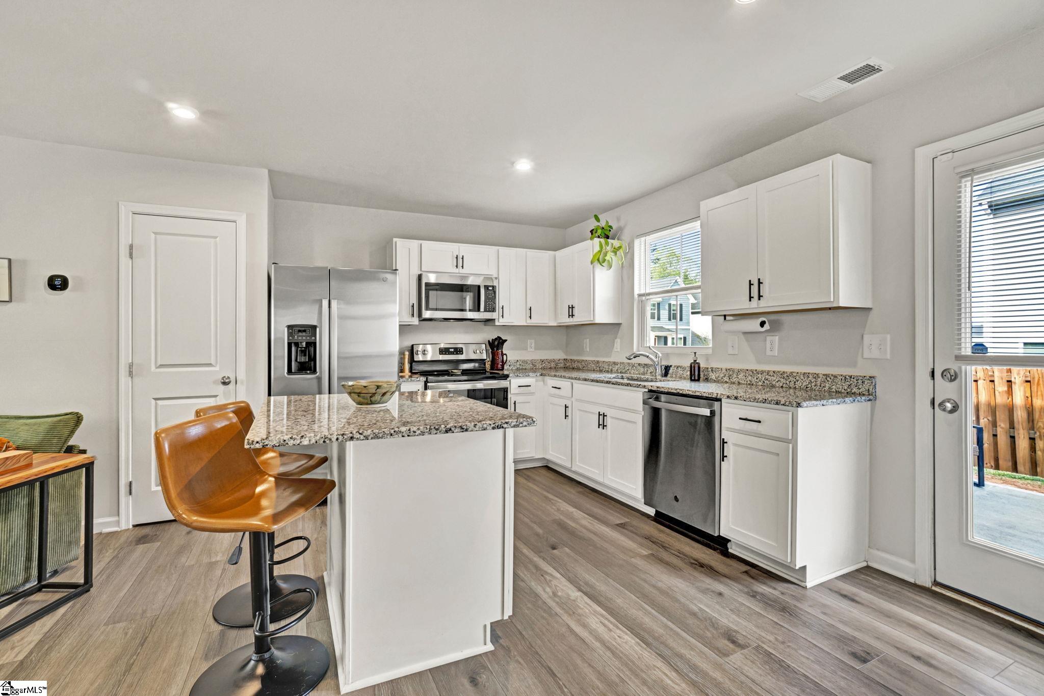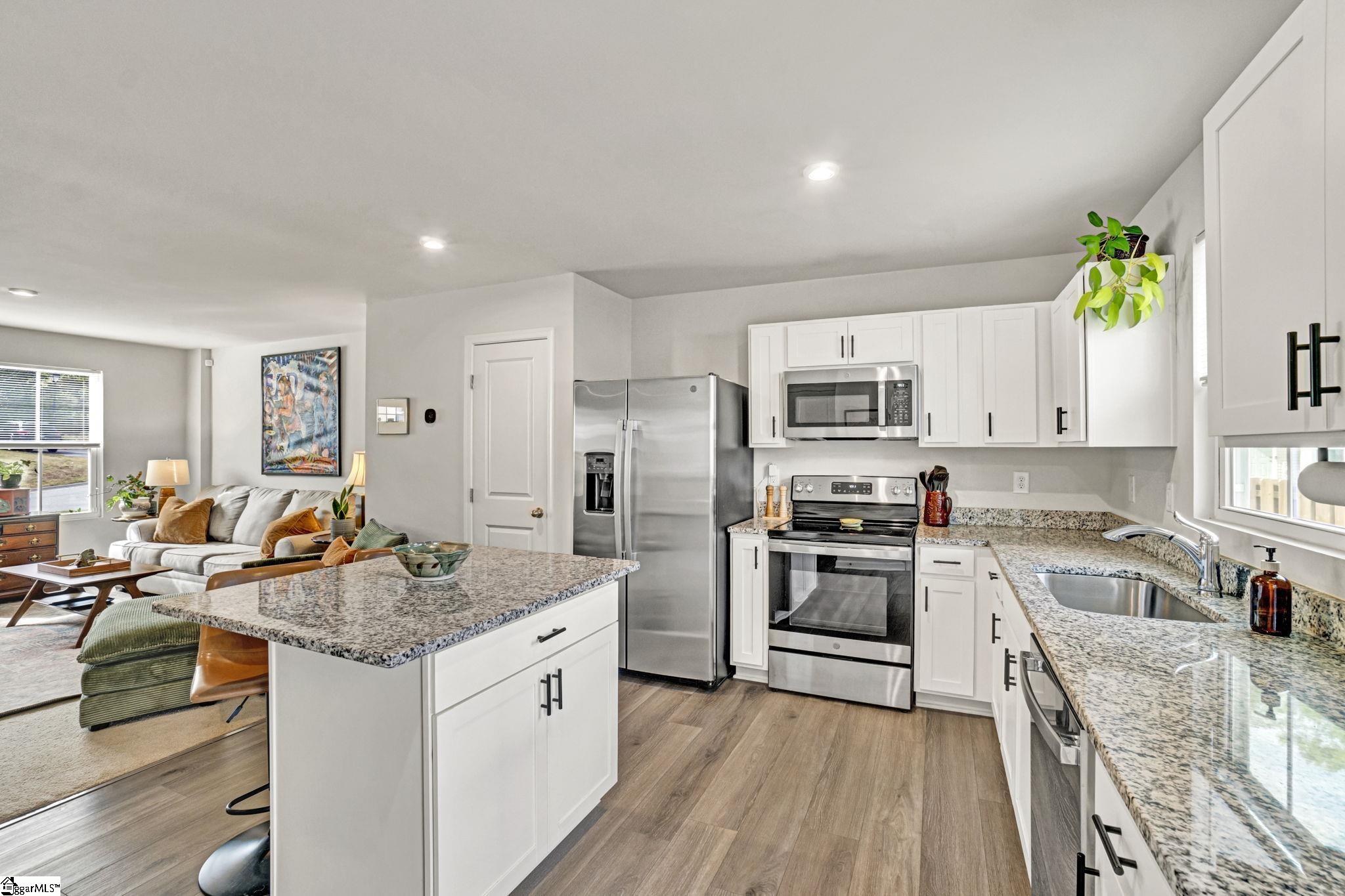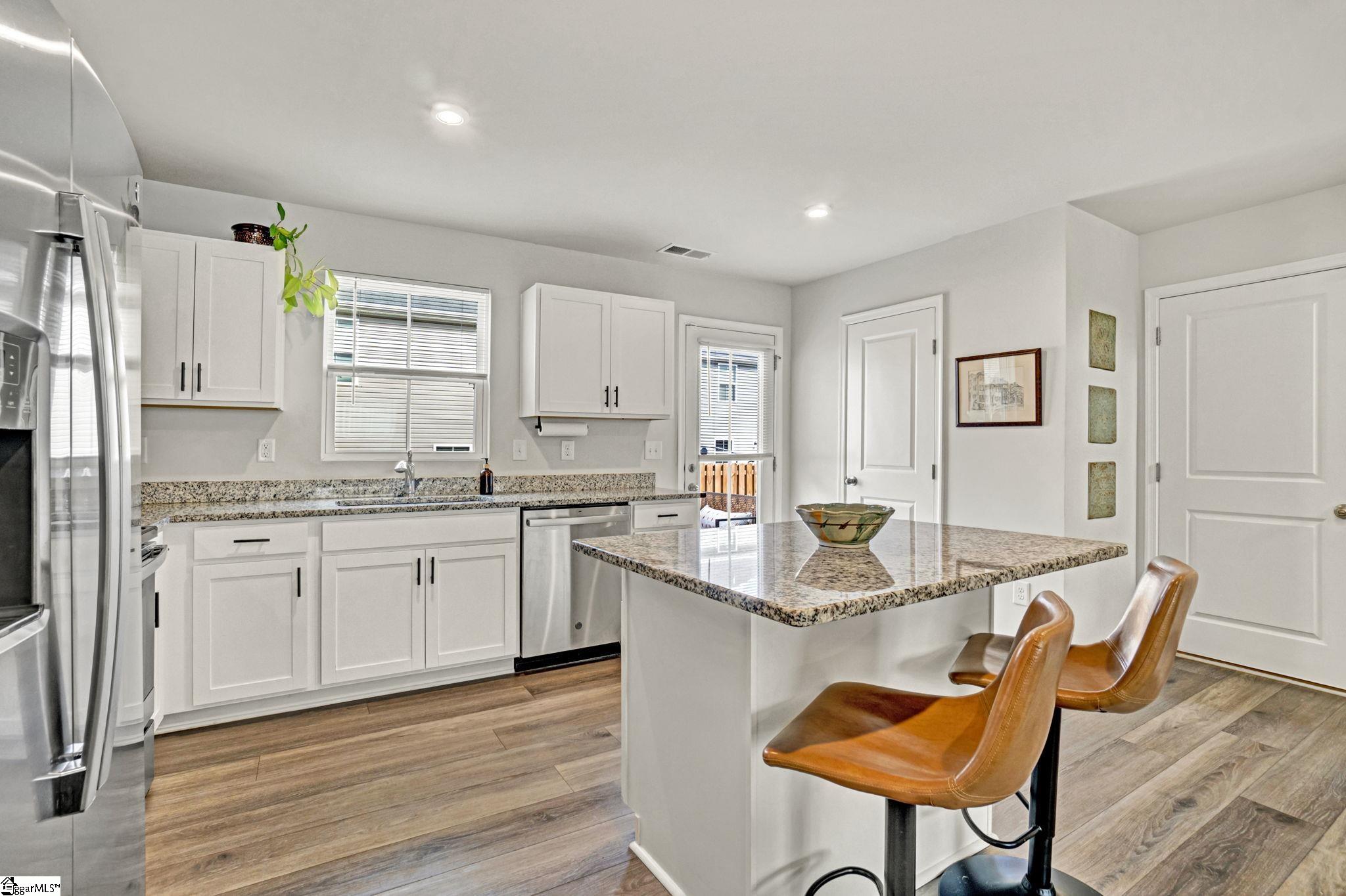 Welcome to 501 Mills Hill Way - a beautifully situated corner-lot home that offers both privacy and convenience, just minutes from beautiful downtown Greenville and the Swamp Rabbit Trail. Built in 2023, this home offers a neighborhood setting without sacrificing proximity to everything you need. Located at the end of a quiet dead-end street, this property boasts one of the largest lots in the community. Step inside through the cheerful red front door and you're welcomed by a bright, open floor plan. The living area flows seamlessly into a modern kitchen featuring stainless steel appliances, granite countertops, and a kitchen island that's perfect for casual dining. Upstairs, a sizable primary suite is filled with natural light and includes a full bathroom and walk-in closet. Two additional bedrooms share a second full bath, while the conveniently located second-floor laundry adds convenience to the floor plan. Outside, enjoy a fully fenced backyard and patio, perfect for relaxing spring evenings, gardening, or play. The one-car garage provides ample room for a full-size vehicle plus extra storage. What a charmer! 501 Mills Hill truly offers the best of comfortable living near the heart of it all. Schedule your showing today!