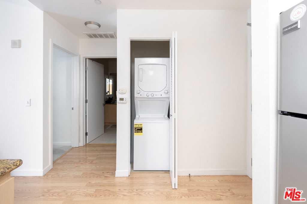 Located in the vibrant core of Downtowns Financial district, this one-bedroom residence at Library Court places culture, dining, and green space just steps away. The thoughtfully designed floor plan offers an airy feel, highlighted by tall ceilings and expansive east-facing windows that welcome morning light. The kitchen features stainless steel appliances, warm-toned wood cabinetry, and abundant prep space, while the enclosed bedroom offers flexibility for a home office or additional furnishings; the bathroom showcases tiled flooring and plentiful storage. Additional features include in-unit laundry, central HVAC, secured parking near the elevator, and access to a serene courtyard, fitness center, and onsite security, all just steps from the Library, Grand Central Market, museums, concert venues, Little Tokyo, Metro access, and countless dining and nightlife options.