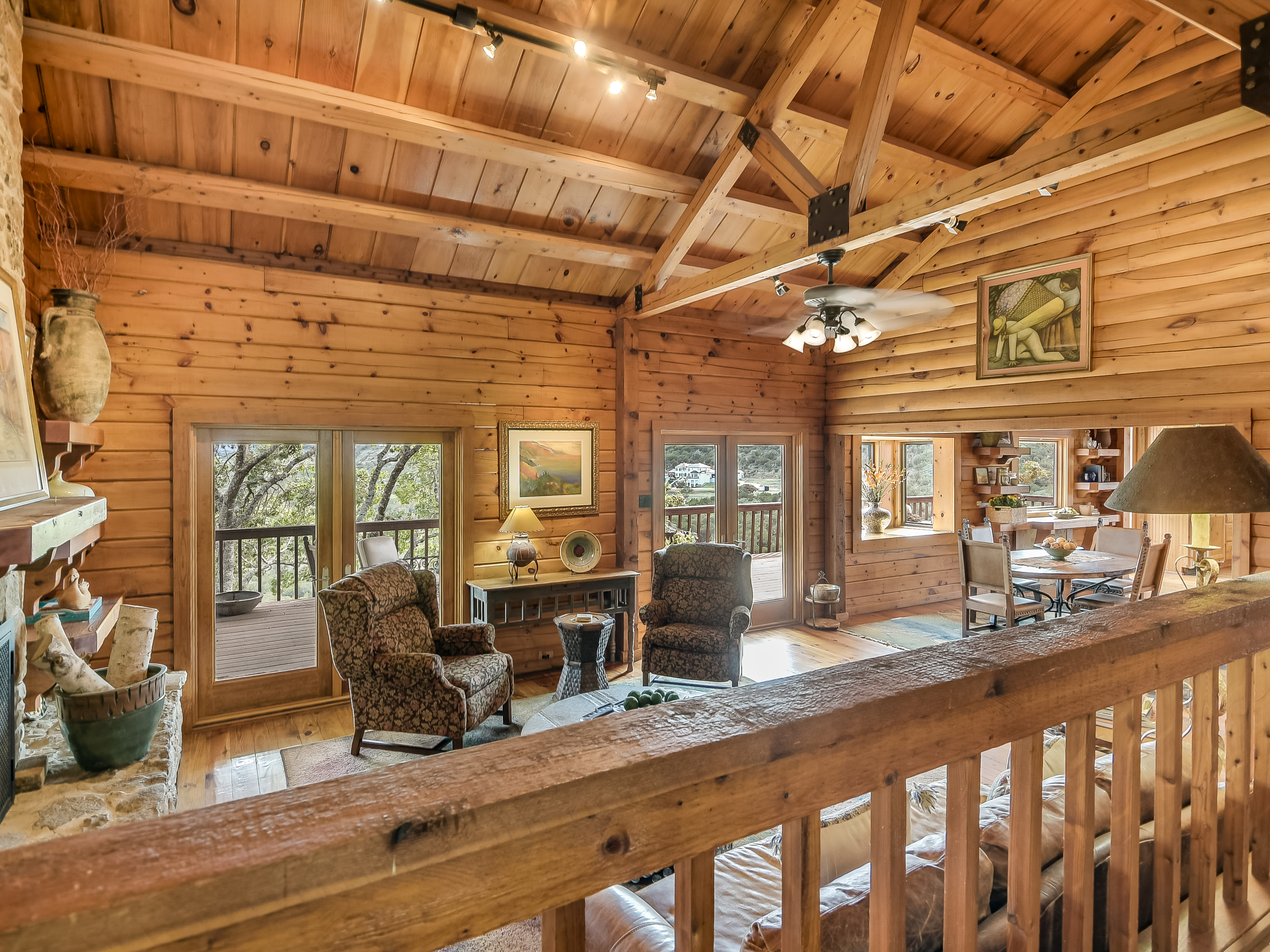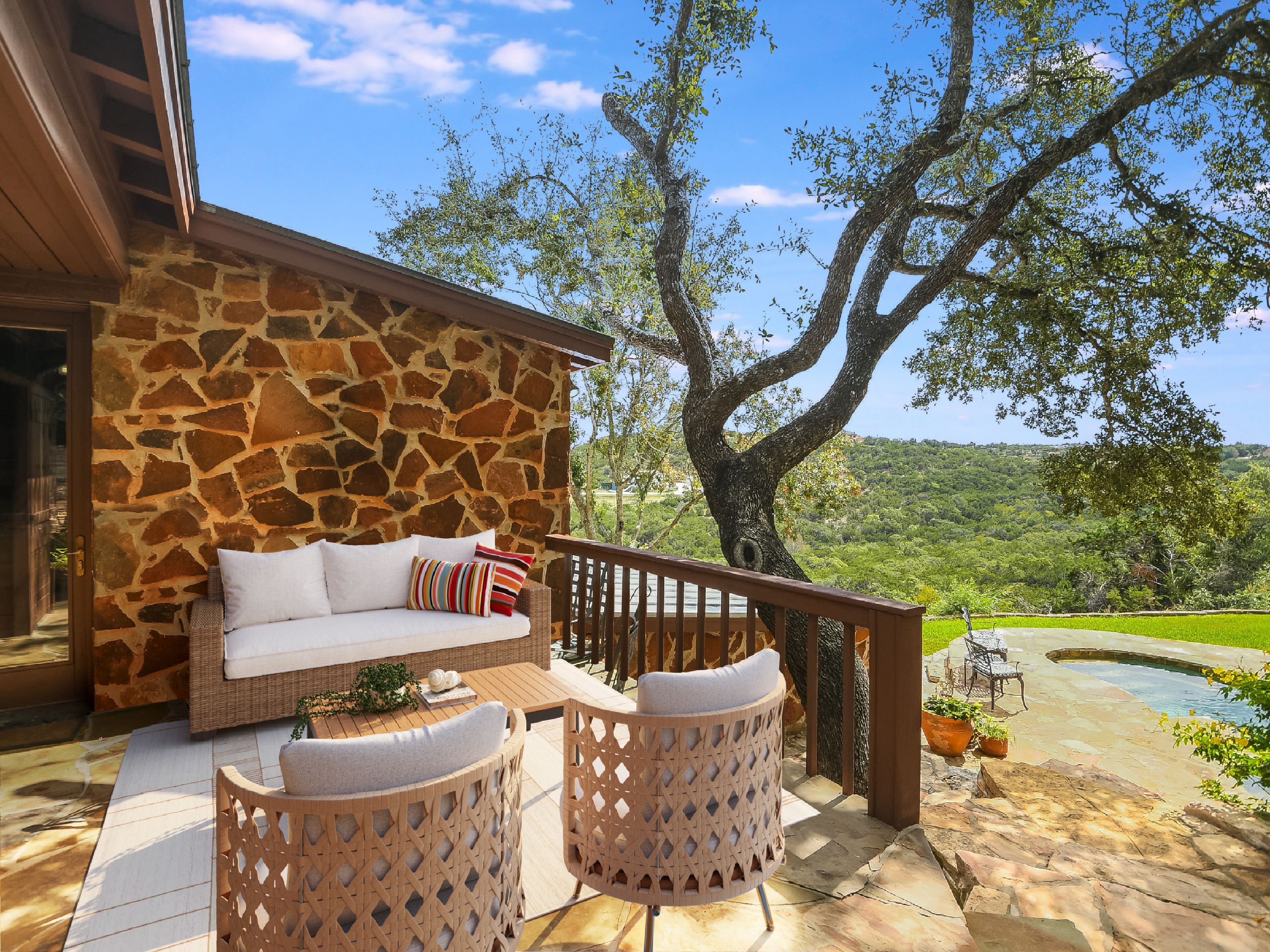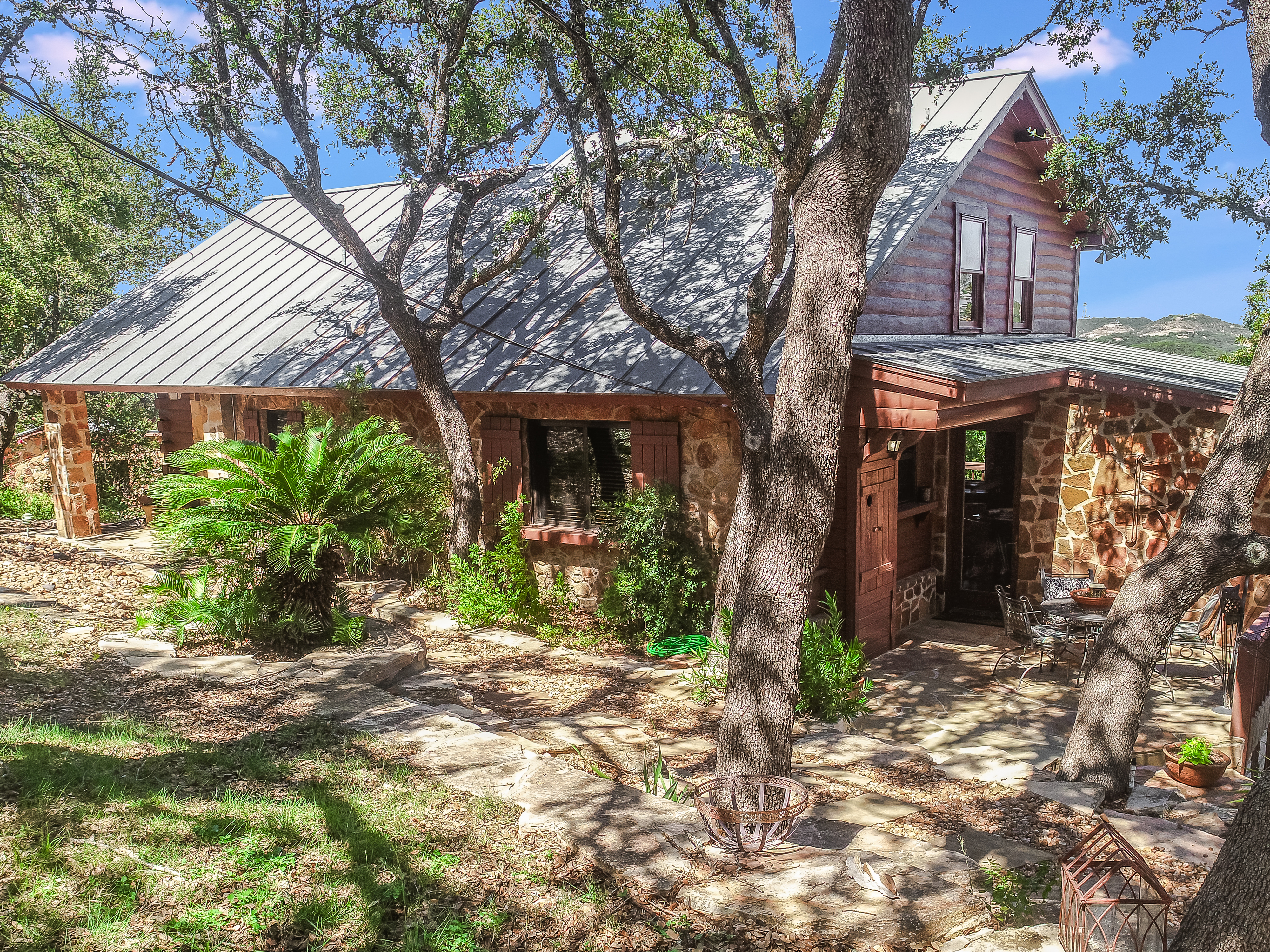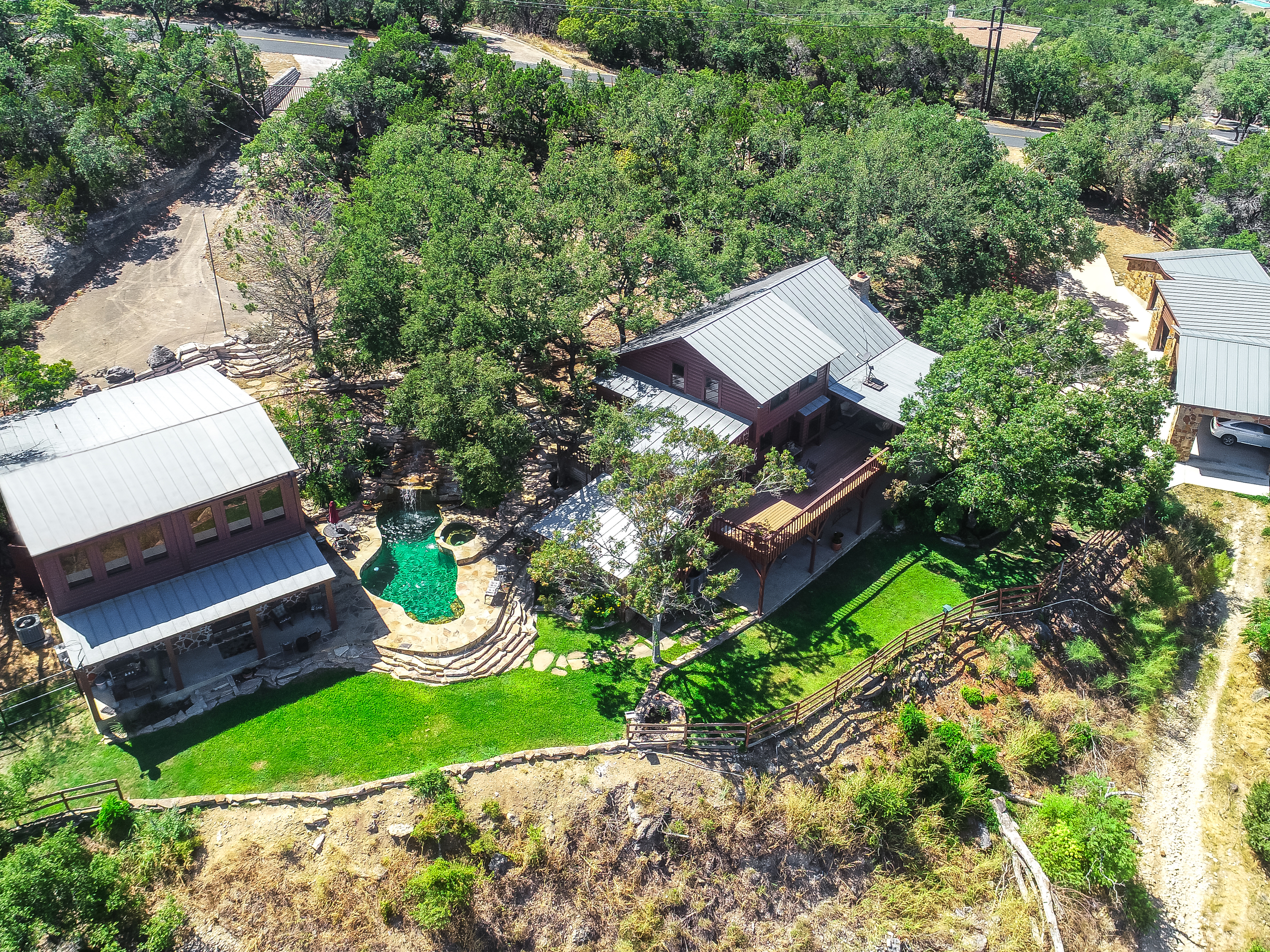 Where Civilization Meets Nature...this extraordinary 5-acre estate sits atop the highest point in Bexar County. Welcome to Ramblewood Resort, a private hilltop retreat featuring two distinctive homes surrounded by breathtaking Hill Country views. The grounds evoke a natural resort ambiance, with terraced landscapes, winding rock walkways, and a stunning waterfall that cascades into a hot tub beside a sparkling pool. A lush, level lawn invites alfresco dining, recreation, and unforgettable gatherings. The authentic log home, crafted in the 1980s from Northeastern white pine, offers approximately 3,500 square feet across three levels, with 3 bedrooms, 3 baths, and two fireplaces. Expansive porches and patios span the length of the main and lower levels, seamlessly blending indoor and outdoor living. A separate countryside cabin provides approximately 1,500 square feet of flexible space across two levels. Featuring a game room, kitchen, bath, office, and lofted sleeping areas, it offers privacy with its own dedicated drive. Additional highlights include a four-bay detached garage with sweeping views, metal roofs on all structures, and expansive lower acreage complete with a pond and open space for sports, picnics, and camping. Located in Country Place Subdivision, residents enjoy access to community amenities including a pool, tennis courts, and bridle paths surrounding the subdivision. Drive down Hwy 281 - San Antonio International Airport 18 minutes, The Pearl 24 minutes, and downtown to the Alamo just 26 minutes. Off Hwy 46 - Boerne is 46 minutes, and New Braunfels is 38 minutes.