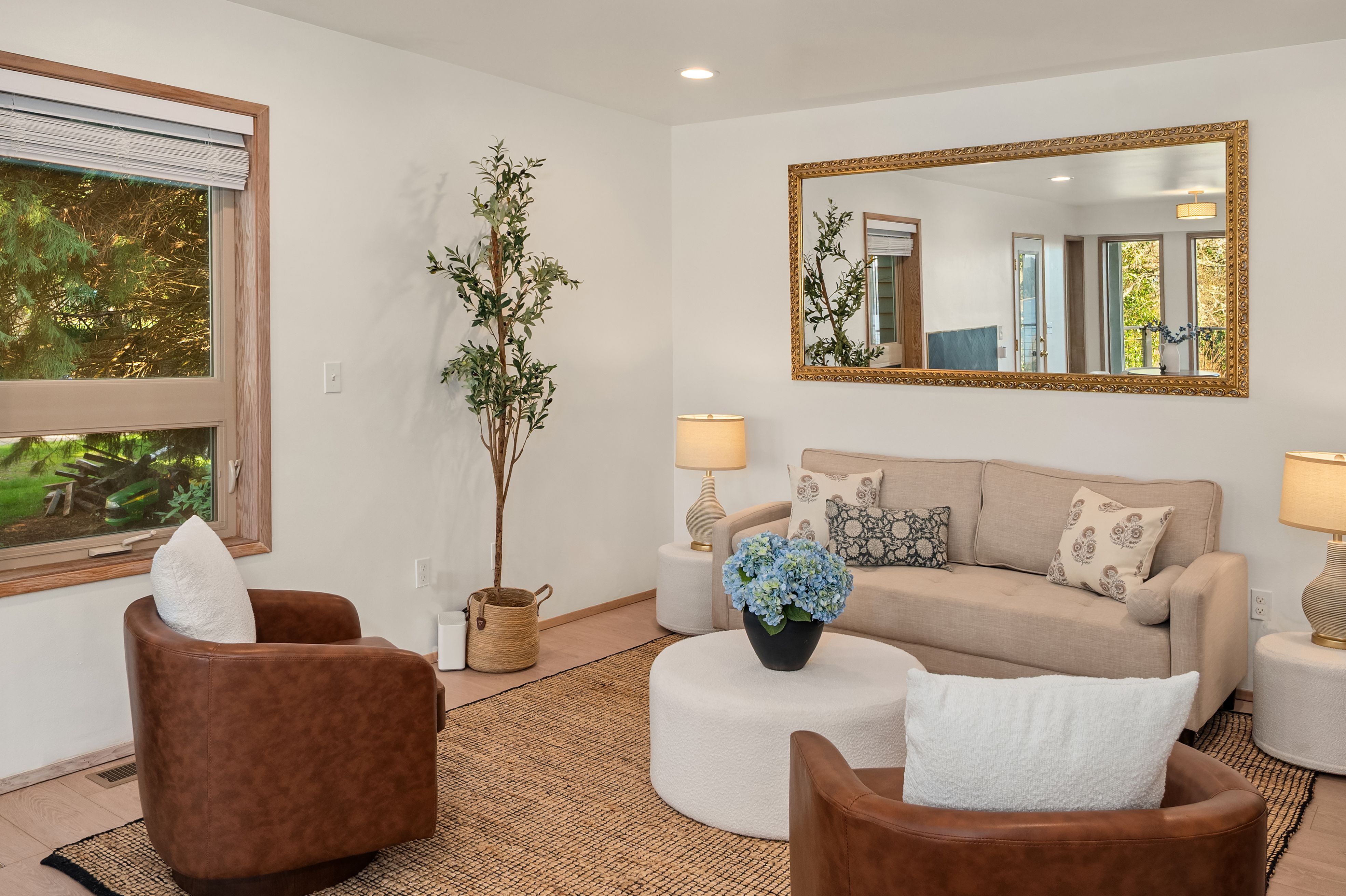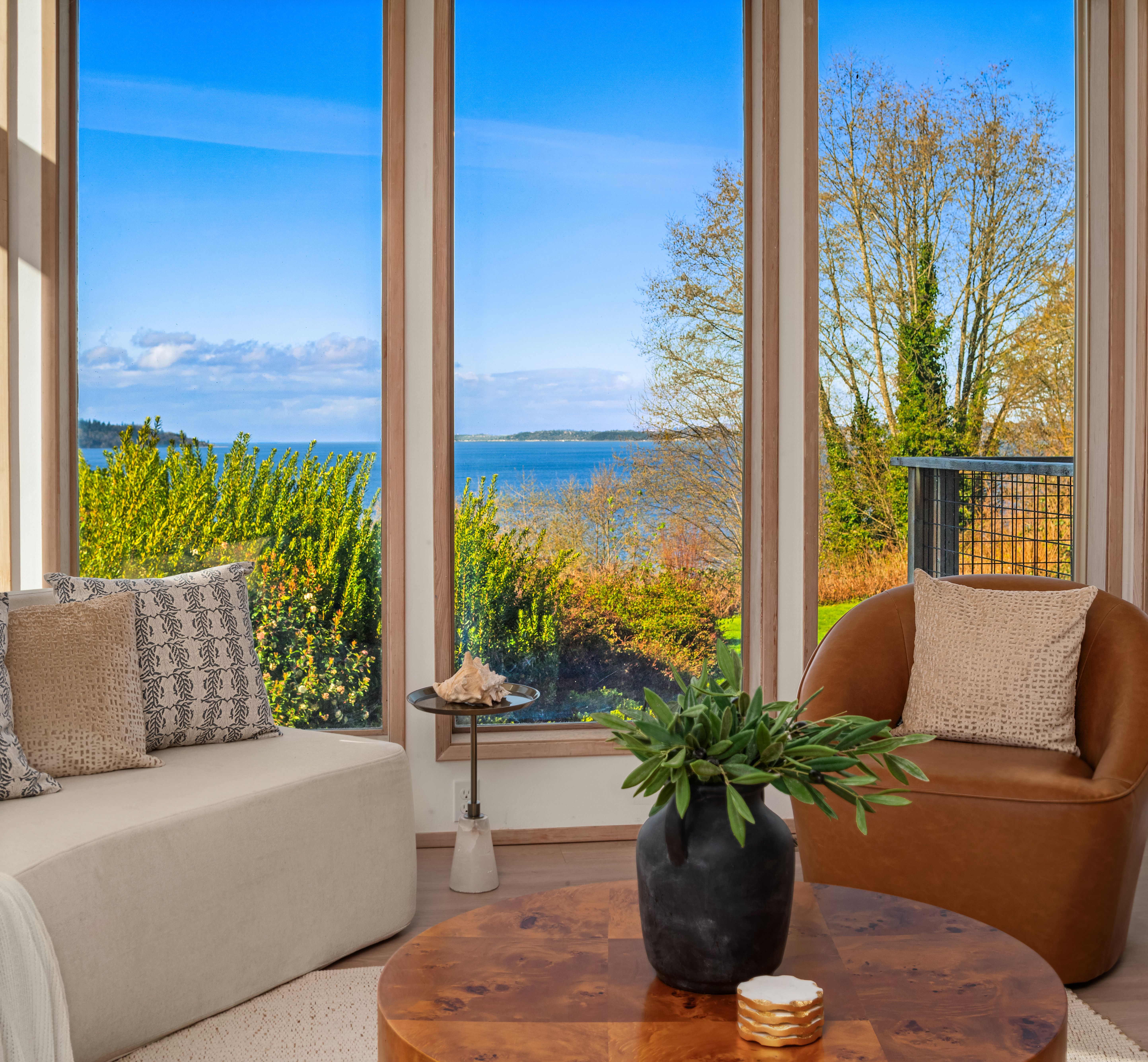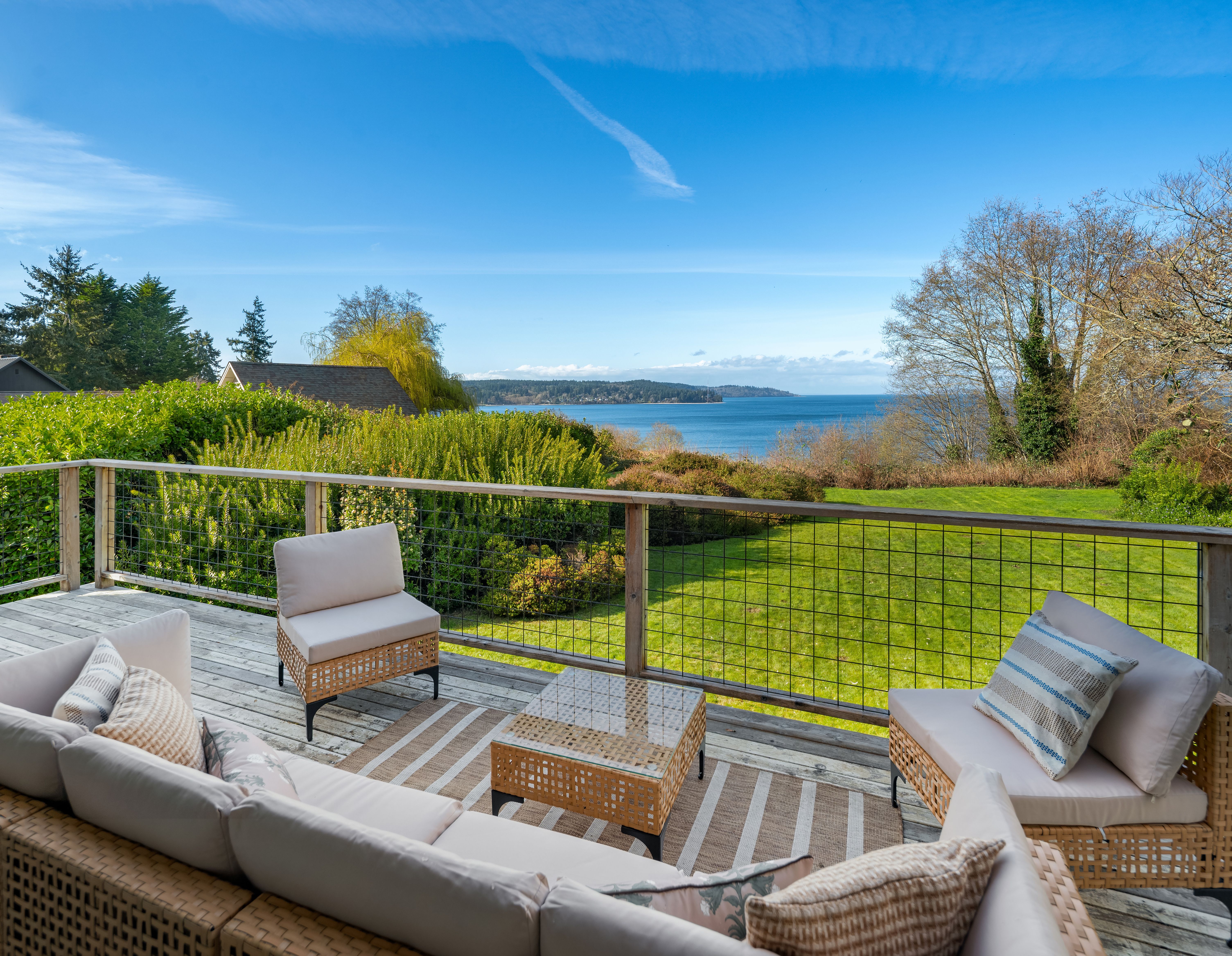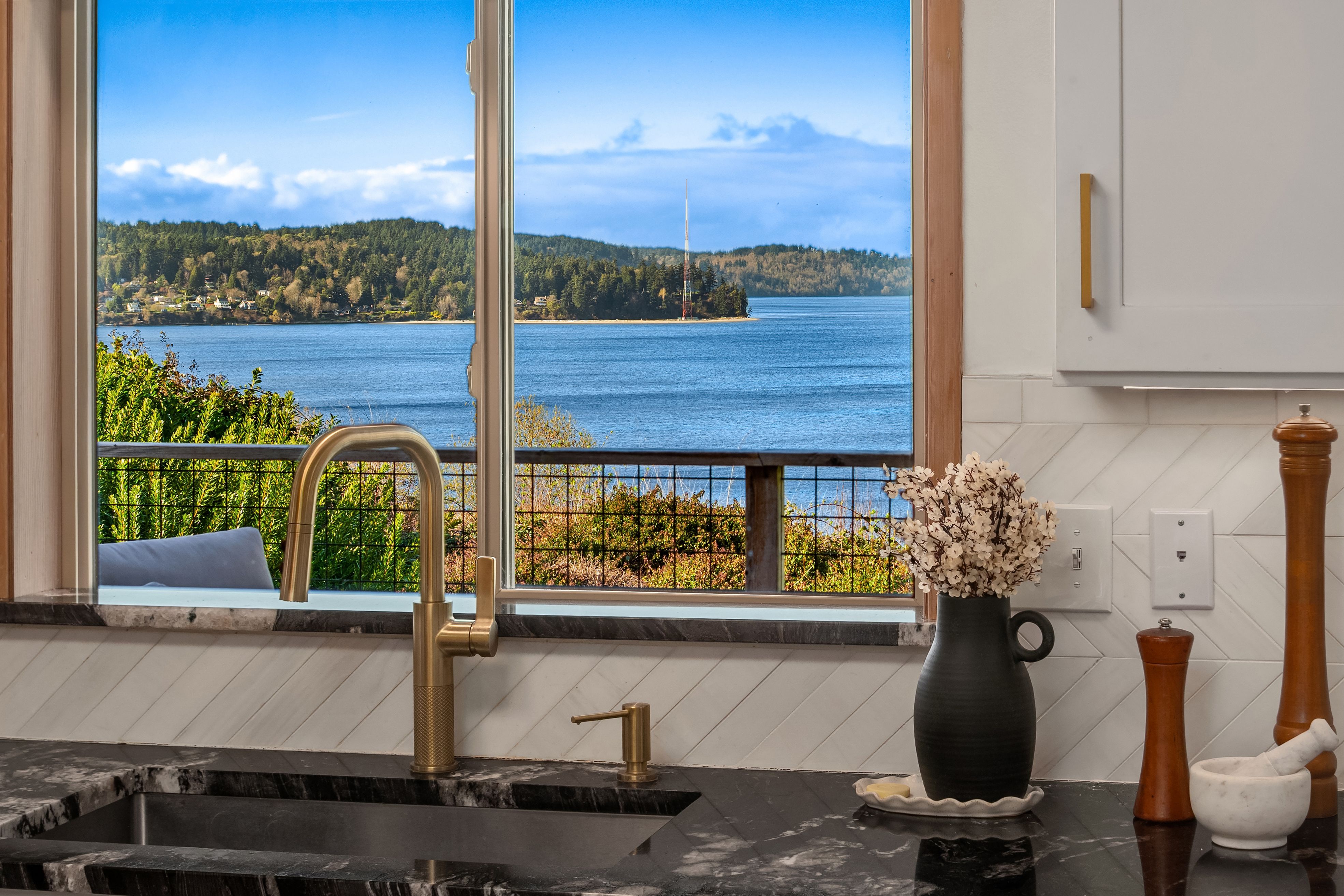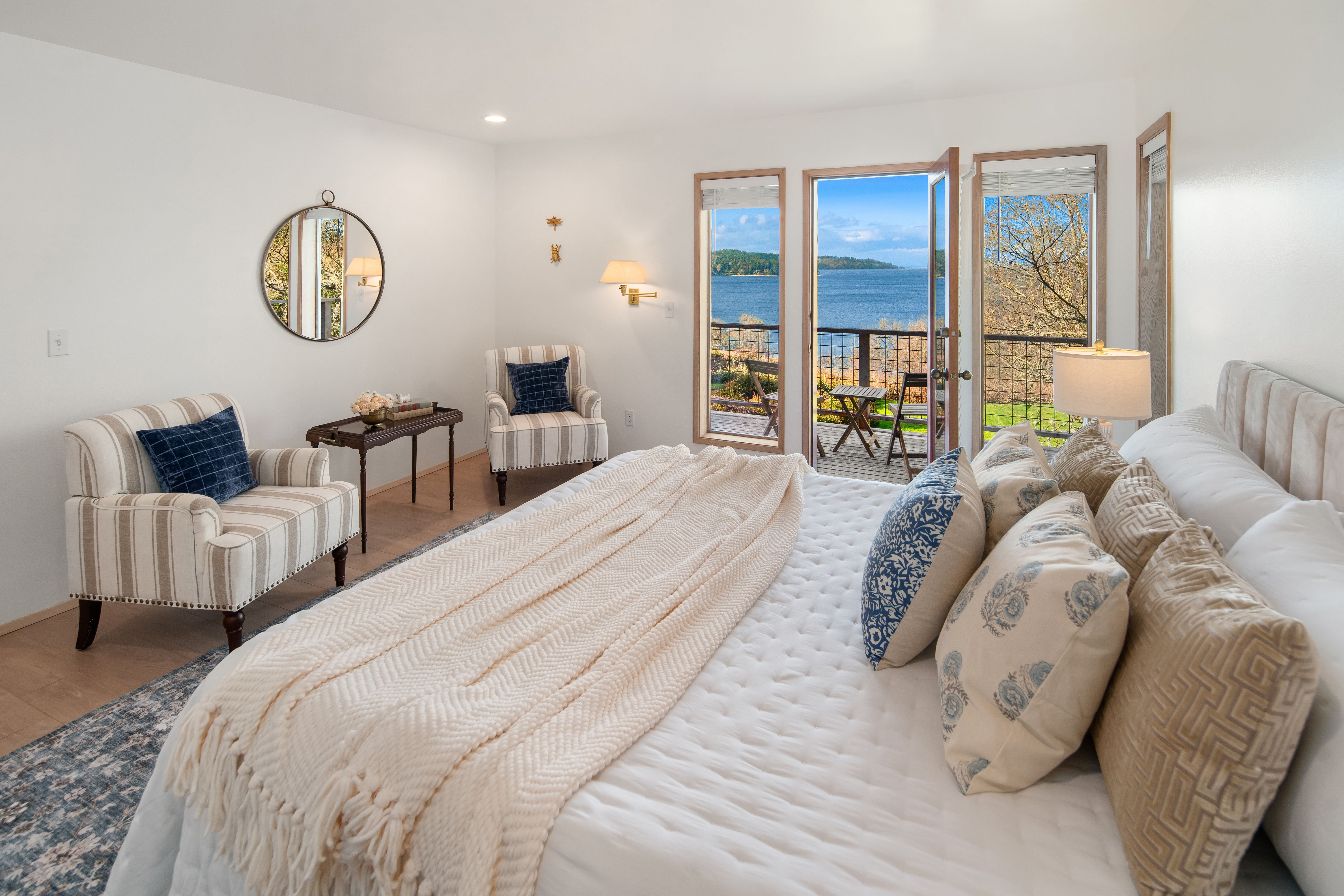 Privately sited along coveted Maury Park Road, this refined waterfront residence offers sweeping views across Tramp Harbor, KVI, Puget Sound shipping lanes, and distant city lights—an ever-changing backdrop of water, sky, and passing vessels. Designed to embrace its setting, the main level opens to a spacious view deck, ideal for both quiet mornings and entertaining. Upstairs, the primary suite and an additional bedroom share a private deck with elevated harbor vistas. The home includes 3 bedrooms, 4 baths, and approximately 3,600 square feet of thoughtfully designed living space. A newly completed daylight lower level adds versatility with fresh finishes, updated lighting, new carpet, and a luxurious infrared sauna—perfect for guests, wellness, or a private retreat. Large windows and balanced proportions make this level feel like a seamless extension of the home. This home has been lovingly maintained to provide it new owners with a legacy opportunity far beyond. Come view and see for your self what has been procured for you and your buyers over generations of love and care. Waterfront living is defined here by uninterrupted views and a strong connection to nature—calm, expansive, and quietly striking. An efficient heat pump provides year-round comfort, while meticulous care reflects lasting quality. A signature arbutus tree marks the entrance, offering a fitting introduction to this elegant Vashon Island retreat.