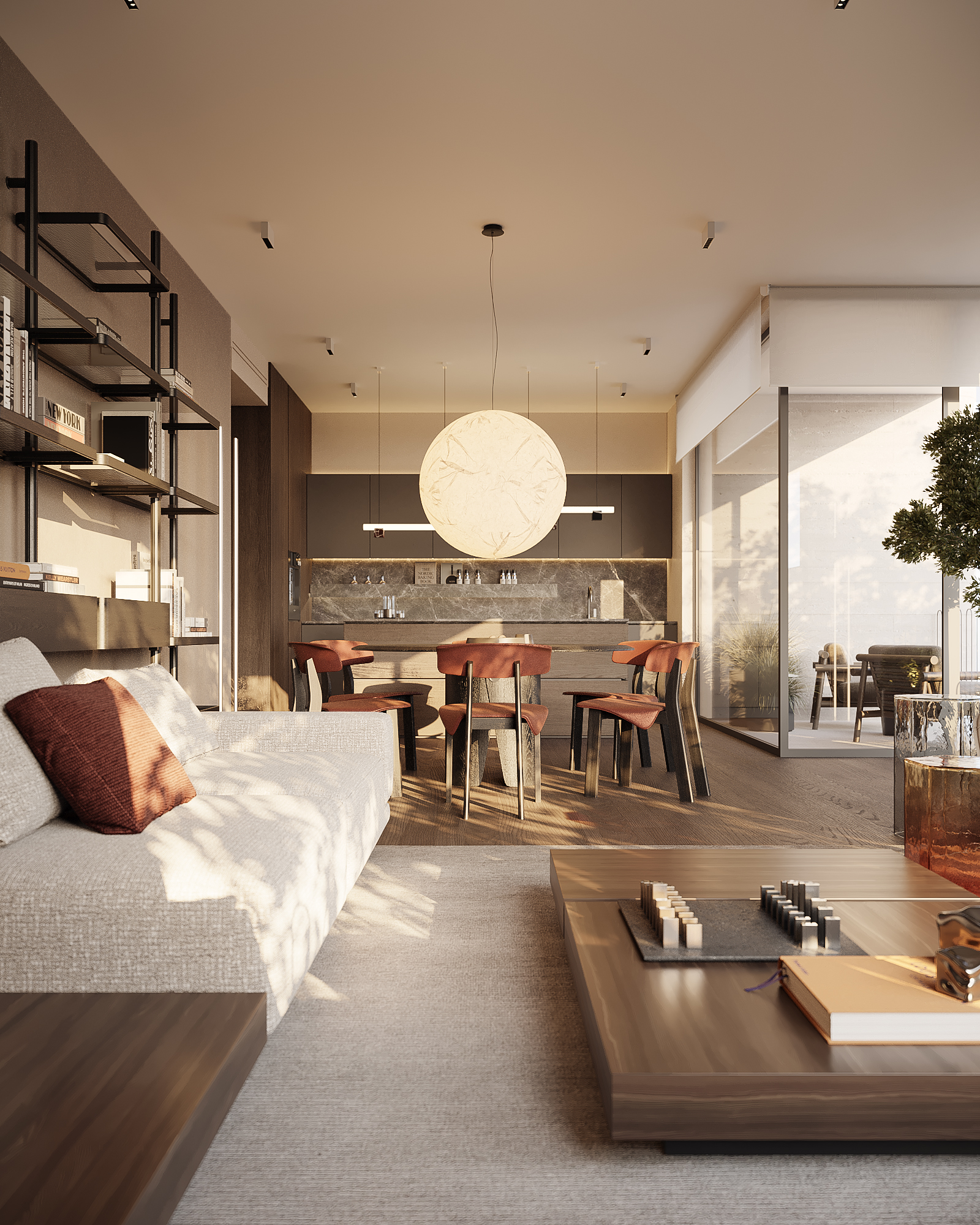 Interiors feature premium oak hardwood flooring, Rust-brand kitchens with stone countertops and Gaggenau appliances, bathrooms with natural stone finishes and PVD-coated fixtures, air conditioning, and underfloor heating throughout. Expansive glazed facades flood each residence with natural light.