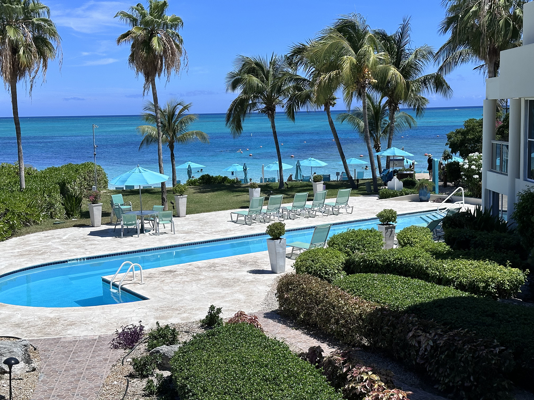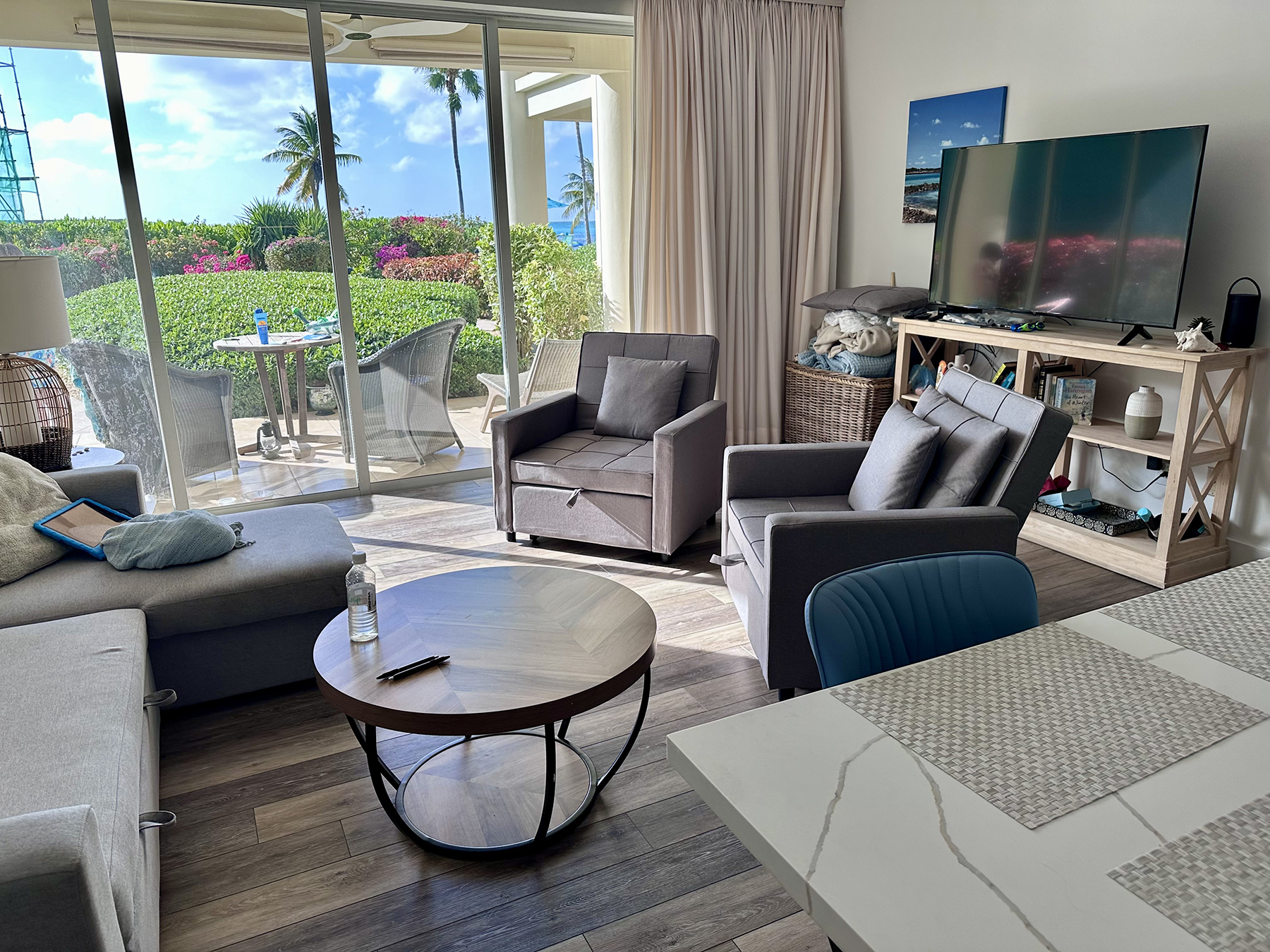 Experience beachfront living in this newly renovated, 1-bedroom, 2-bathroom 990 sq. ft. oceanfront condo at Coral Gardens on Grace Bay. Ideally positioned on one of the most coveted stretches of Grace Bay Beach, this beach level condo offers breathtaking ocean views, direct beach access, and a seamless blend of modern luxury and island charm. Showcasing a sophisticated coastal design with chic furnishings and a fresh, modern color palette renovations include a new A/C system, on demand hot water and new stainless steel appliances. The kitchen is both stylish and functional, offering granite countertops, beautiful blue glass tile backsplash, custom cabinetry, as well as a new water filtration system. The primary suite features a king bed, ample storage, and an en-suite bath, while the open-concept living area includes a queen pullout sofa and a second full bathroom, ensuring comfort and privacy for owners and guests alike. The dining and living spaces seamlessly flow through full width sliding doors to a private patio, surrounded by lush tropical landscaping, providing an idyllic setting to enjoy morning coffee or evening cocktails while soaking in the turquoise ocean views of Grace Bay Beach. As part of the Coral Gardens Resort, this unit grants access to two outdoor pools, a beachfront restaurant, lush gardens, and dedicated beachside service as well as the great vibe of “Somewhere Café” – think, Tex/Mex meets the Islands! Just steps from Smith’s Reef—one of the best snorkeling spots in Turks and Caicos, this prime location offers a perfect mix of natural beauty and accessibility. Whether you are seeking a private beachfront retreat or a property with rental potential, this condo offers the versatility to rent through VRBO, Airbnb, or the resort’s management program, allowing for a variety of ways to generate income while enjoying their own personal slice of paradise.