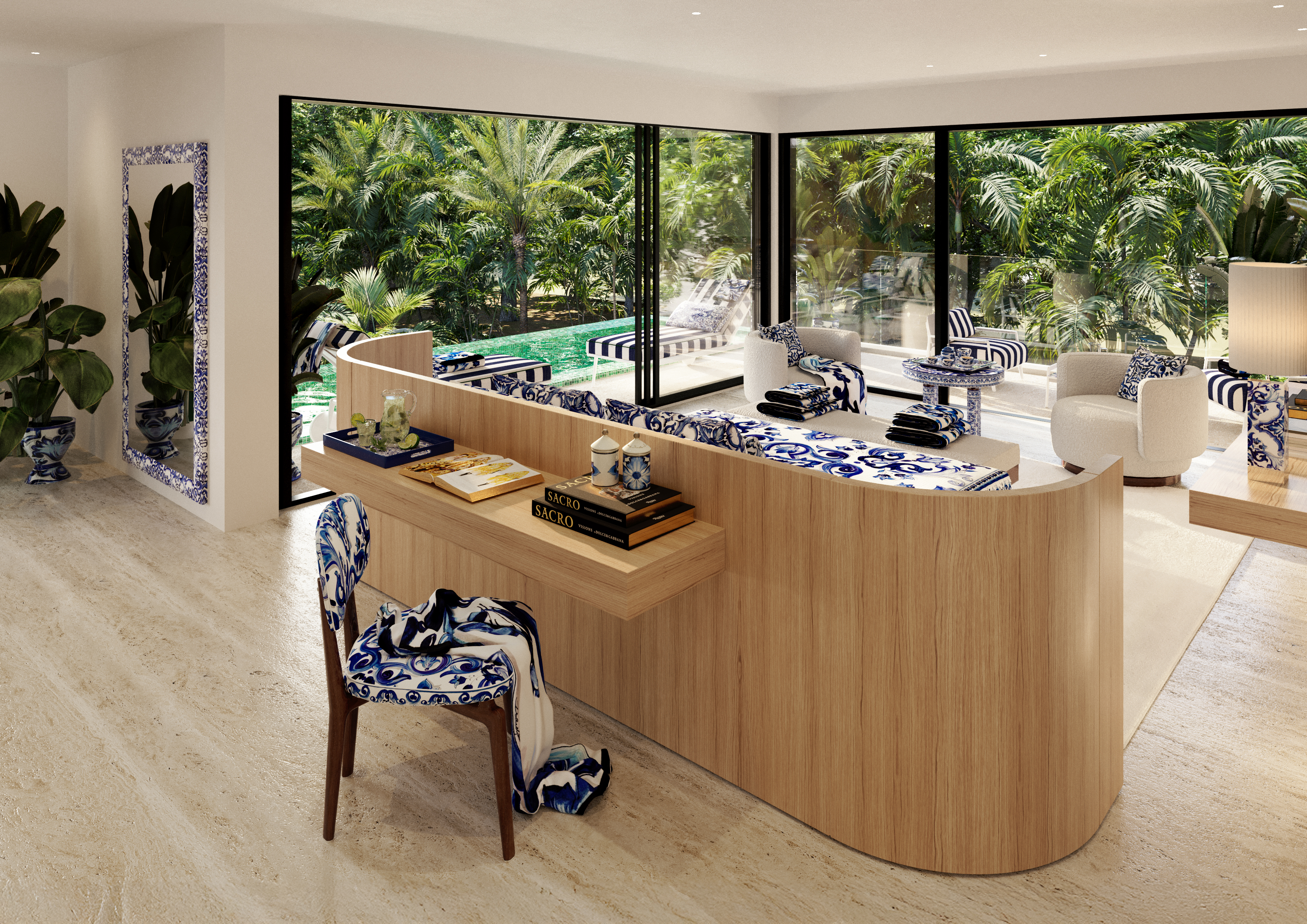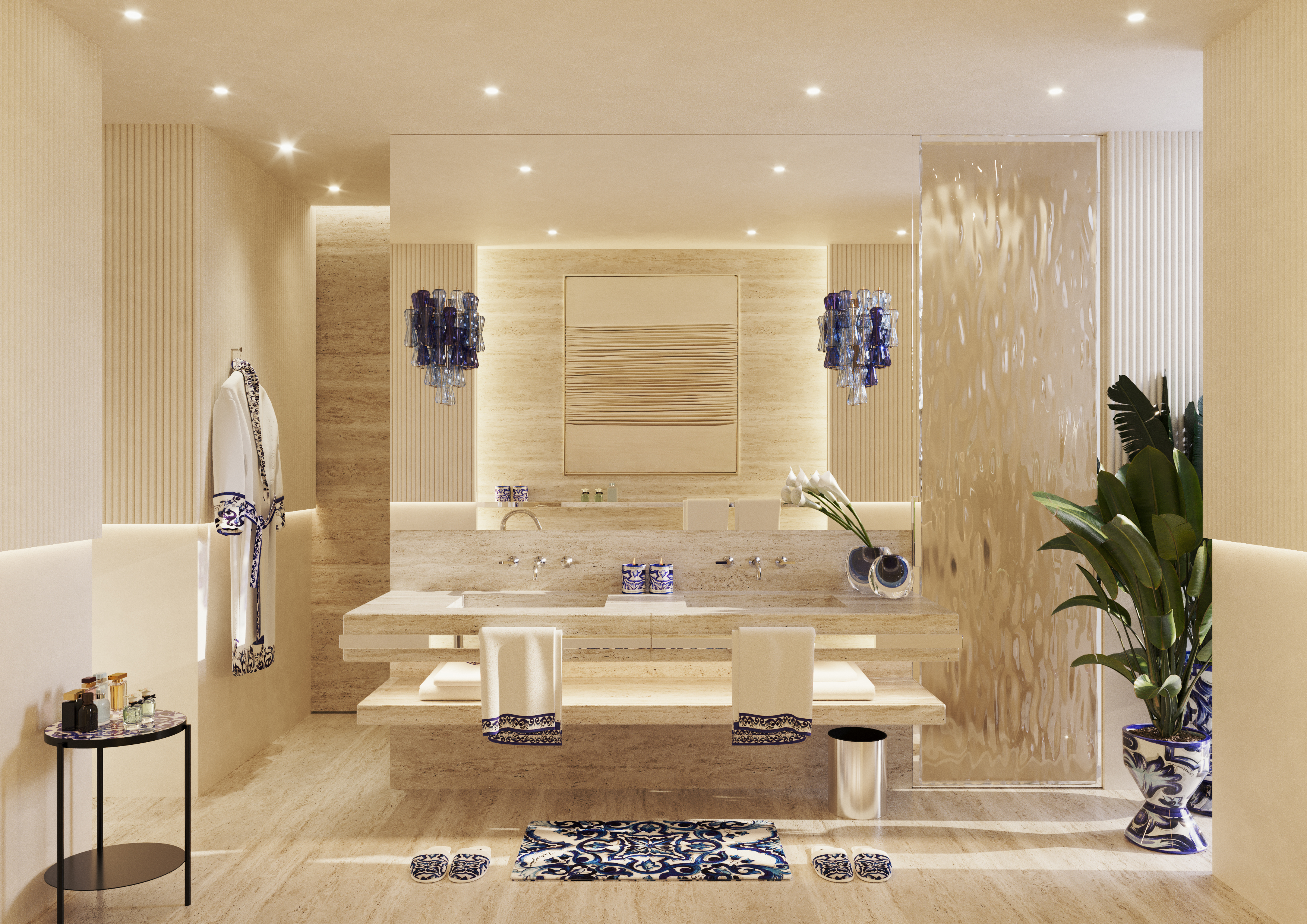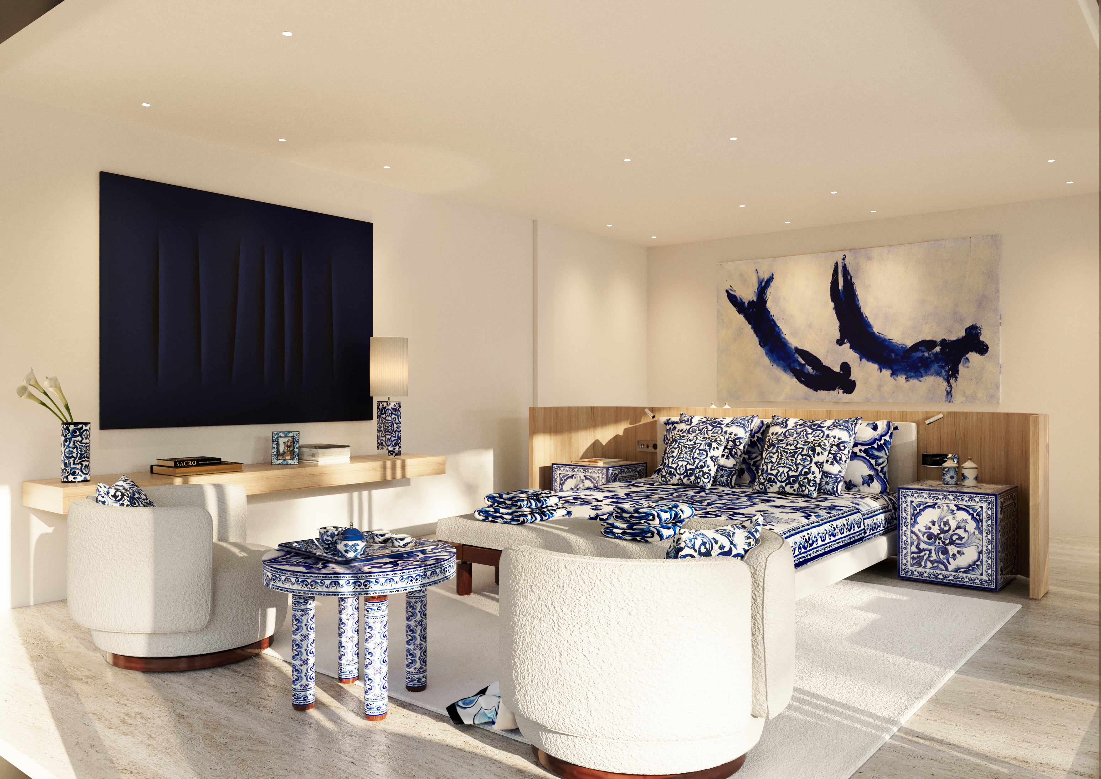 Bold yet fluid forms, refined textures, and handcrafted elements create a dialogue between contemporary minimalism and Italian sensuality. The iconic Blu Mediterraneo motif flows through ceramics, textiles, and glass, transforming each space into a composition of memory, craftsmanship, and timeless elegance.