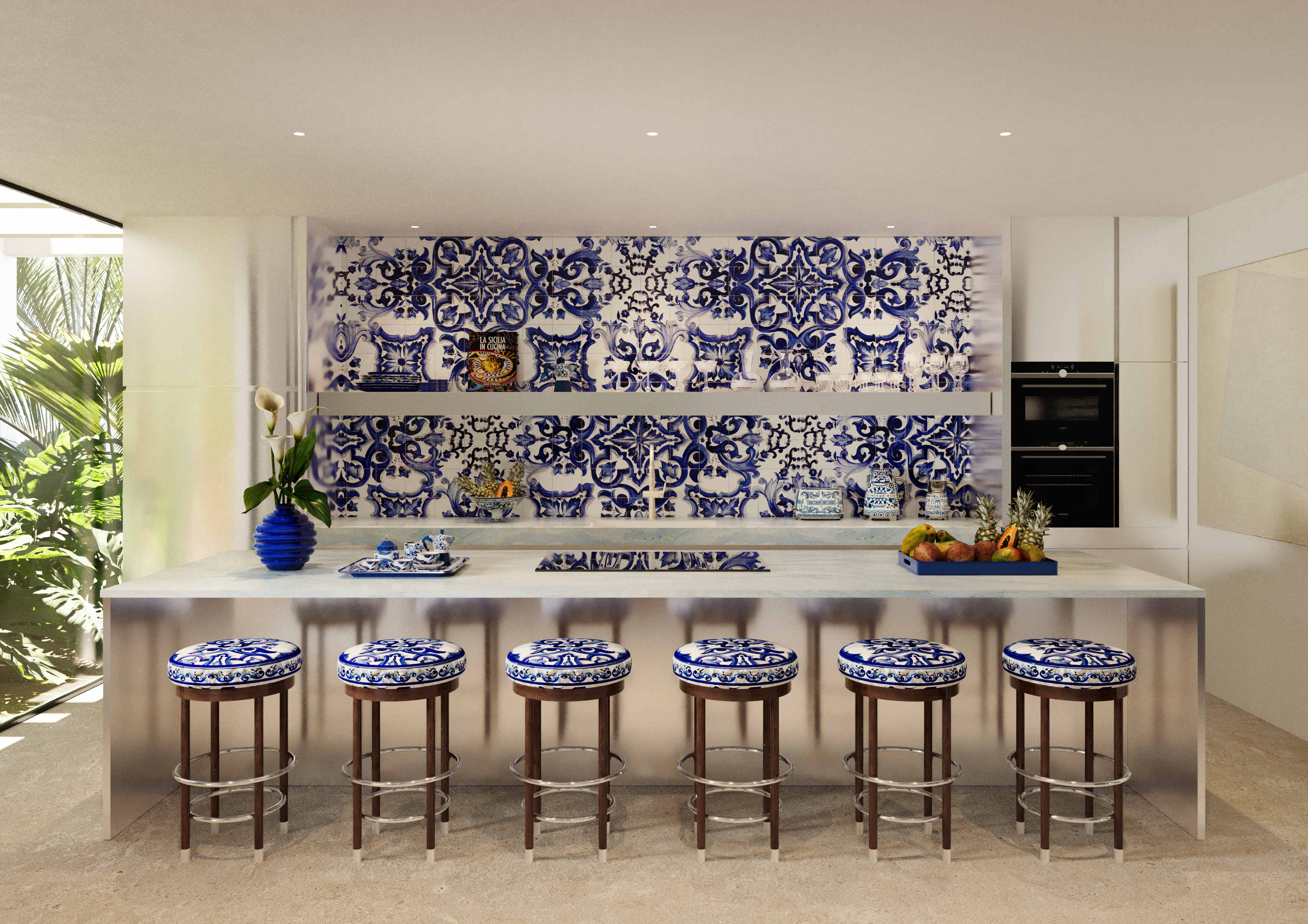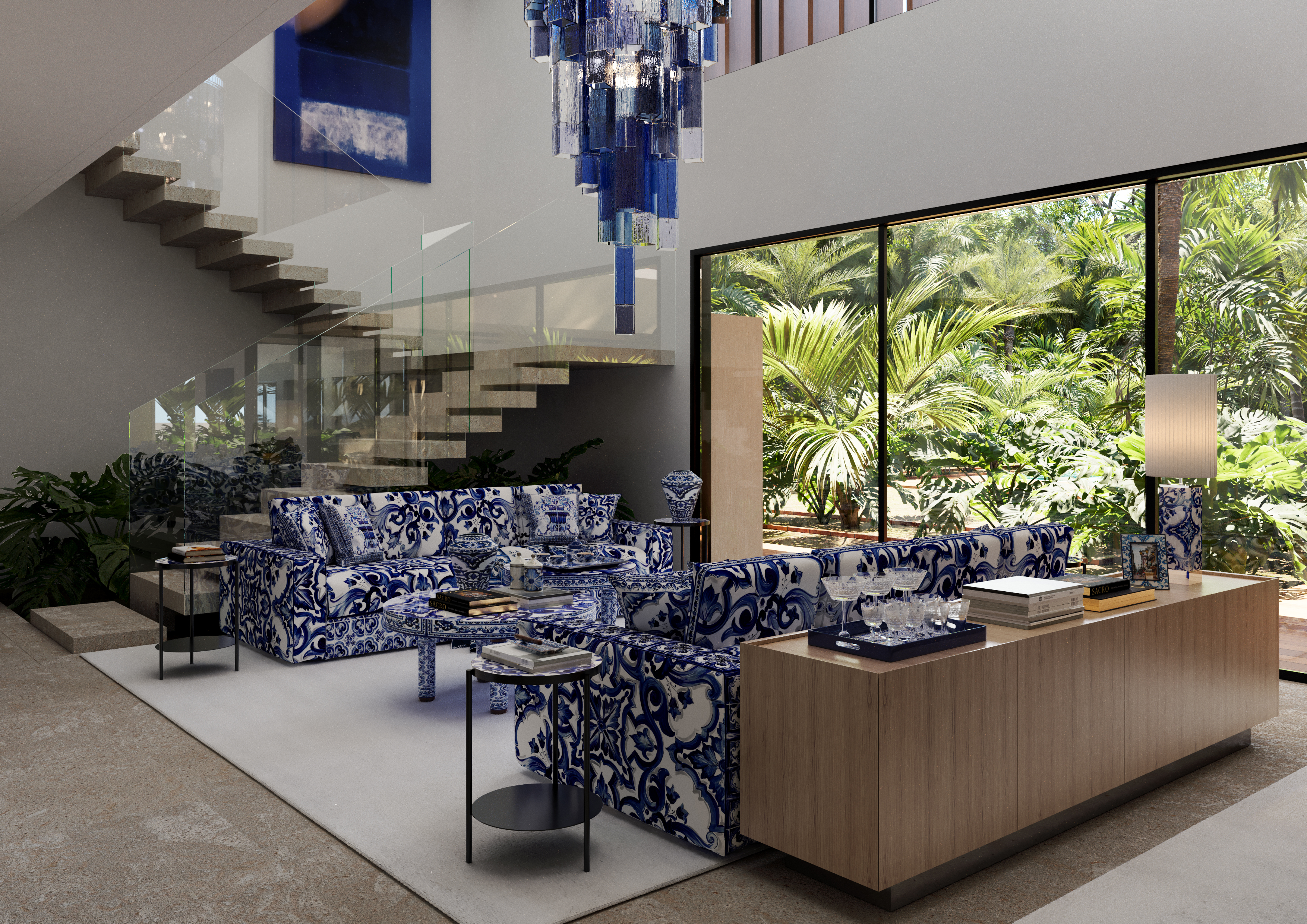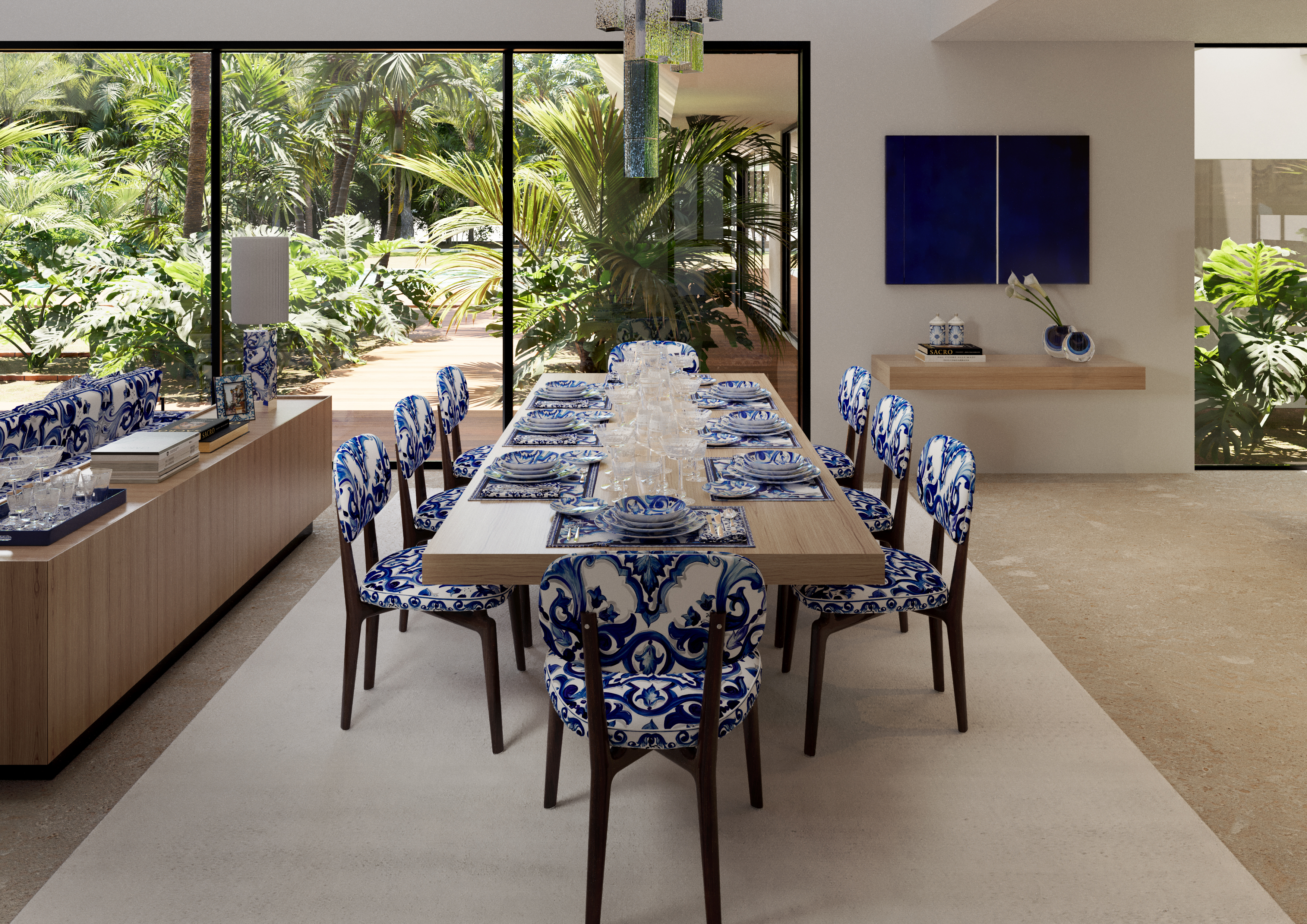 Bold yet fluid forms, refined textures, and handcrafted elements create a dialogue between contemporary minimalism and Italian sensuality. The iconic Blu Mediterraneo motif flows through ceramics, textiles, and glass, transforming each space into a composition of memory, craftsmanship, and timeless elegance.