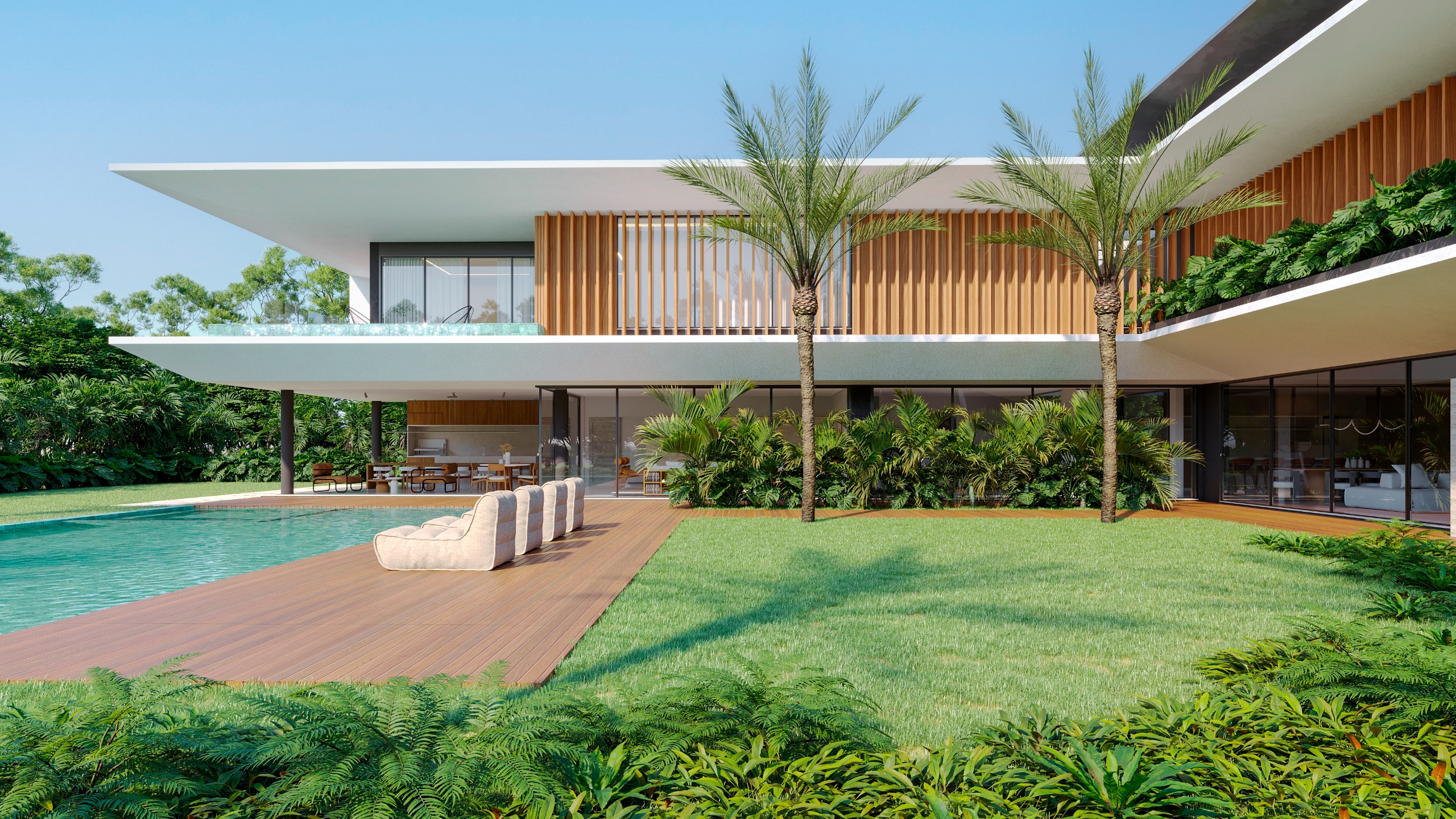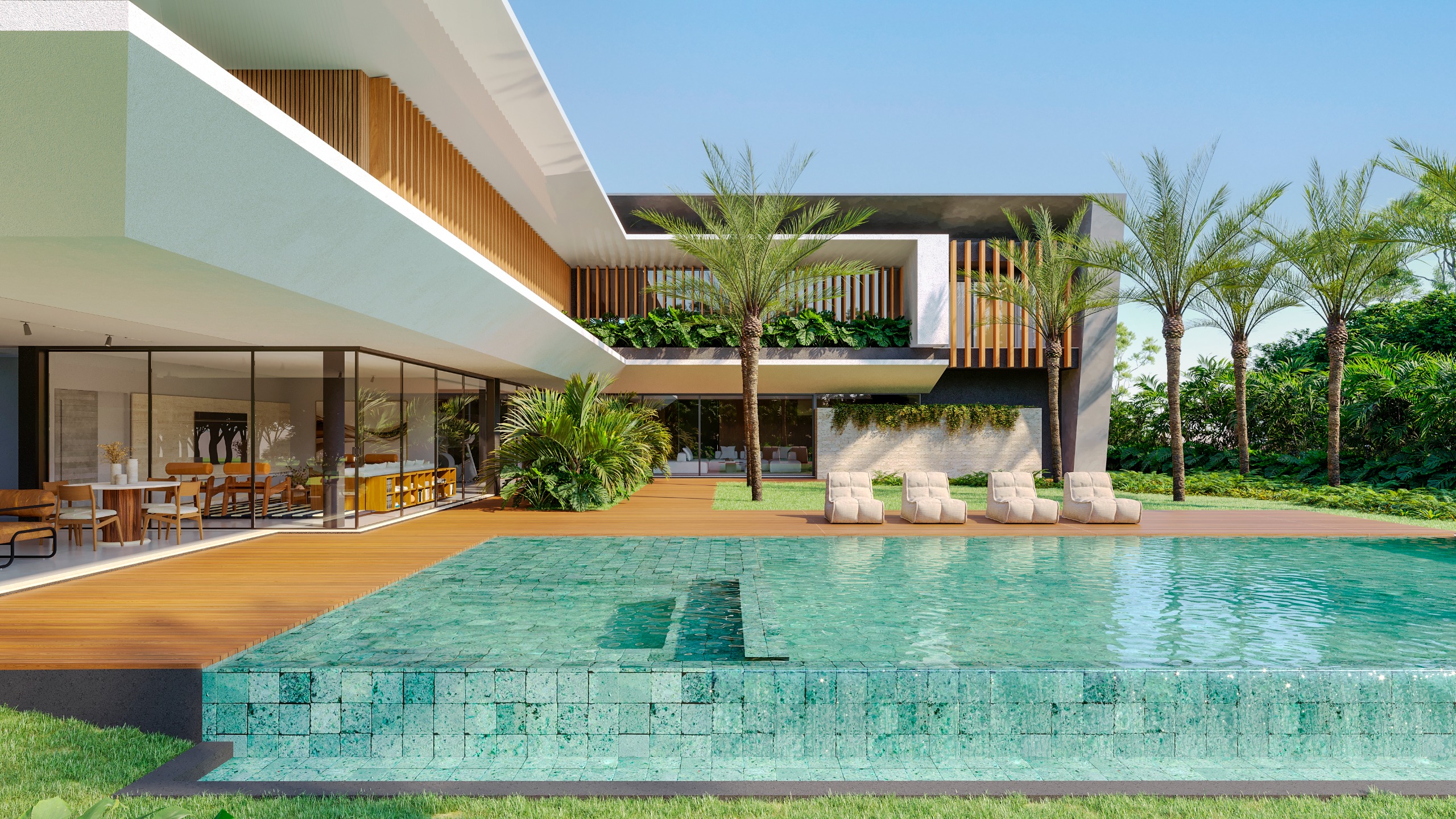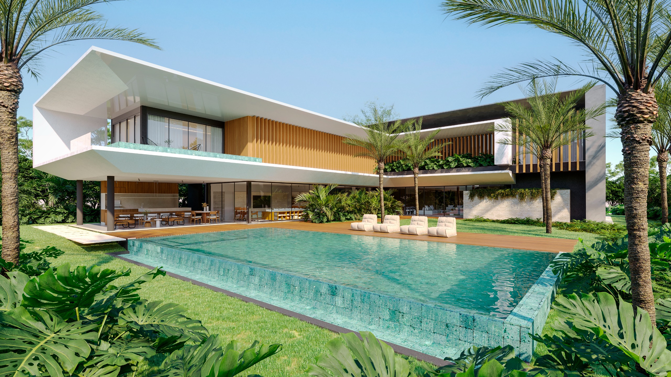 Outdoors, a large swimming pool with integrated jacuzzi and expansive deck anchors the property, surrounded by curated landscaping and the natural rhythm of palms and sea breeze.