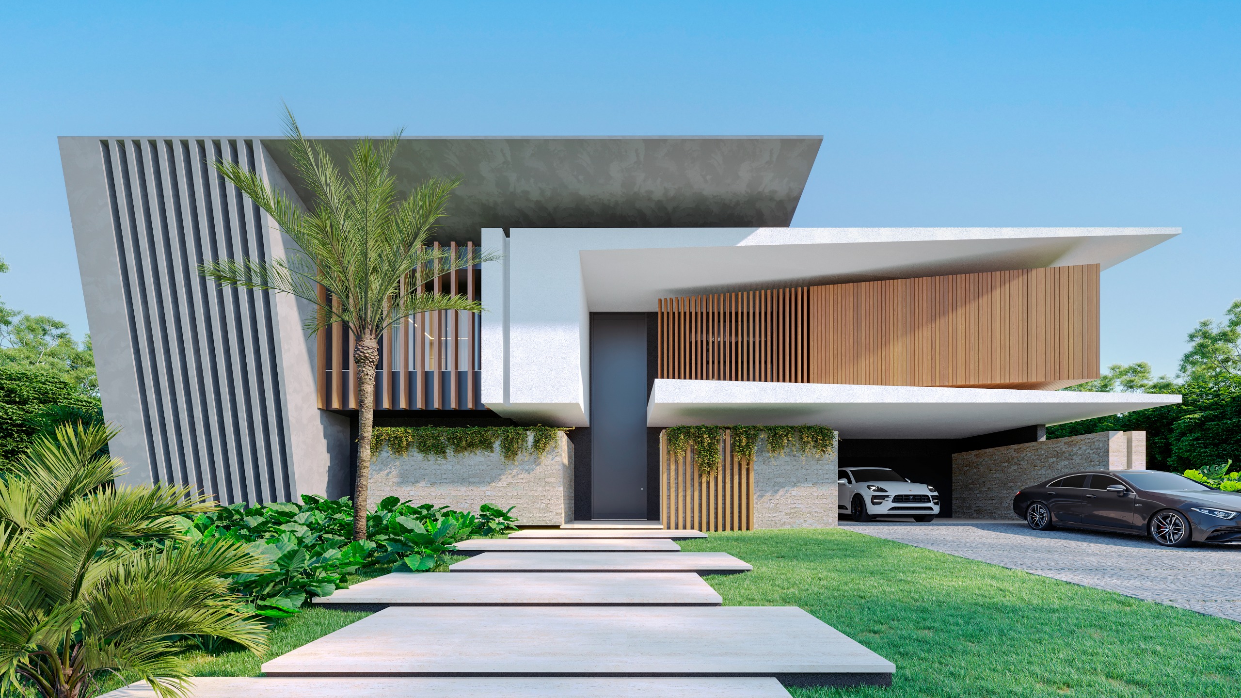 Defined by clean architectural lines, expansive volumes, and floor-to-ceiling glass, the residence opens seamlessly to lush tropical surroundings. A striking upper-level cantilever frames the outdoor living spaces, creating shaded terraces designed for effortless Caribbean living and entertaining.